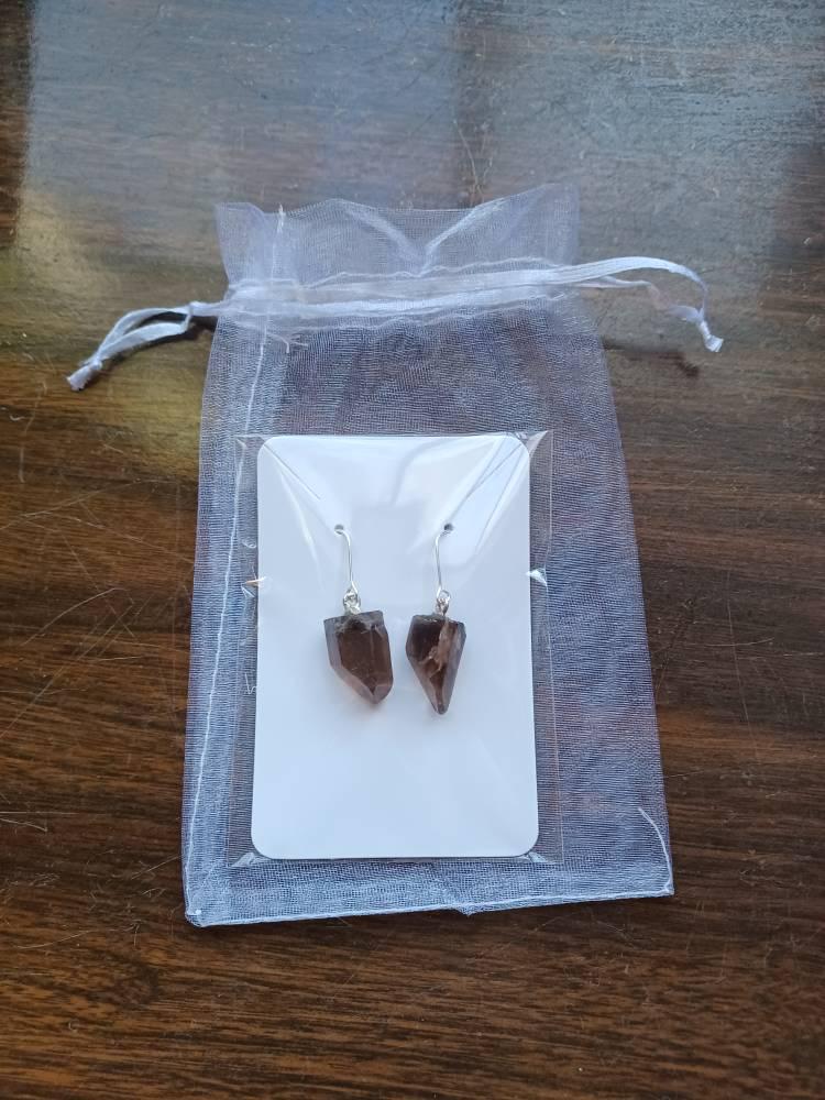 These handmade smokey quartz dangle earrings feature beautiful Smoky Quartz stones, each with a drop length of 50mm. Suspended from ear wires, they measure 30mm in total length. Choose between a raw finish or a silver-plated accent from the dropdown menu to suit your style. You can also opt for either silver-plated or sterling silver ear wire and finishings. Smoky Quartz is celebrated for its grounding and protection qualities, making these earrings not only a stylish accessory but also a source of strength and stability. Let these dangle earrings accentuate your natural beauty and complement your attire.