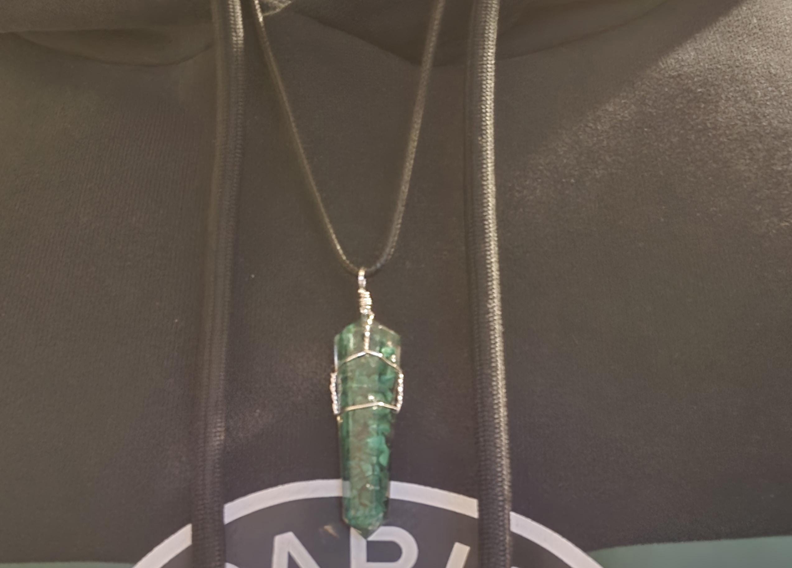 This Orgonite pendant features a genuine Malachite chips carefully placed in Orgonite resin, encased with silver-plated wire wrap. With its pointed shape and a size of approximatly 40mm, this pendant is both striking and versatile. Add the optional 18-inch cable chain, fastened securely with a lobster claw clasp for easy wearing to get you started. Wearing orgonite combined with Malachite offers a synergy of potential benefits. Orgonite is believed to cleanse and harmonize energy, while Malachite is associated with emotional healing and protection. Together, they create an environment that may support emotional healing and growth by aiding in the release of past traumas and anxieties, promote a sense of safety and well-being through the neutralization of negative energies, foster emotional balance and inner peace, enhancing positivity and emotional well-being.