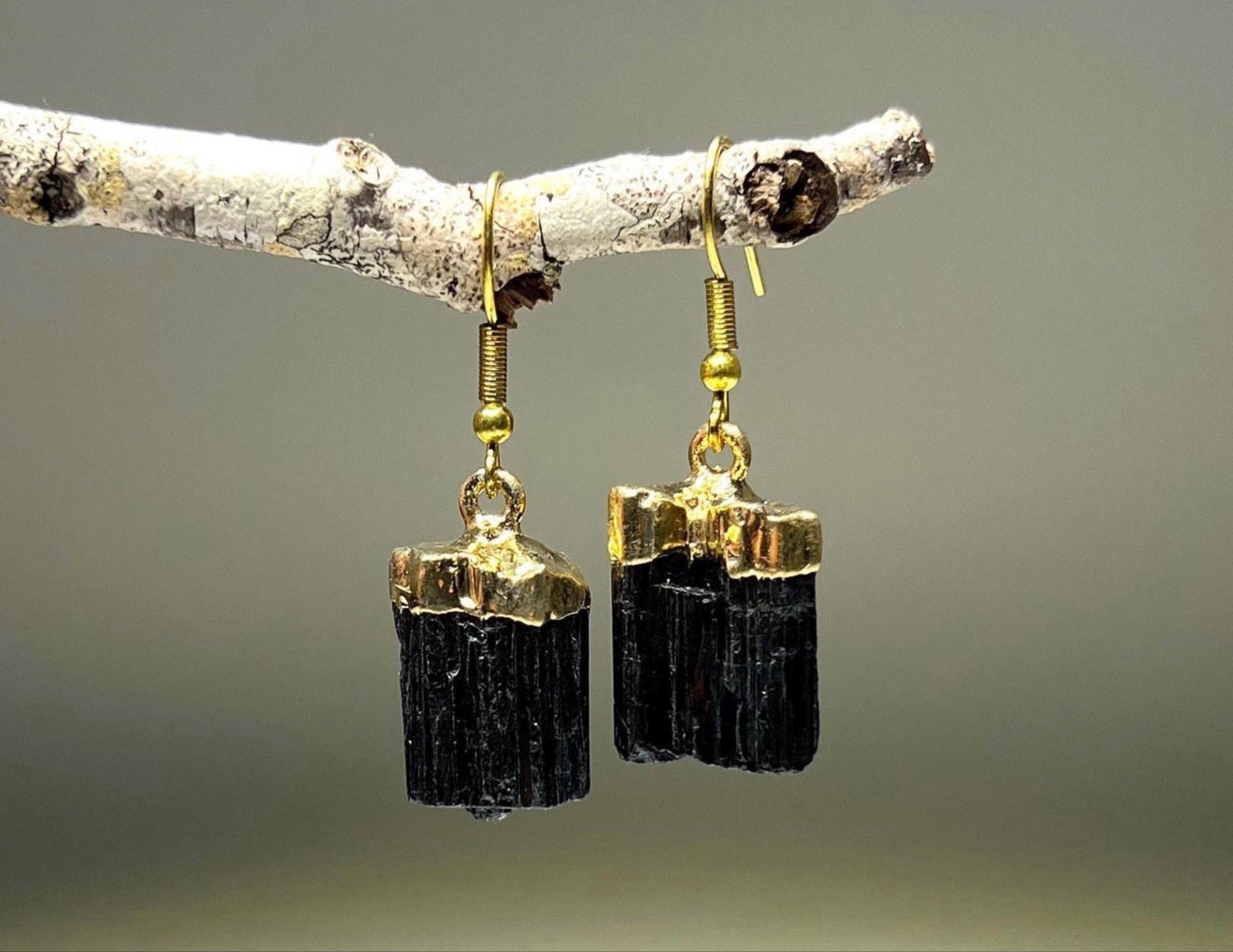 These handmade earrings feature genuine Black Tourmaline stones dipped in shimmering gold plating. With their graceful dangle, these earrings offer a touch of sophistication and a hint of mystique to any ensemble. The powerful protective qualities of Black Tourmaline add depth to their beauty, making them not only a fashion statement but also a source of grounded energy and shielding. Elevate your style with these boho earrings, and carry the protective essence of Black Tourmaline jewelry with you, while making a chic and bold statement.