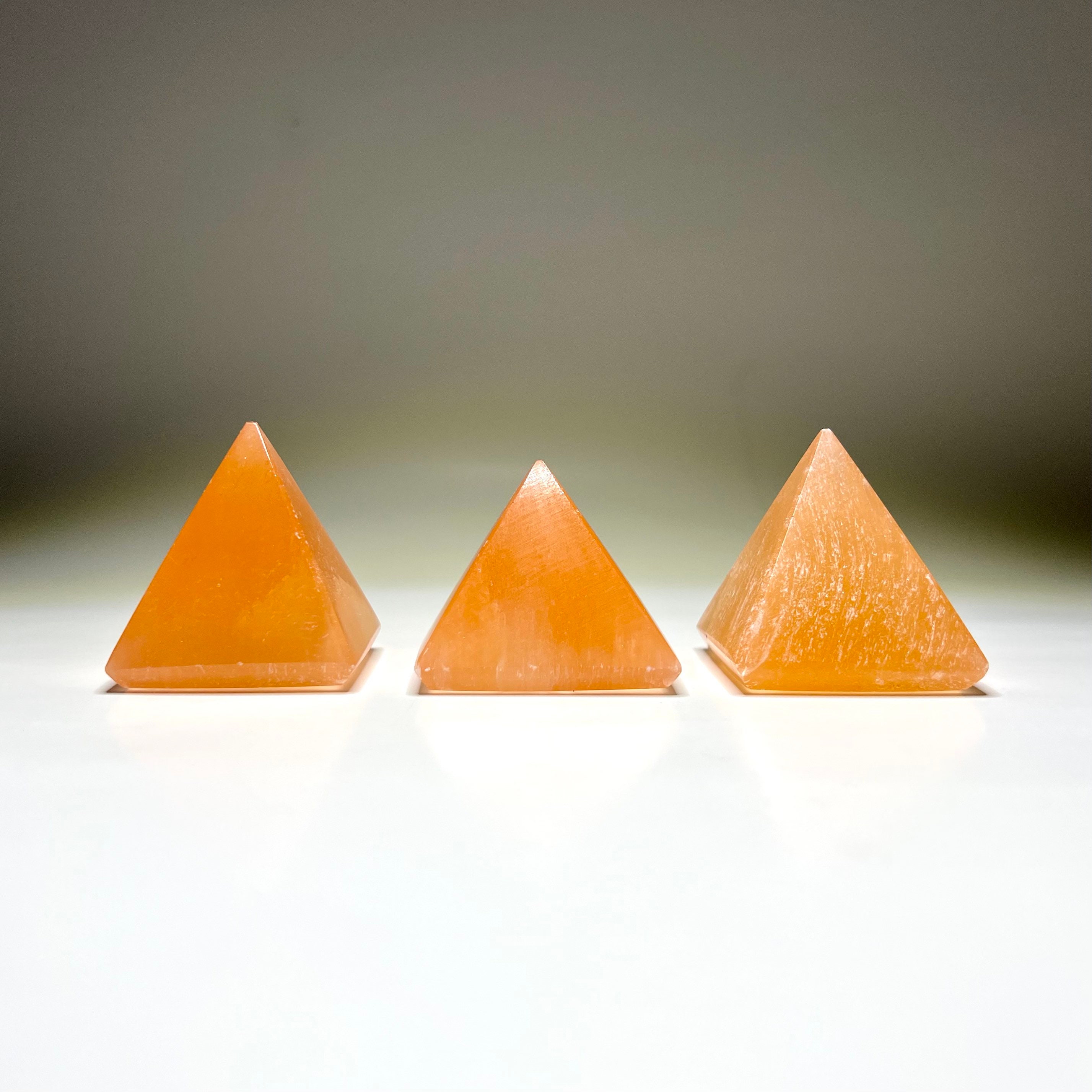 Each Selenite Pyramid measures approximately 1.75”W x 1.75”H x 1.75”D
