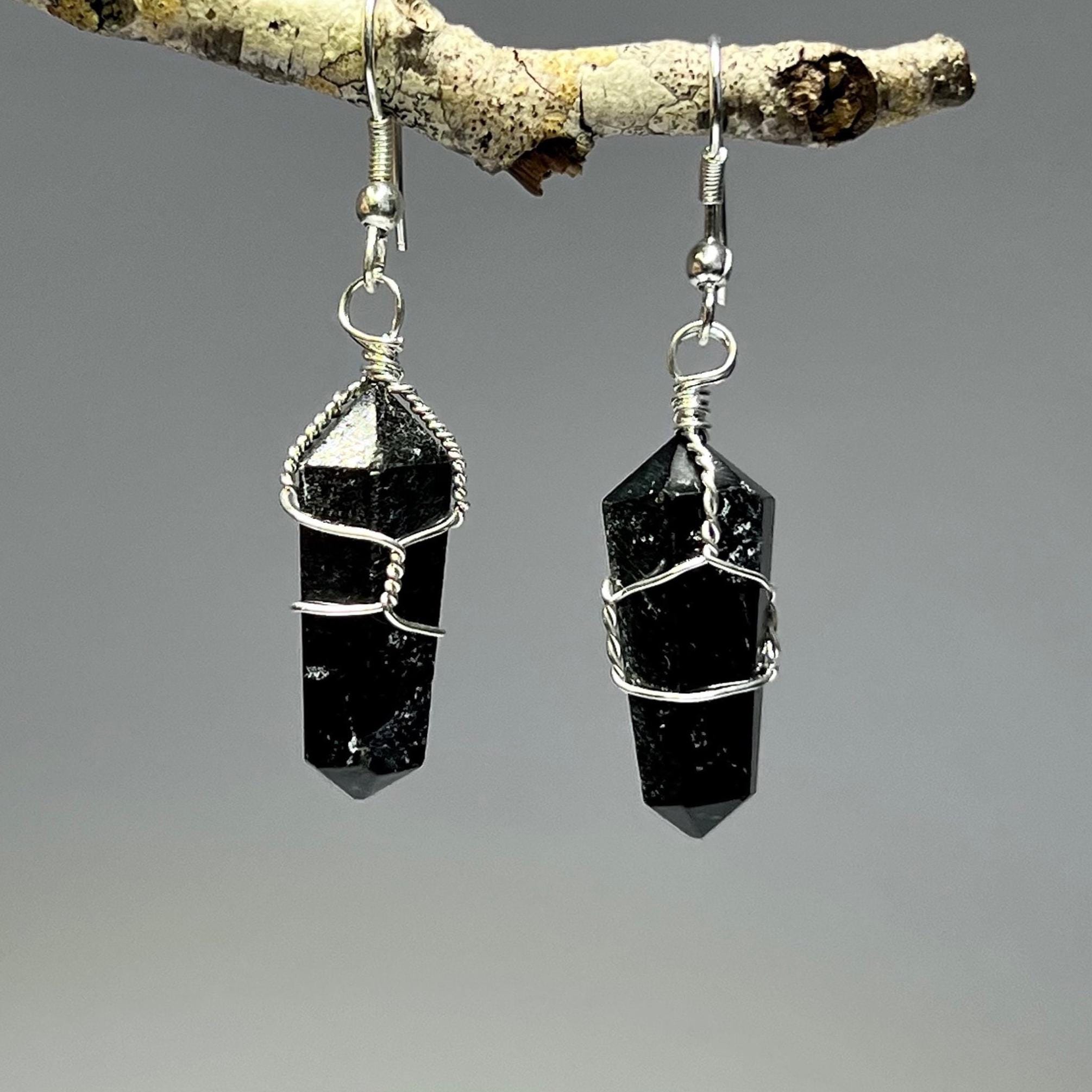 Black Tourmaline Gemstone Dangle Earrings, Tourmaline Wire Wrapped Crystal Earrings