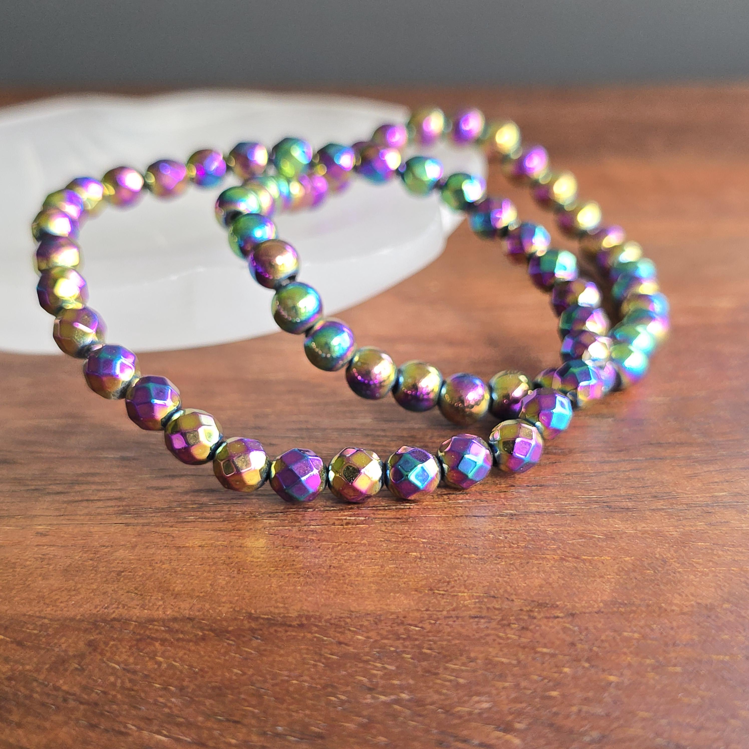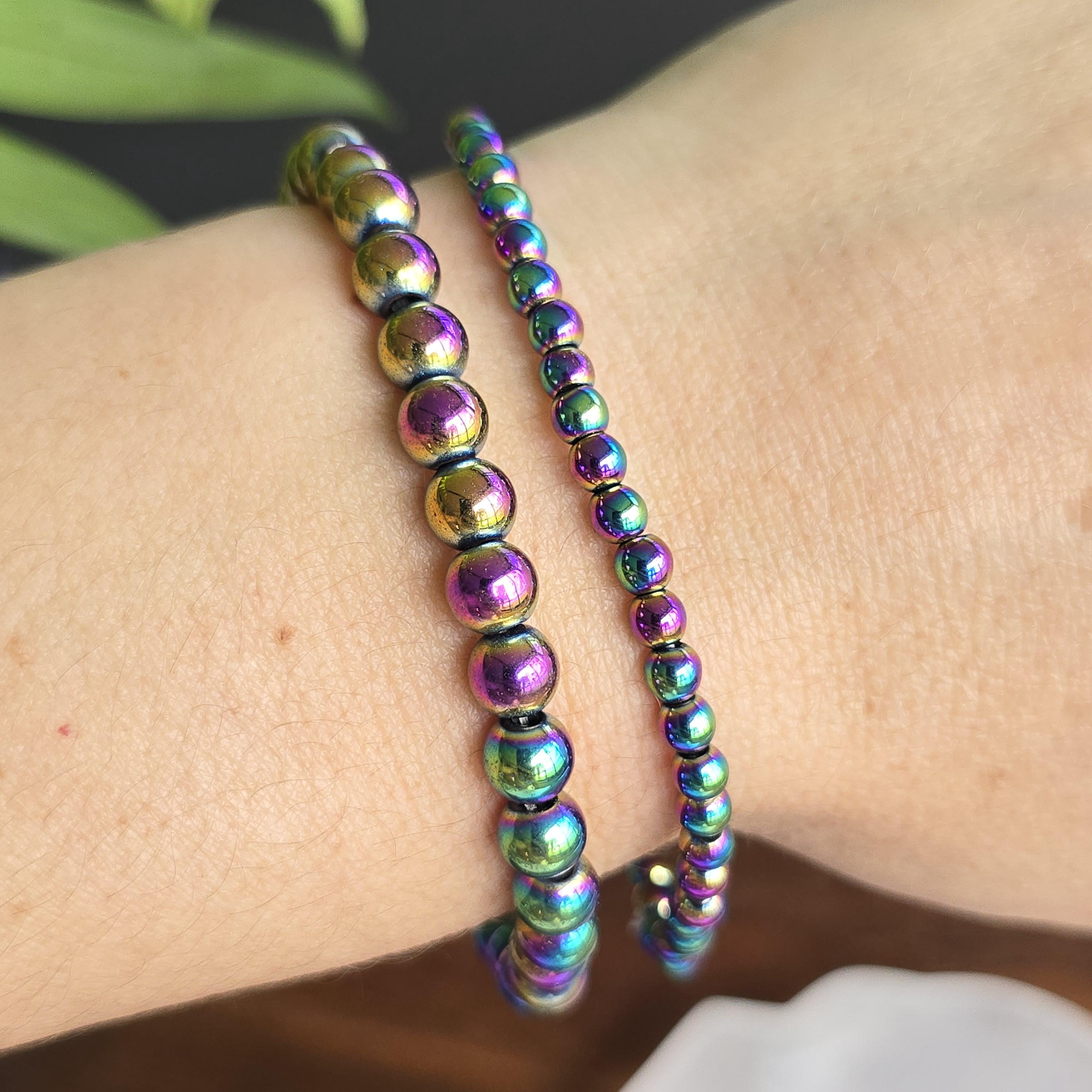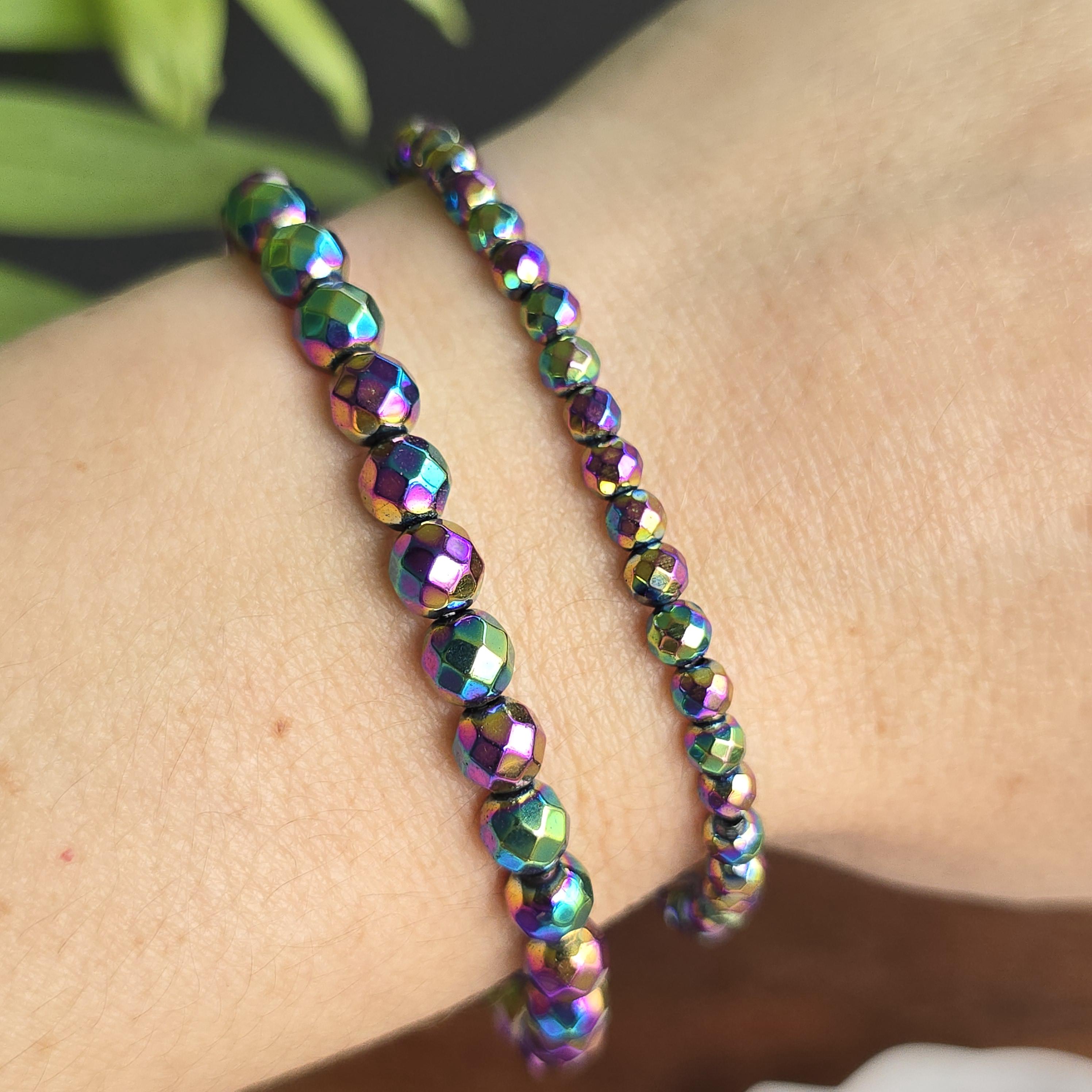 Our Titanium-Coated Rainbow Hematite 4mm Stretch Bracelet, available in both round and faceted beads, is the perfect boho accessory for stacking or layering bracelets. The stretch bracelet design ensures a comfortable fit while the vibrant colors of the titanium-coated hematite beads add a touch of enchantment to your style. Wearing Rainbow Hematite brings a variety of benefits, even in its non-magnetic form, offers grounding and balancing, promoting a sense of stability in your life. Its vibrant colors can also boost energy and creativity. Additionally, many people find that it enhances focus and concentration.