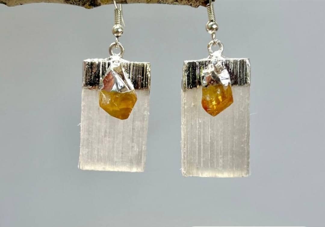 Discover our Selenite and Citrine gemstone earrings, handmade with care to showcase the beauty of crystal jewelry. Each pair combines a Selenite crystal with a Citrine crystal, perfect for November birthdays. These boho earrings effortlessly add a touch of natural charm to any outfit, while Selenite cleanses your aura and Citrine boosts motivation and creativity. Wearing Selenite with Citrine earrings offers a harmonious blend of benefits. Selenite promotes clarity and purification, while Citrine enhances positivity and abundance. Together, they create a balanced energy that fosters mental clarity, inner peace, and prosperity, making these earrings not only a stylish accessory but also a source of well-being.