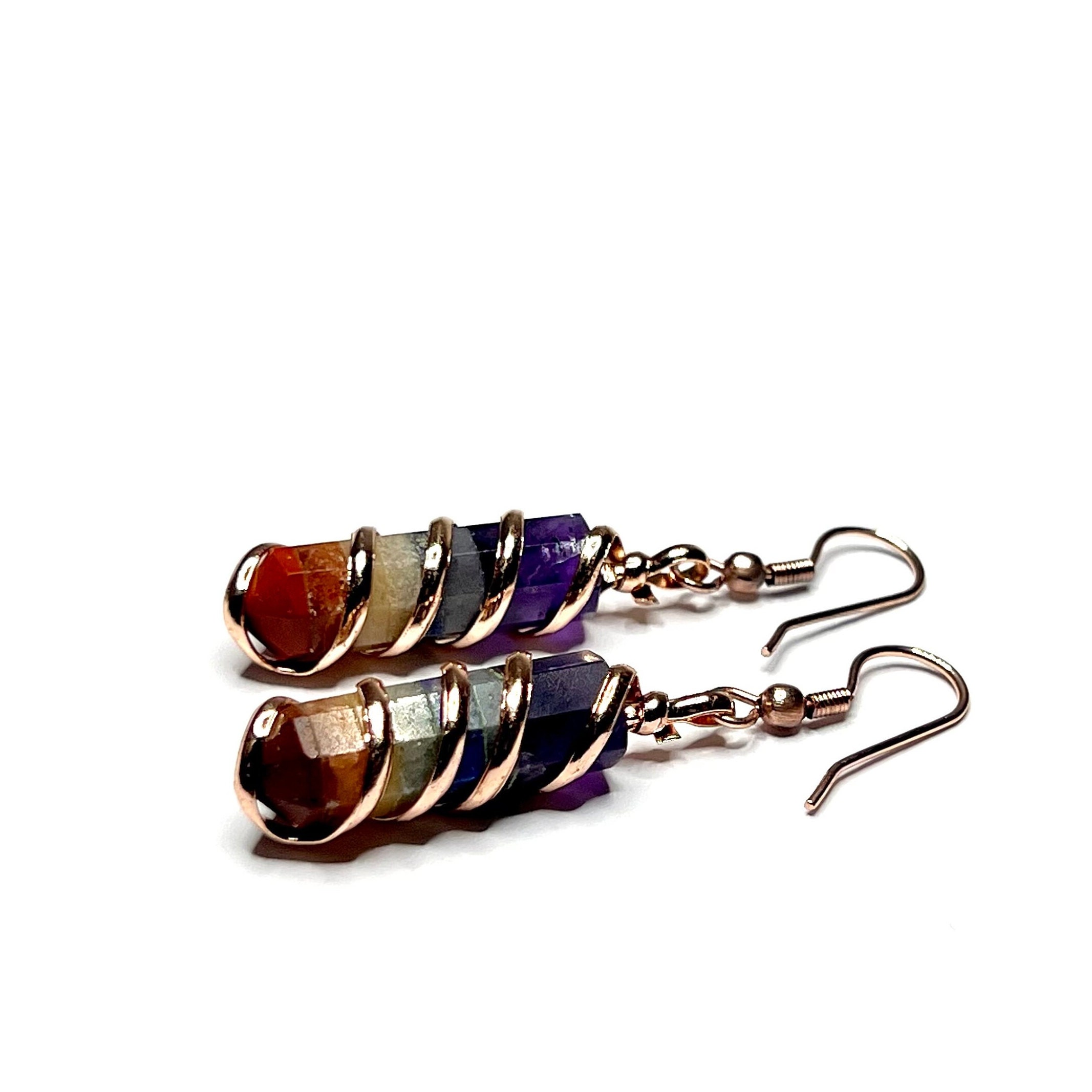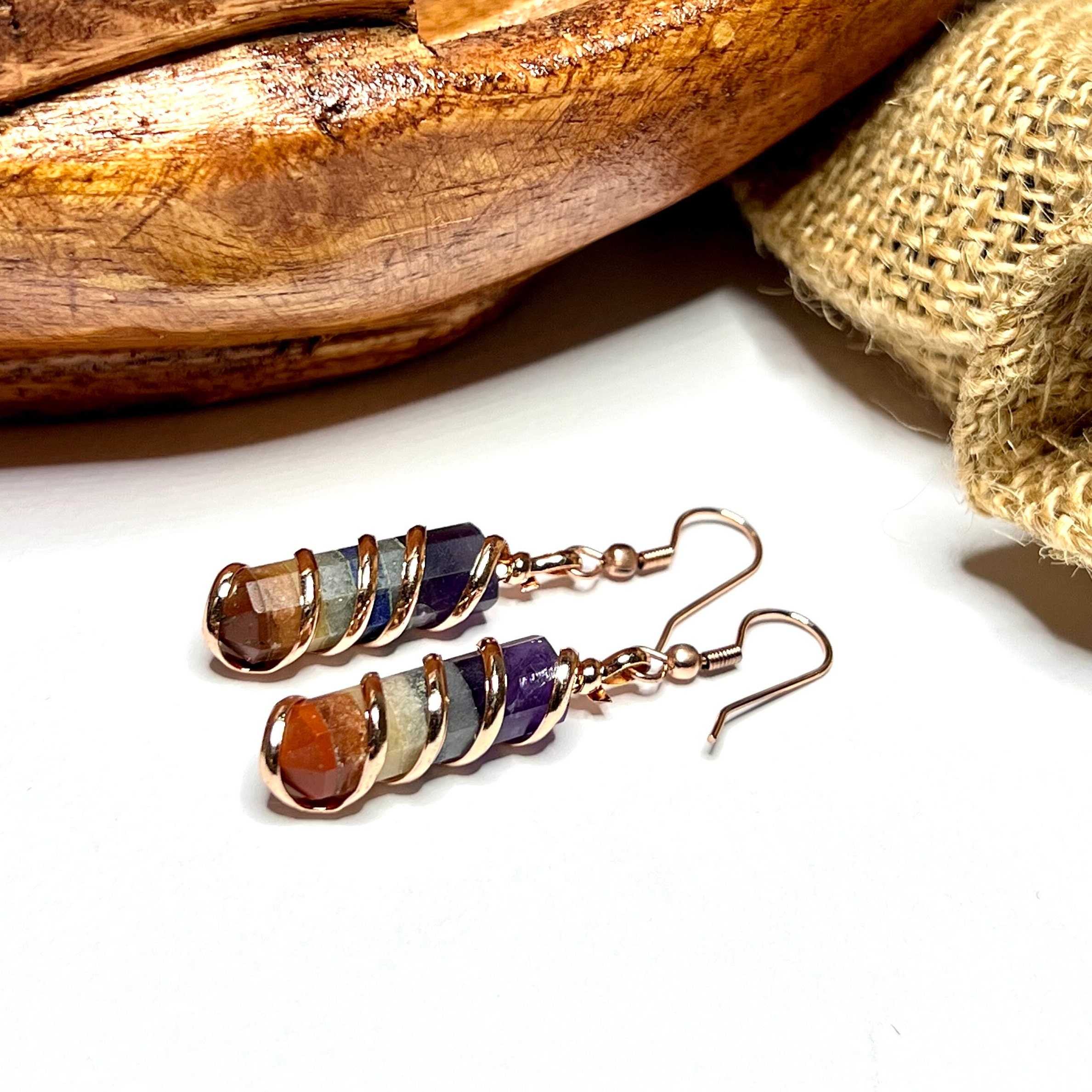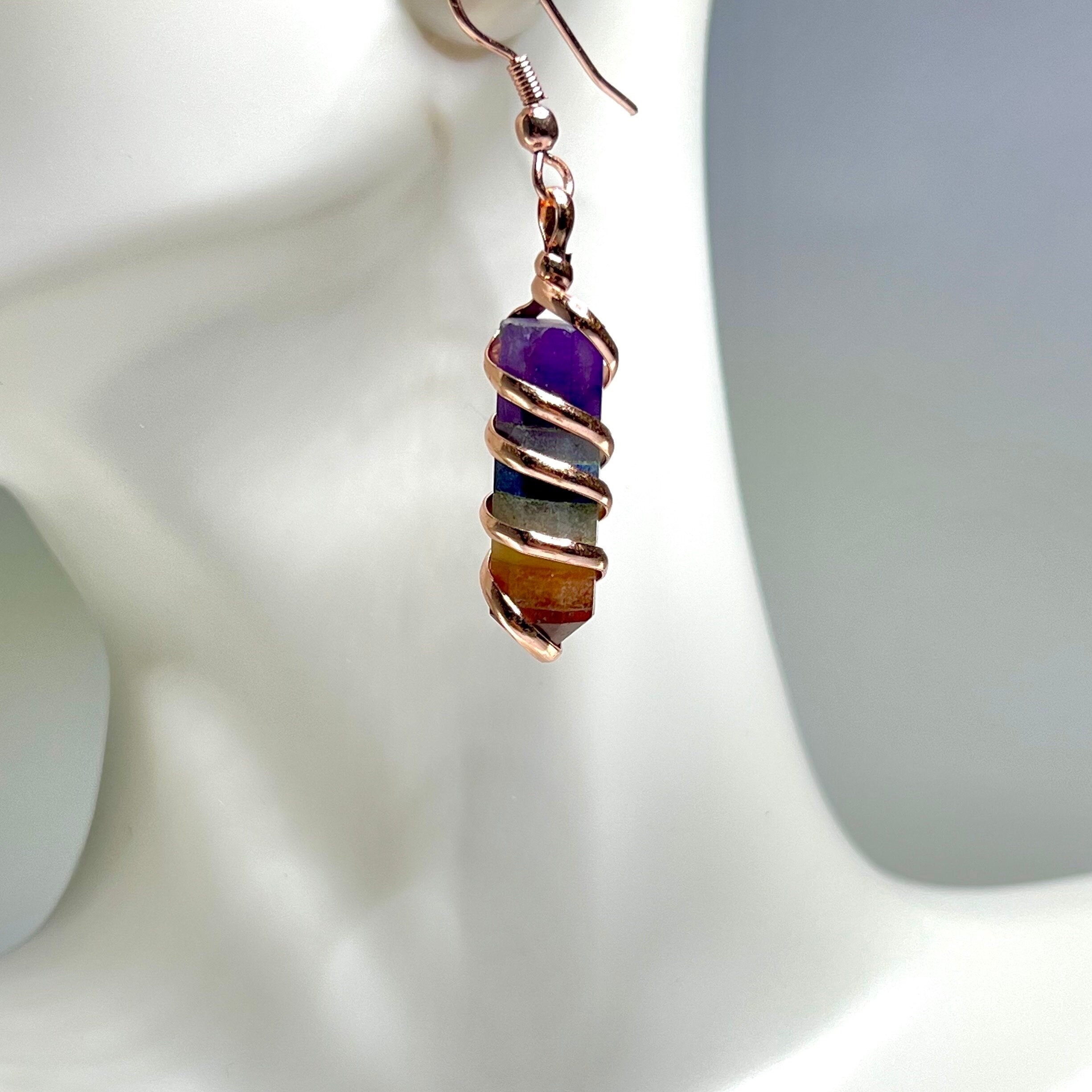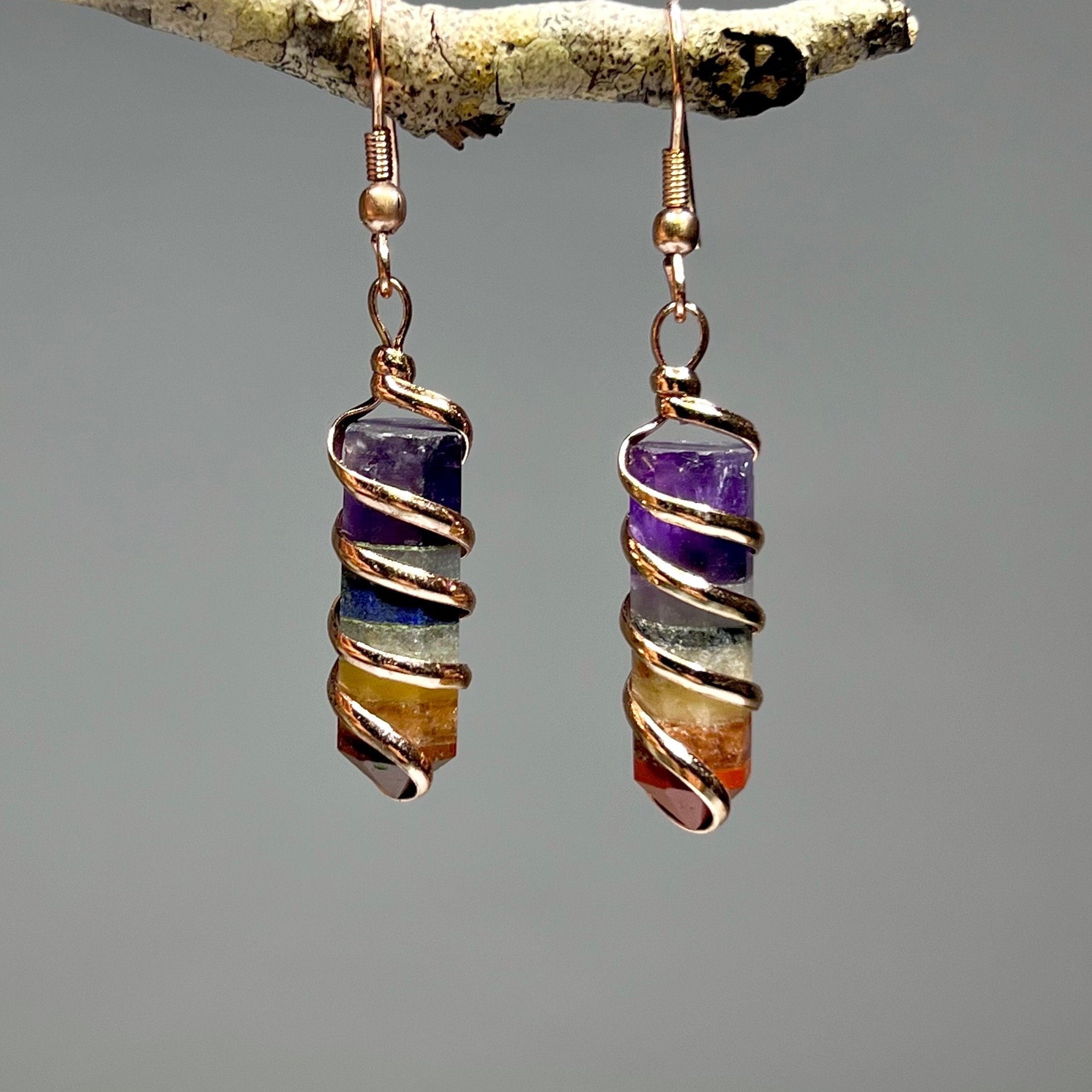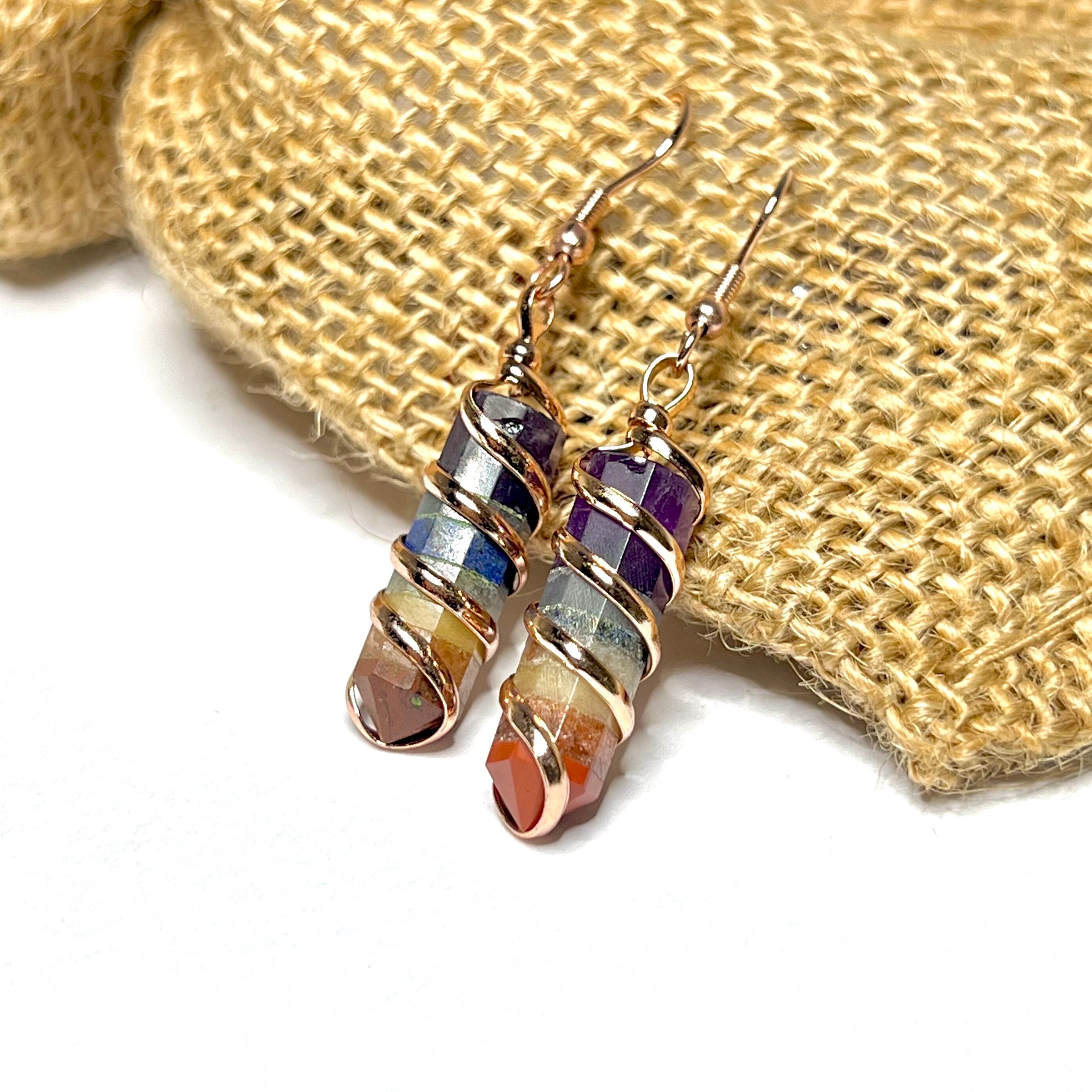 Rainbow Chakra Crystal Earrings, 7 Chakra Gemstone Wire Wrapped Dangle Earrings