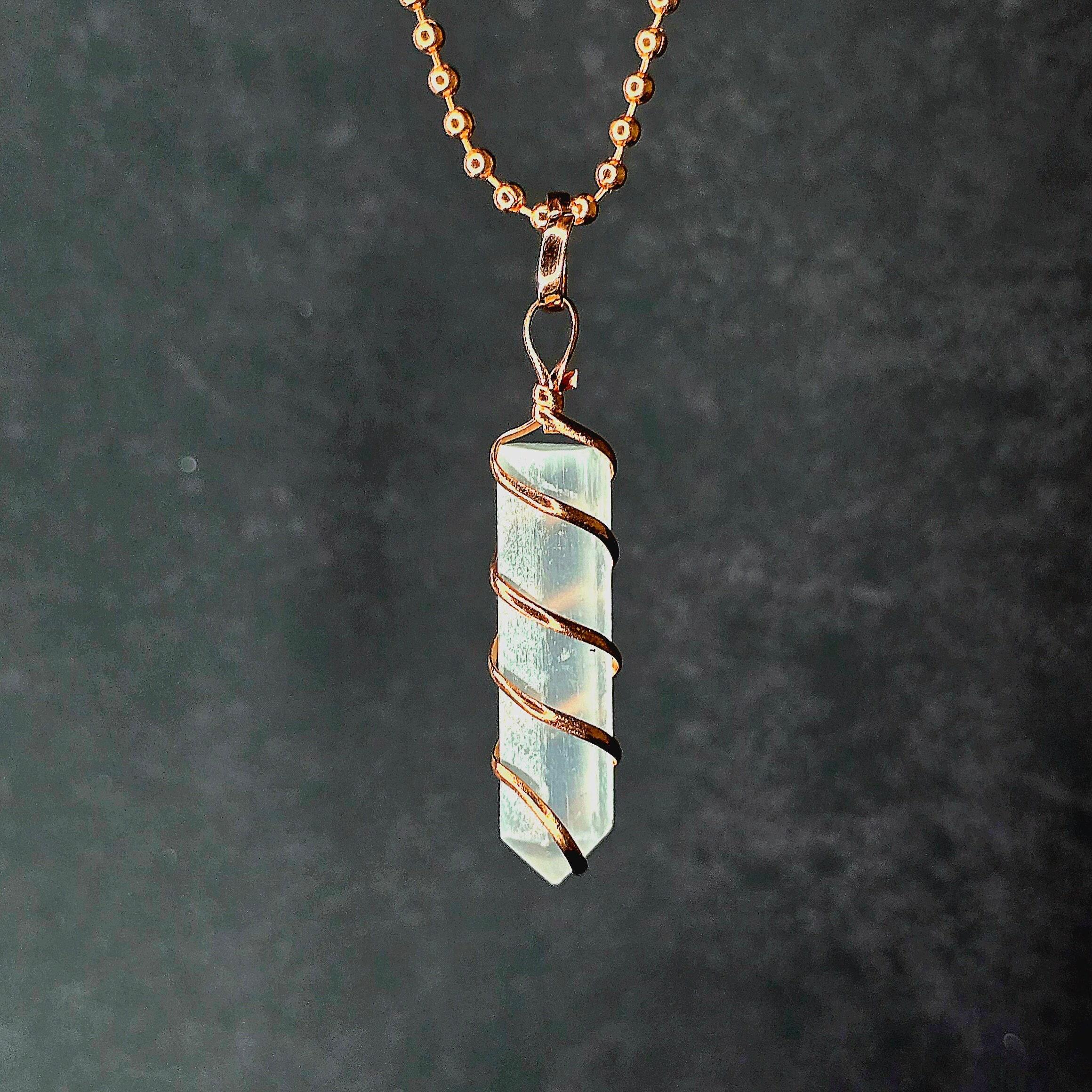 This handmade copper wrapped pendant necklace features a polished point of Selenite measuring approximately 40mm in length and 10mm in width, radiating elegance and purity. This pendant is thoughtfully wire wrapped to accentuate the natural beauty of the selenite crystal.