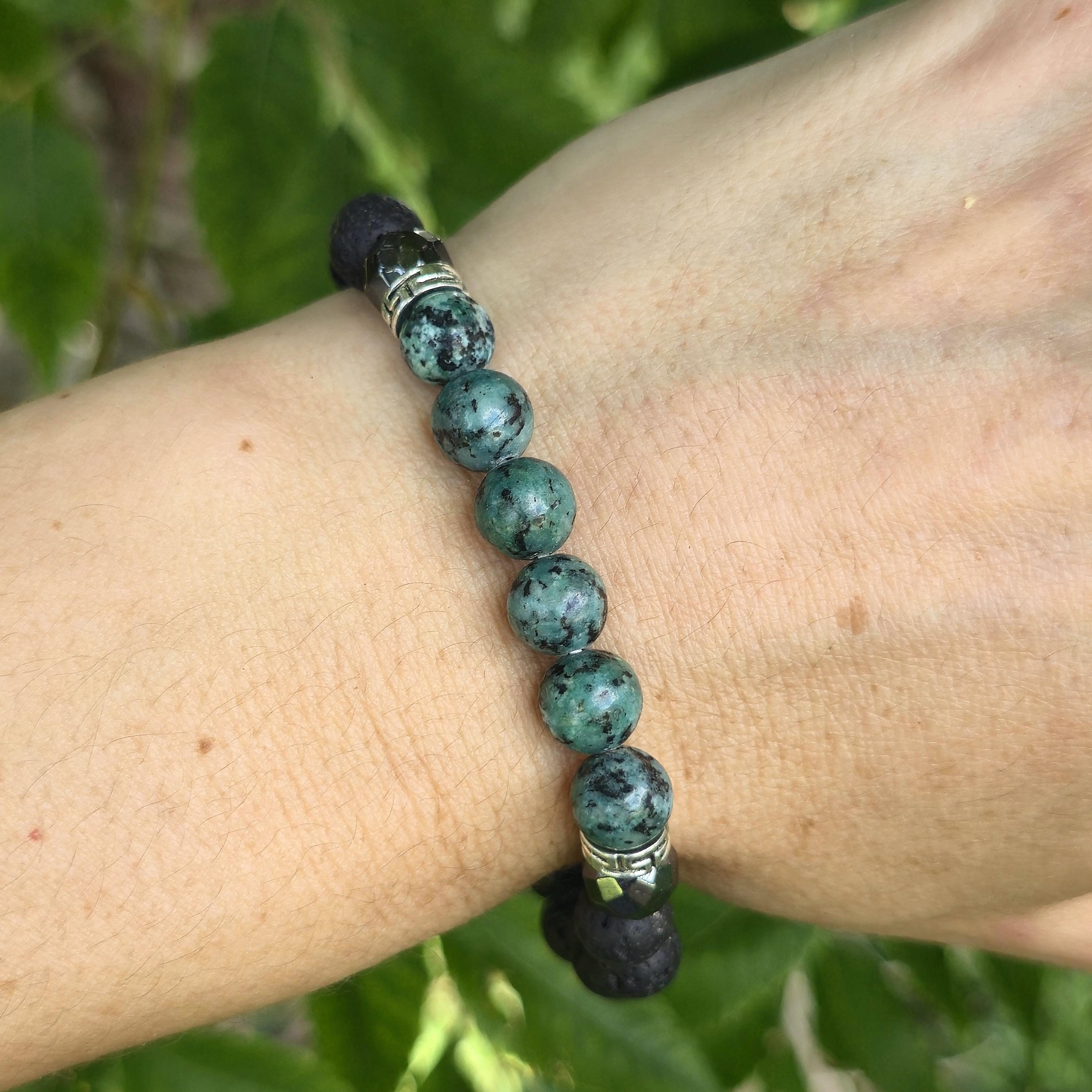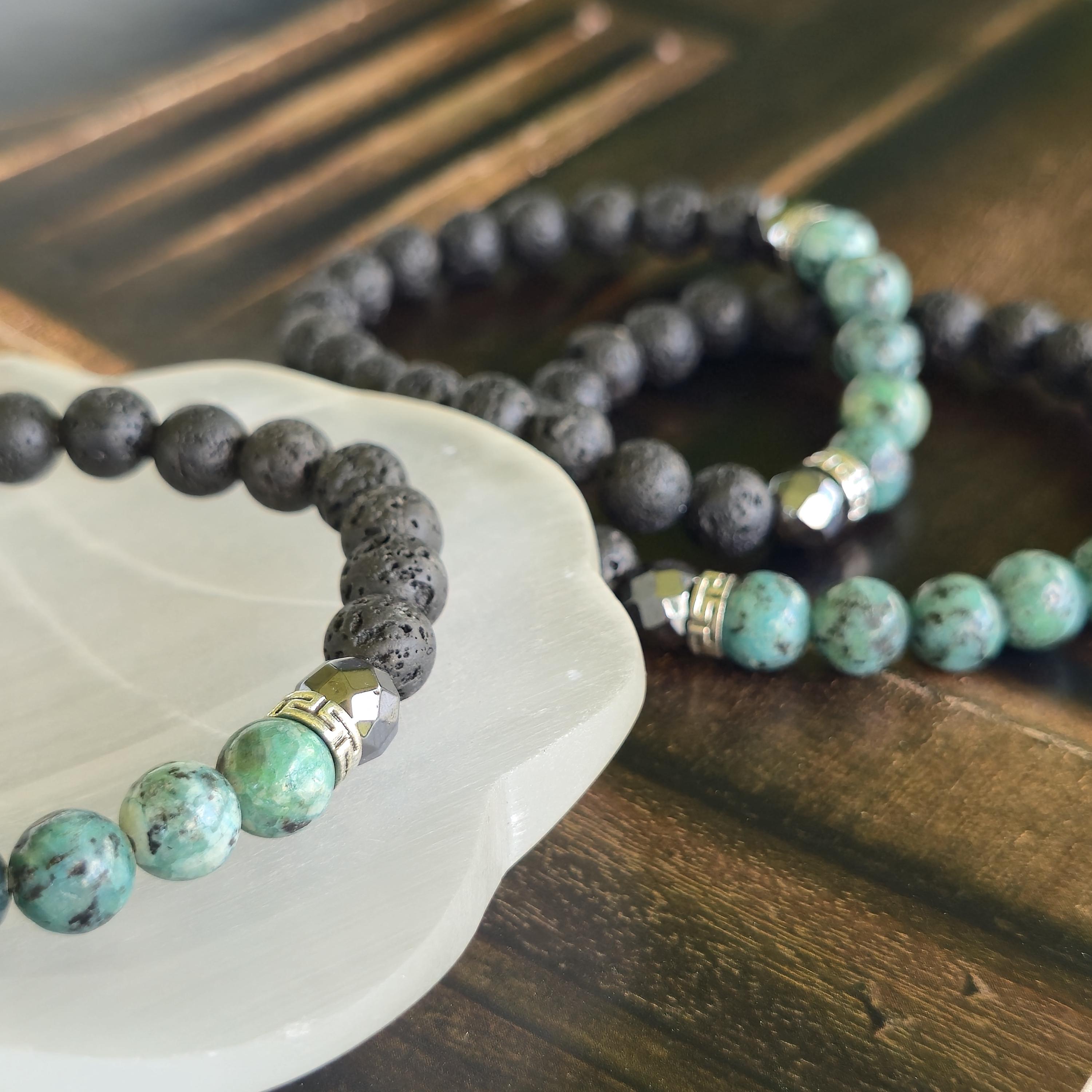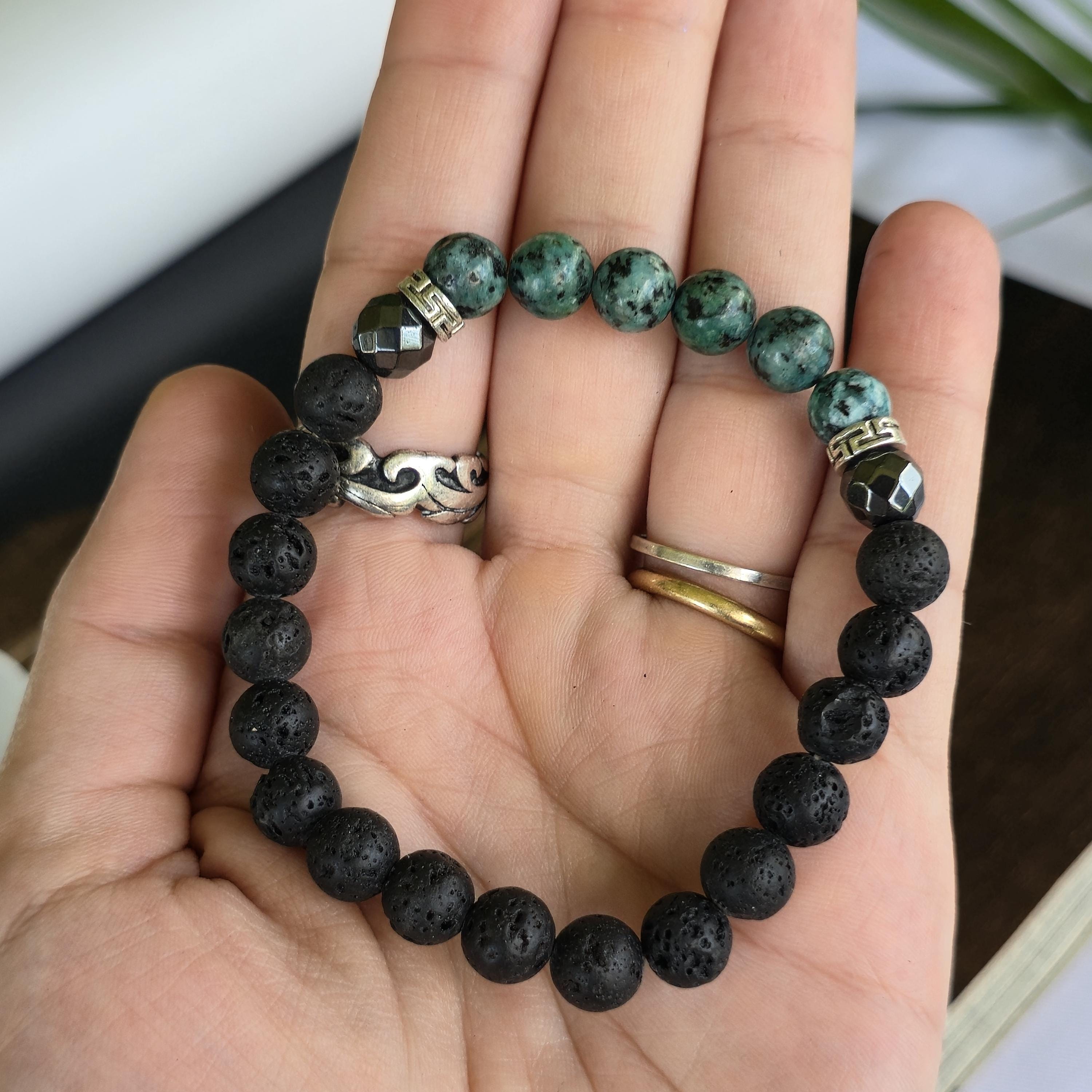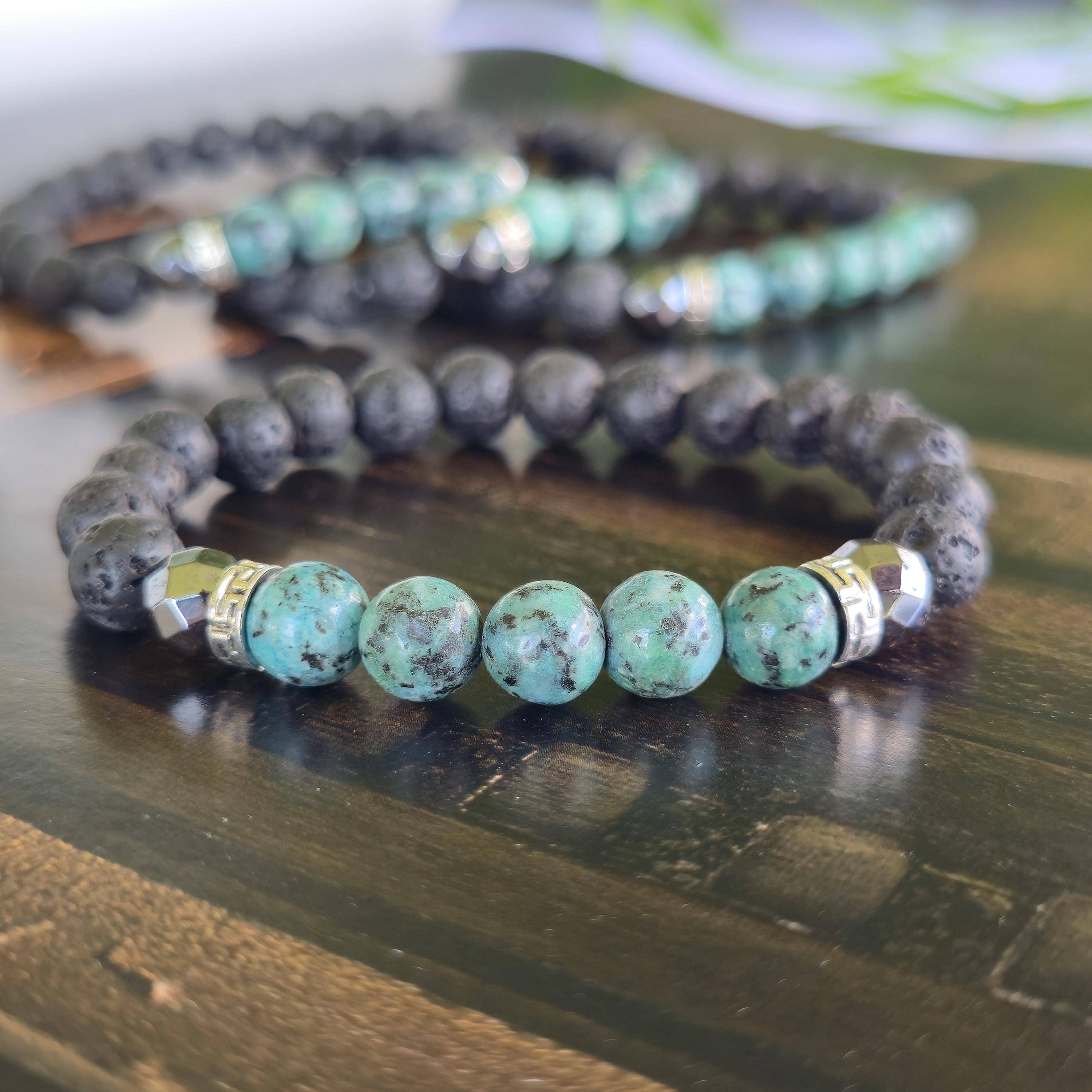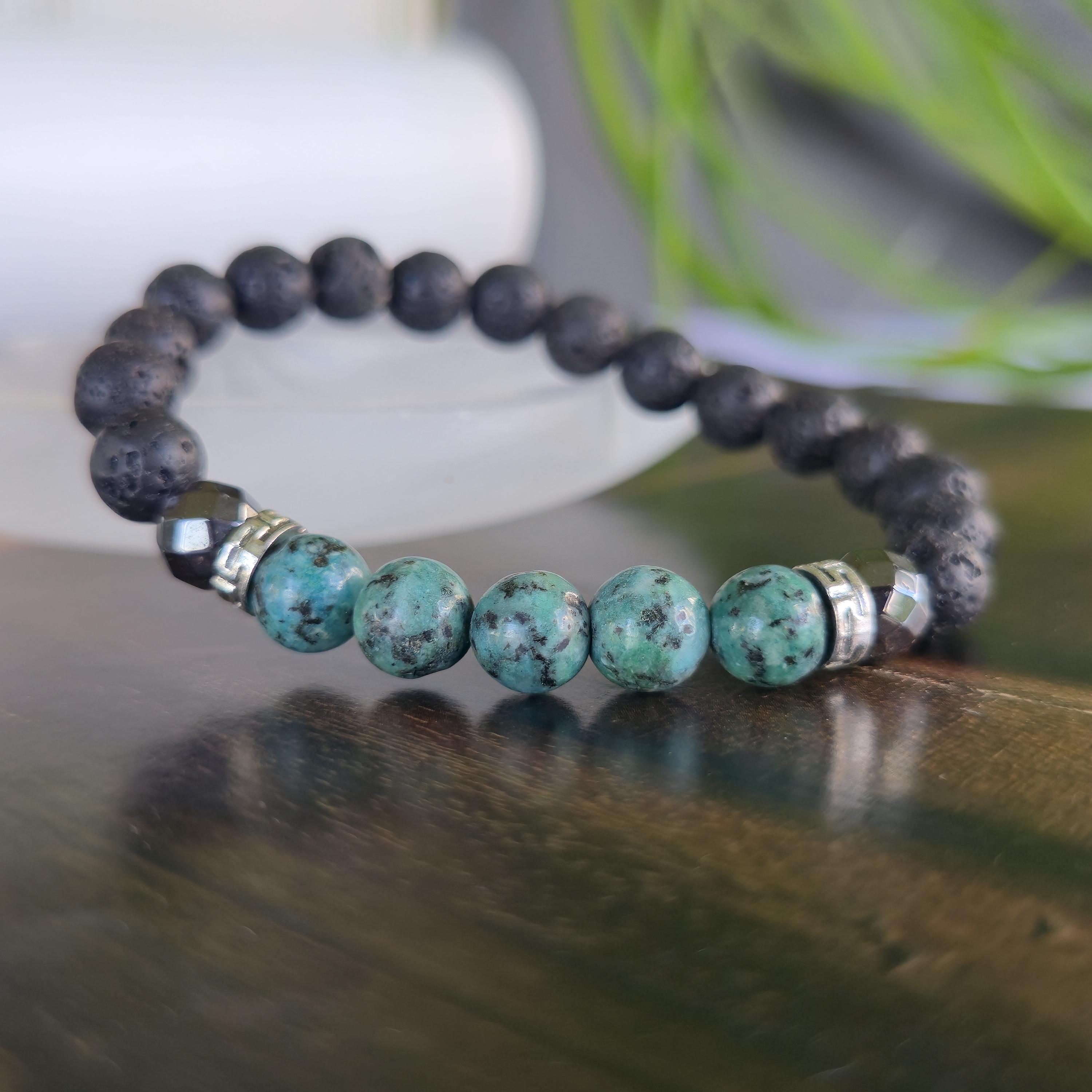 African Turquoise is a jasper known for its metaphysical properties. This bracelet is believed to enhance communication, support spiritual growth, and encourage positive life changes. Paired with Lava stone, its absorbent nature makes it perfect for aromatherapy oil diffusion, offering a gentle alternative for those sensitive to direct skin application. Simply add 1 to 3 drops of essential oil to the porous lava stone, allow it to absorb, and enjoy a personal aromatherapy experience.
