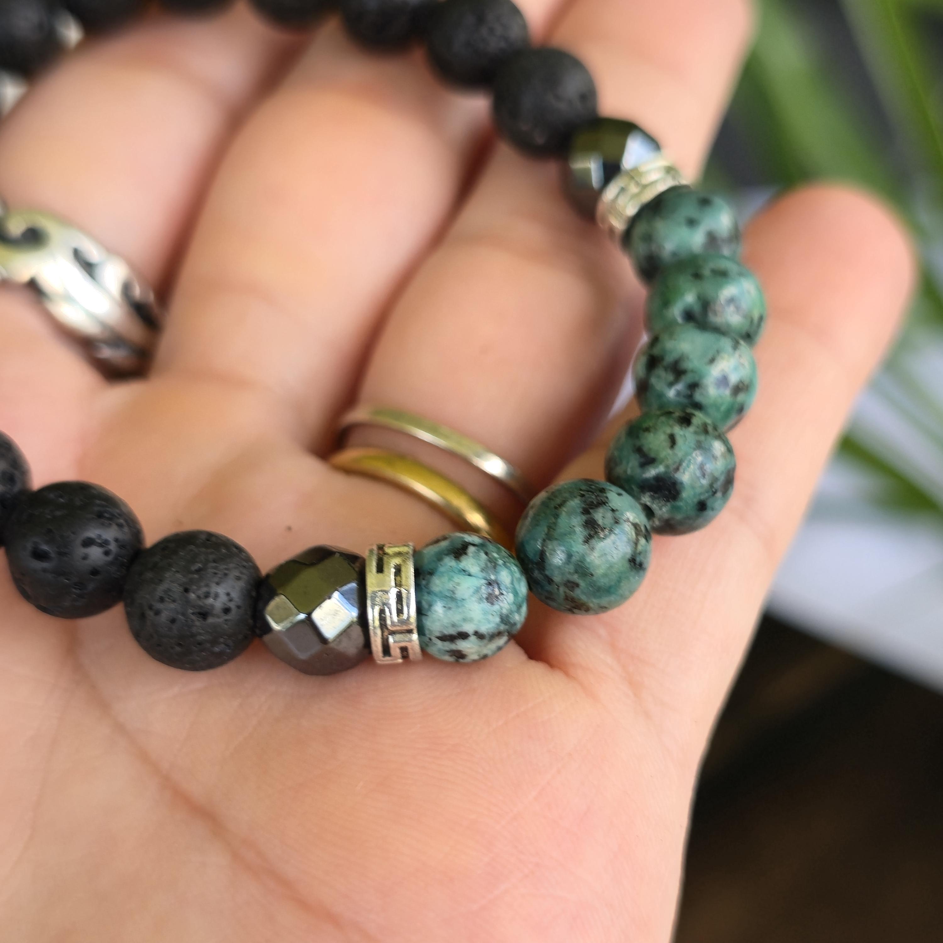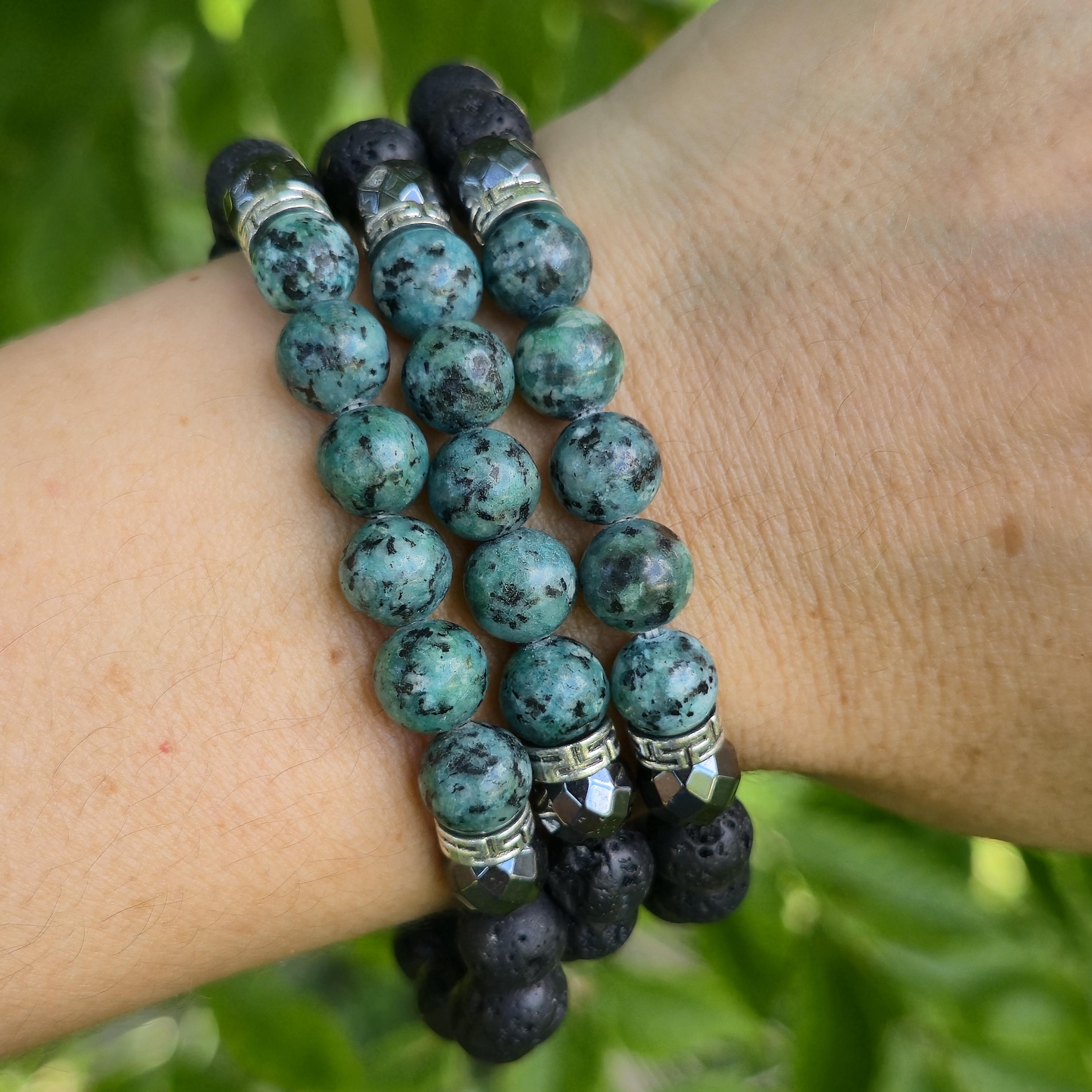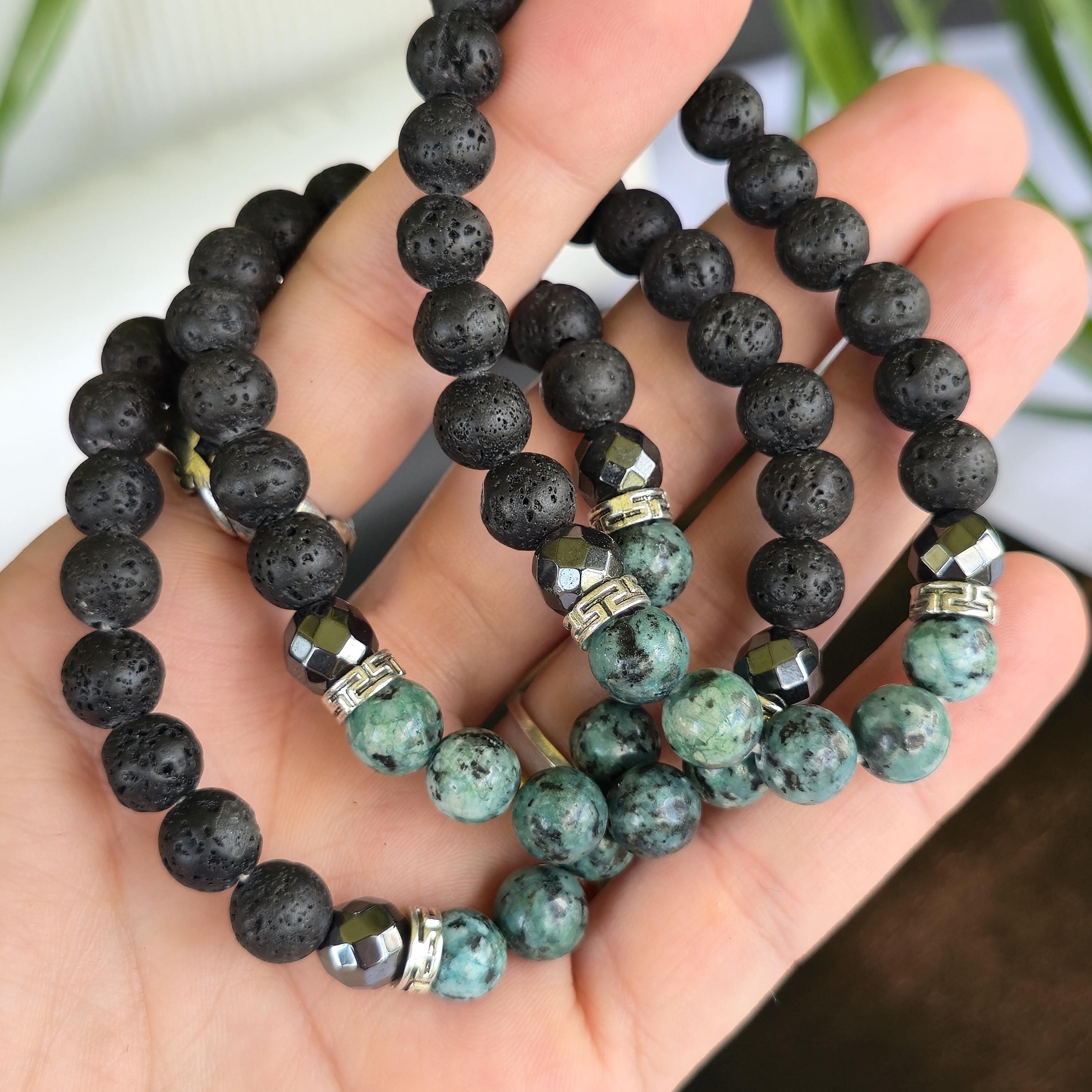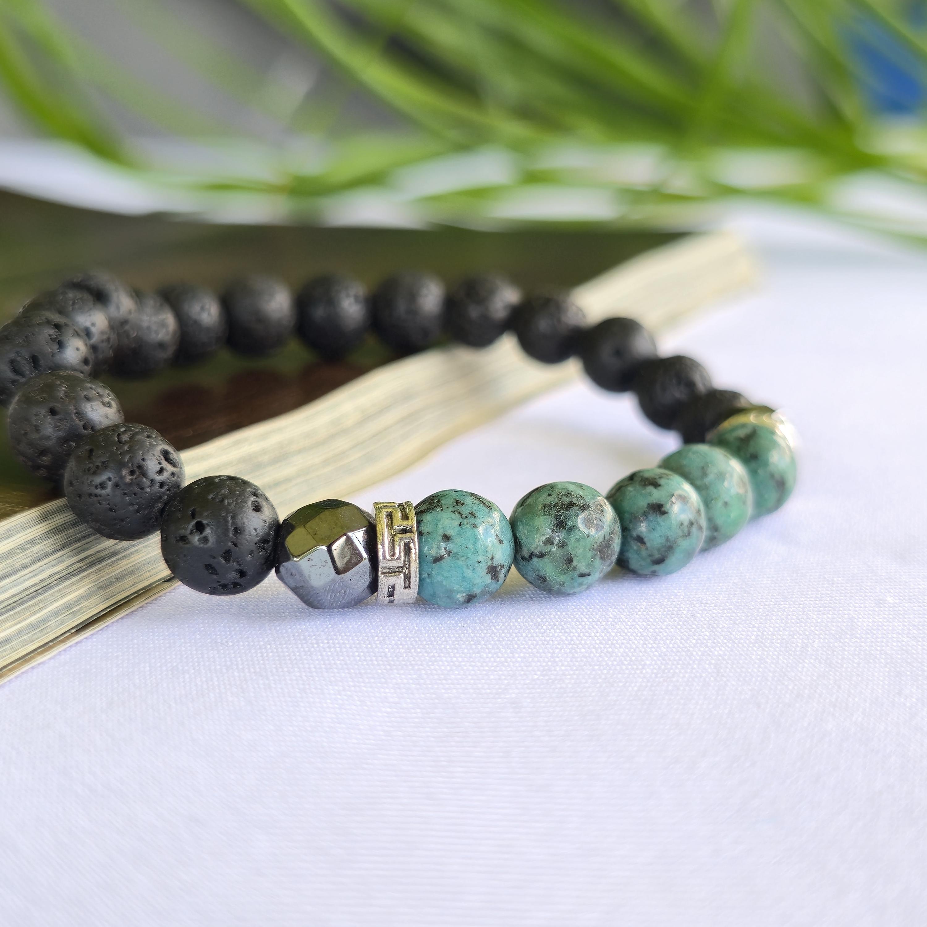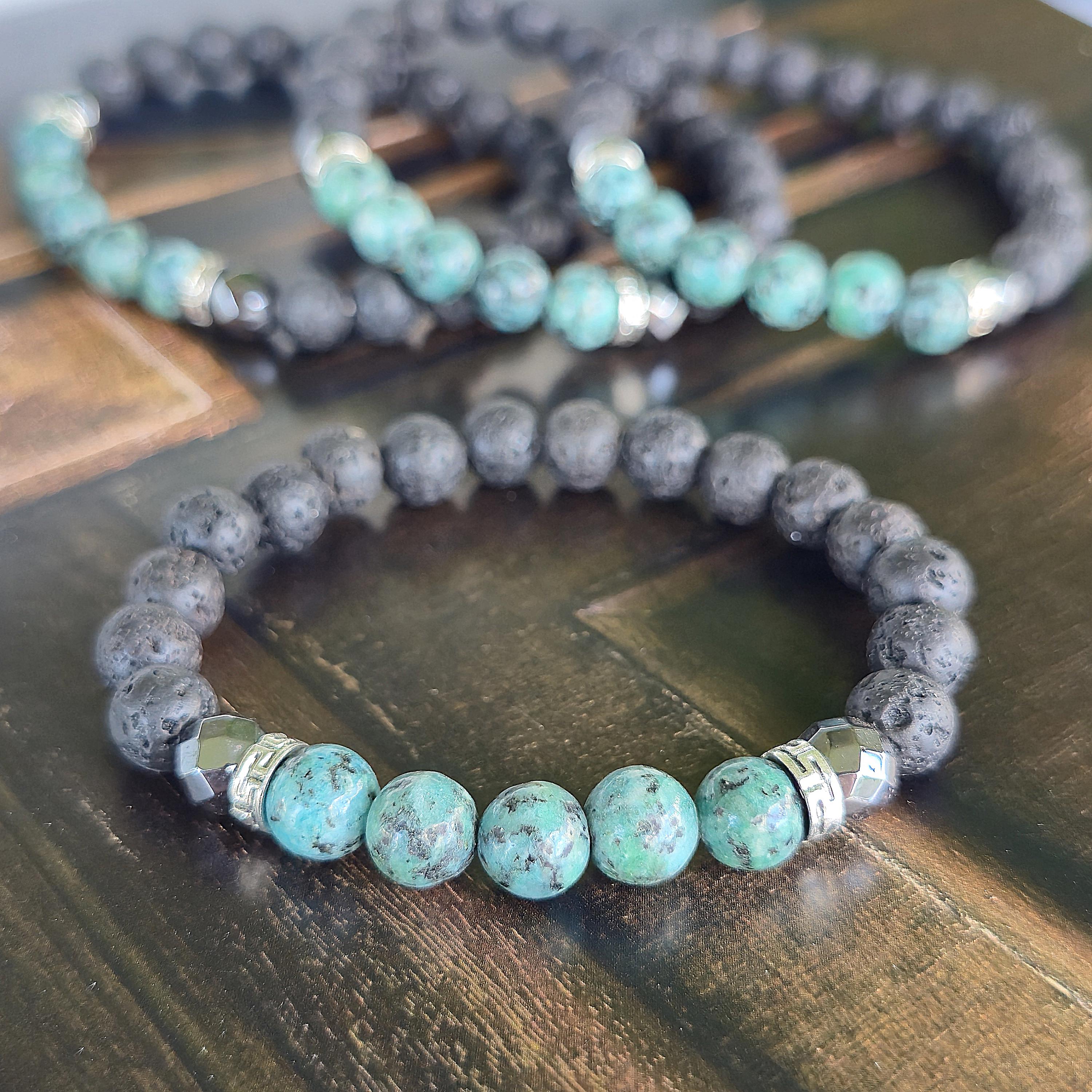African Turquoise is a jasper known for its metaphysical properties. This bracelet is believed to enhance communication, support spiritual growth, and encourage positive life changes. Paired with Lava stone, its absorbent nature makes it perfect for aromatherapy oil diffusion, offering a gentle alternative for those sensitive to direct skin application. Simply add 1 to 3 drops of essential oil to the porous lava stone, allow it to absorb, and enjoy a personal aromatherapy experience.