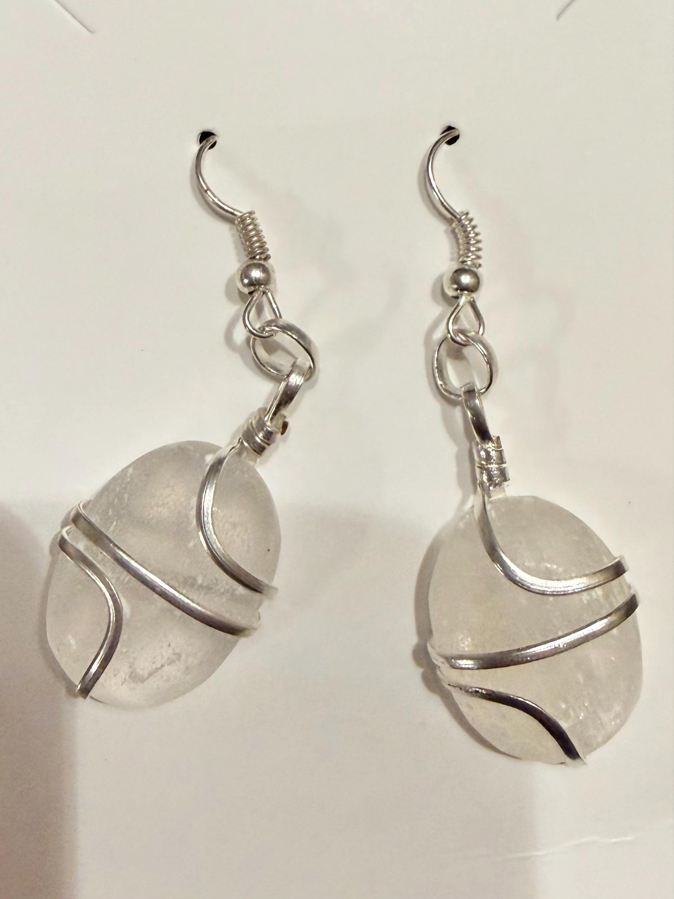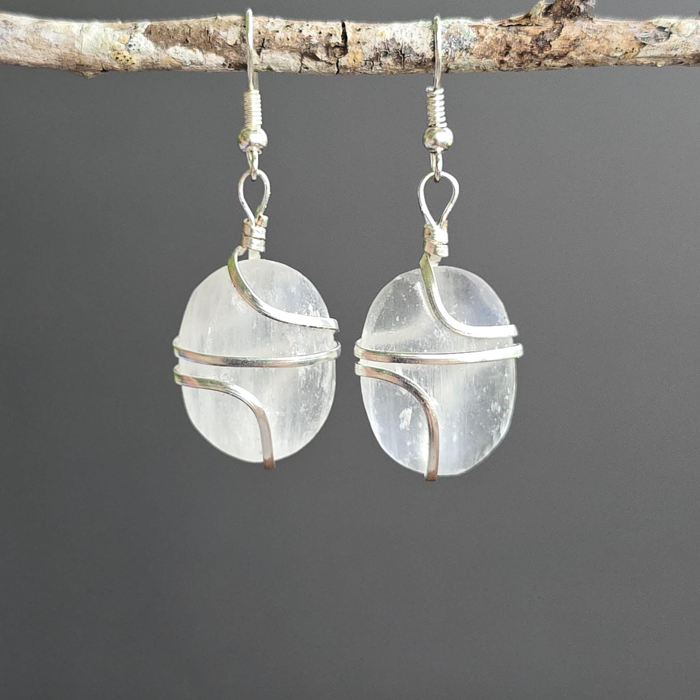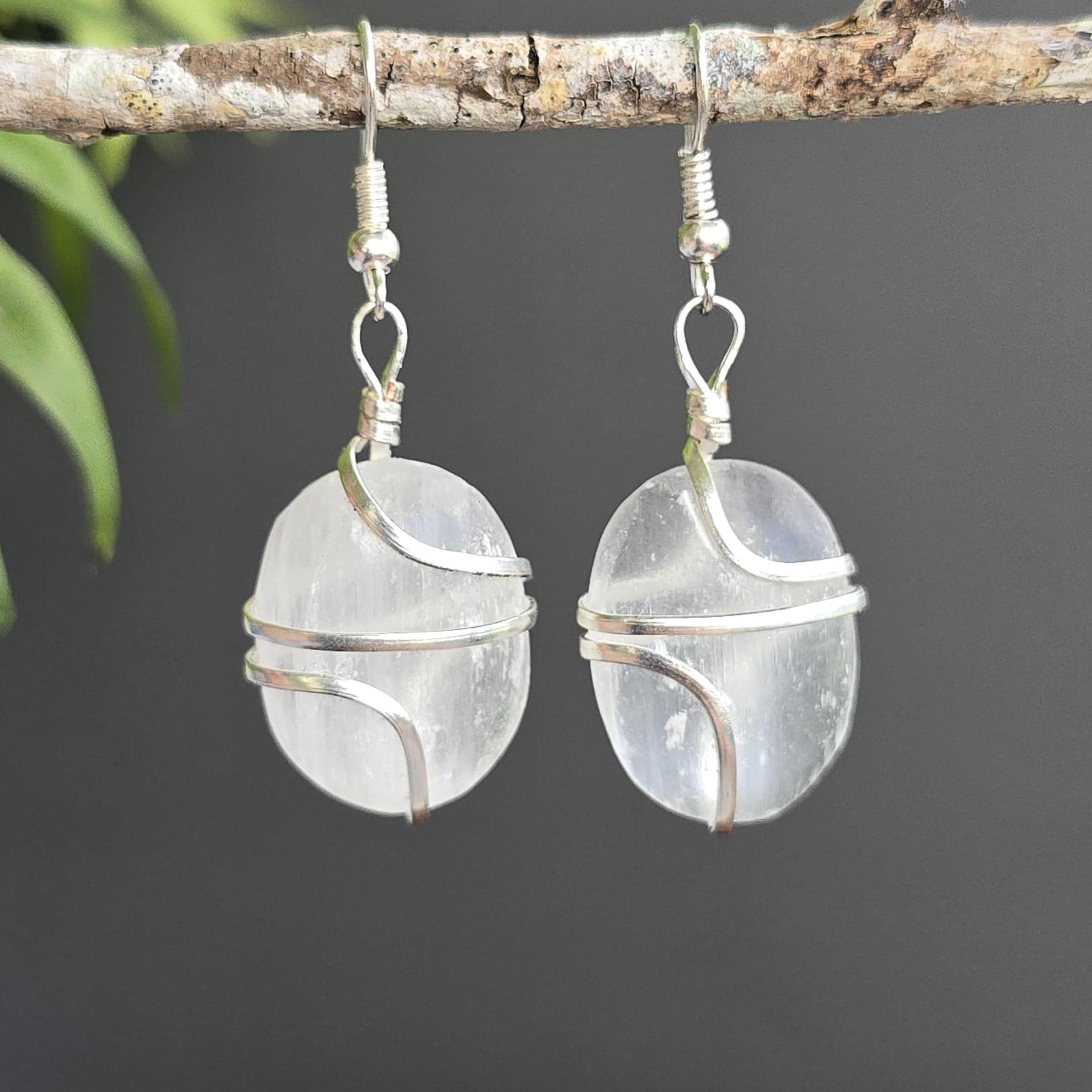 Selenite Dangle Earrings, Wire Wrapped Gemstone Drop Earrings