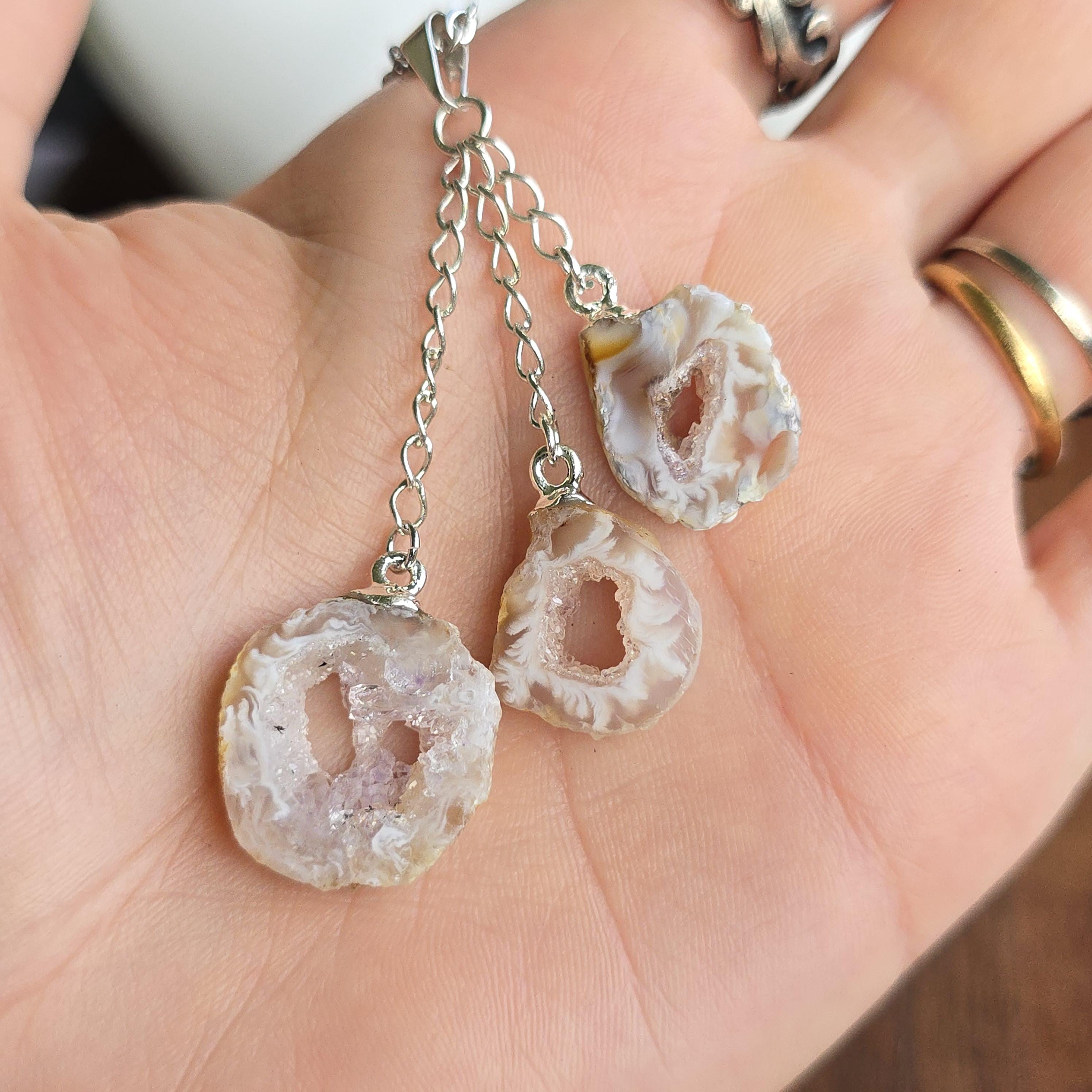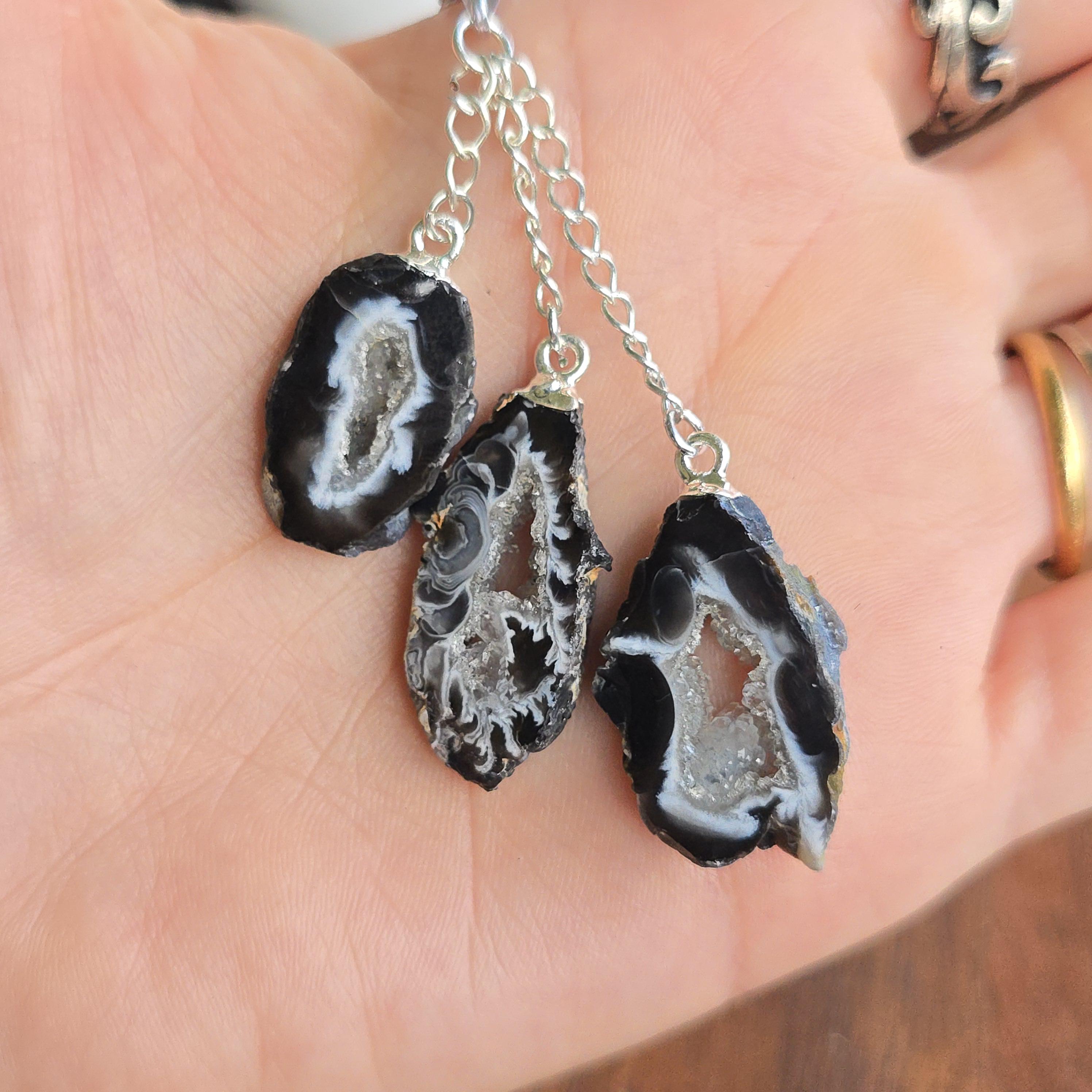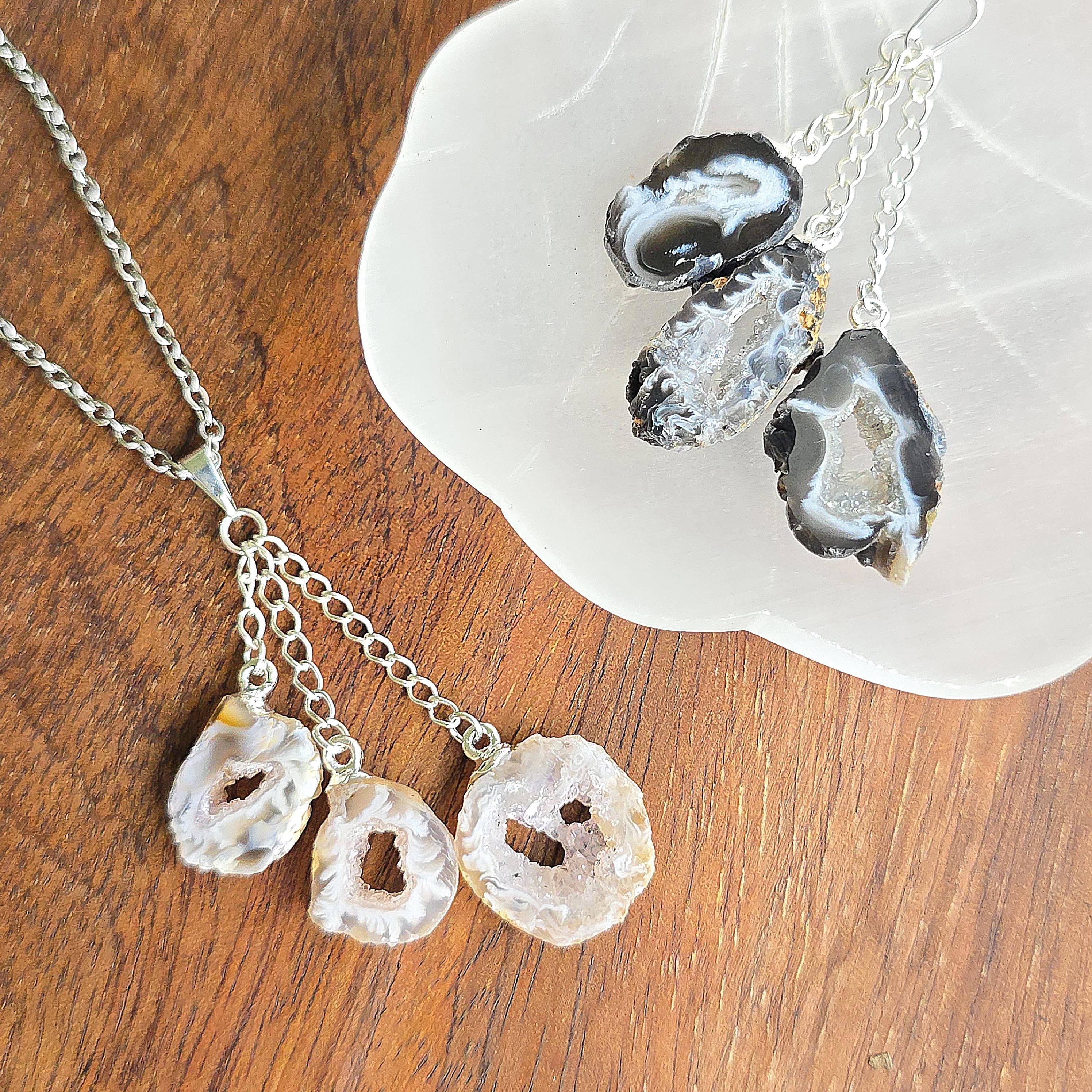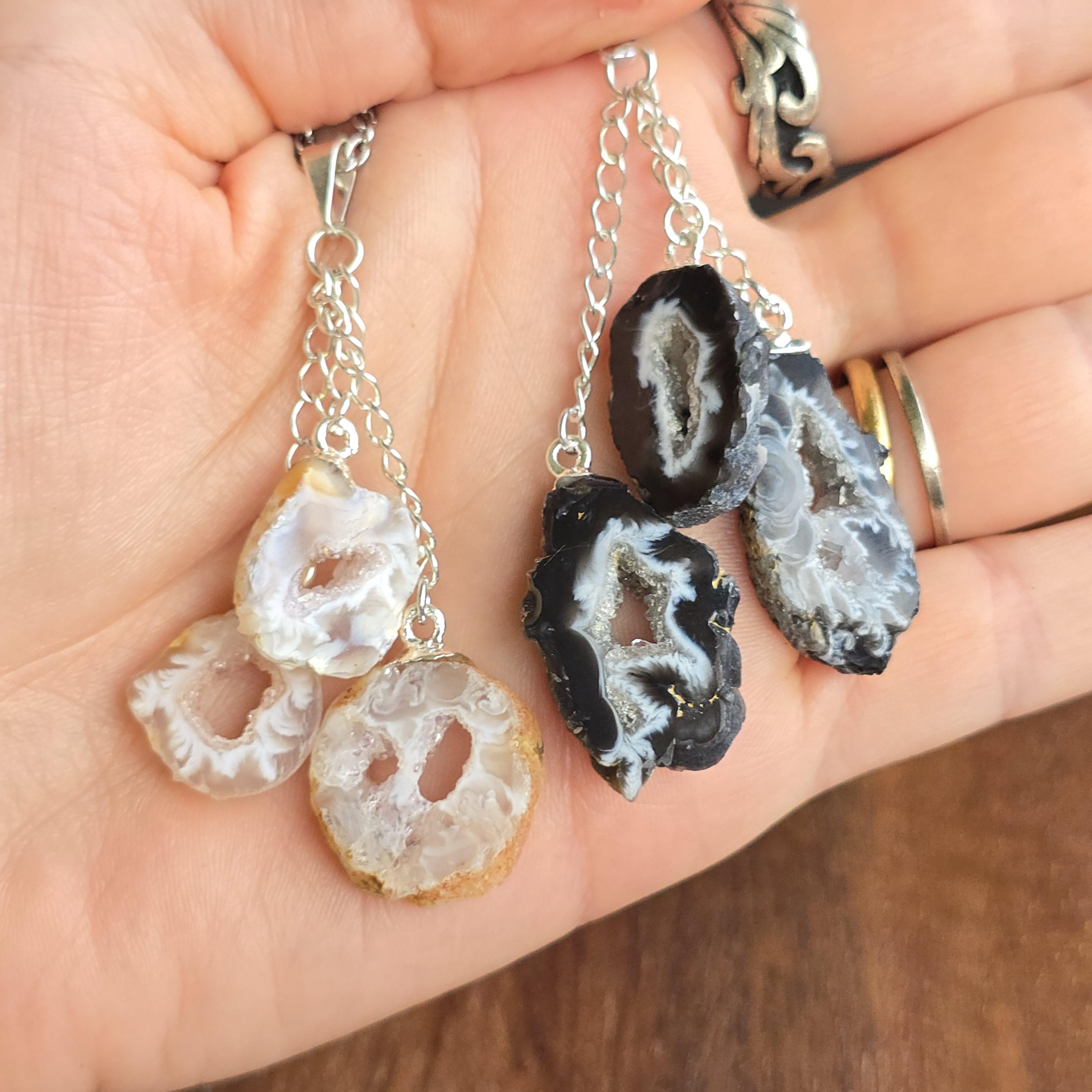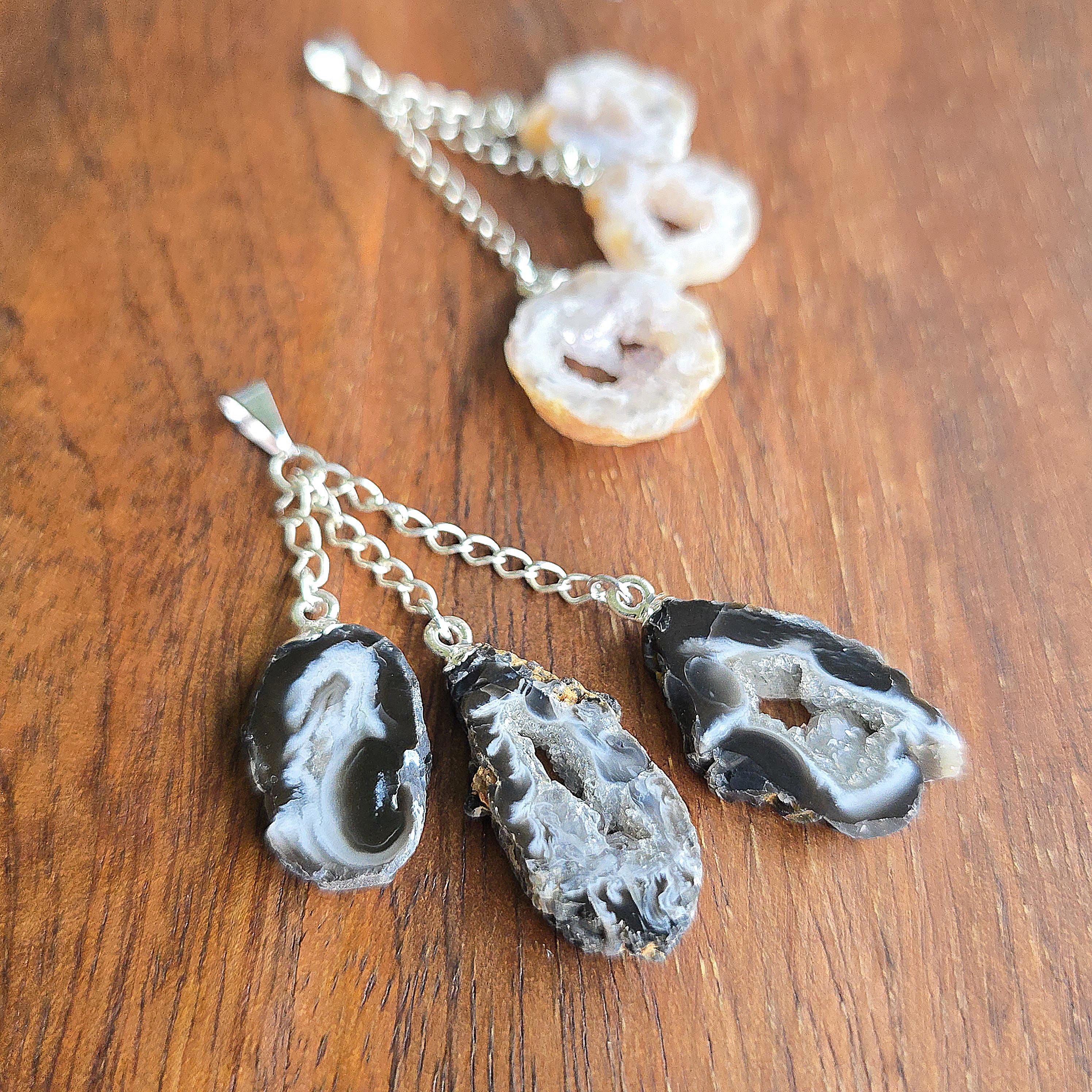 This handmade crystal pendant features three Oco Agate geode slices in a layered drop. Each slice reveals a hollow cavity lined with crystals, with colors ranging from white and black to white and beige. Oco Geodes vary in shades of colors from white and black to white and beige. Oco geodes are natural rock formations that have a hollow cavity lined with crystals. They are believed to have metaphysical benefits that vary depending on the type of crystals found within them.