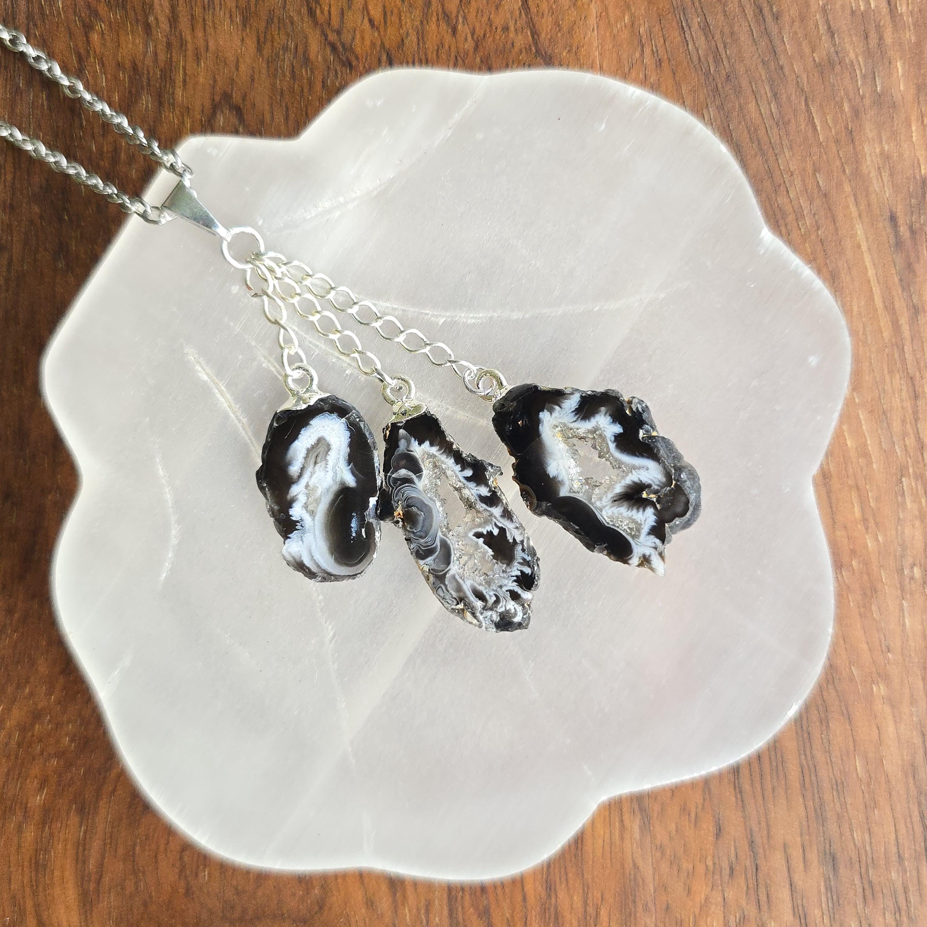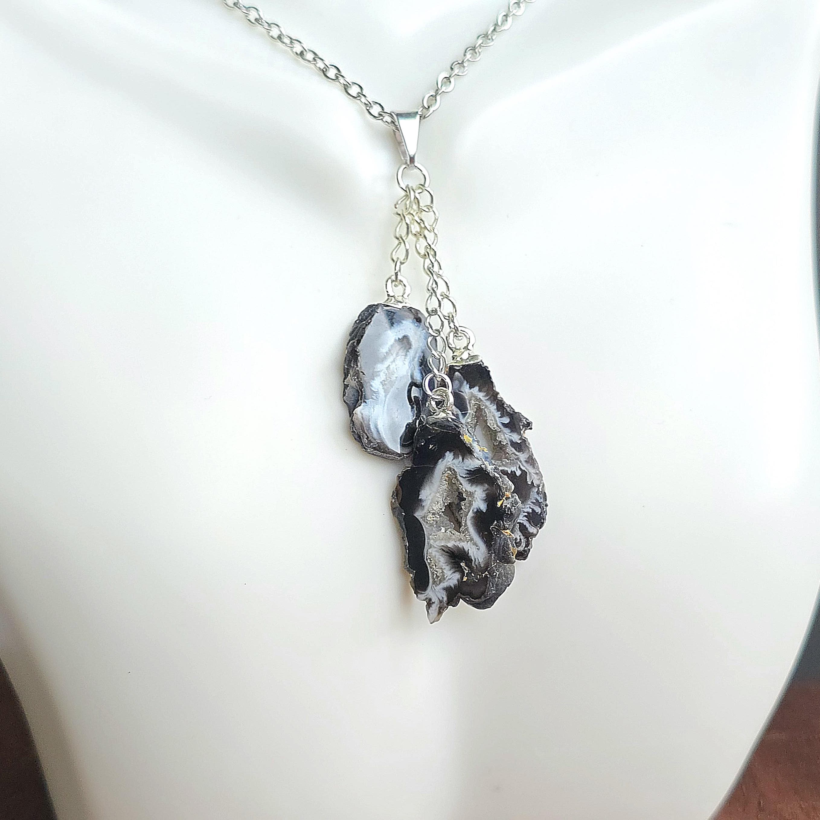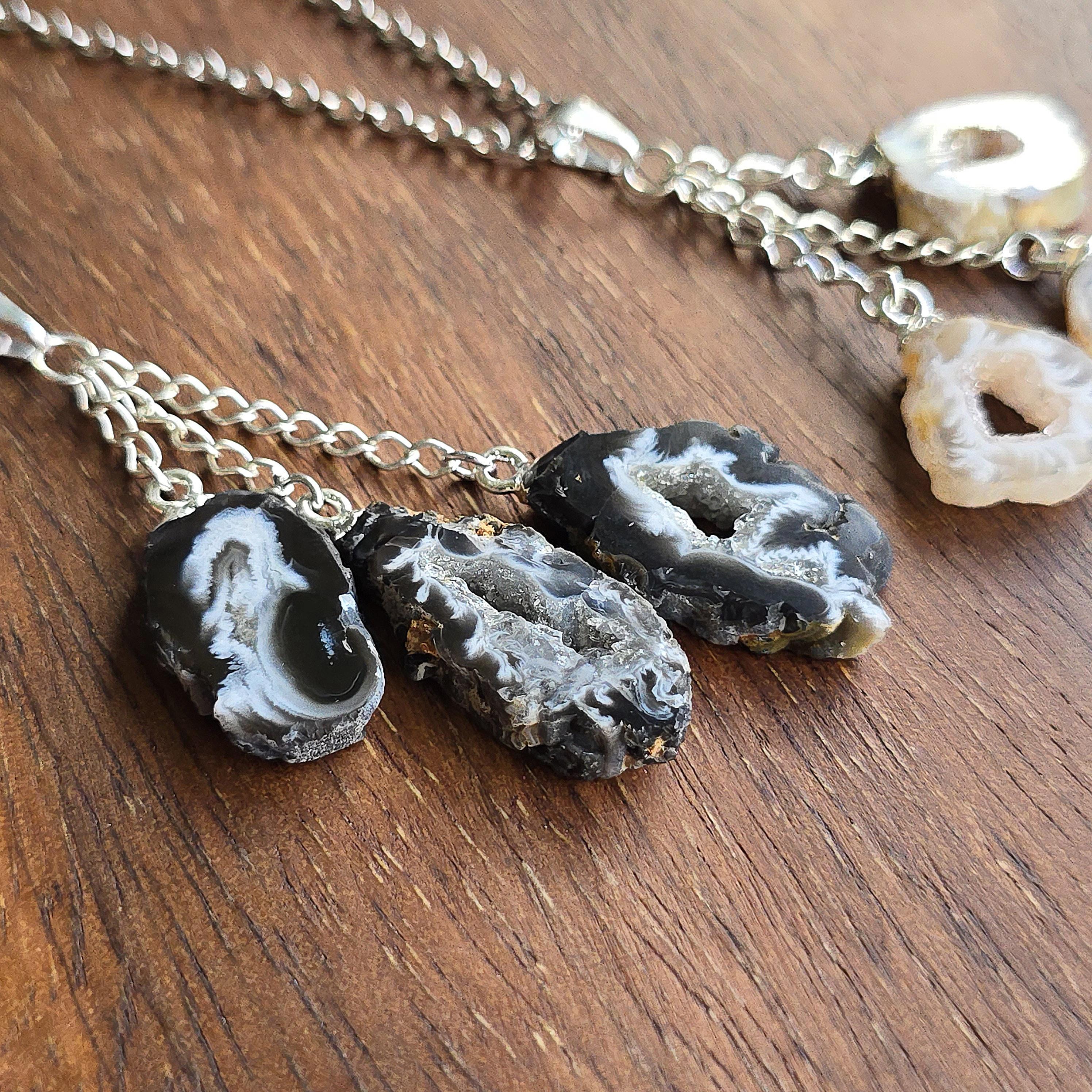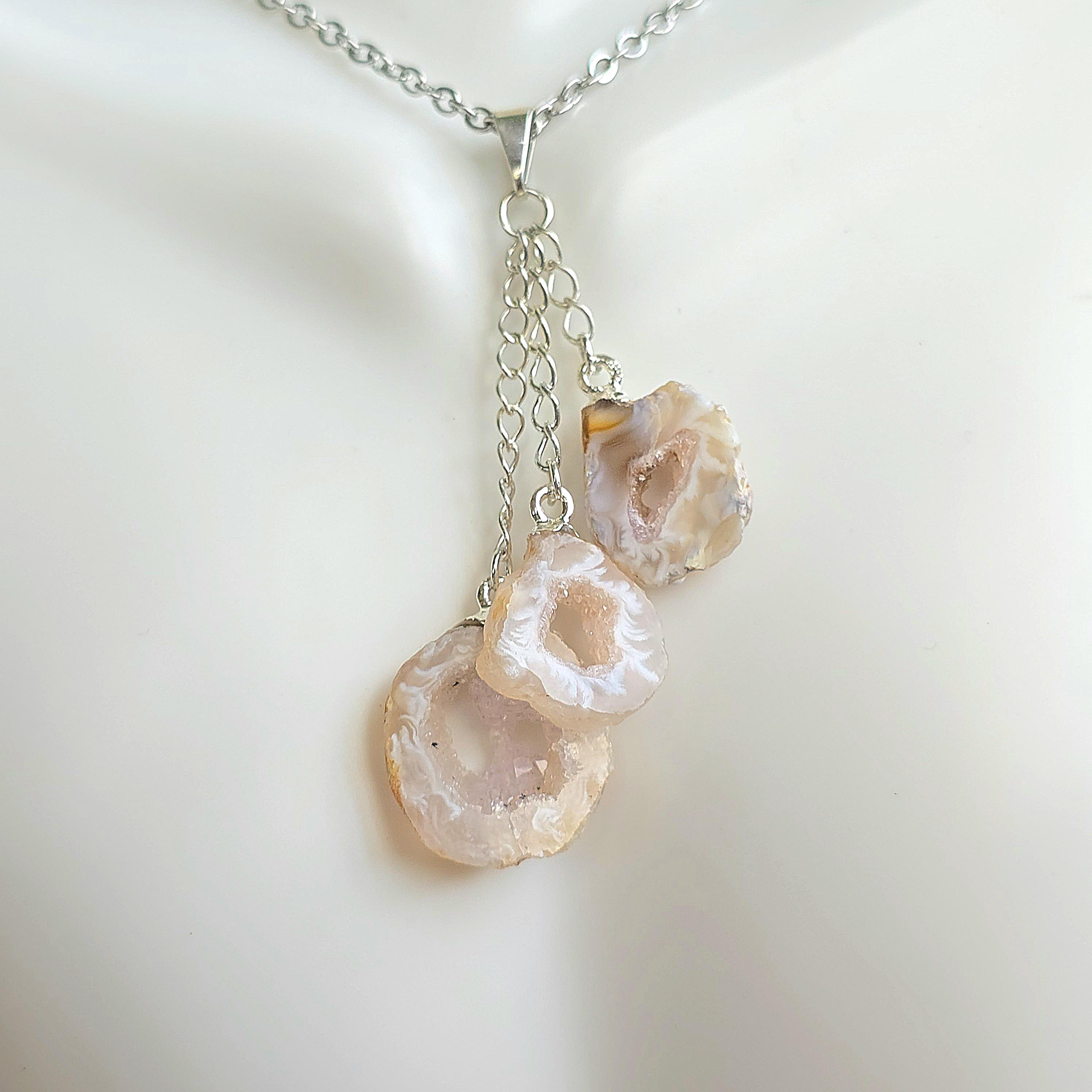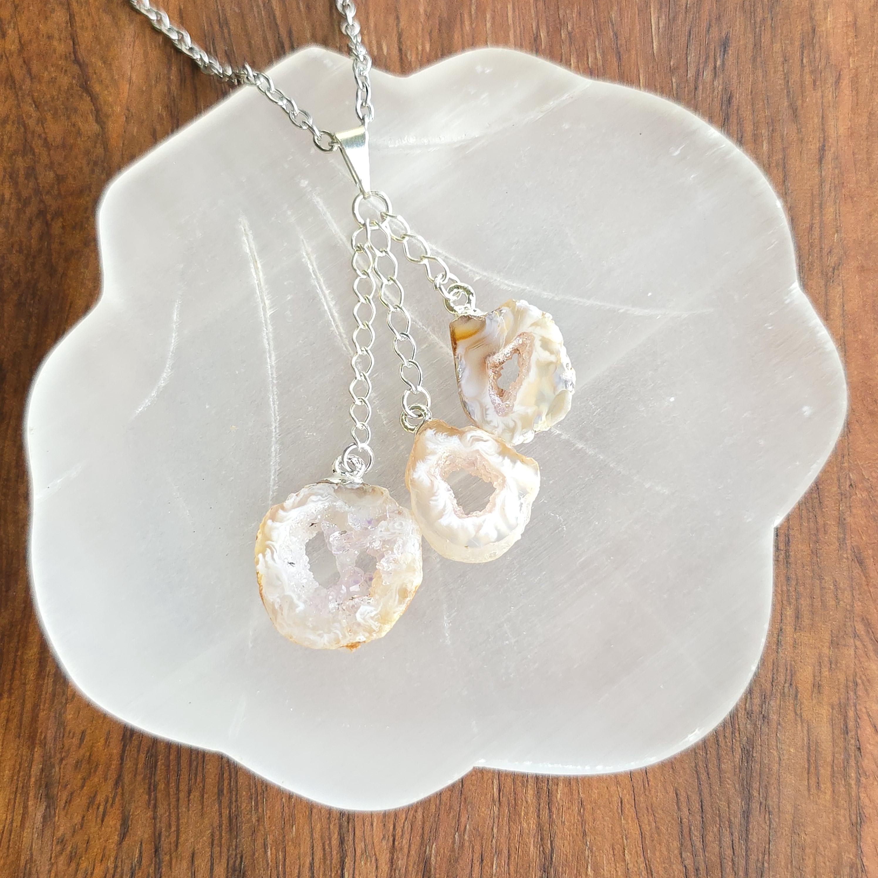 This handmade crystal pendant features three Oco Agate geode slices in a layered drop. Each slice reveals a hollow cavity lined with crystals, with colors ranging from white and black to white and beige. Oco Geodes vary in shades of colors from white and black to white and beige. Oco geodes are natural rock formations that have a hollow cavity lined with crystals. They are believed to have metaphysical benefits that vary depending on the type of crystals found within them.