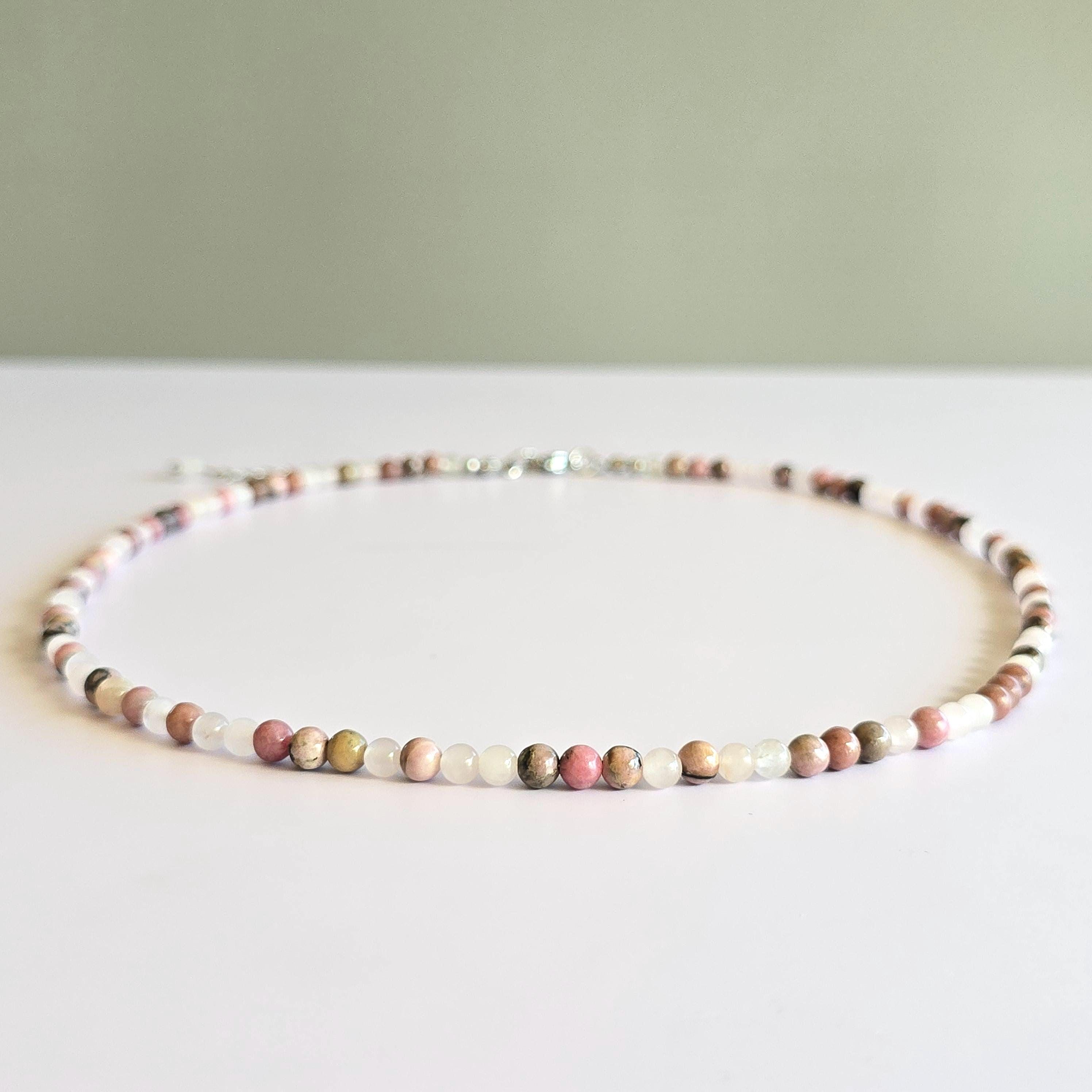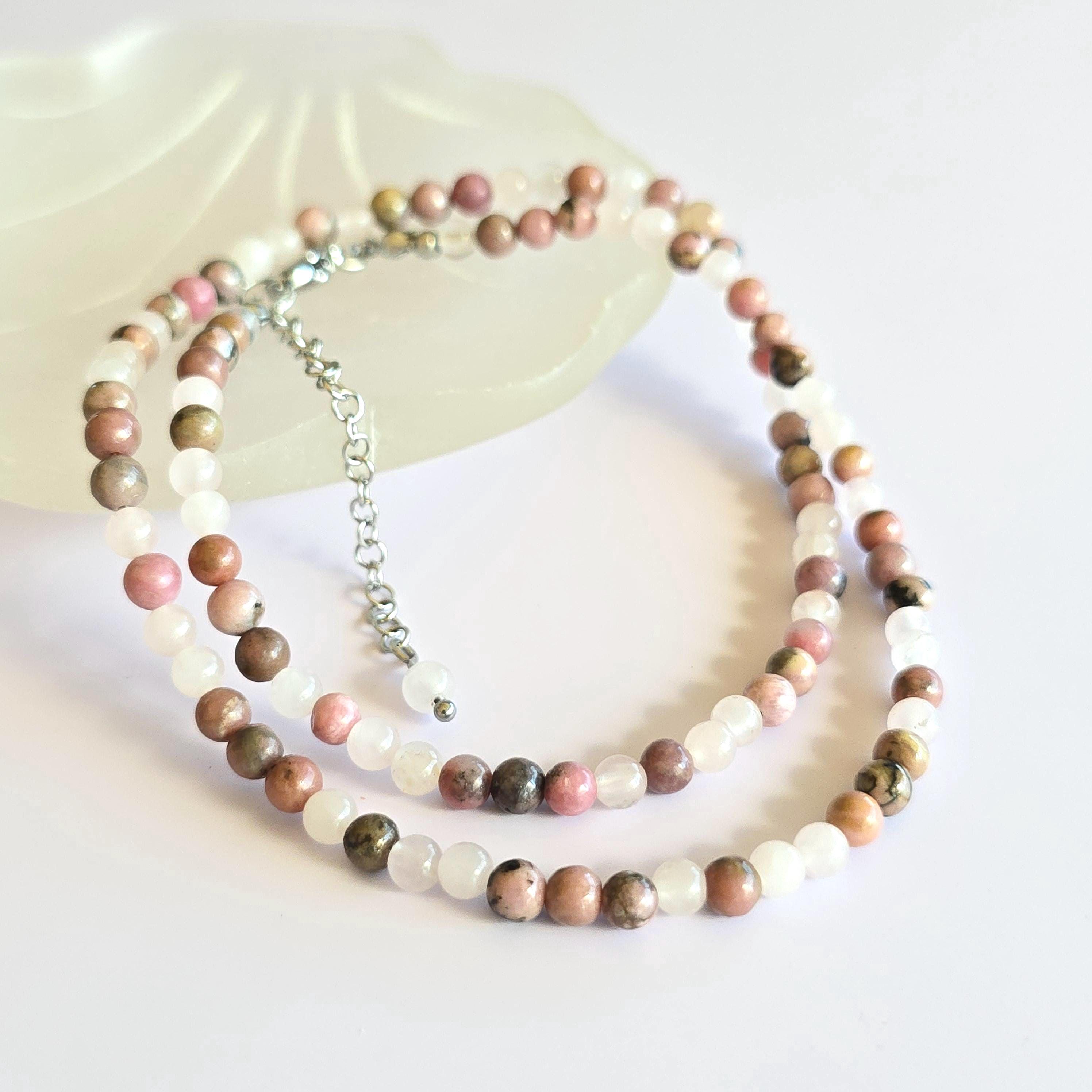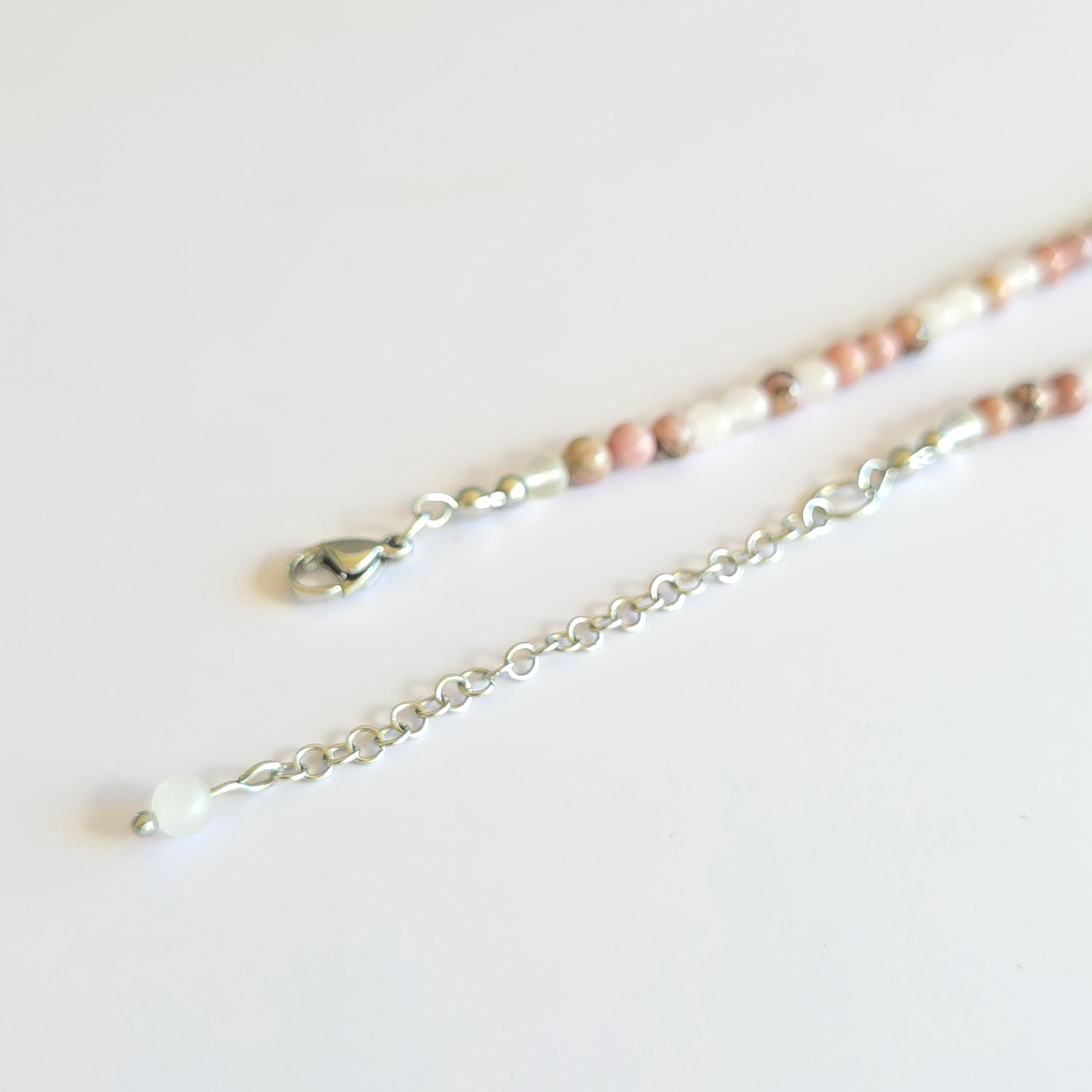 This necklace is adjustable, with a length that can range from 16 to 18 inches, ensuring a comfortable fit for any occasion. With a choice between a sturdy stainless steel or sterling silver chain, this Rhodonite with Rose Quartz Choker Necklace is a stylish addition to your jewelry collection, radiating beauty and inner strength.