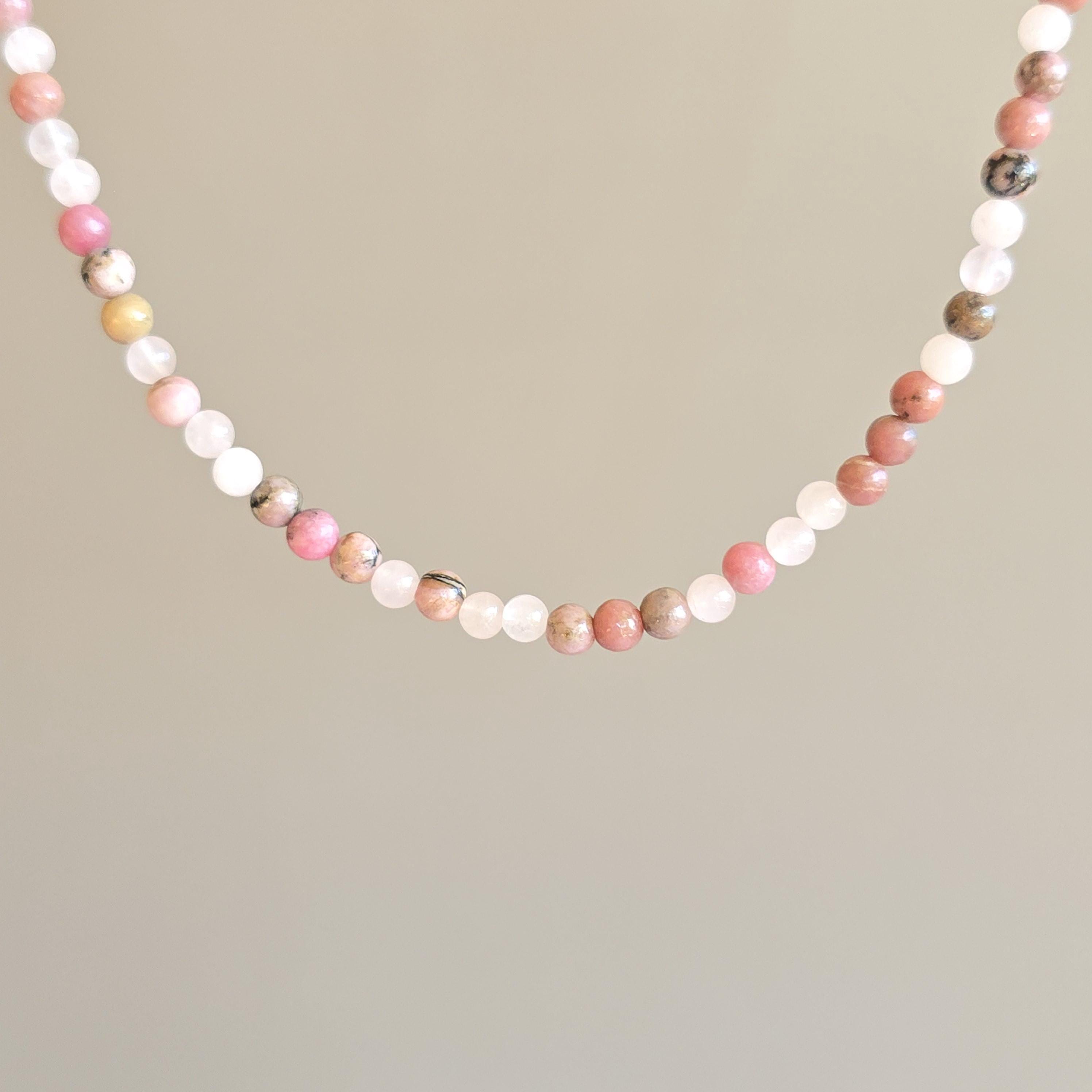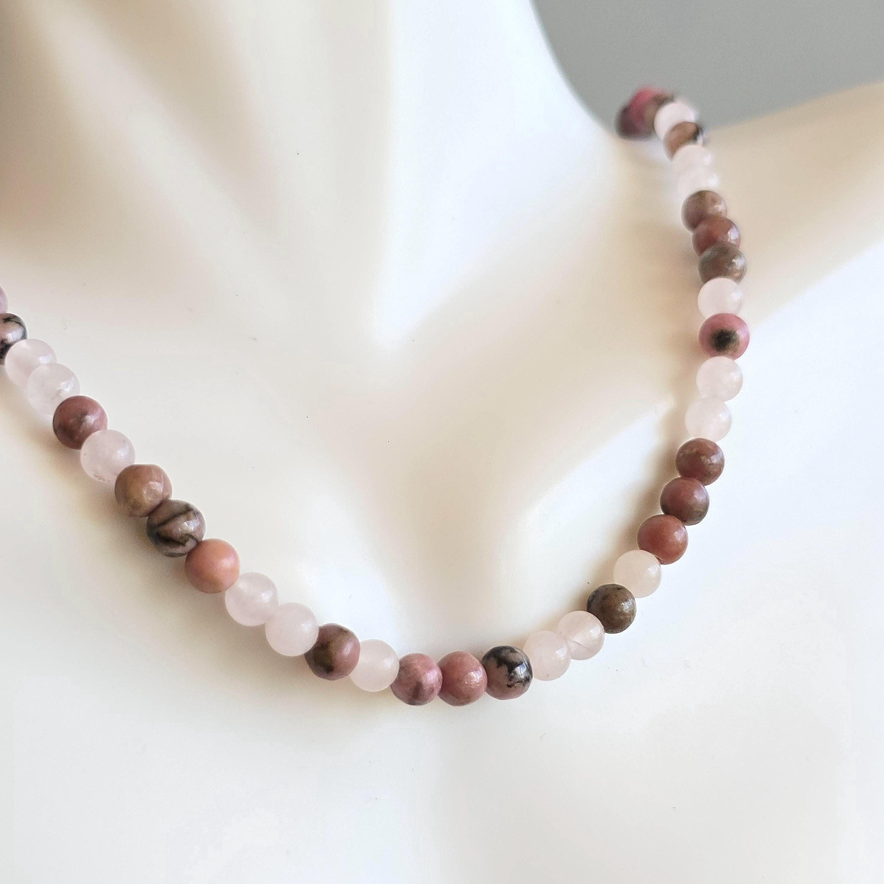 Rhodonite with Rose Quartz Crystal Choker: 16 Inch Handmade Gemstone Beaded Necklace