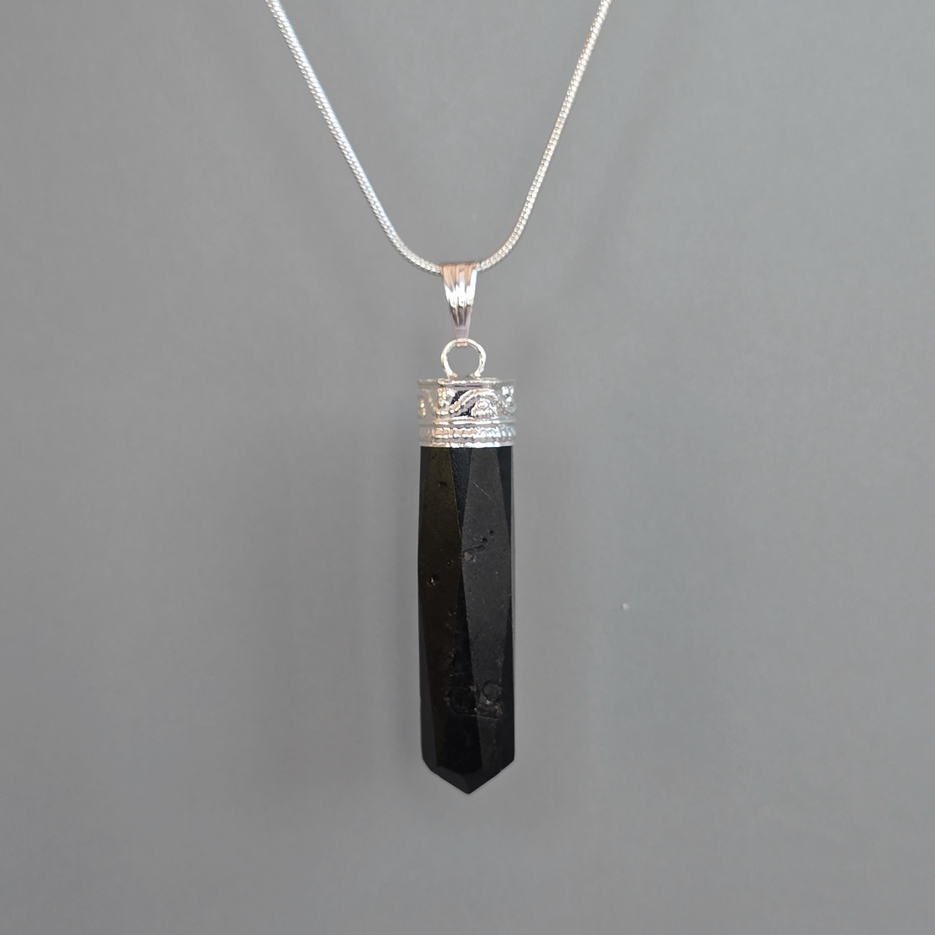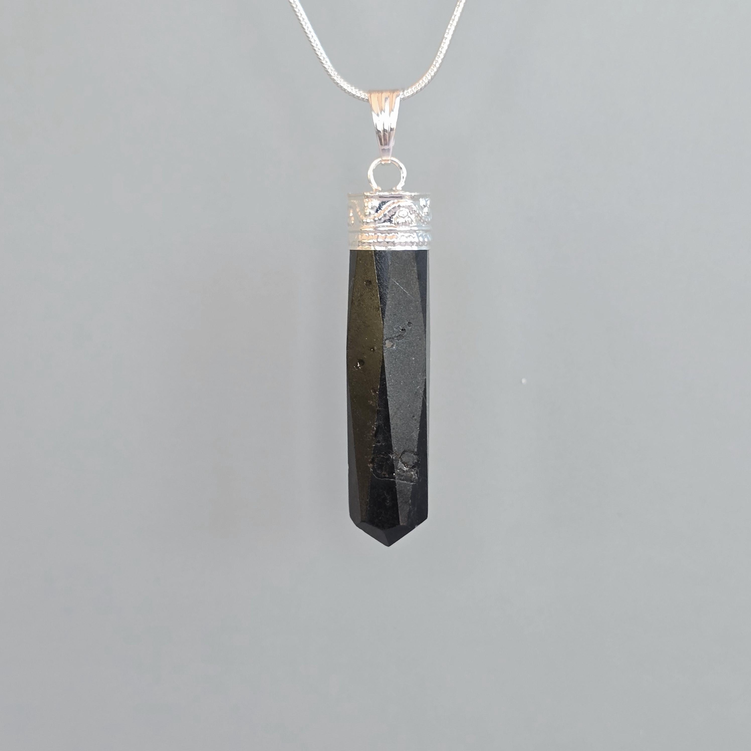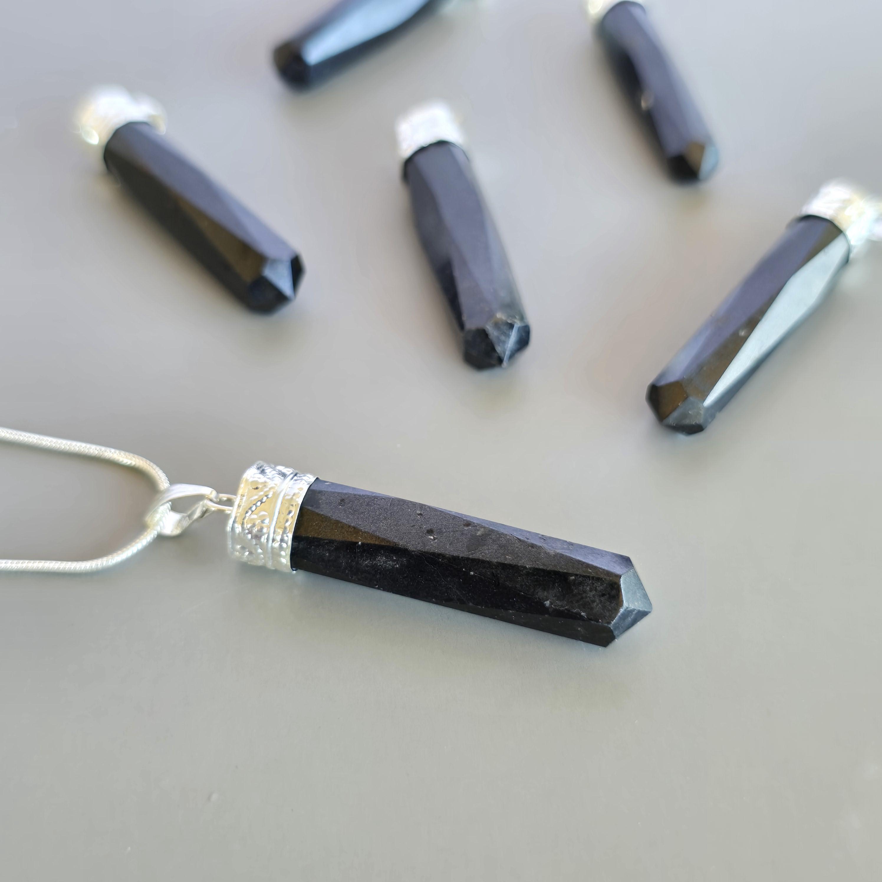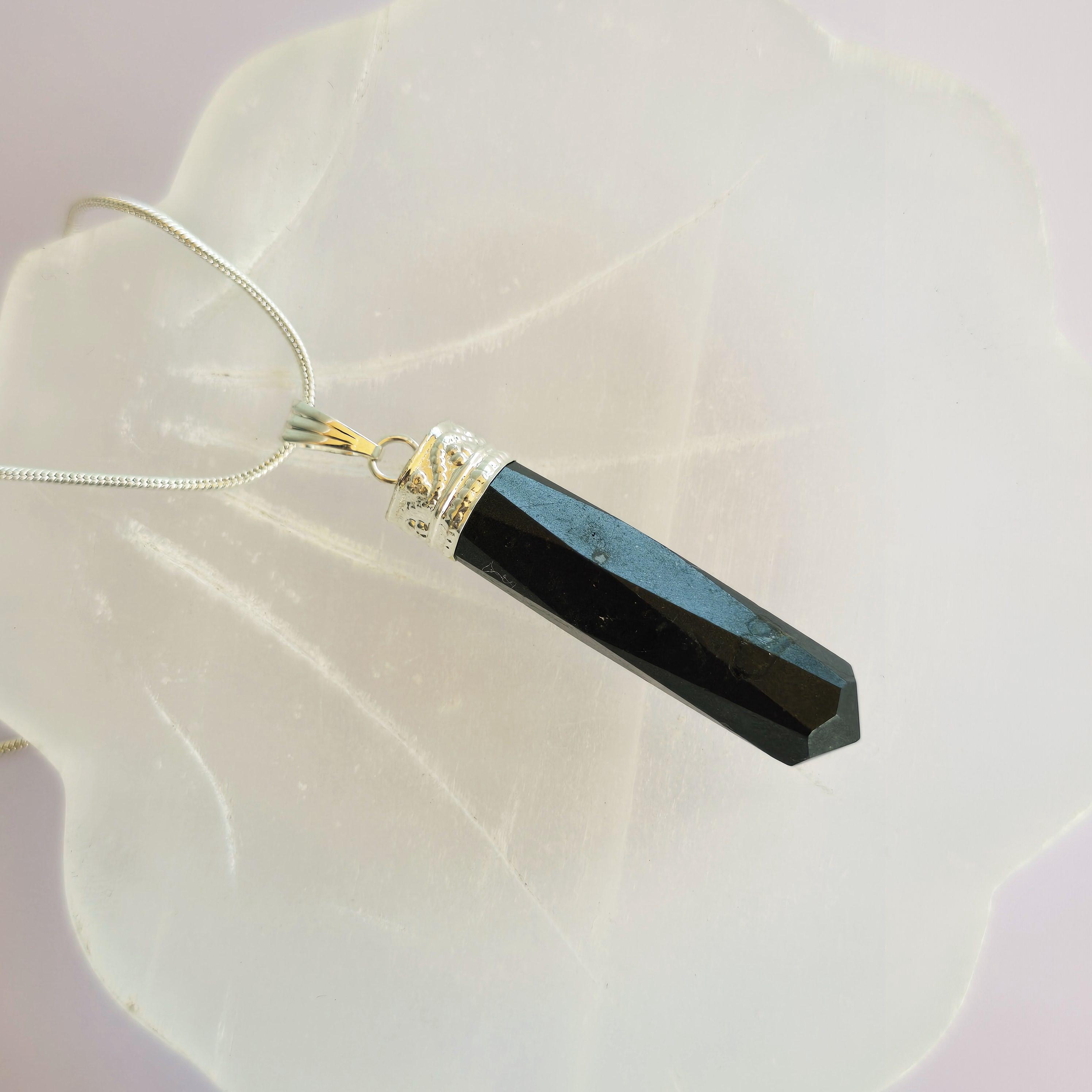 This gemstone pendant features a polished Black Tourmaline crystal point with a silver plated accent cap, measuring approximately 50mm x 10mm. This handmade pendant comes with a complimentary 18-inch cable chain to get your started ensuring easy and comfortable wear. Tourmaline jewelry offers protection qualities, making this stone pendant a stylish and grounded accessory.