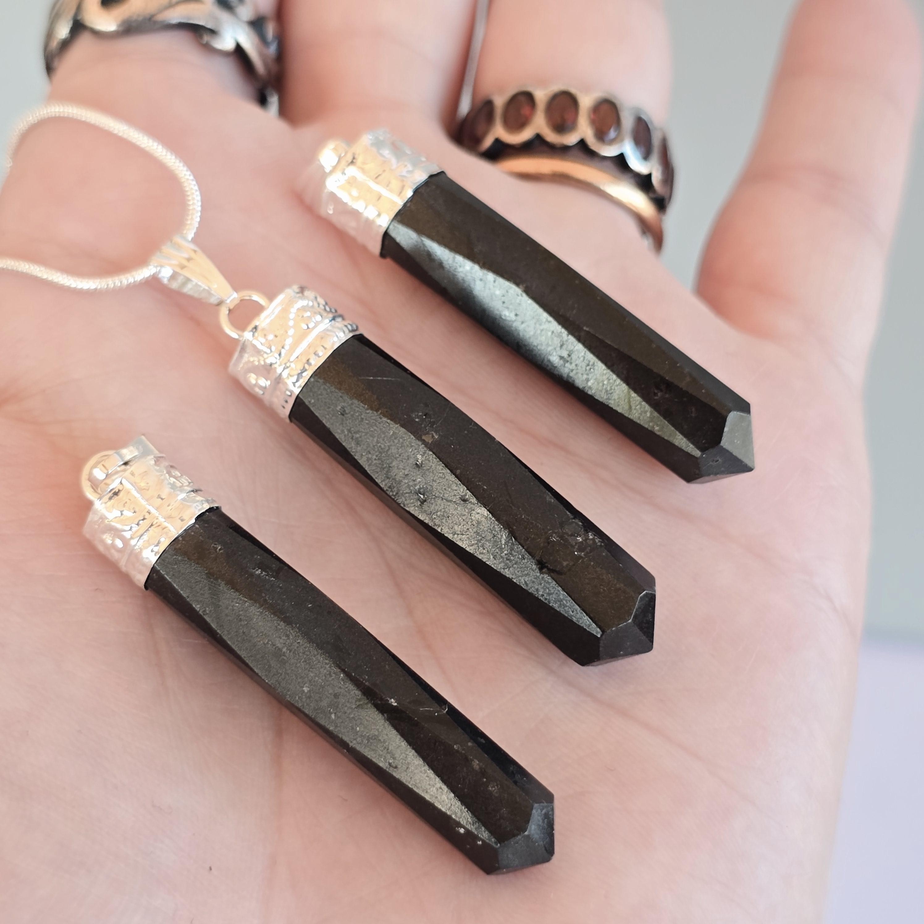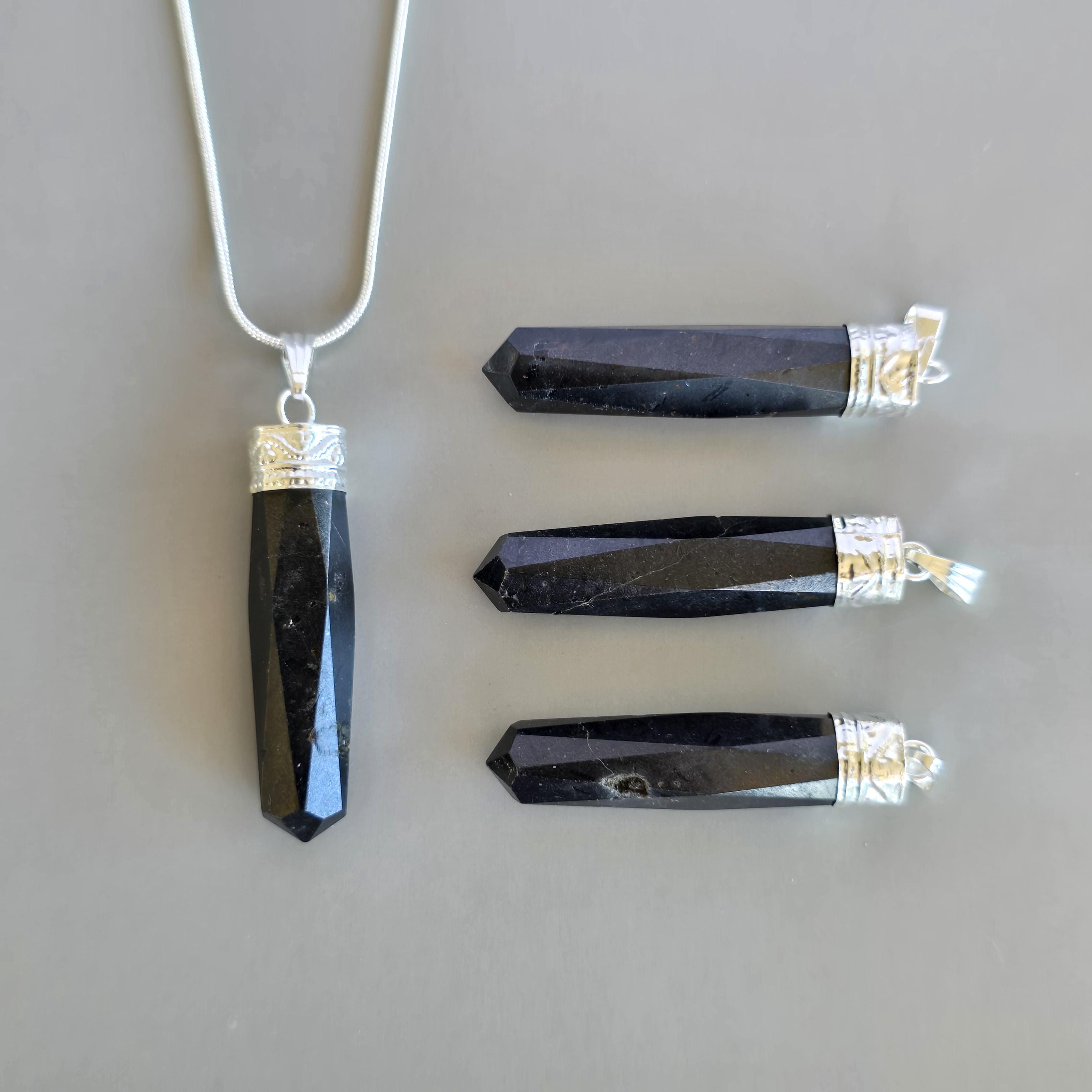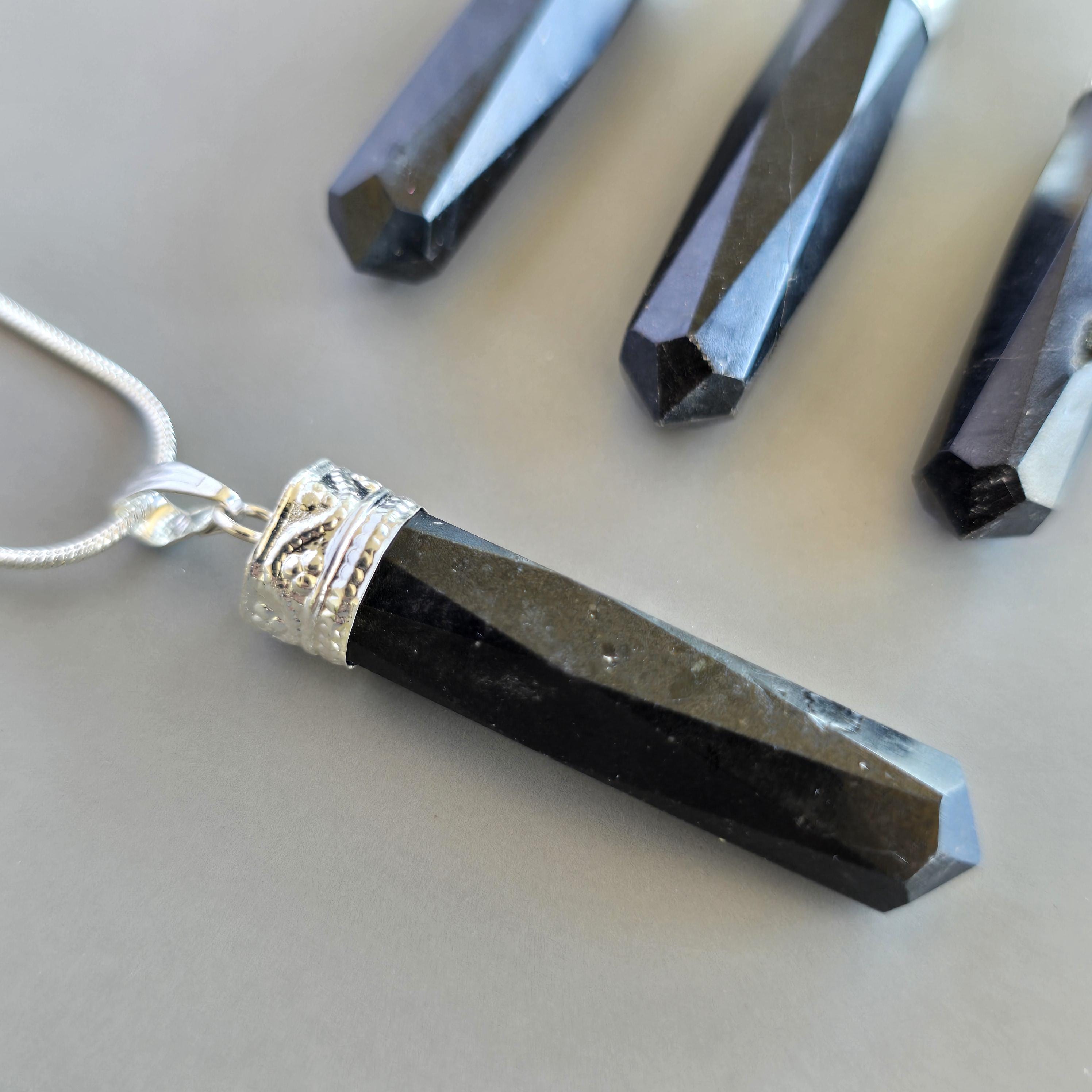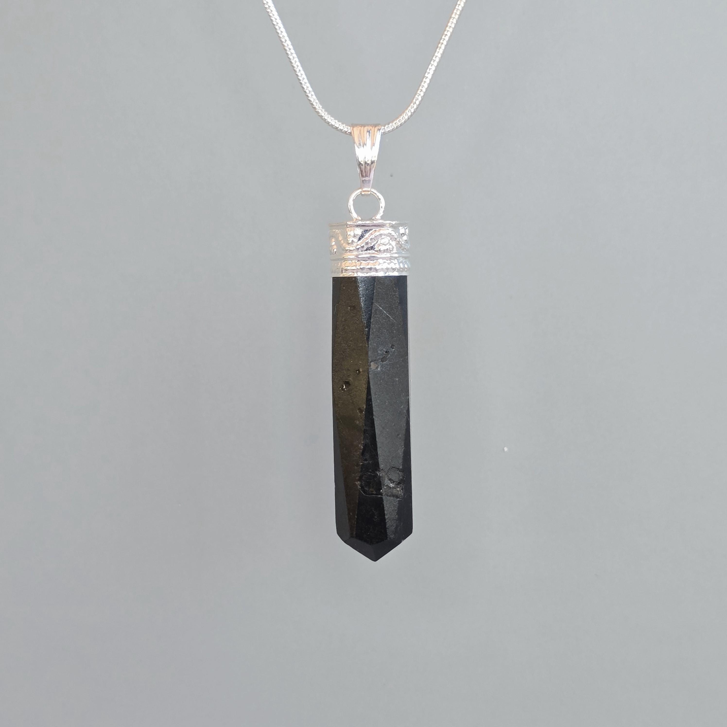 This gemstone pendant features a polished Black Tourmaline crystal point with a silver plated accent cap, measuring approximately 50mm x 10mm. This handmade pendant comes with a complimentary 18-inch cable chain to get your started ensuring easy and comfortable wear. Tourmaline jewelry offers protection qualities, making this stone pendant a stylish and grounded accessory.