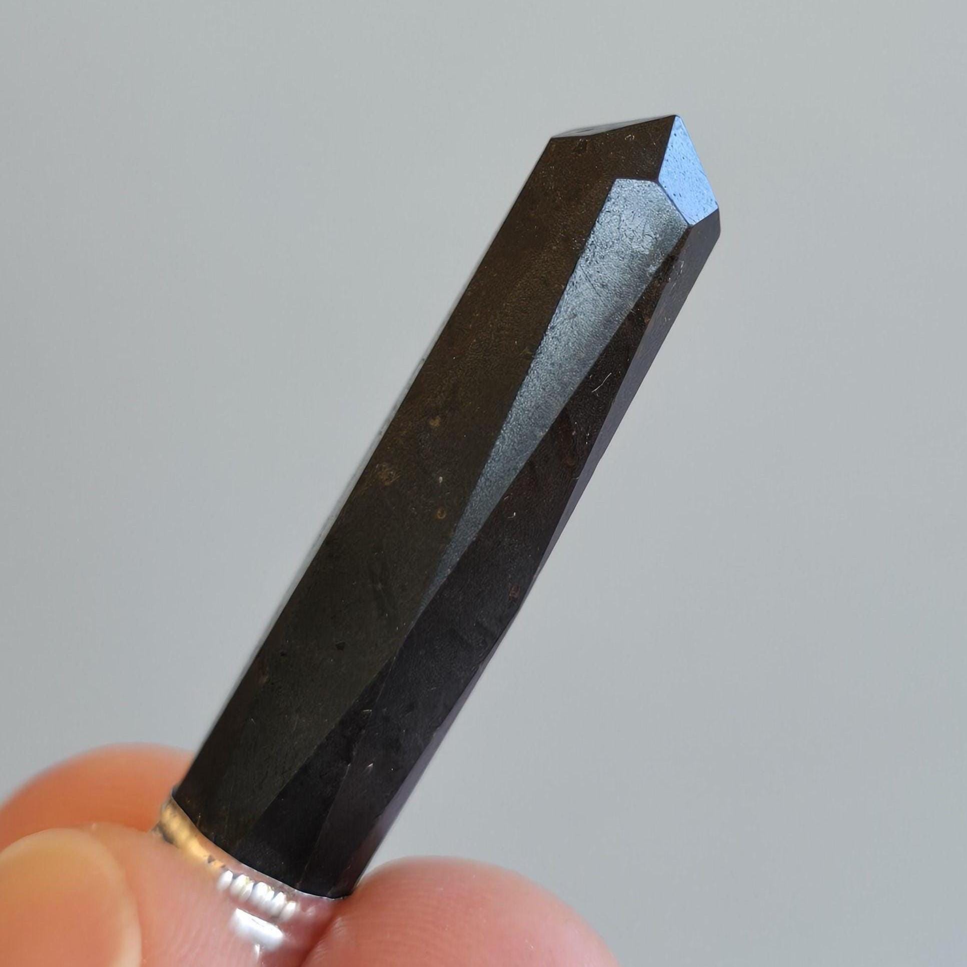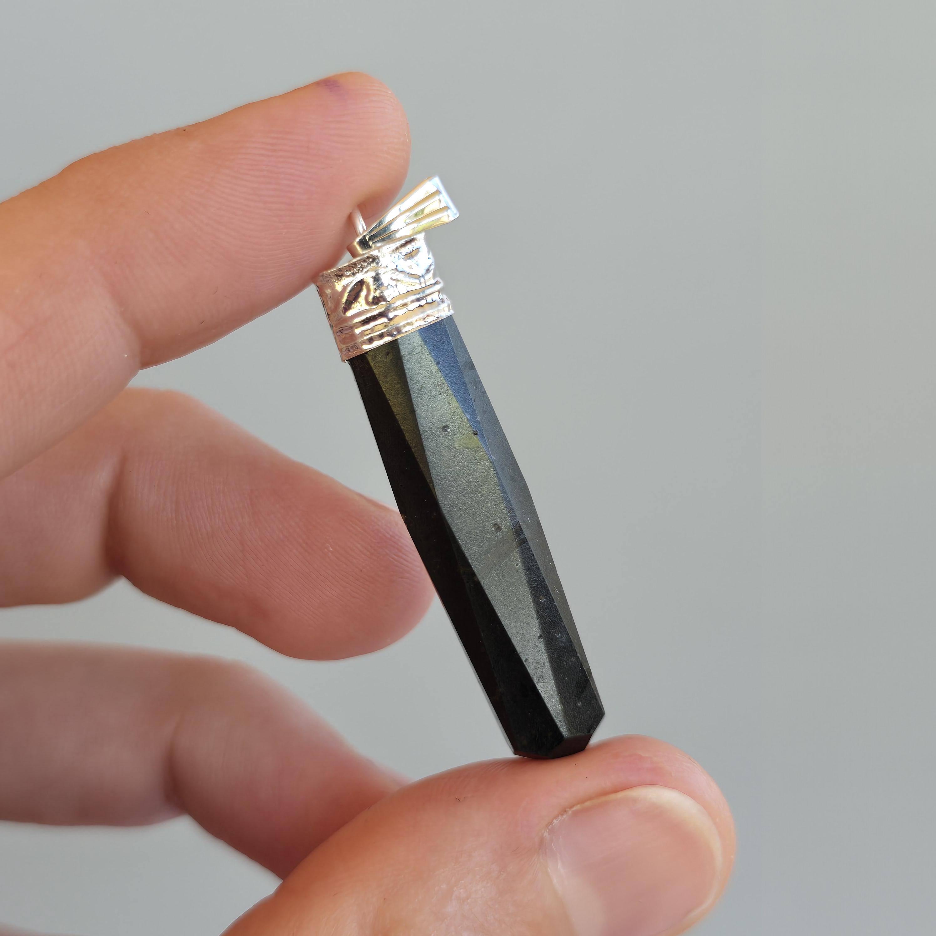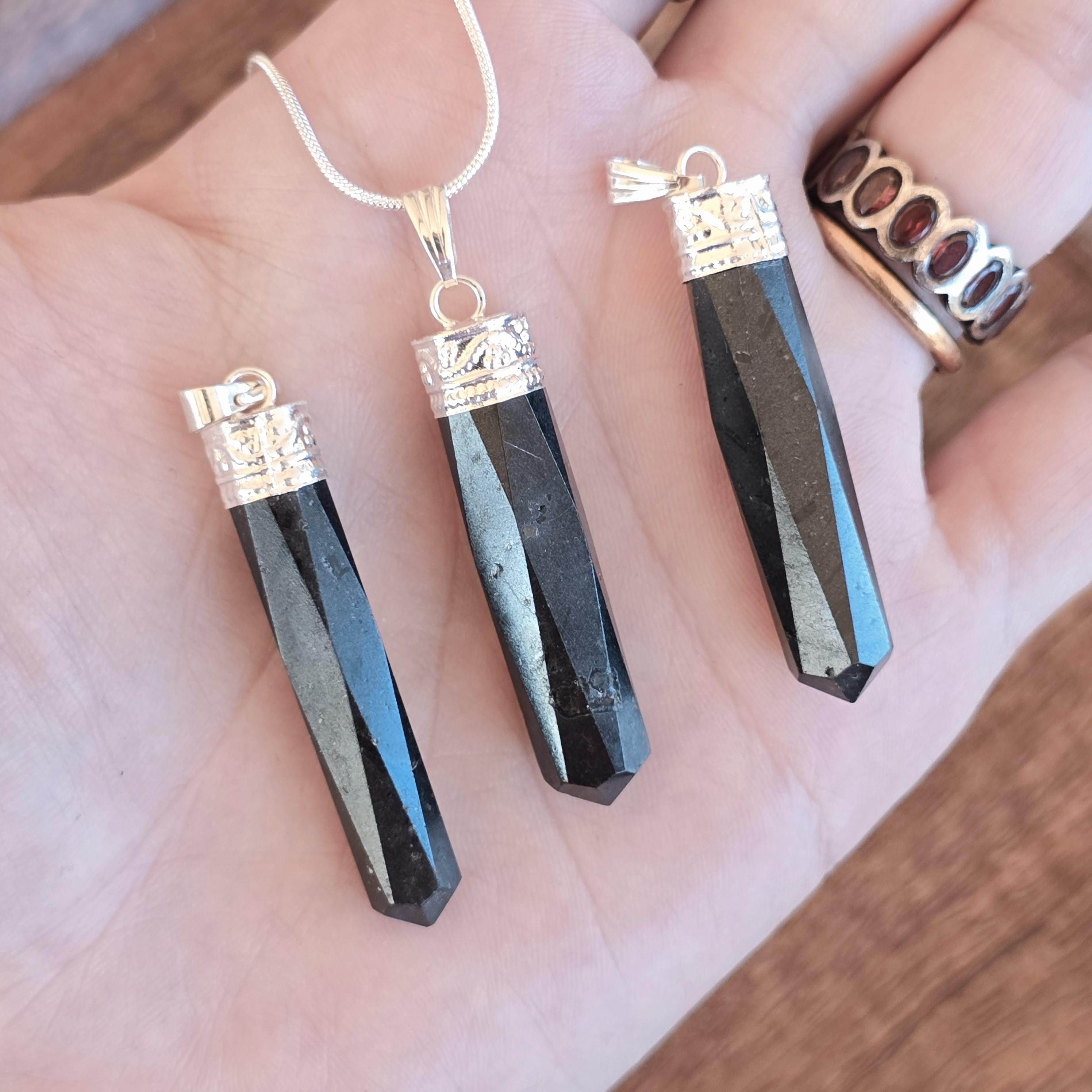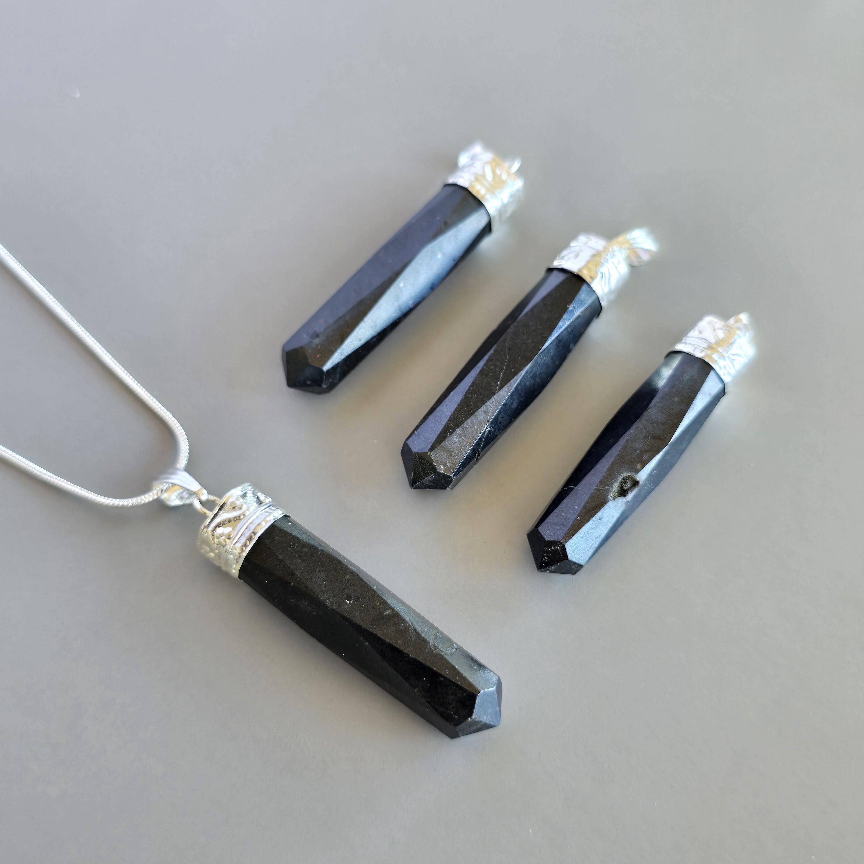 This gemstone pendant features a polished Black Tourmaline crystal point with a silver plated accent cap, measuring approximately 50mm x 10mm. This handmade pendant comes with a complimentary 18-inch cable chain to get your started ensuring easy and comfortable wear. Tourmaline jewelry offers protection qualities, making this stone pendant a stylish and grounded accessory.