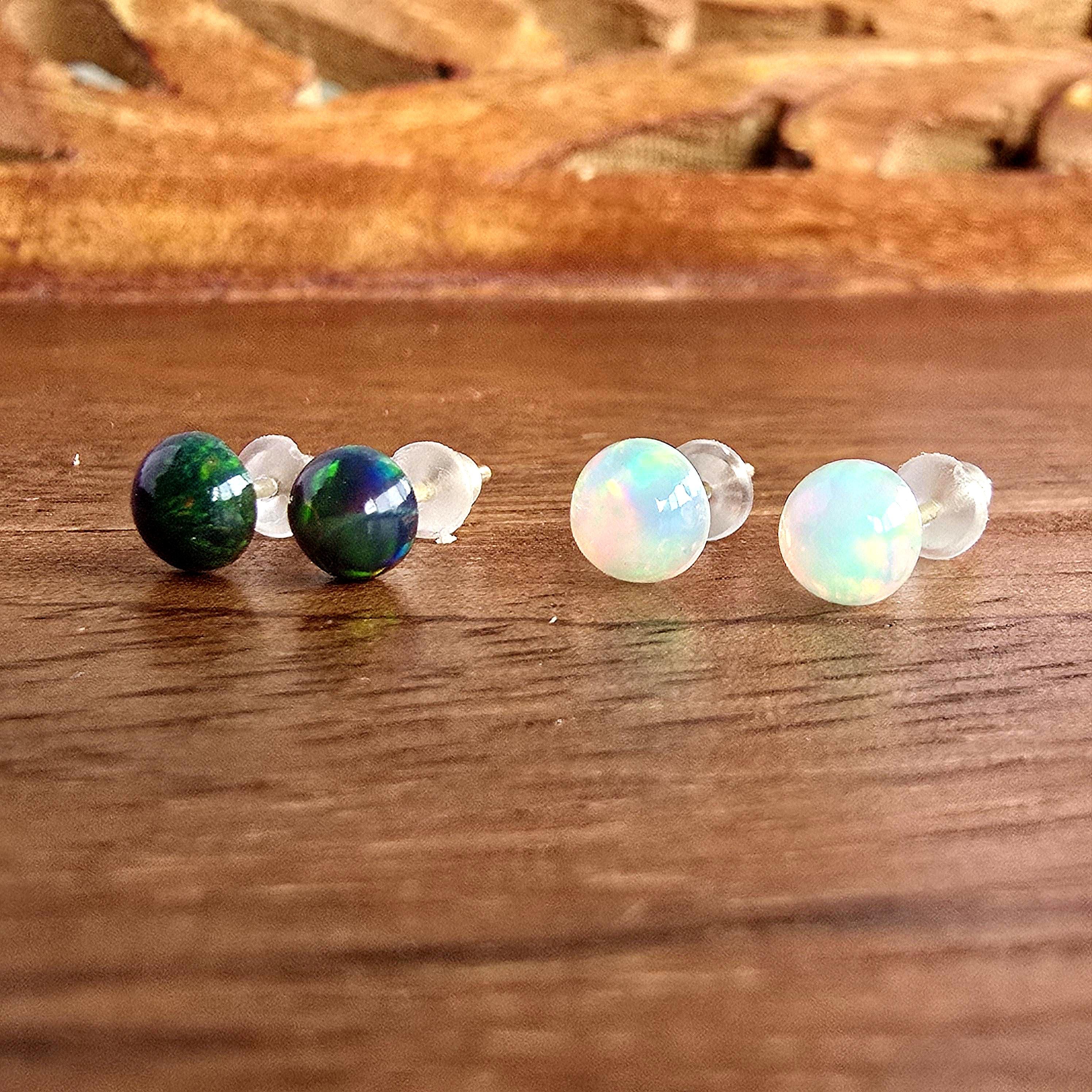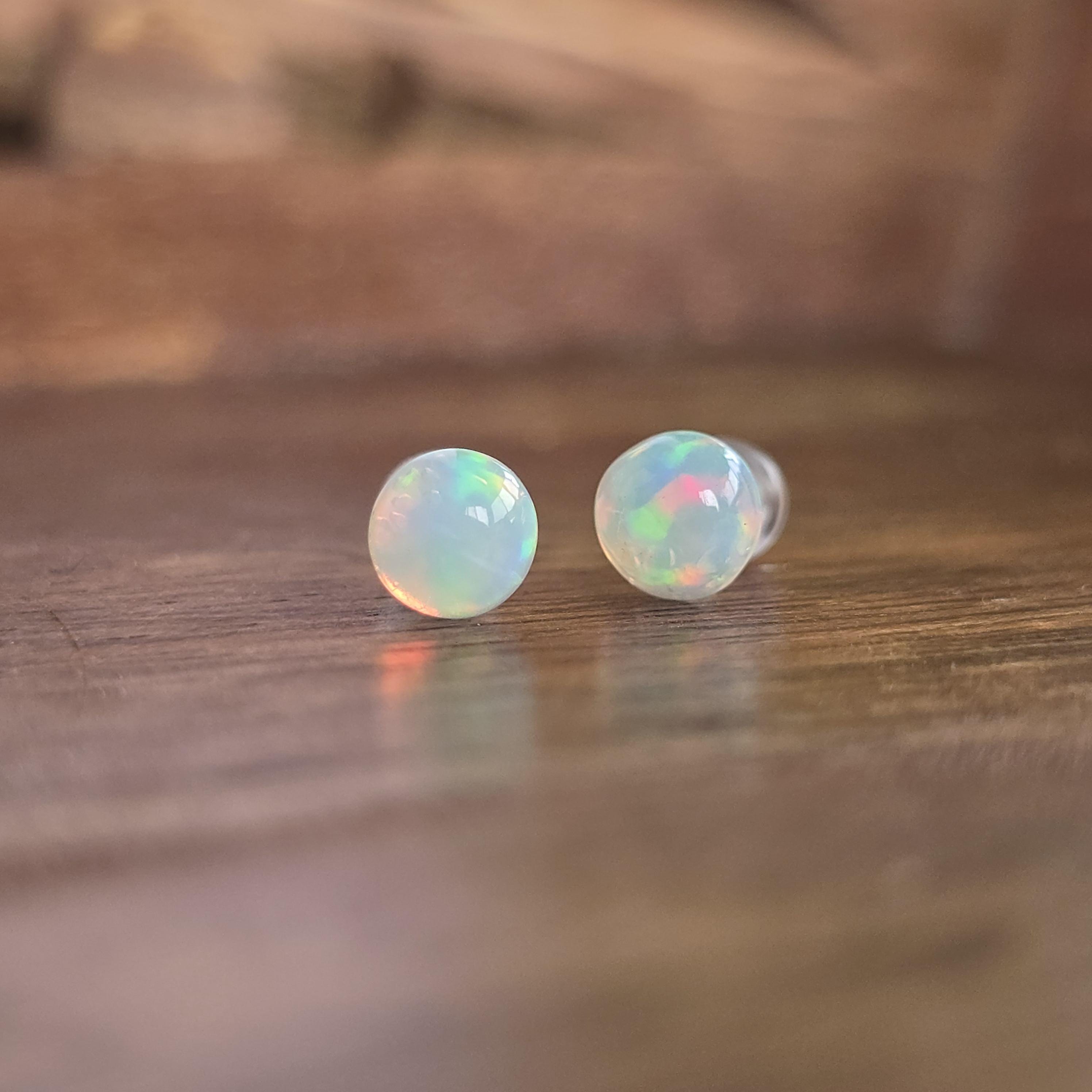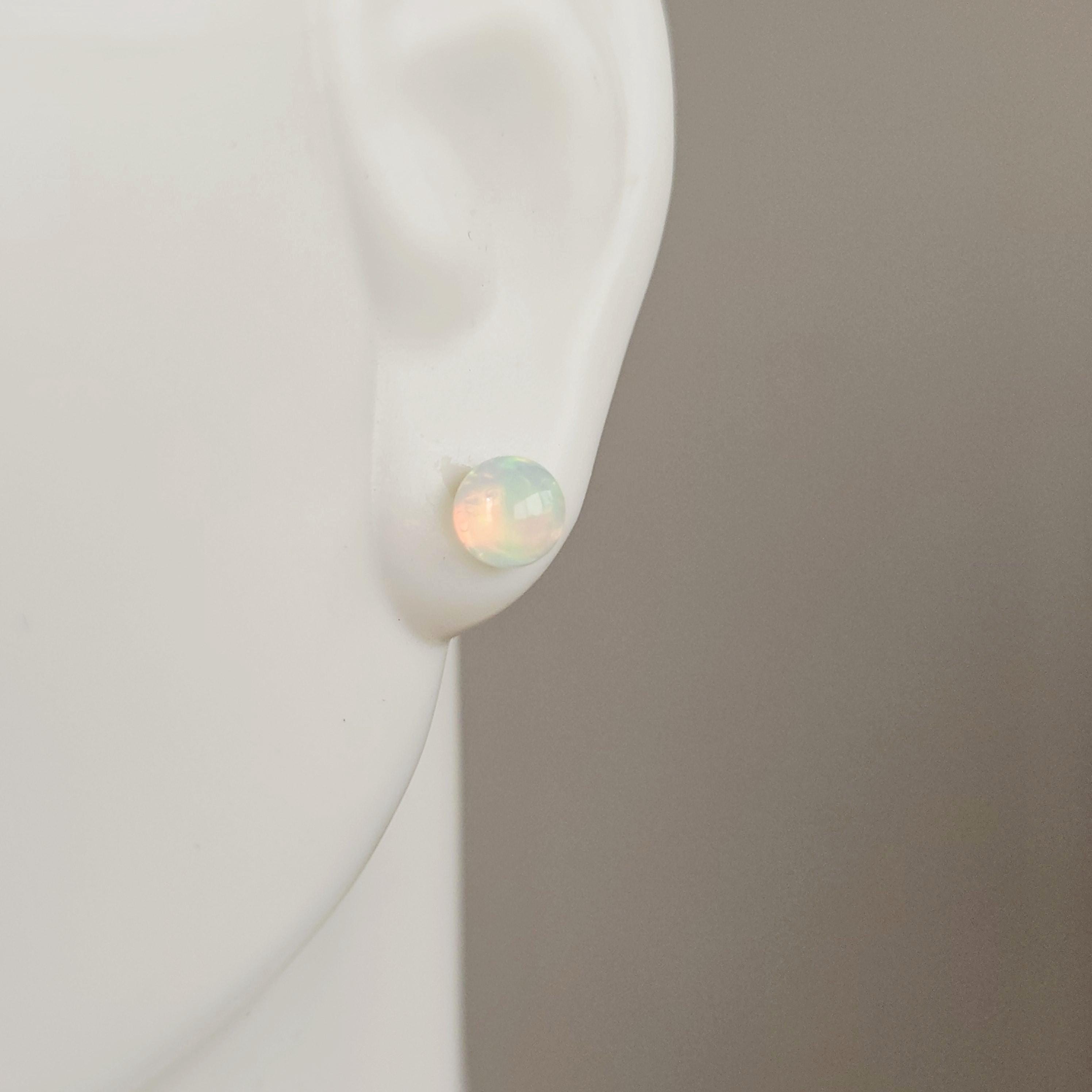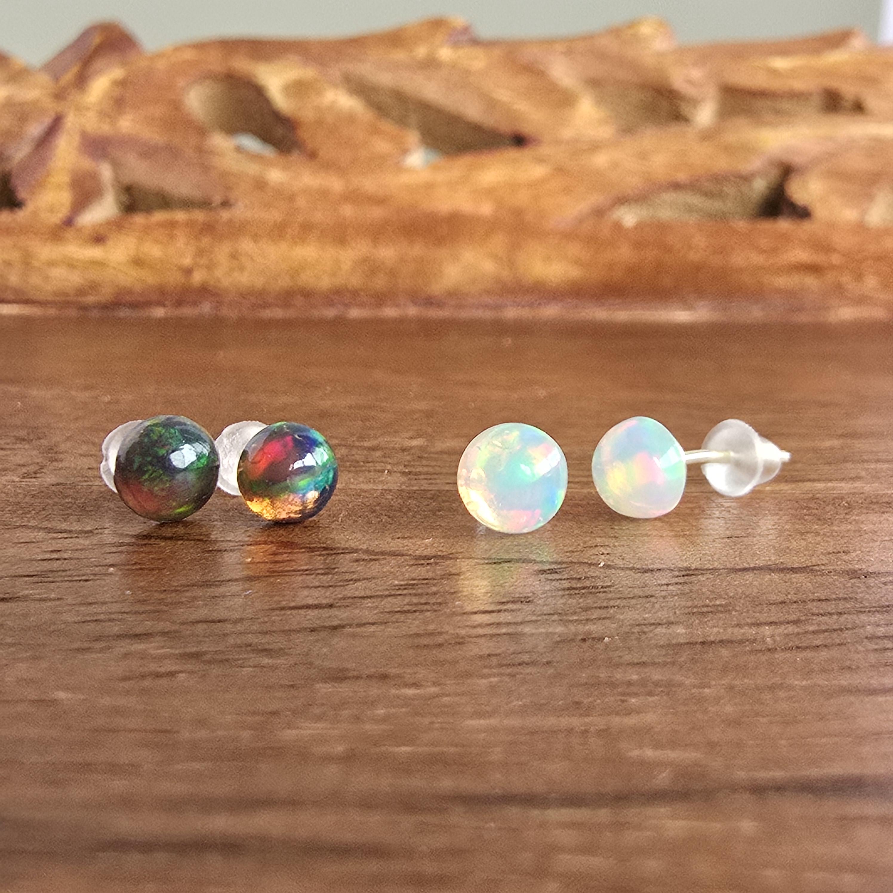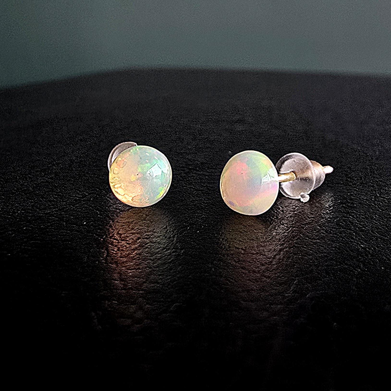 Opal is a natural gemstone known for its play-of-color and iridescent flashes. Traditional opal features milky white base with colorful flashes, while black opal has a darker body tone with vibrant, intense color play. Opal is the birthstone for October and is commonly associated with inspiration, creativity, and emotional balance in crystal practices. These stud earrings are a simple, everyday piece suitable for casual or dressy wear, gifting, or as a subtle birthstone accessory. Each pair uses natural opal stones, so color play, pattern, inclusions, and flashes vary due to the authentic material.