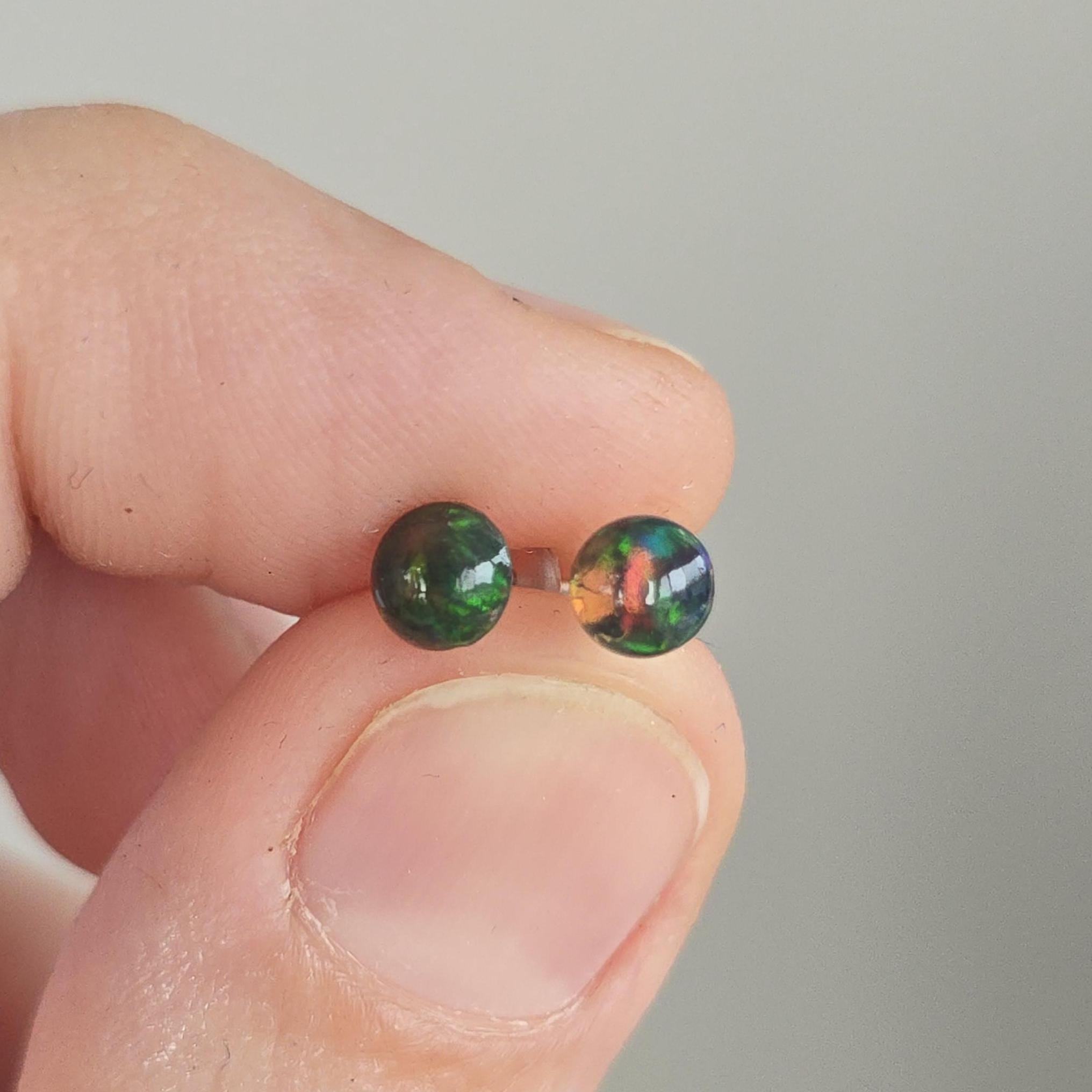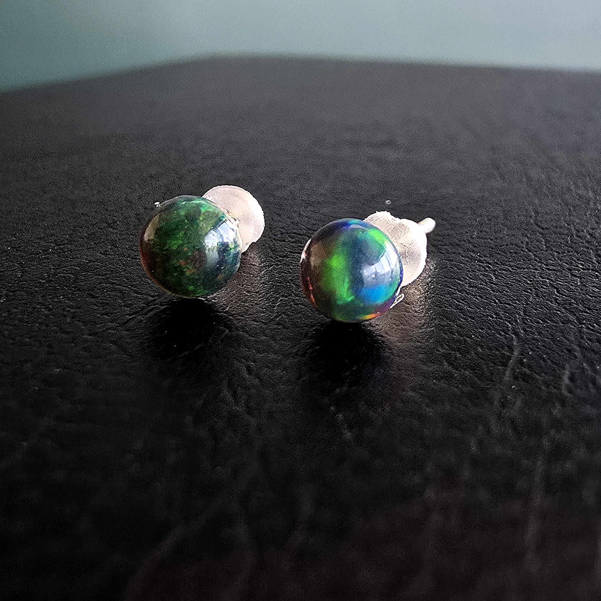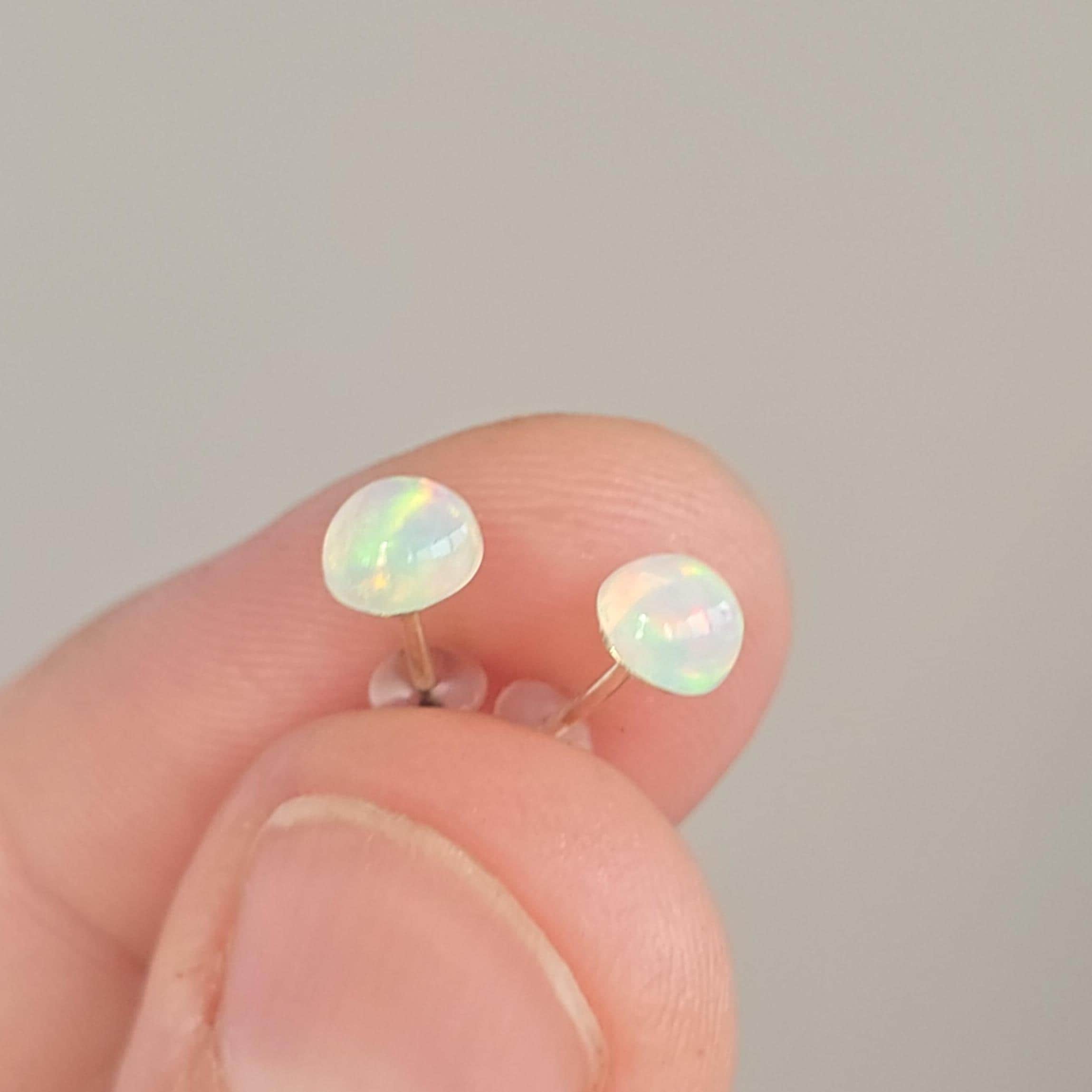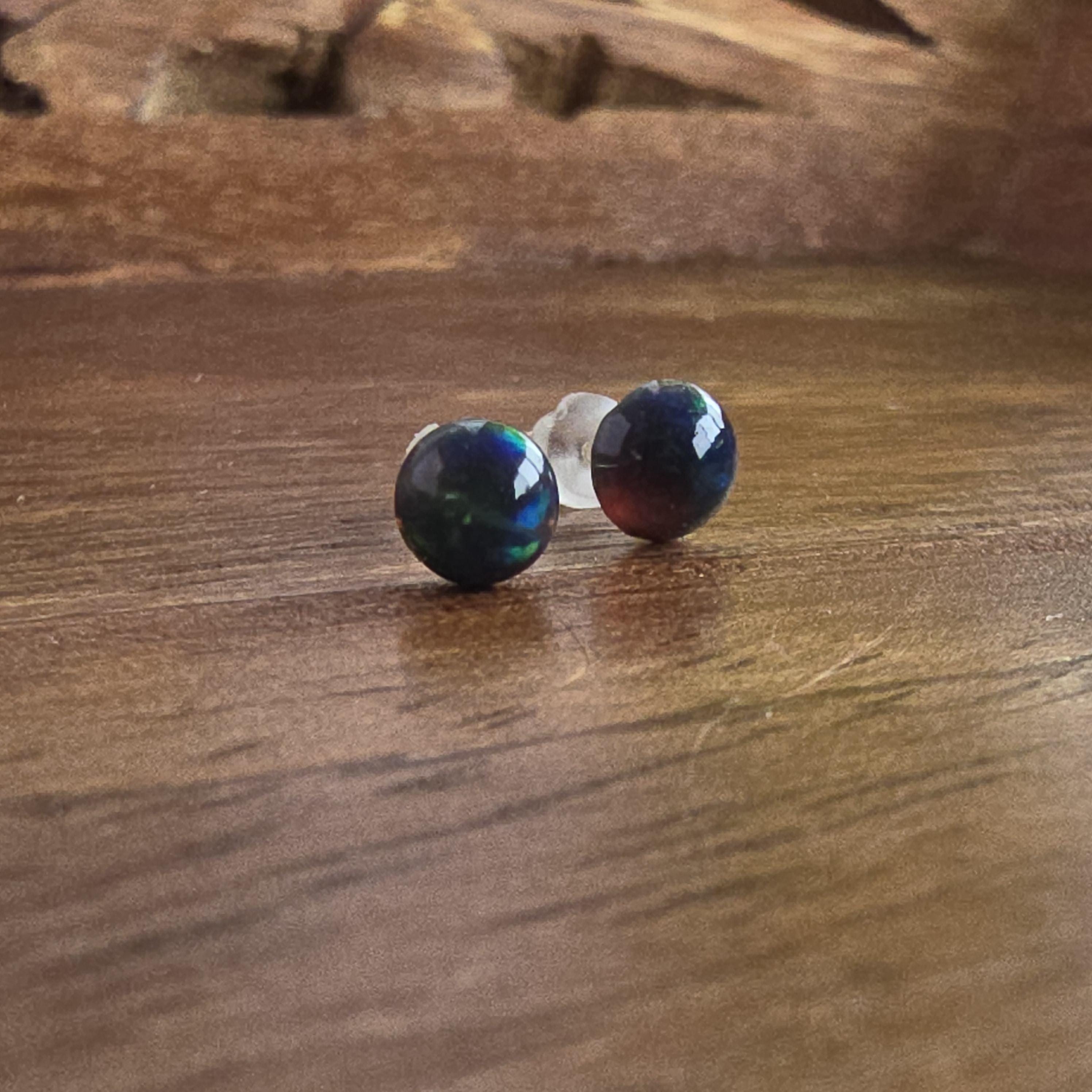 Opal is a natural gemstone known for its play-of-color and iridescent flashes. Traditional opal features milky white base with colorful flashes, while black opal has a darker body tone with vibrant, intense color play. Opal is the birthstone for October and is commonly associated with inspiration, creativity, and emotional balance in crystal practices. These stud earrings are a simple, everyday piece suitable for casual or dressy wear, gifting, or as a subtle birthstone accessory. Each pair uses natural opal stones, so color play, pattern, inclusions, and flashes vary due to the authentic material.