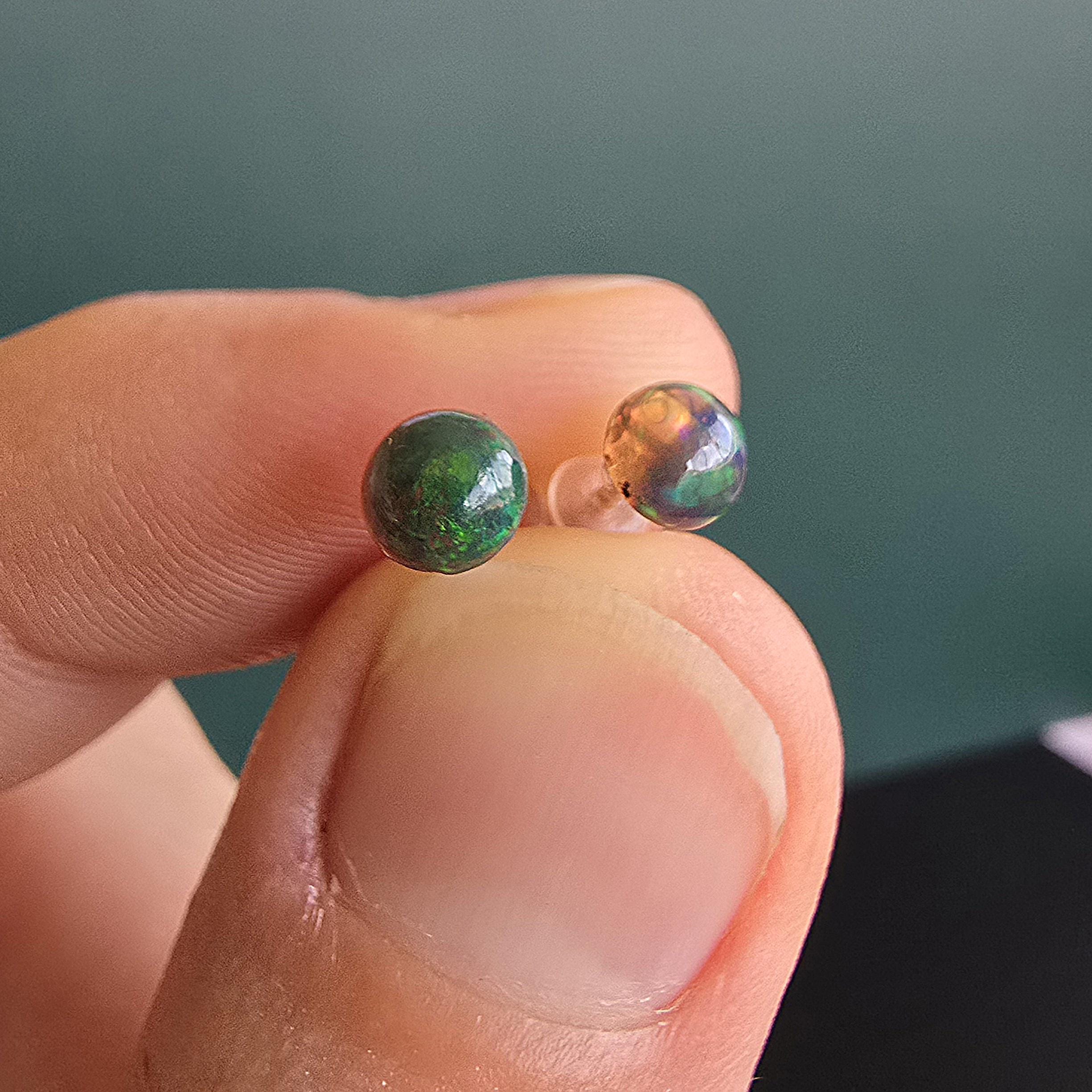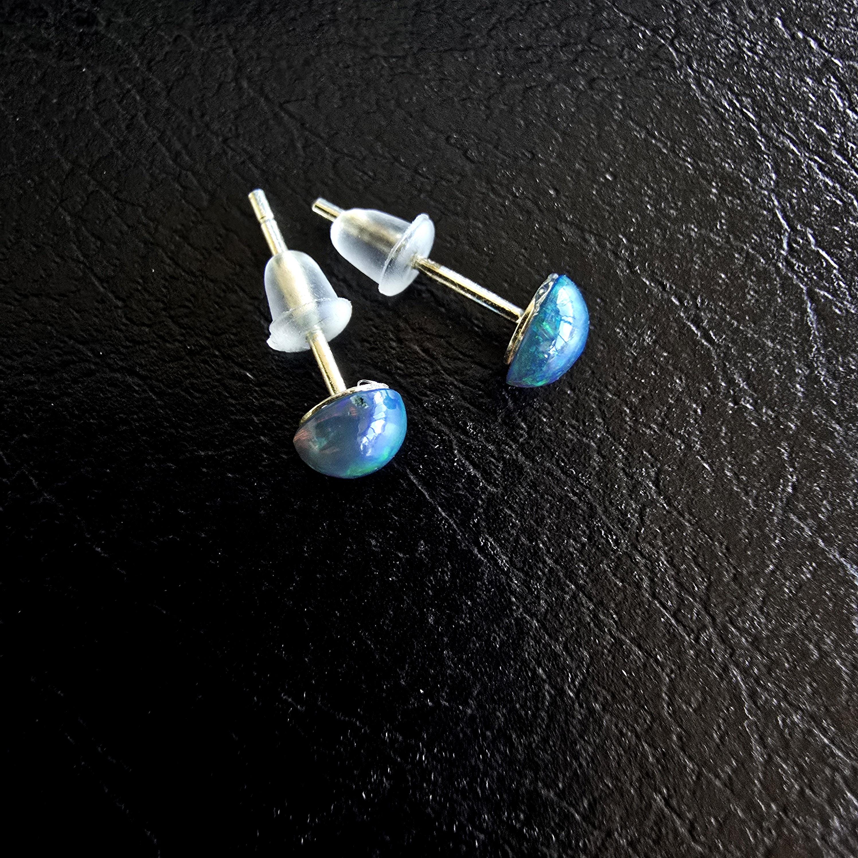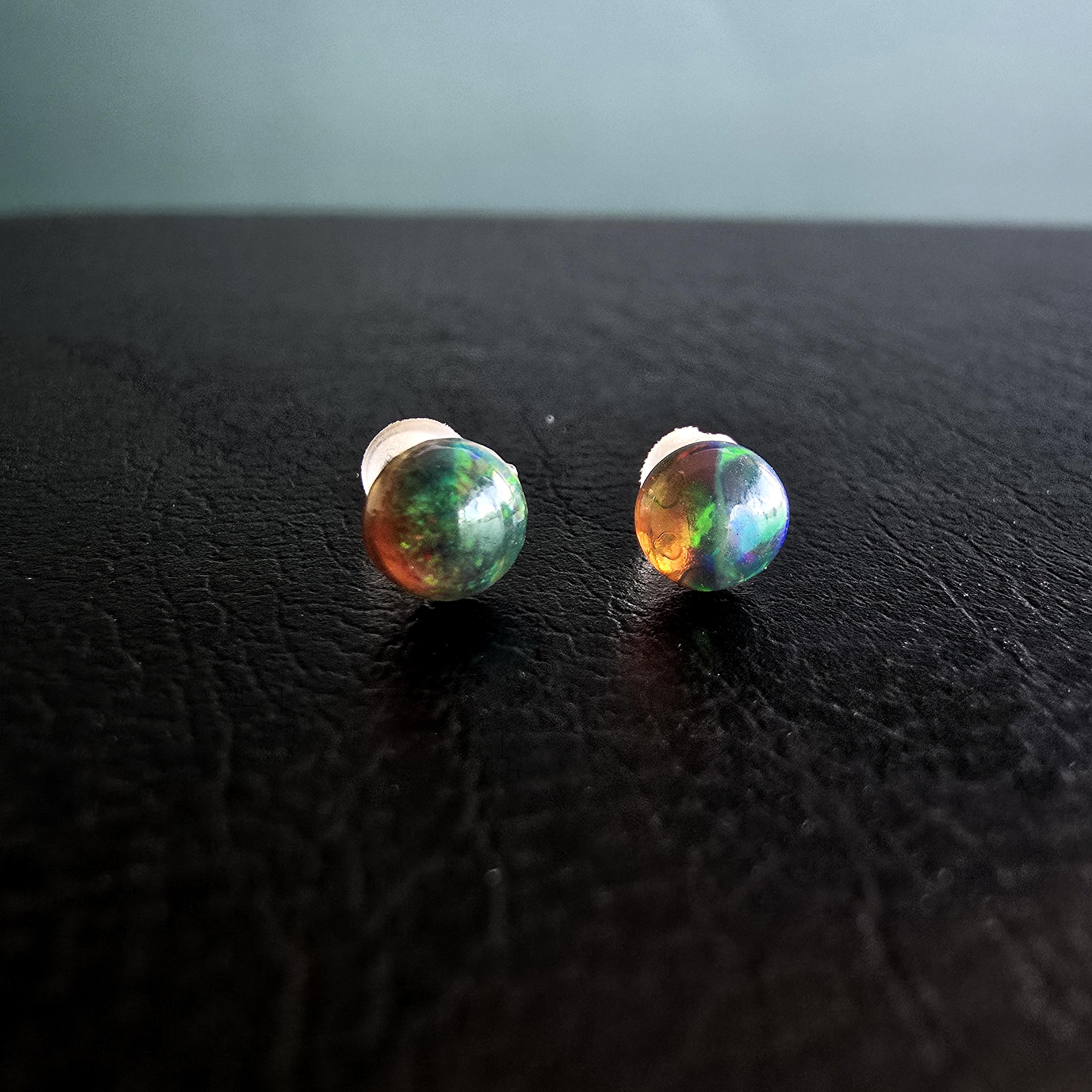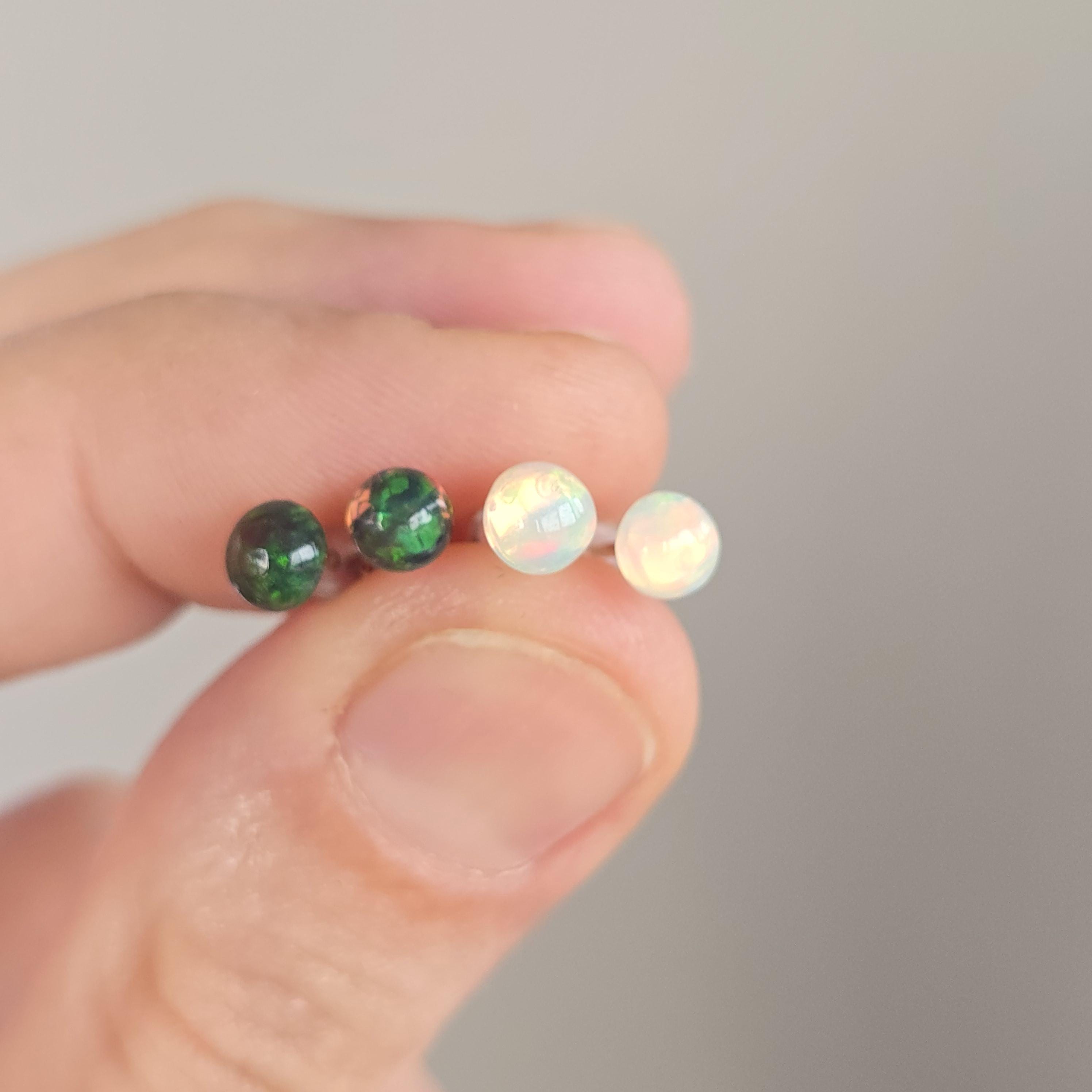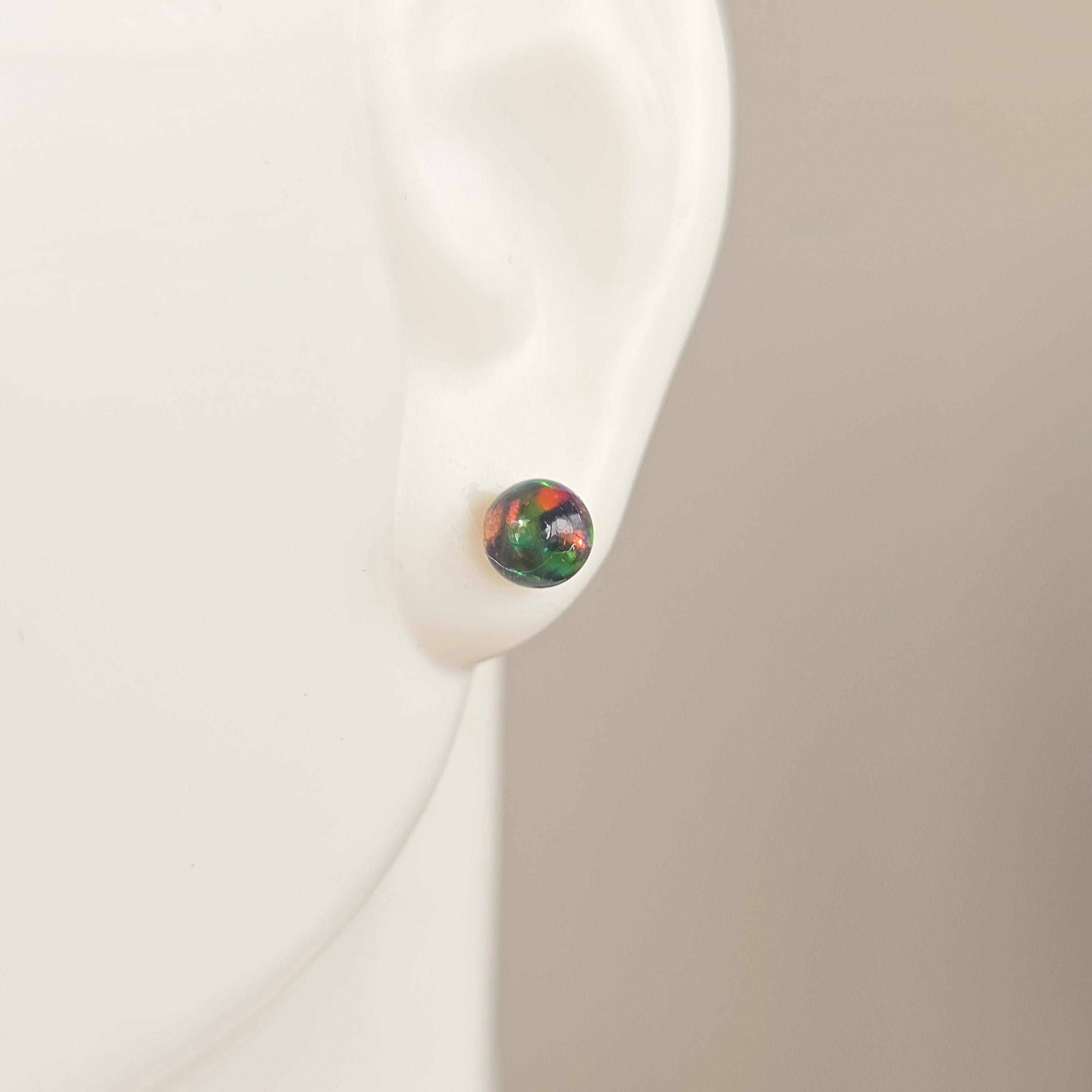 Opal is a natural gemstone known for its play-of-color and iridescent flashes. Traditional opal features milky white base with colorful flashes, while black opal has a darker body tone with vibrant, intense color play. Opal is the birthstone for October and is commonly associated with inspiration, creativity, and emotional balance in crystal practices. These stud earrings are a simple, everyday piece suitable for casual or dressy wear, gifting, or as a subtle birthstone accessory. Each pair uses natural opal stones, so color play, pattern, inclusions, and flashes vary due to the authentic material.