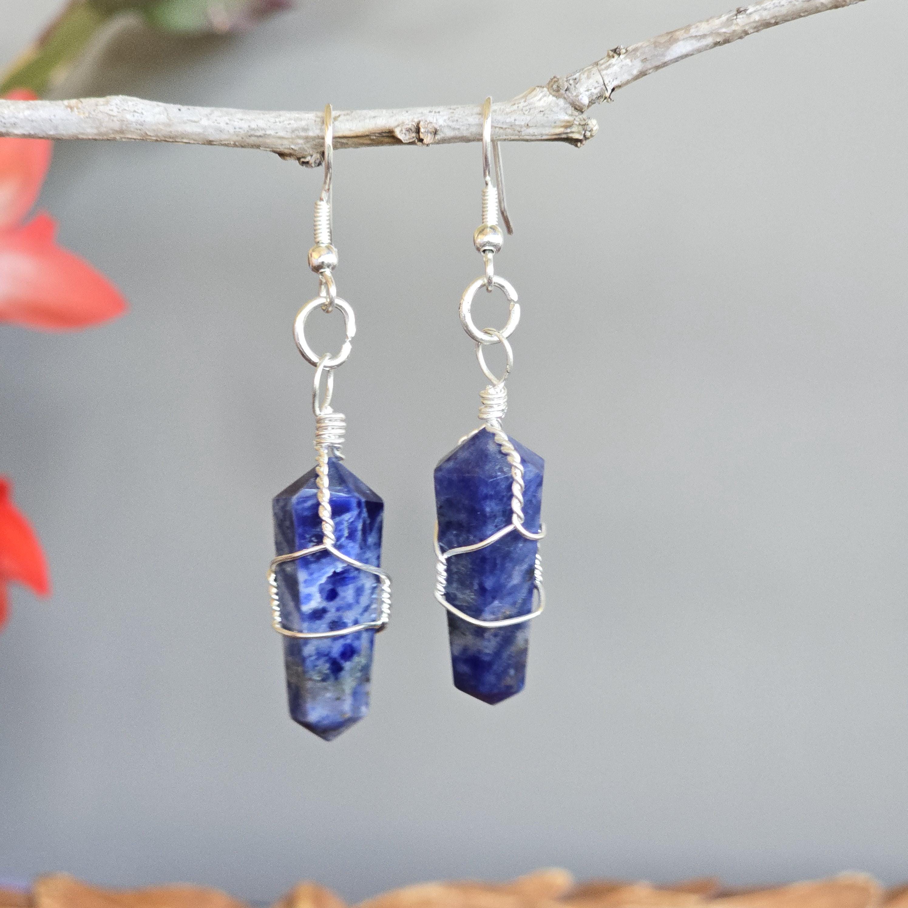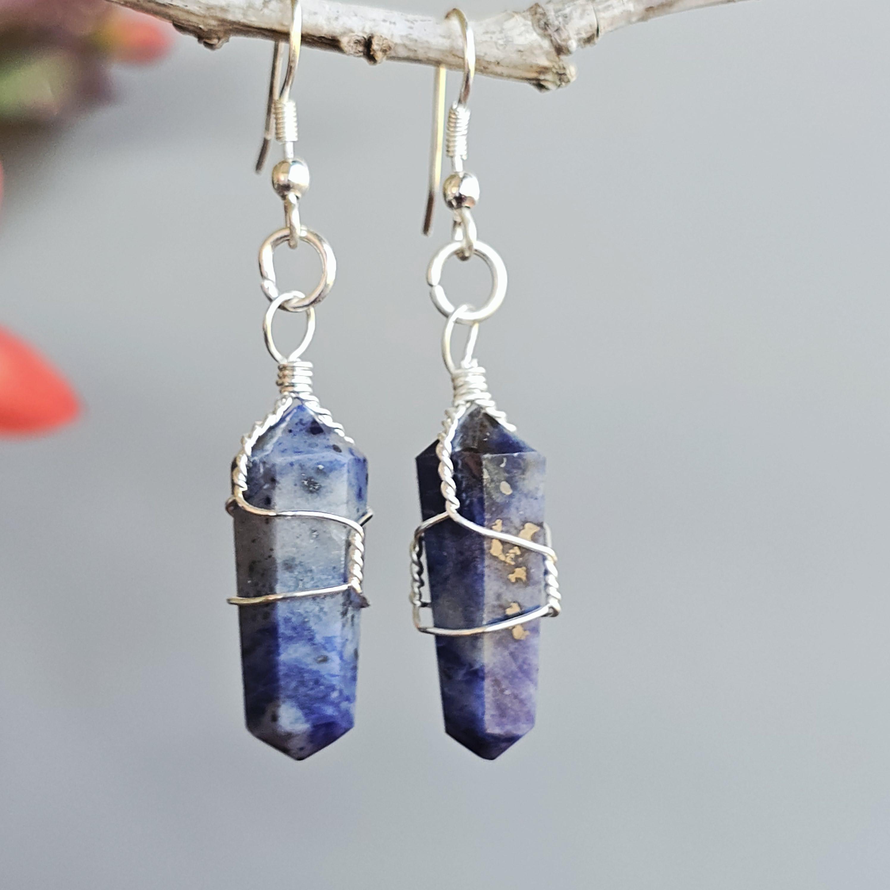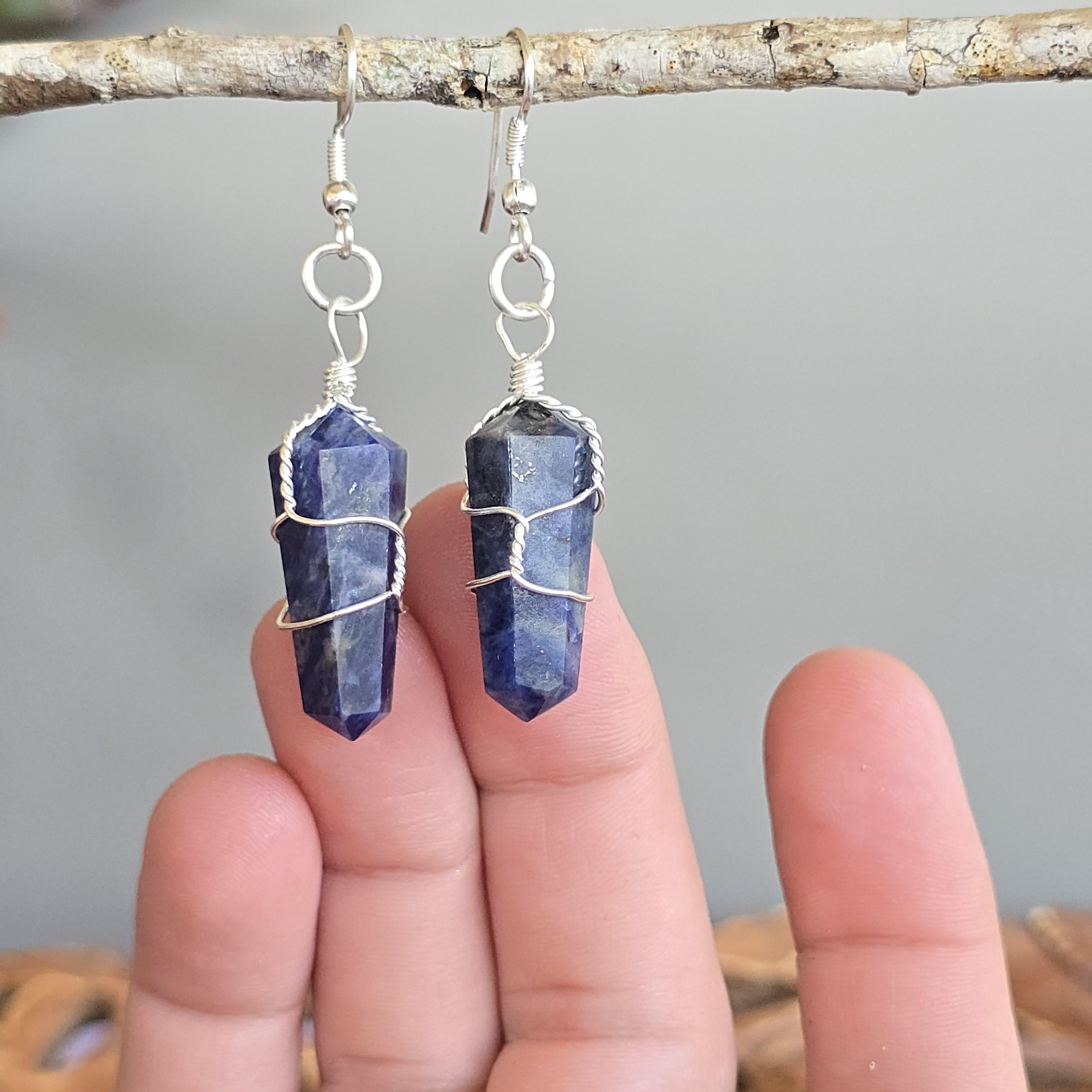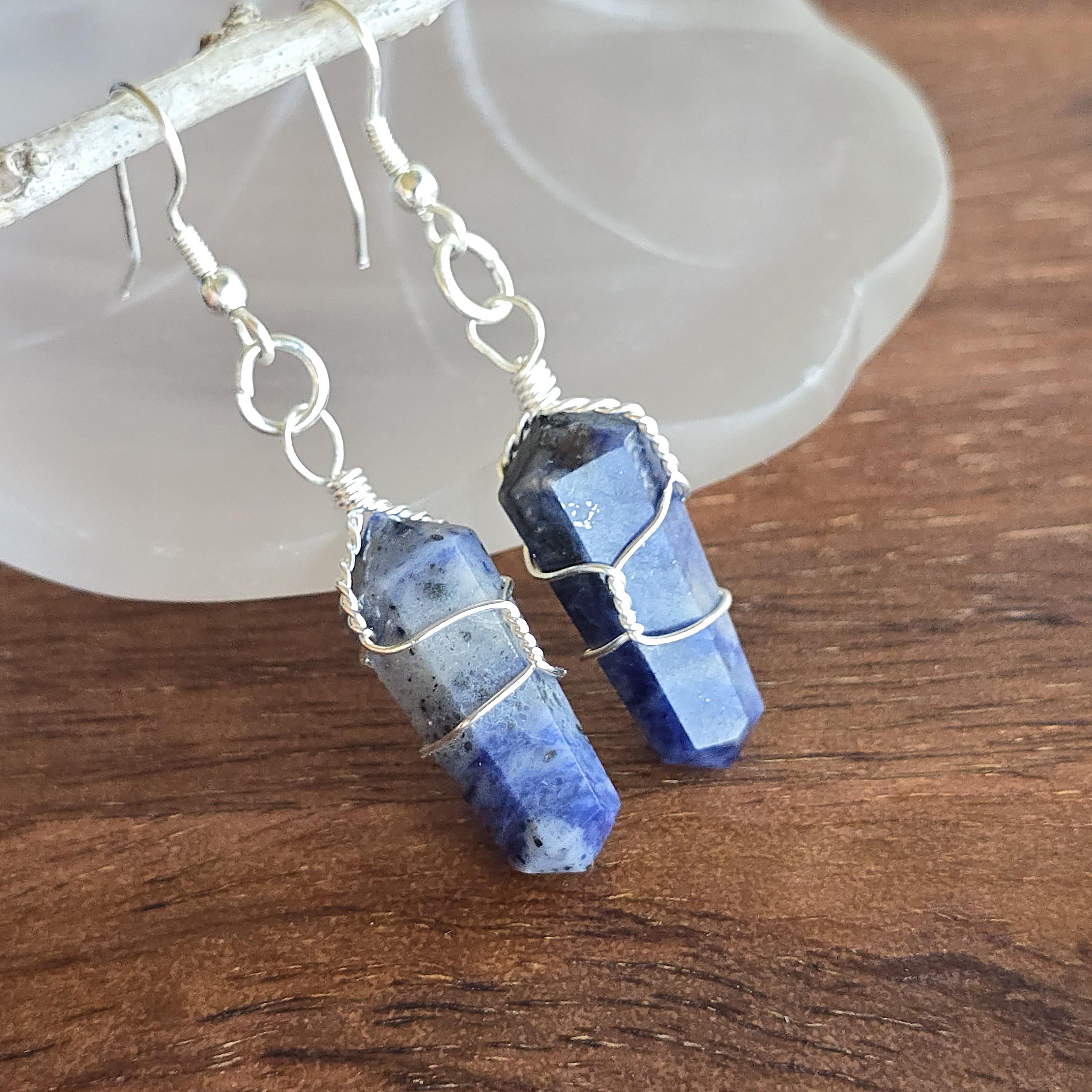 Sodalite is a natural blue stone commonly used in crystal practices for its calming and intuitive properties. Many associate it with enhancing communication, promoting mental clarity, reducing stress and anxiety, and supporting logical thinking and self-expression (linked to the throat chakra). These wire-wrapped point dangle earrings are a simple piece for daily wear, boho style, or as a calming accessory. Each pair uses natural sodalite, so color variations, inclusions, and patterns occur due to the authentic stone.