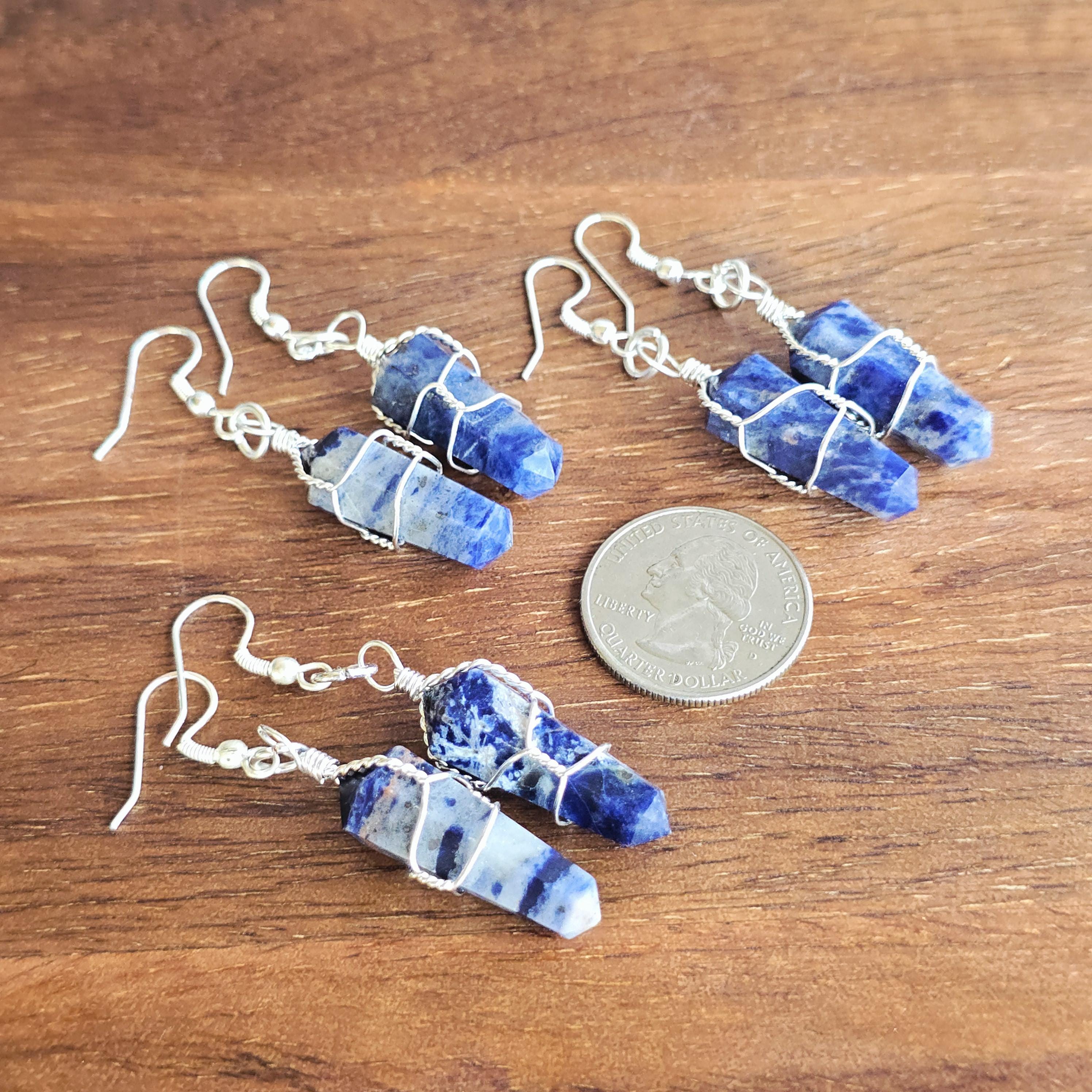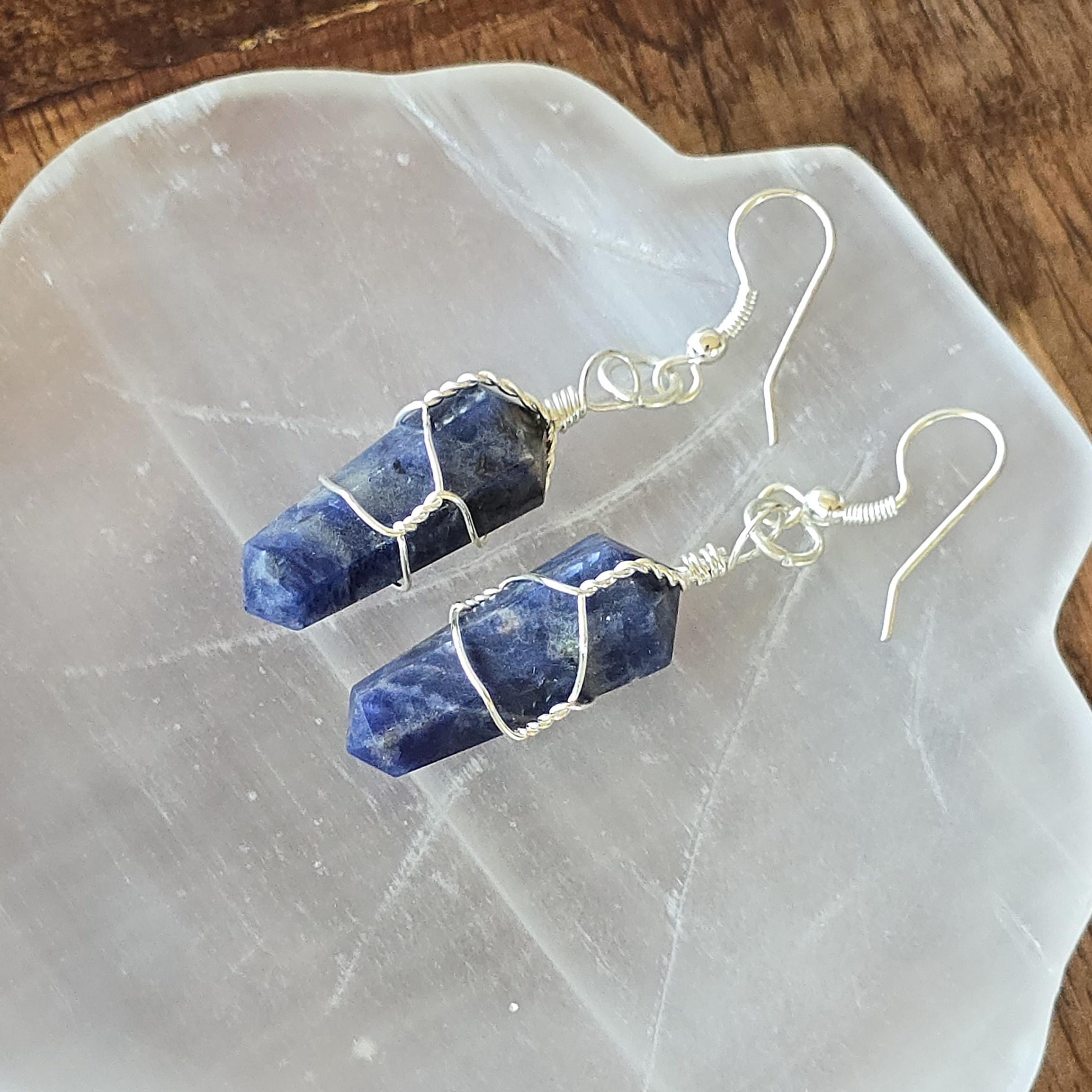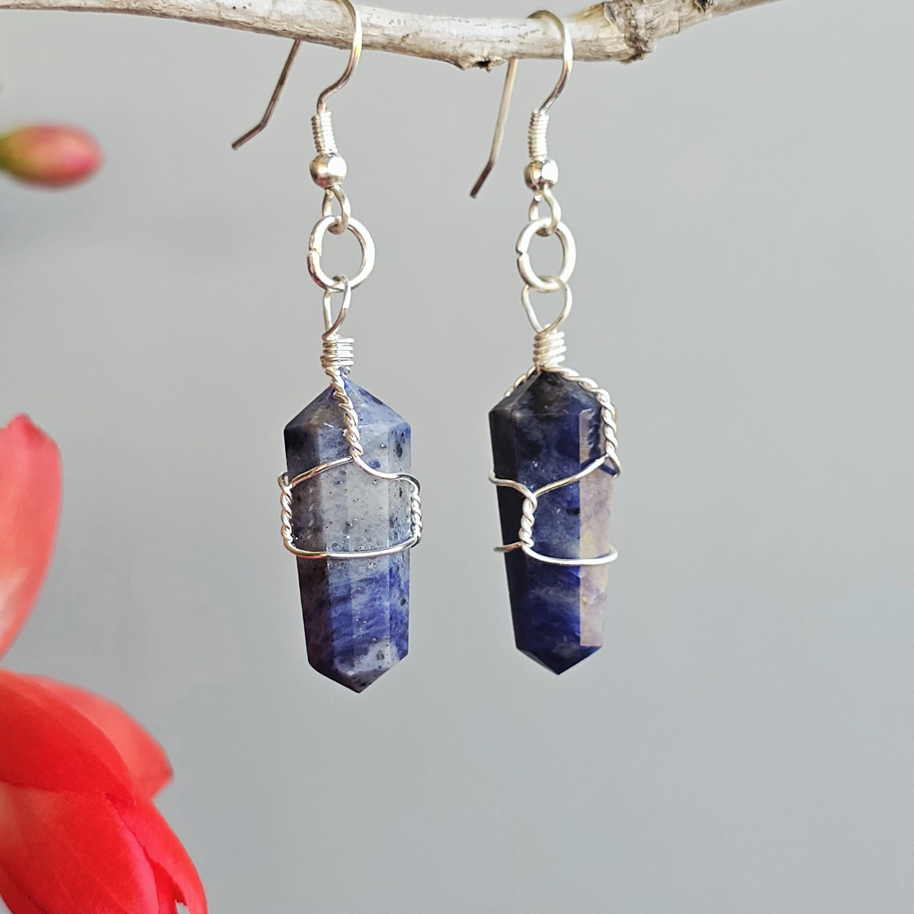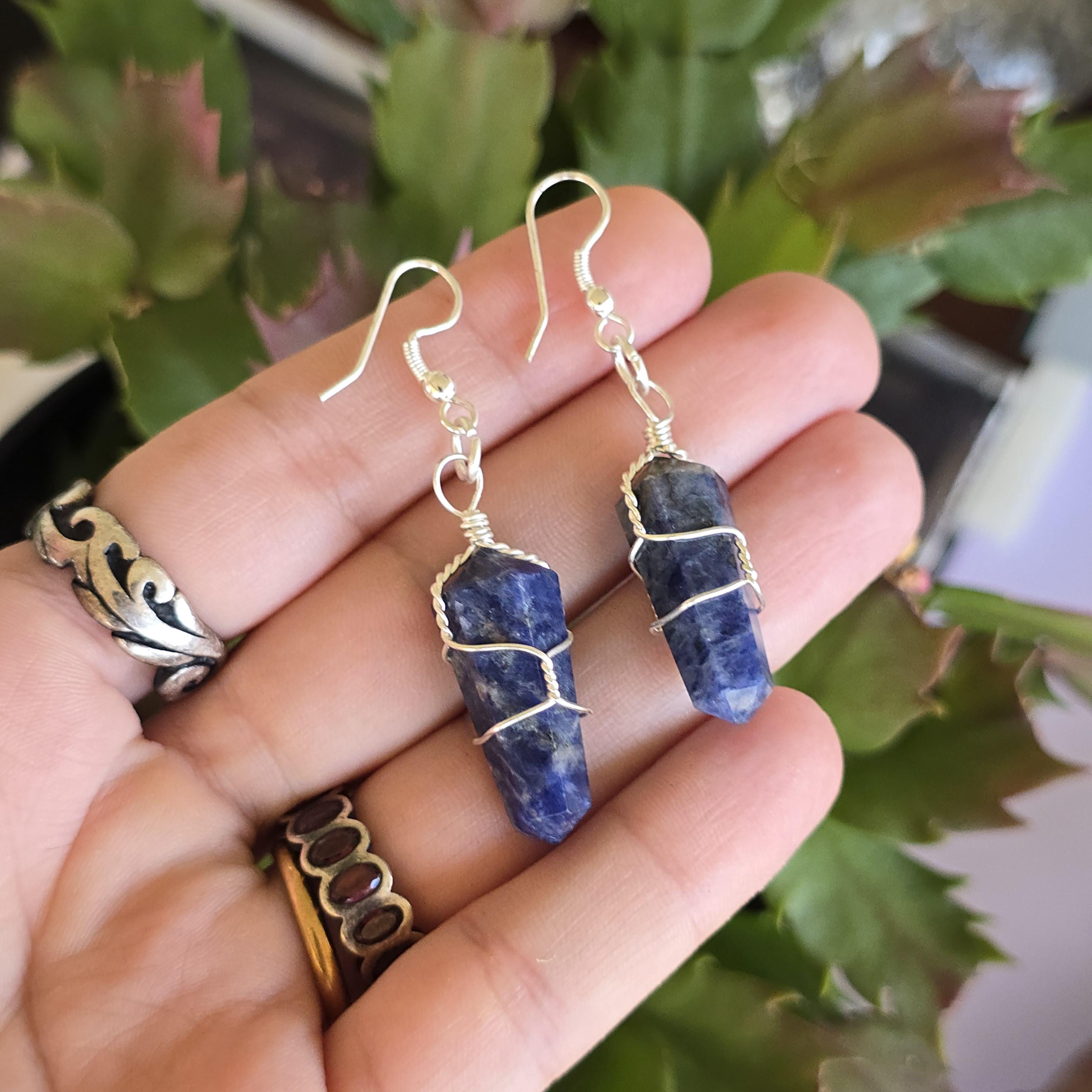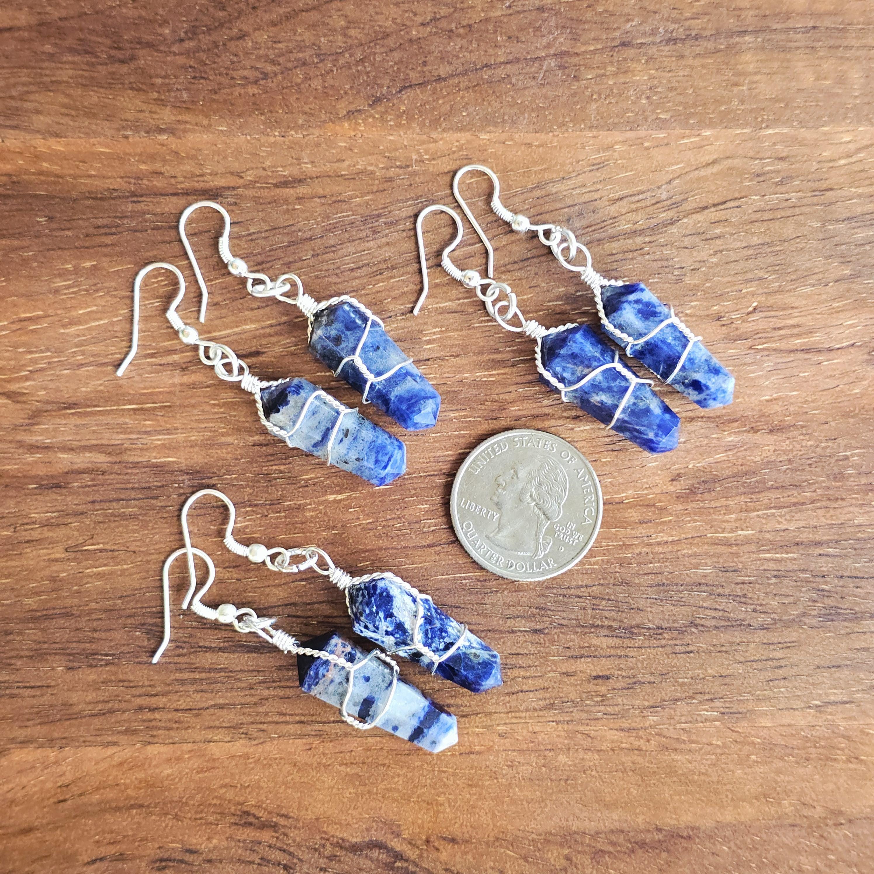 Sodalite is a natural blue stone commonly used in crystal practices for its calming and intuitive properties. Many associate it with enhancing communication, promoting mental clarity, reducing stress and anxiety, and supporting logical thinking and self-expression (linked to the throat chakra). These wire-wrapped point dangle earrings are a simple piece for daily wear, boho style, or as a calming accessory. Each pair uses natural sodalite, so color variations, inclusions, and patterns occur due to the authentic stone.