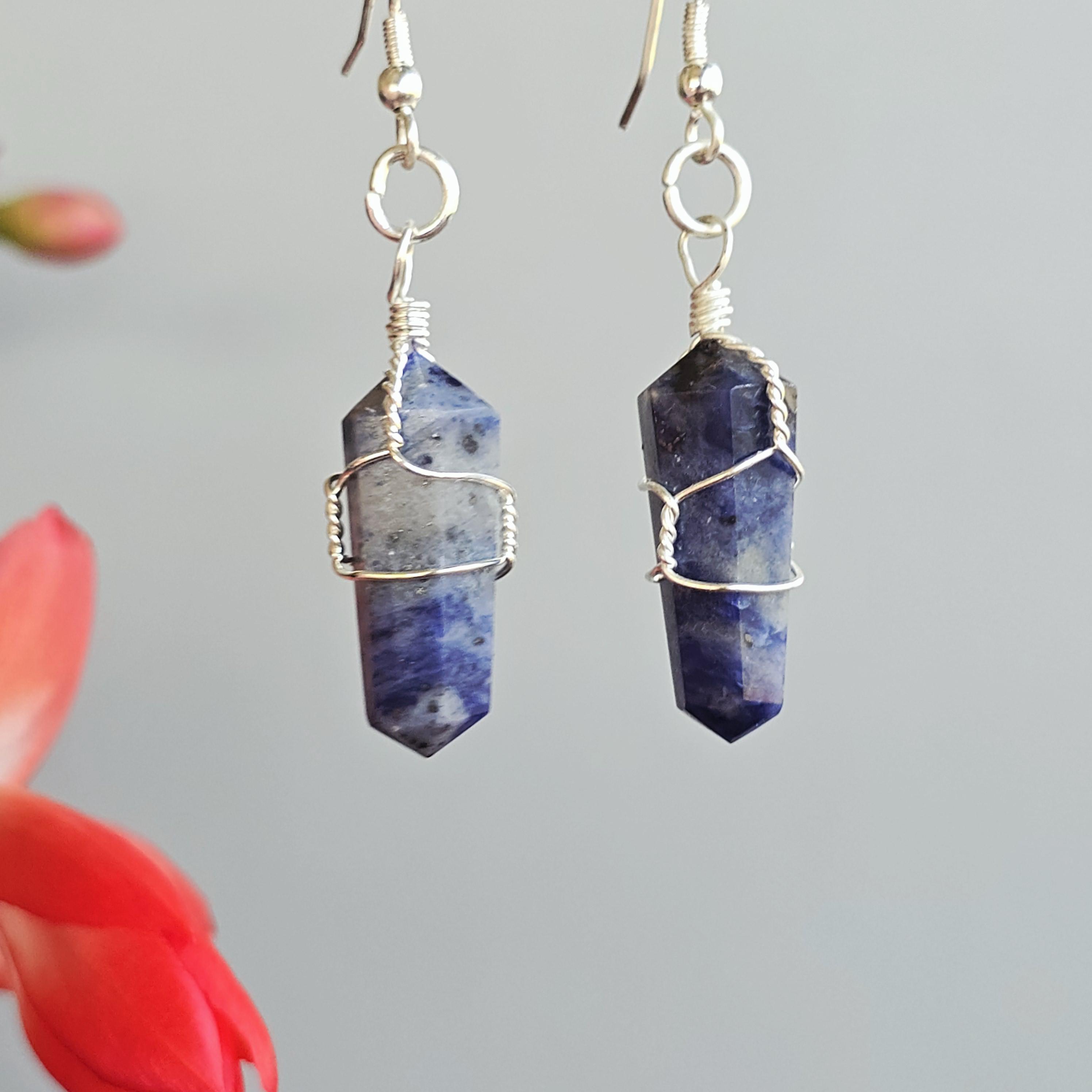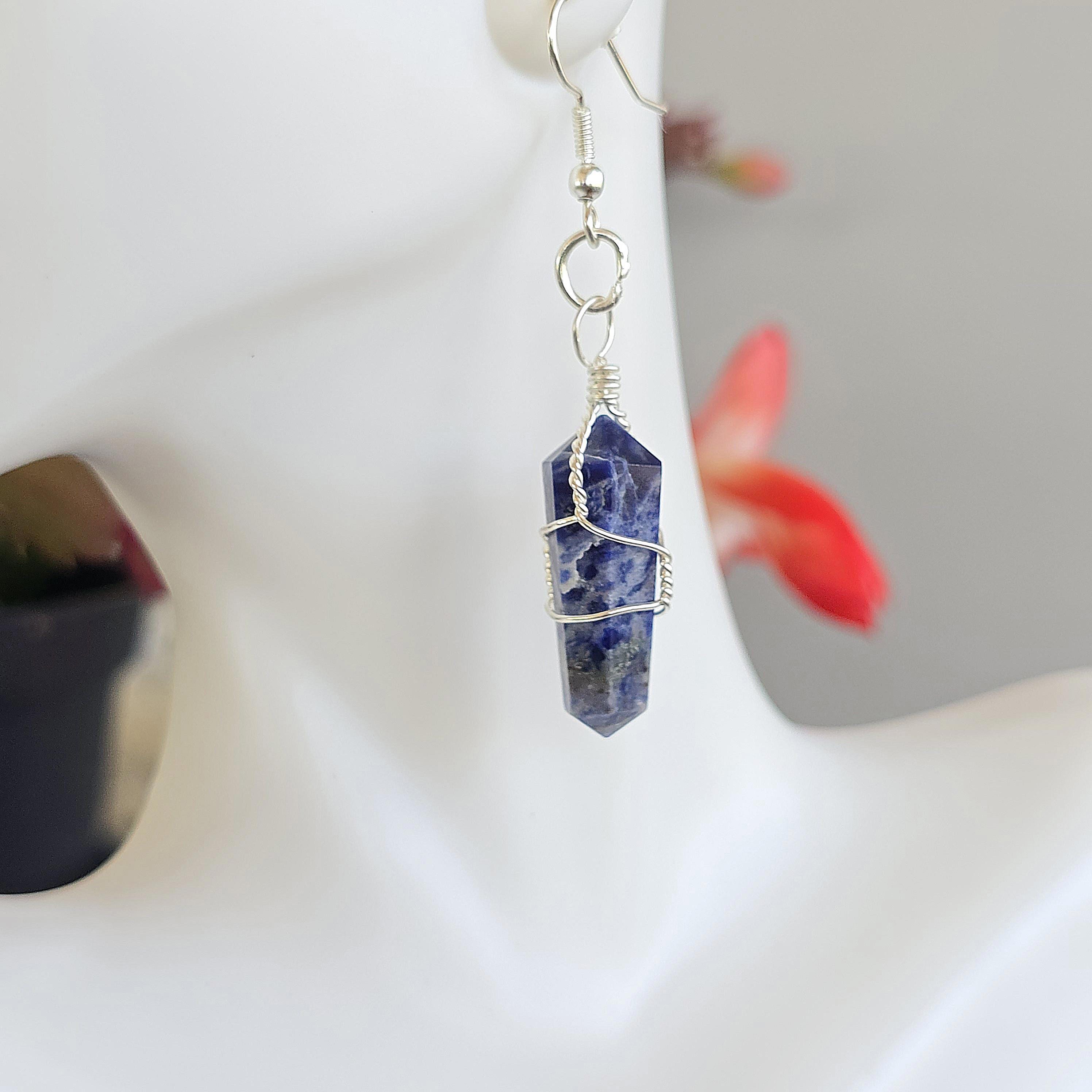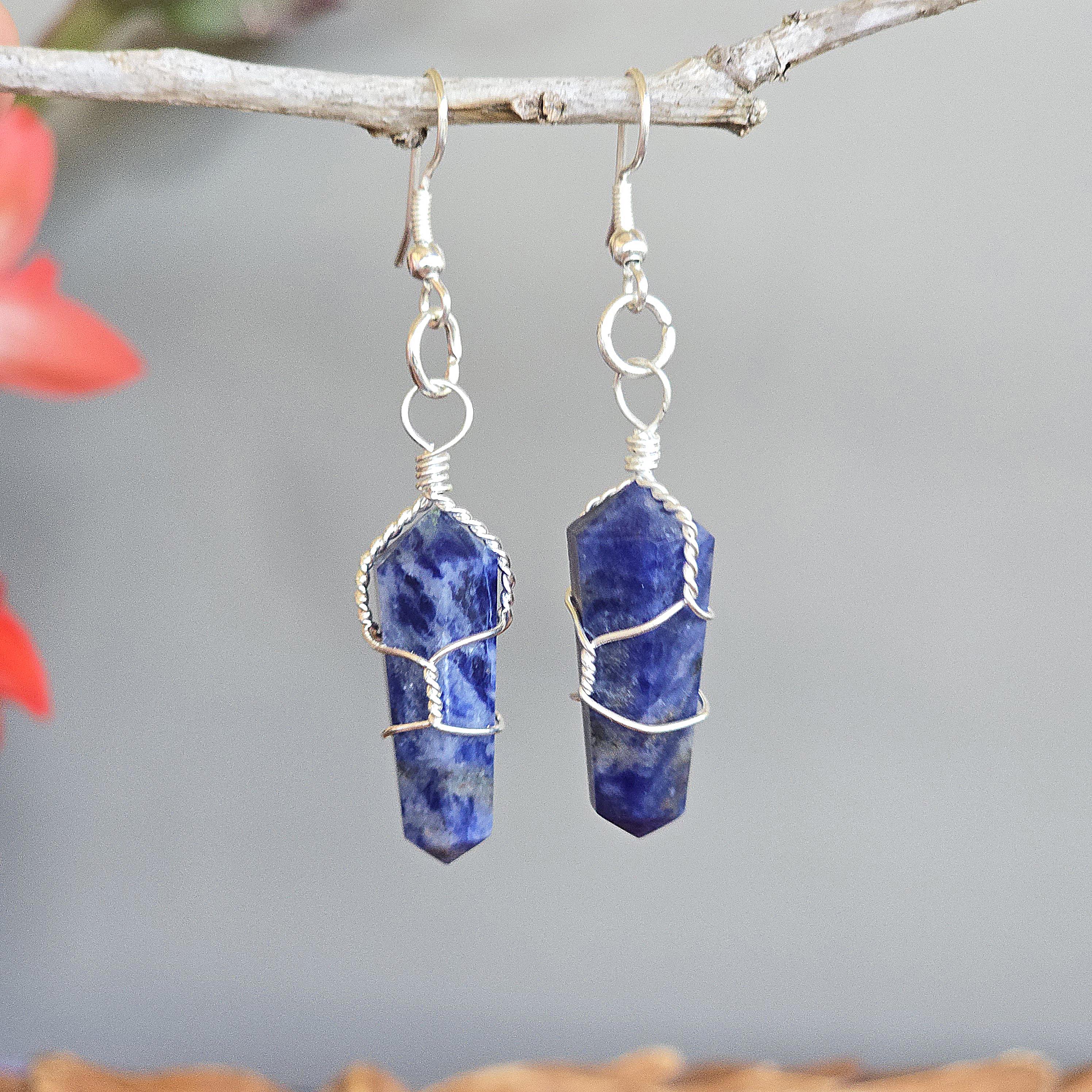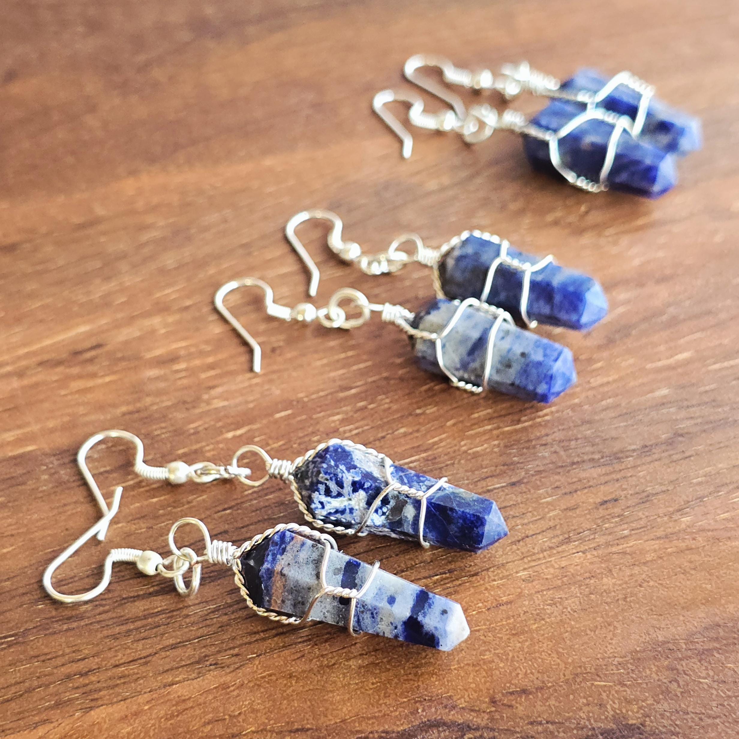 Sodalite is a natural blue stone commonly used in crystal practices for its calming and intuitive properties. Many associate it with enhancing communication, promoting mental clarity, reducing stress and anxiety, and supporting logical thinking and self-expression (linked to the throat chakra). These wire-wrapped point dangle earrings are a simple piece for daily wear, boho style, or as a calming accessory. Each pair uses natural sodalite, so color variations, inclusions, and patterns occur due to the authentic stone.
