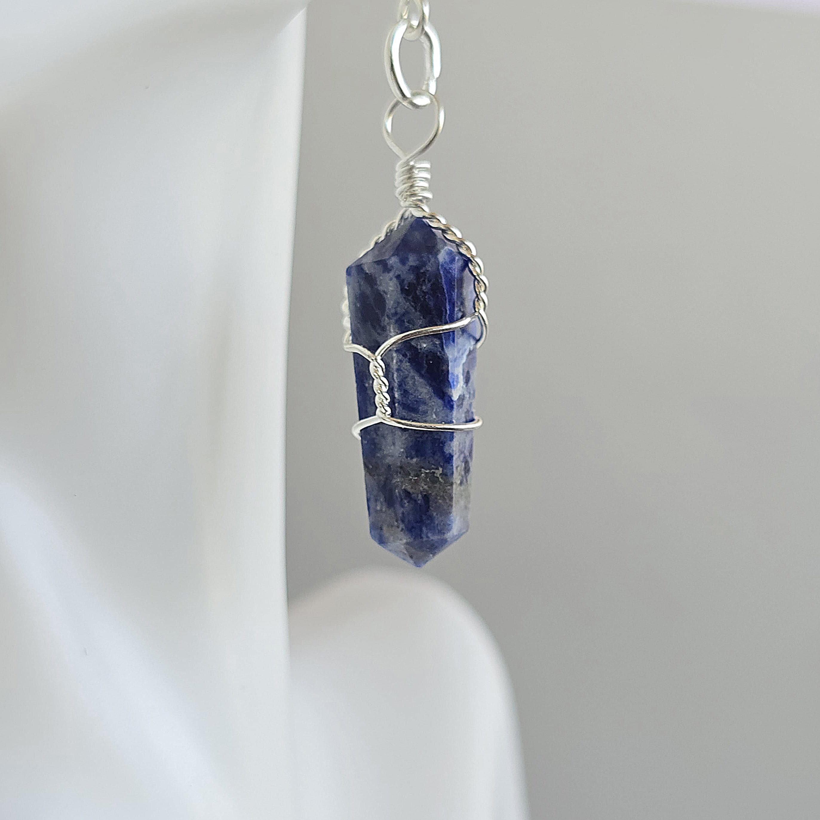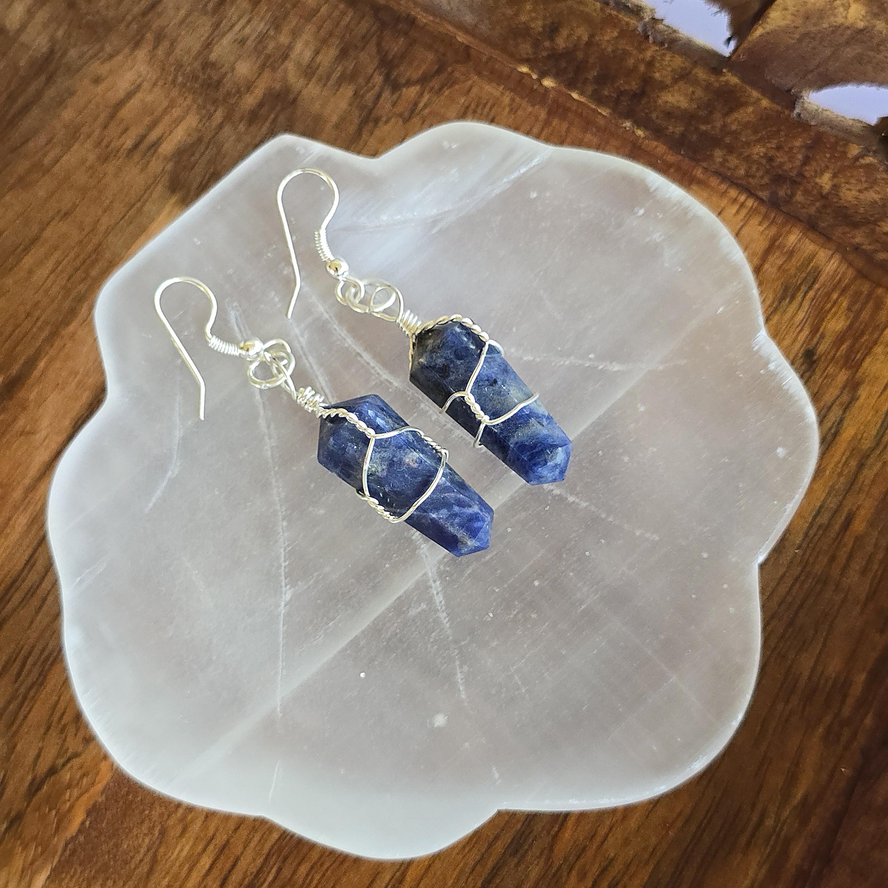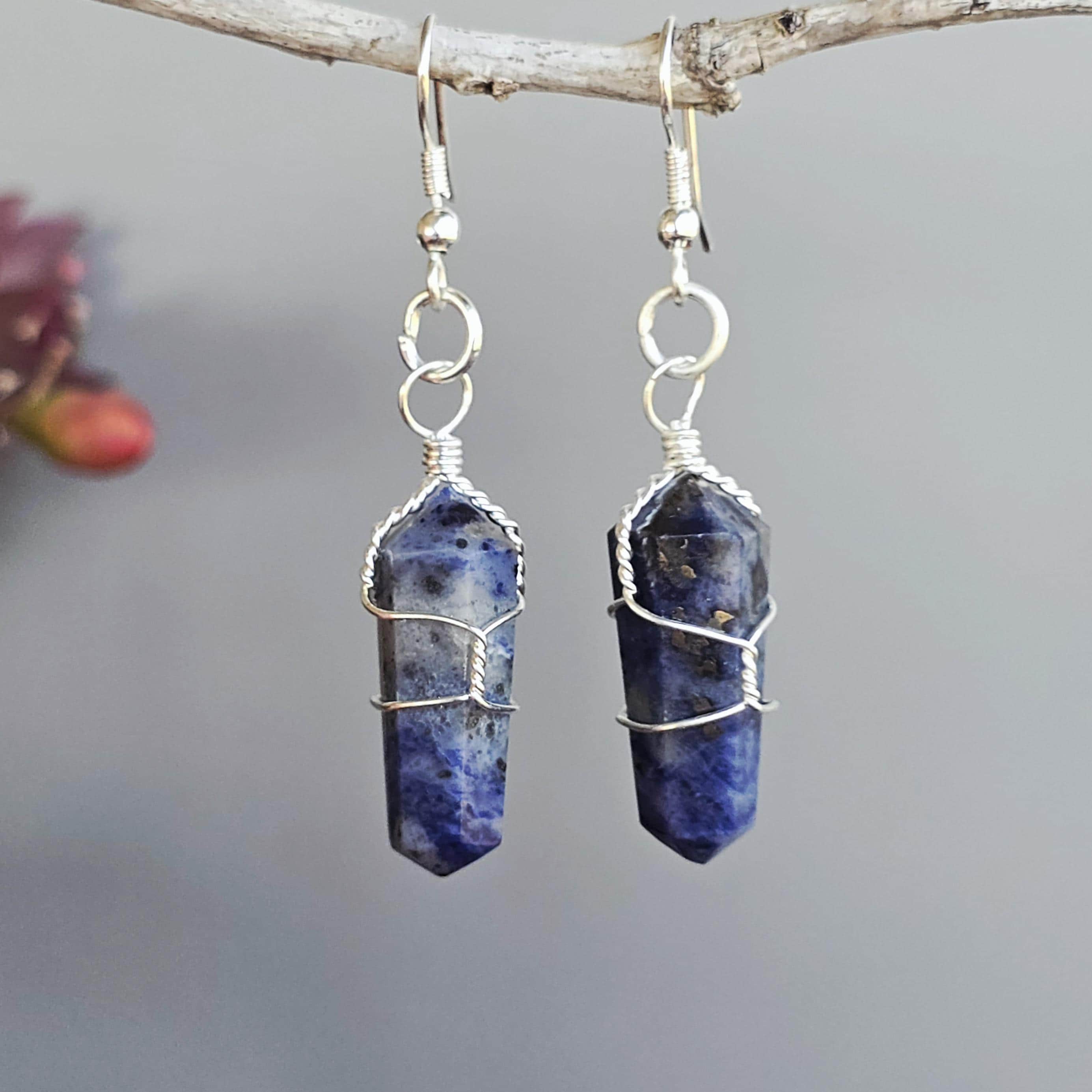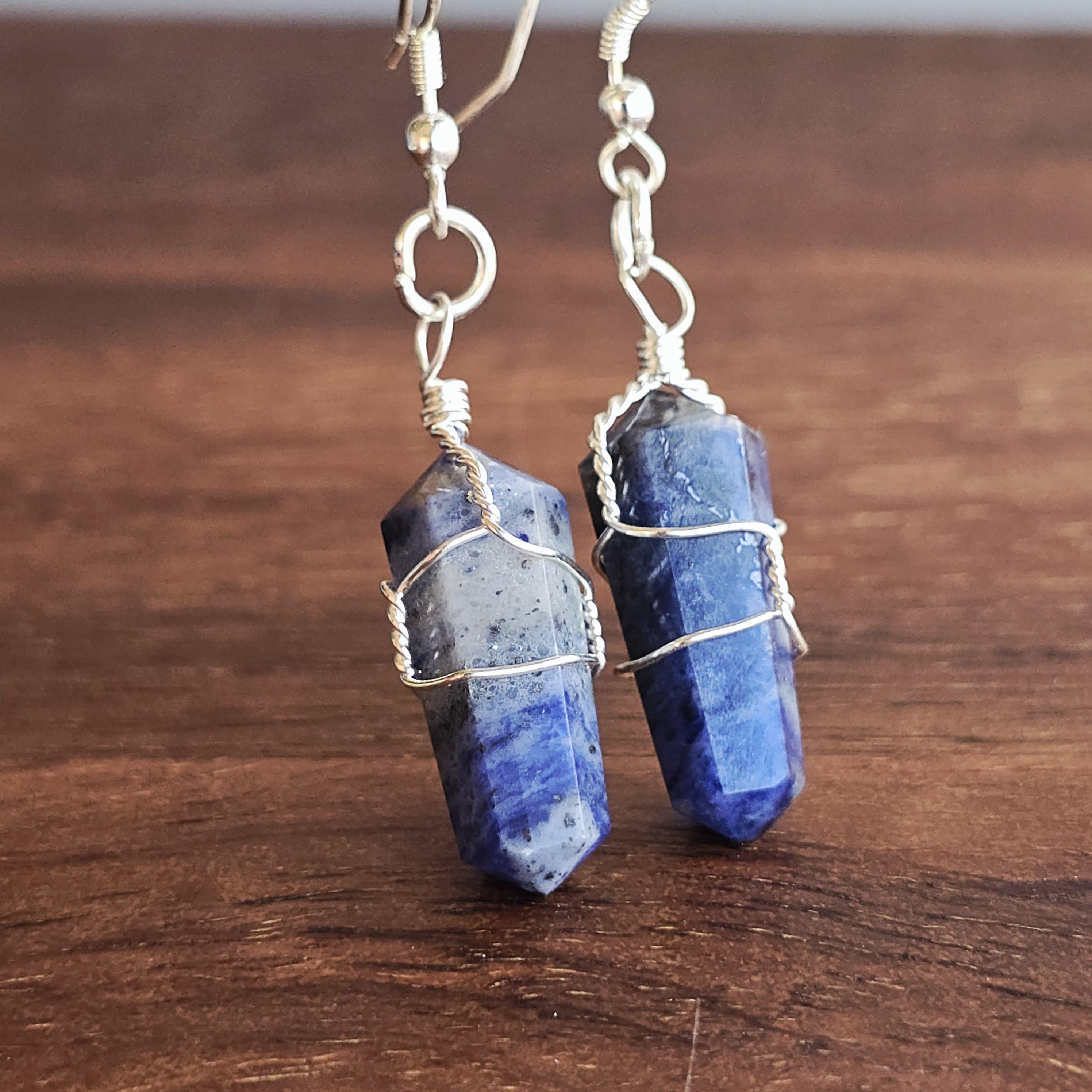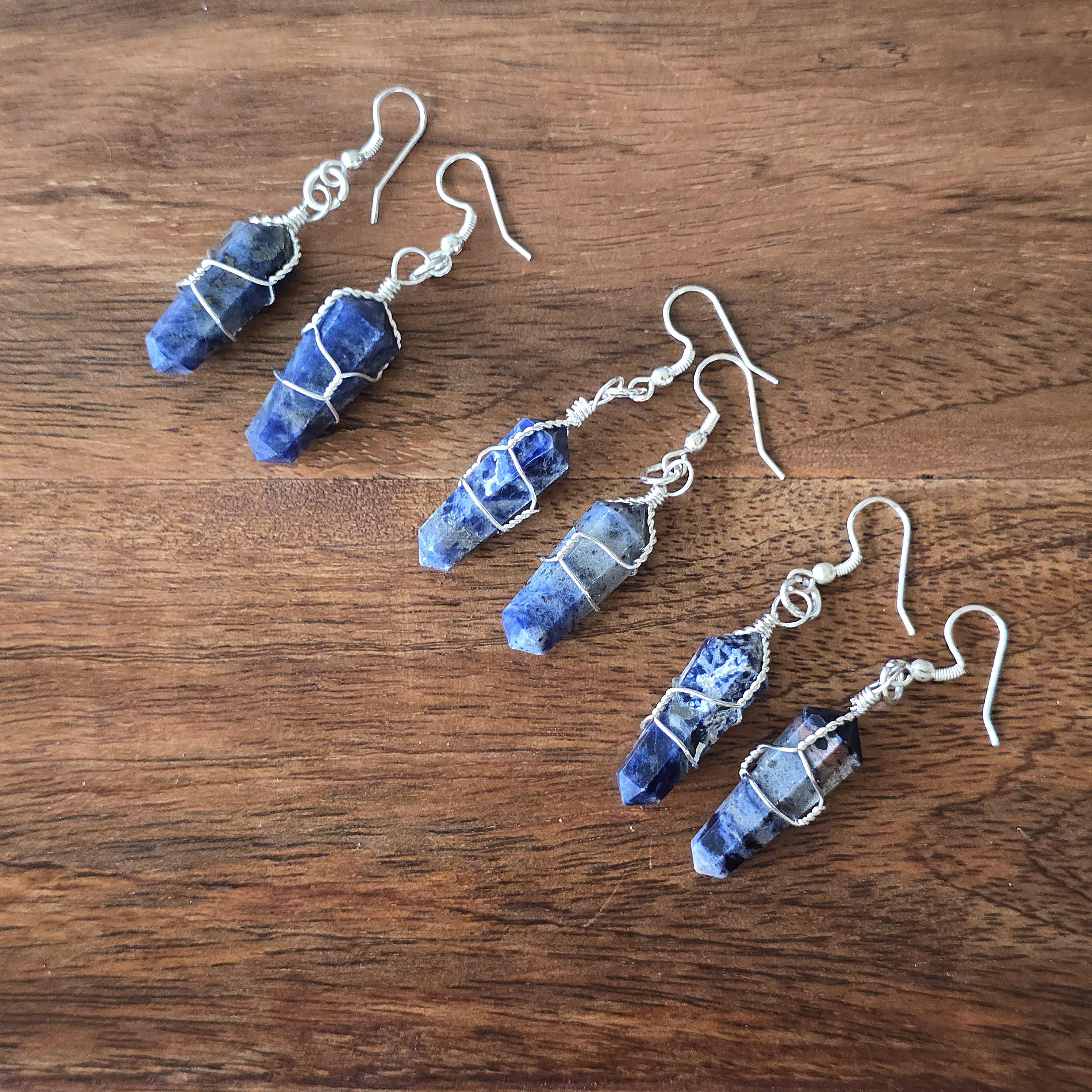 Sodalite is a natural blue stone commonly used in crystal practices for its calming and intuitive properties. Many associate it with enhancing communication, promoting mental clarity, reducing stress and anxiety, and supporting logical thinking and self-expression (linked to the throat chakra). These wire-wrapped point dangle earrings are a simple piece for daily wear, boho style, or as a calming accessory. Each pair uses natural sodalite, so color variations, inclusions, and patterns occur due to the authentic stone.