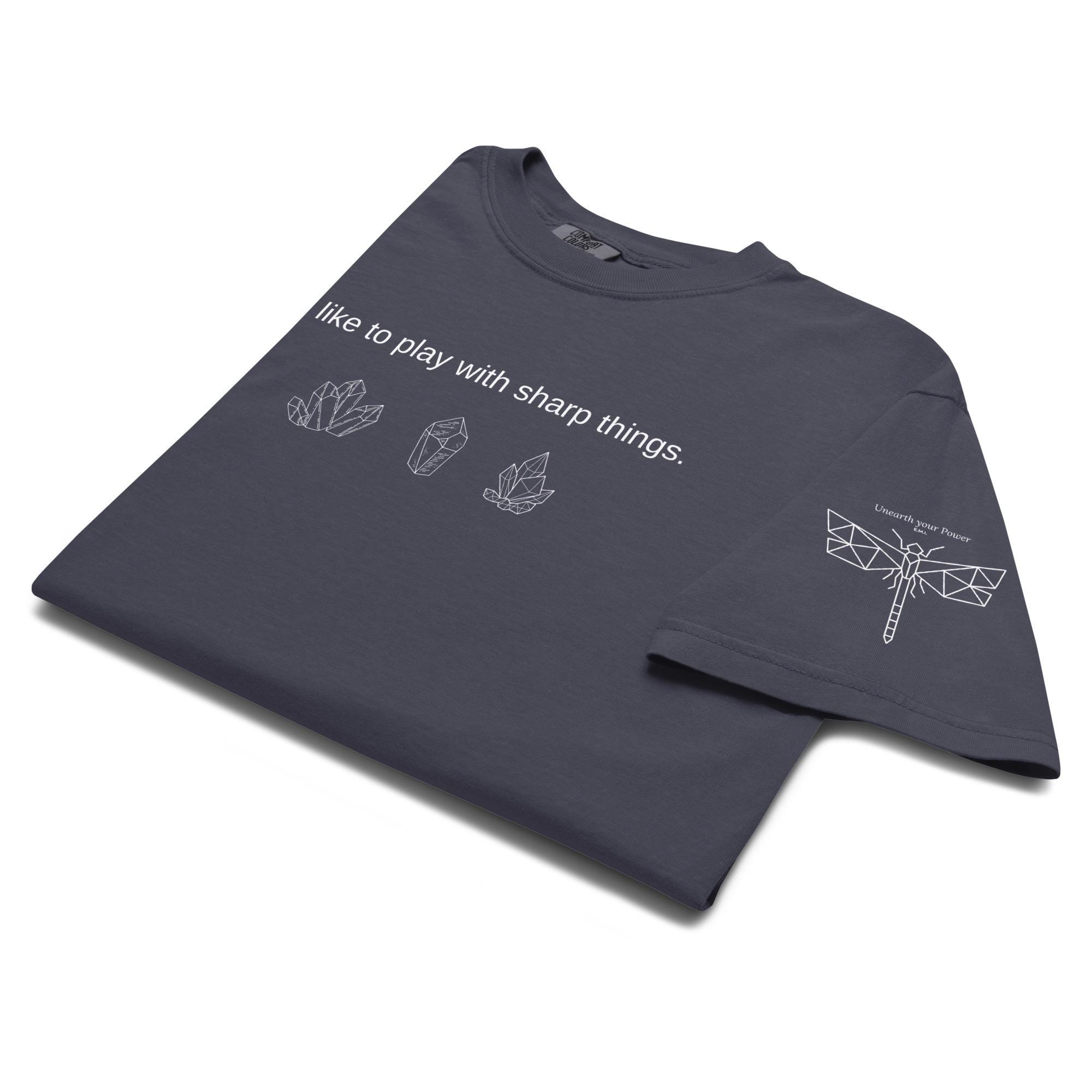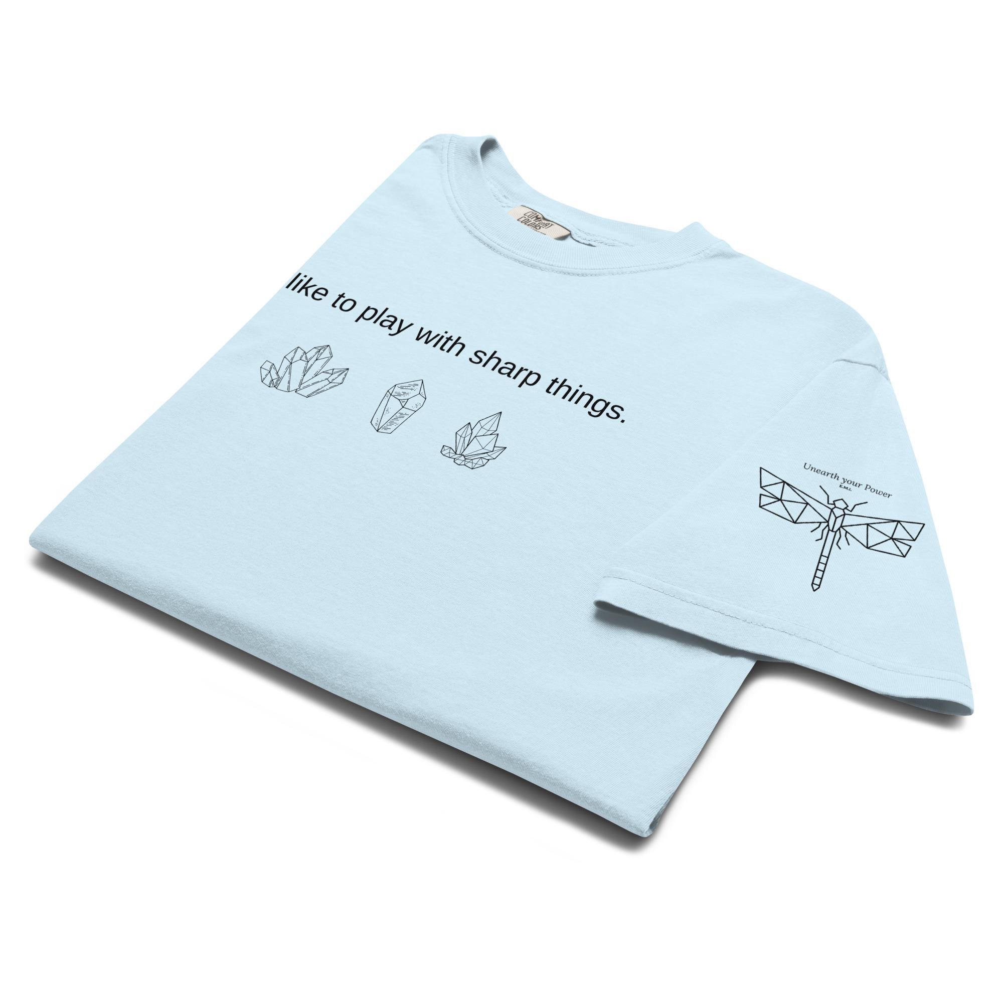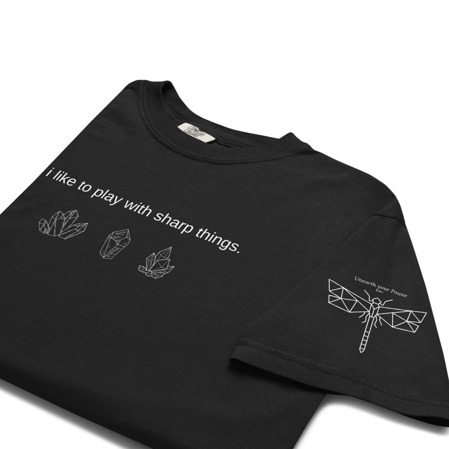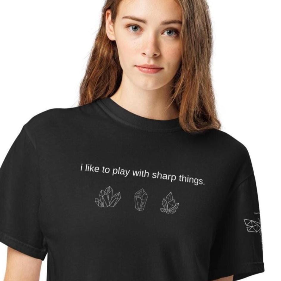 This ultra-minimalist Comfort Colors t-shirt features the cheeky phrase “I like to play with sharp things” with three delicate little crystals placed right underneath. Clean, clever, and subtly witchy — a perfect everyday shirt for crystal collectors and lovers who appreciate sharp humor and sparkling energy.