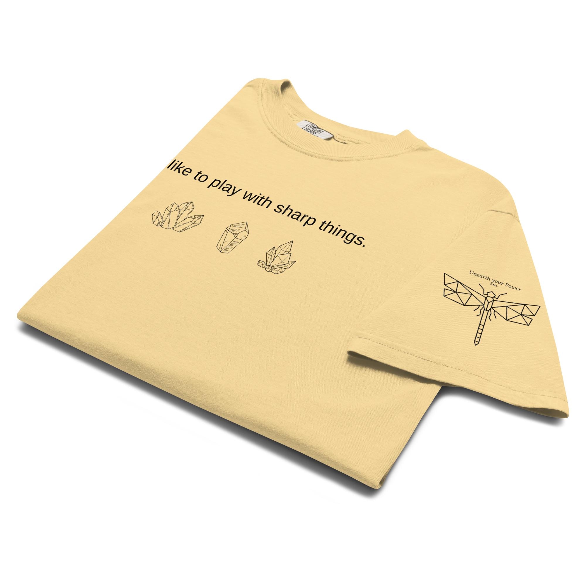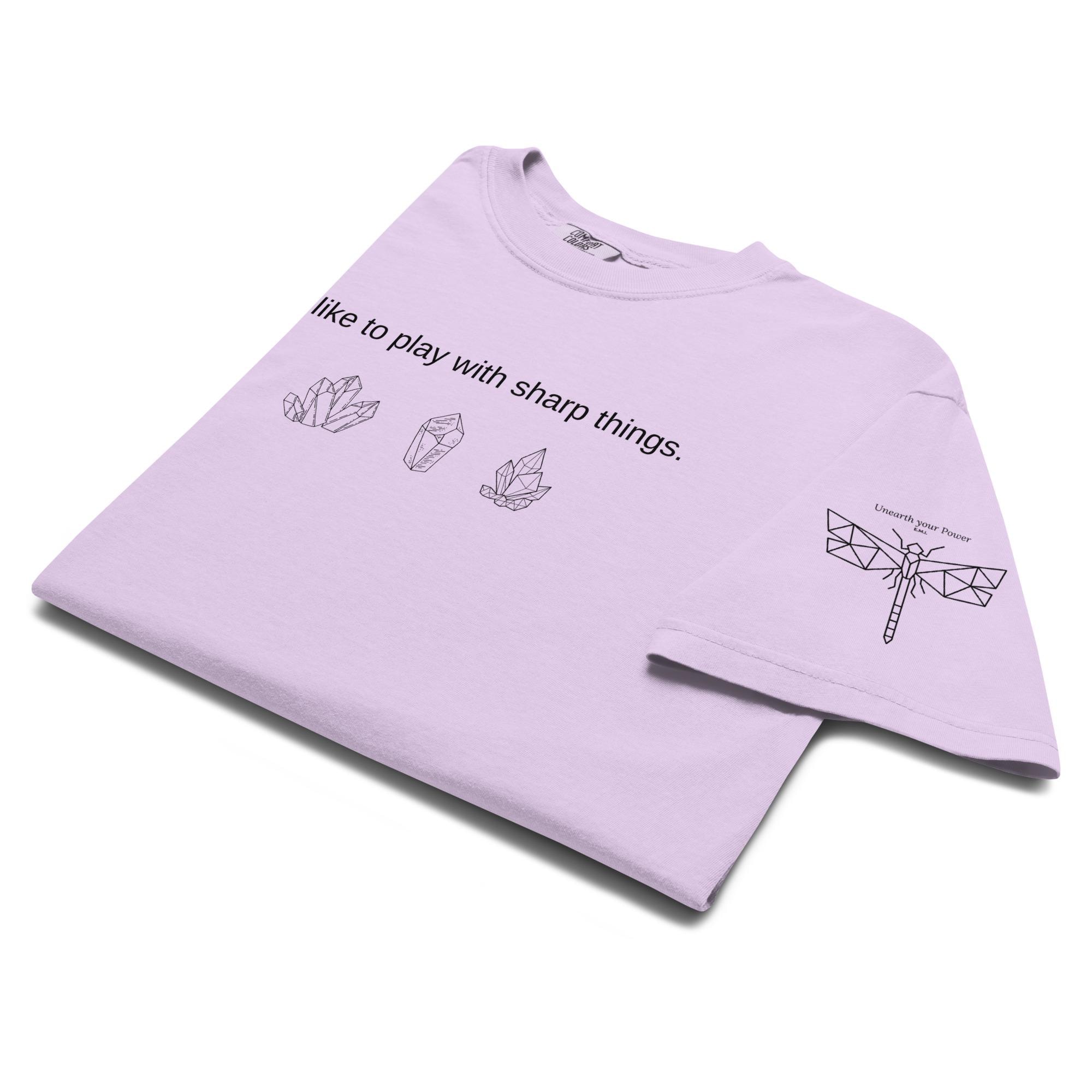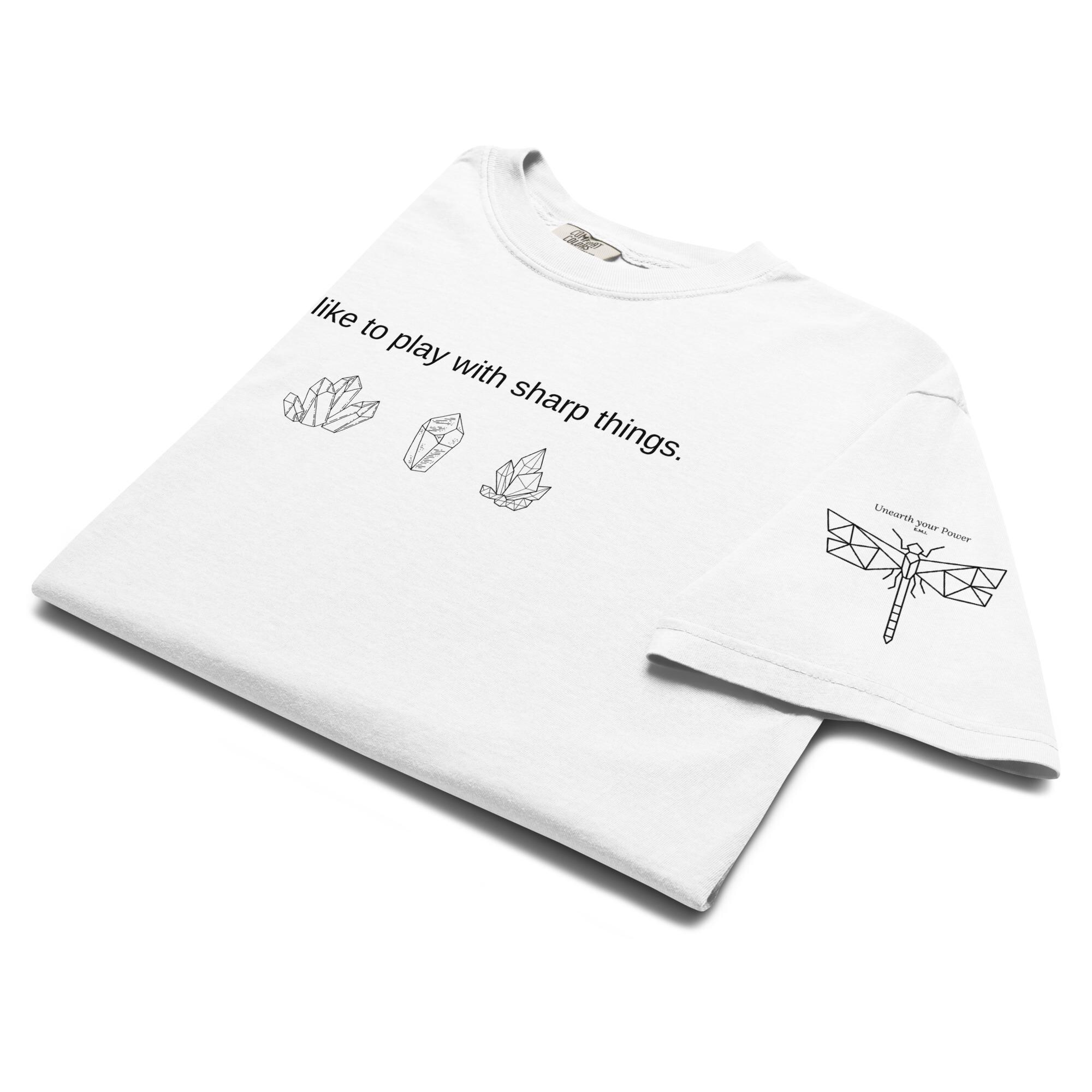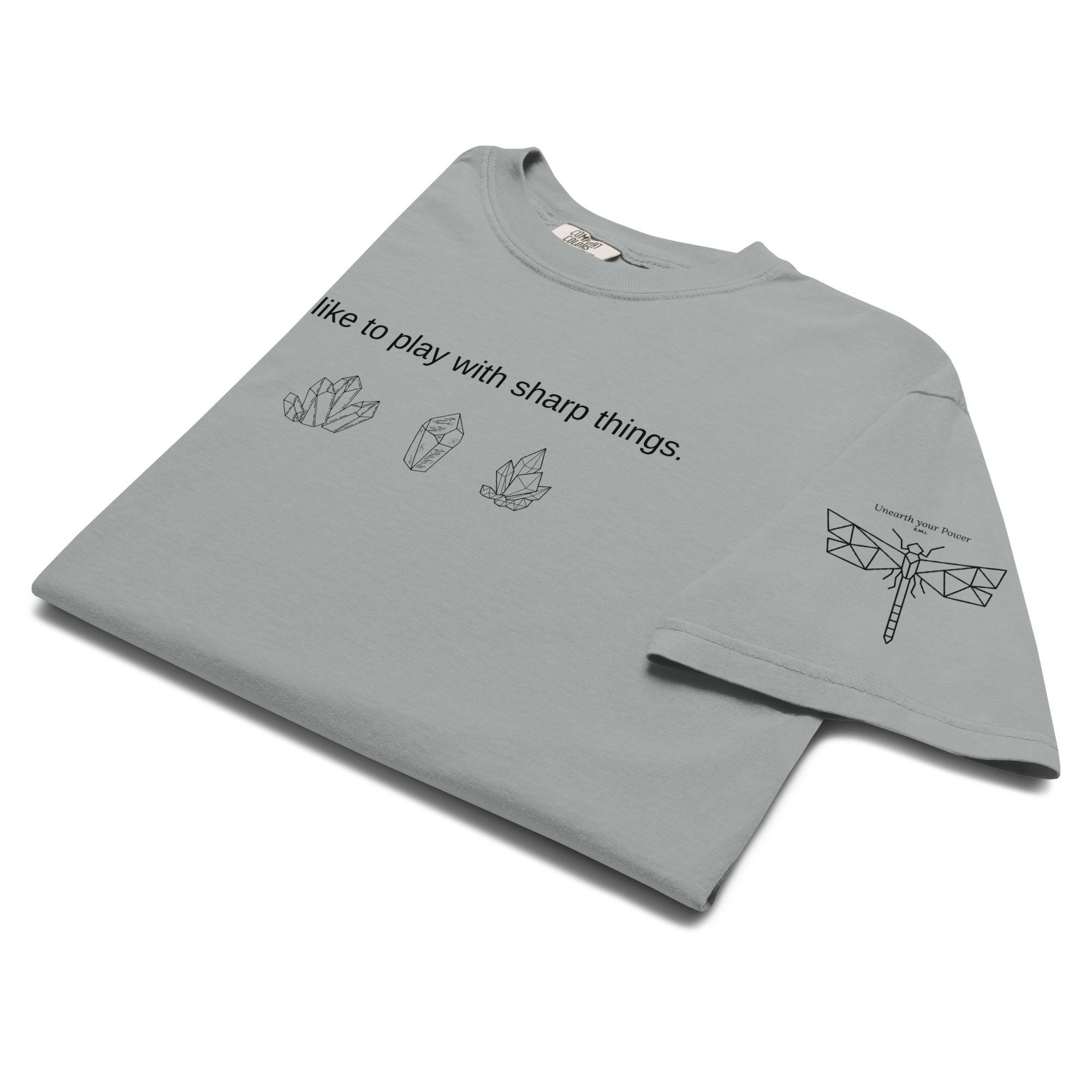 This ultra-minimalist Comfort Colors t-shirt features the cheeky phrase “I like to play with sharp things” with three delicate little crystals placed right underneath. Clean, clever, and subtly witchy — a perfect everyday shirt for crystal collectors and lovers who appreciate sharp humor and sparkling energy.