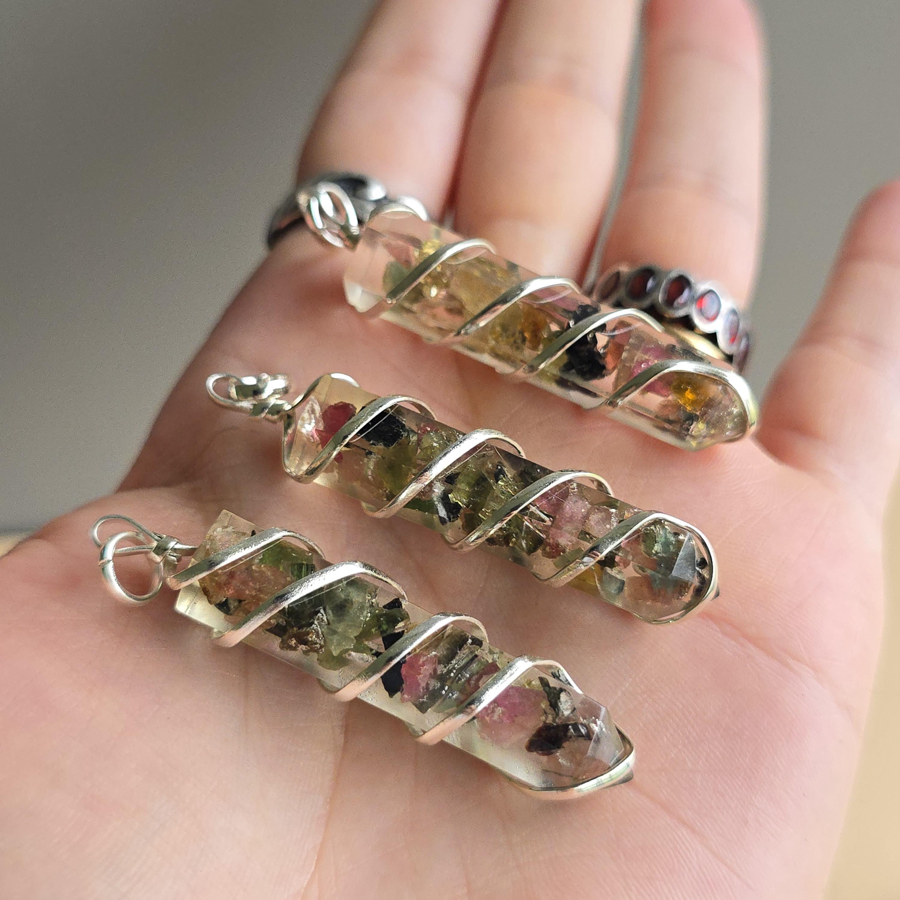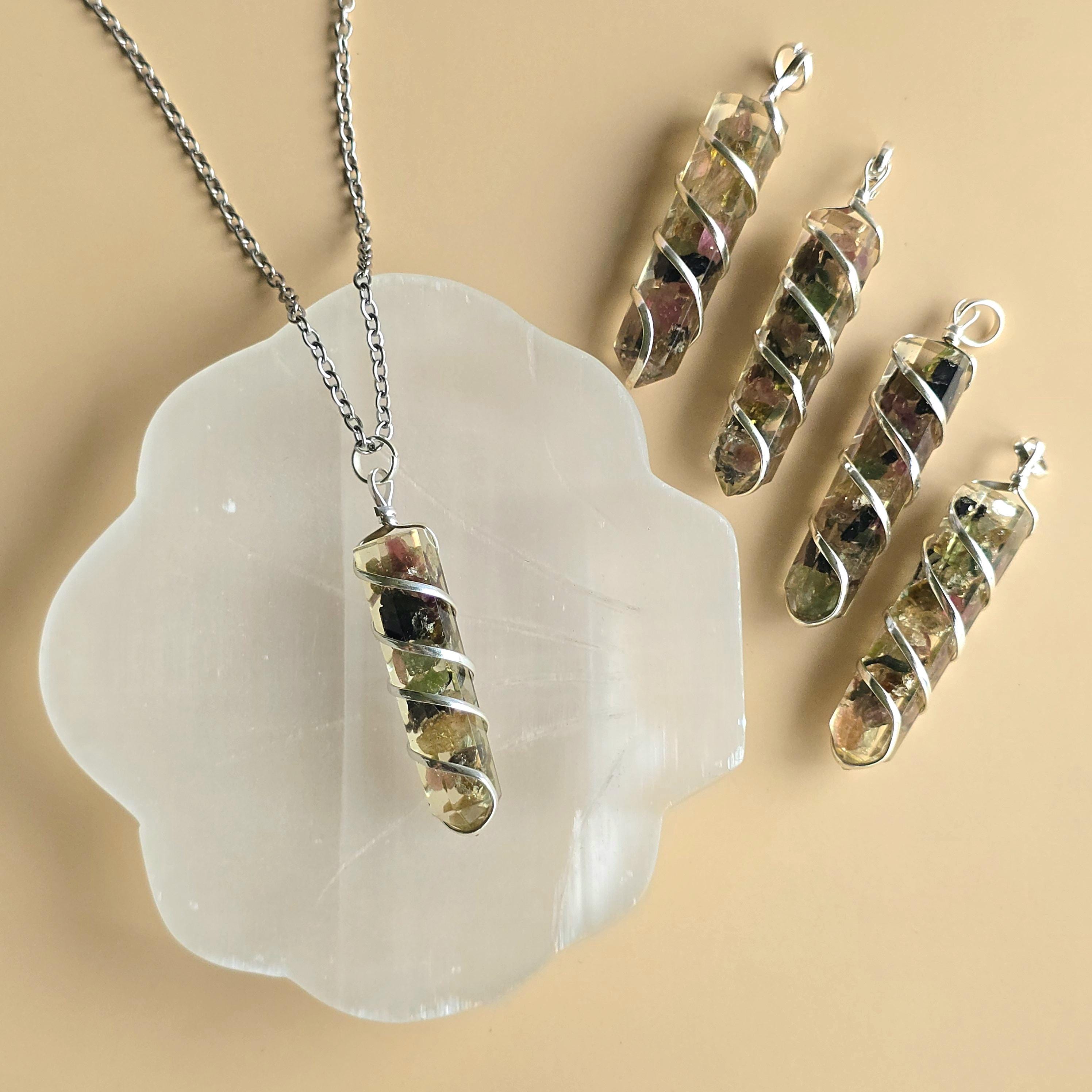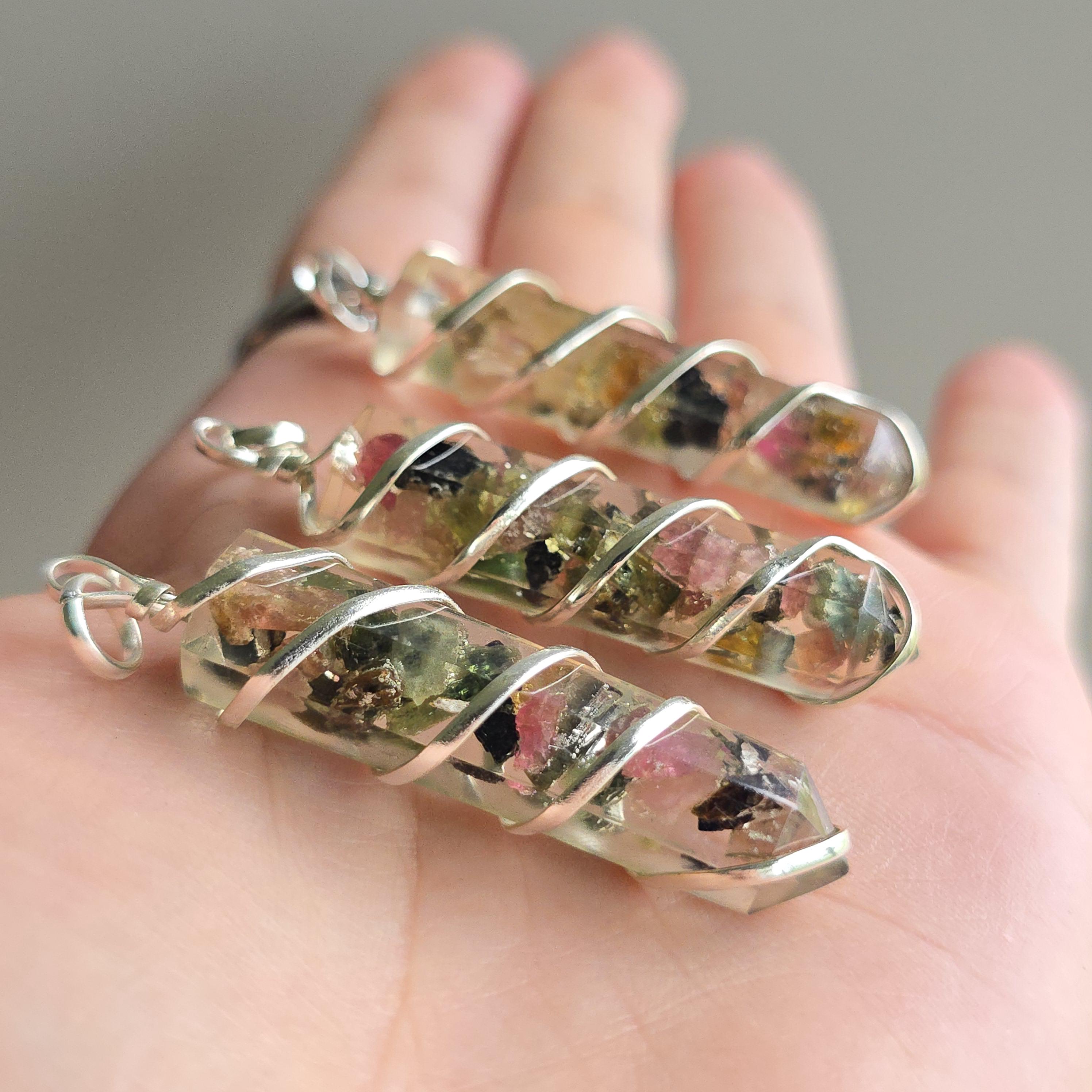 Each Handmade Pendant contains Watermelon Tourmaline Chips carefully placed inside Orgonite Resin.