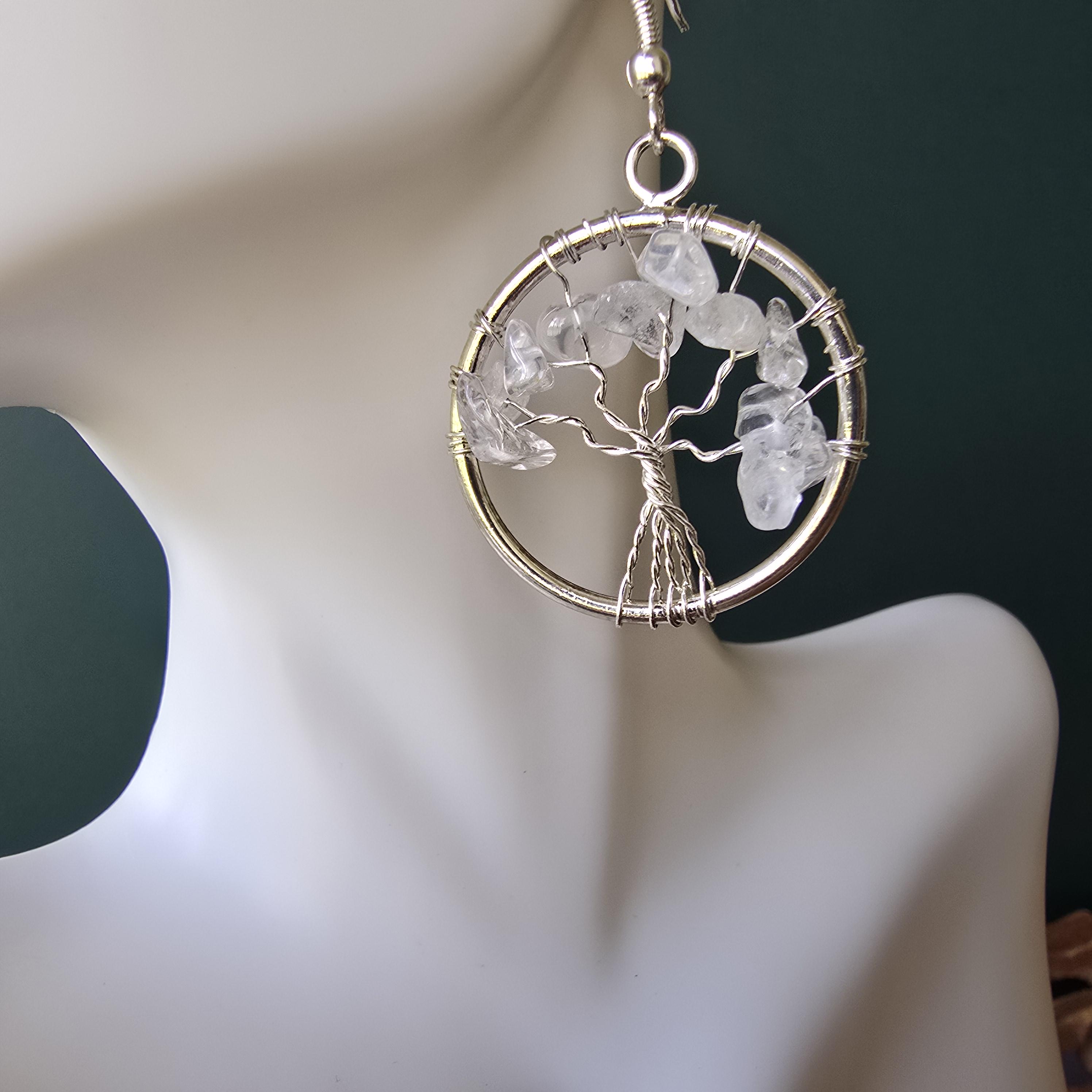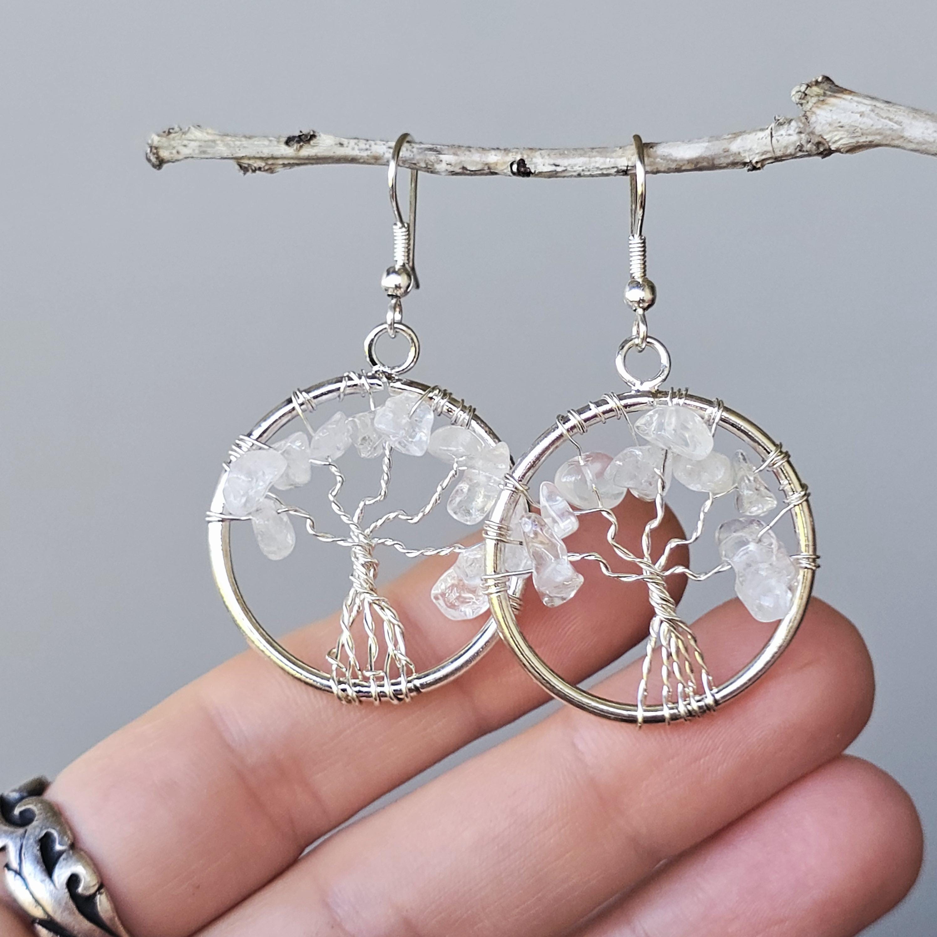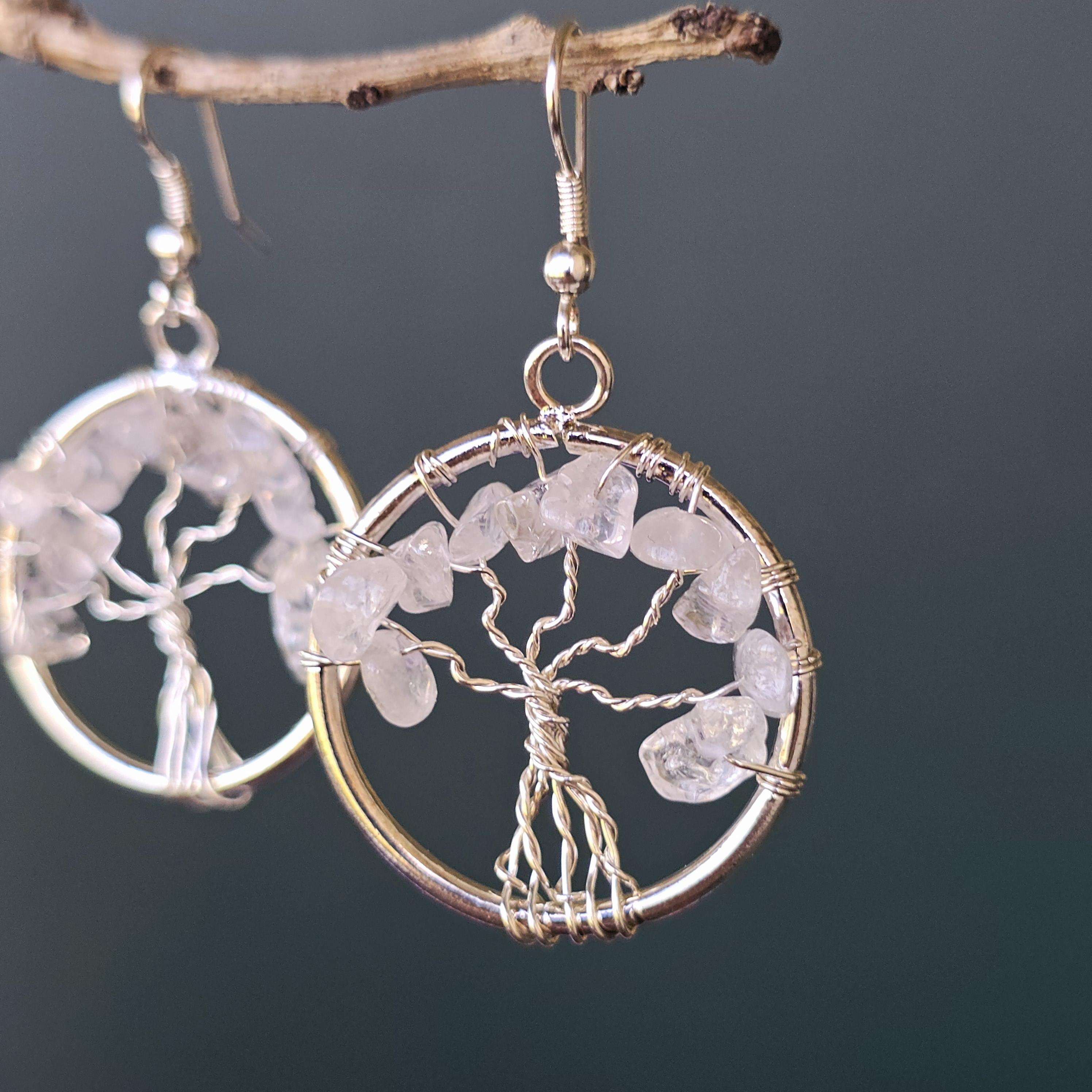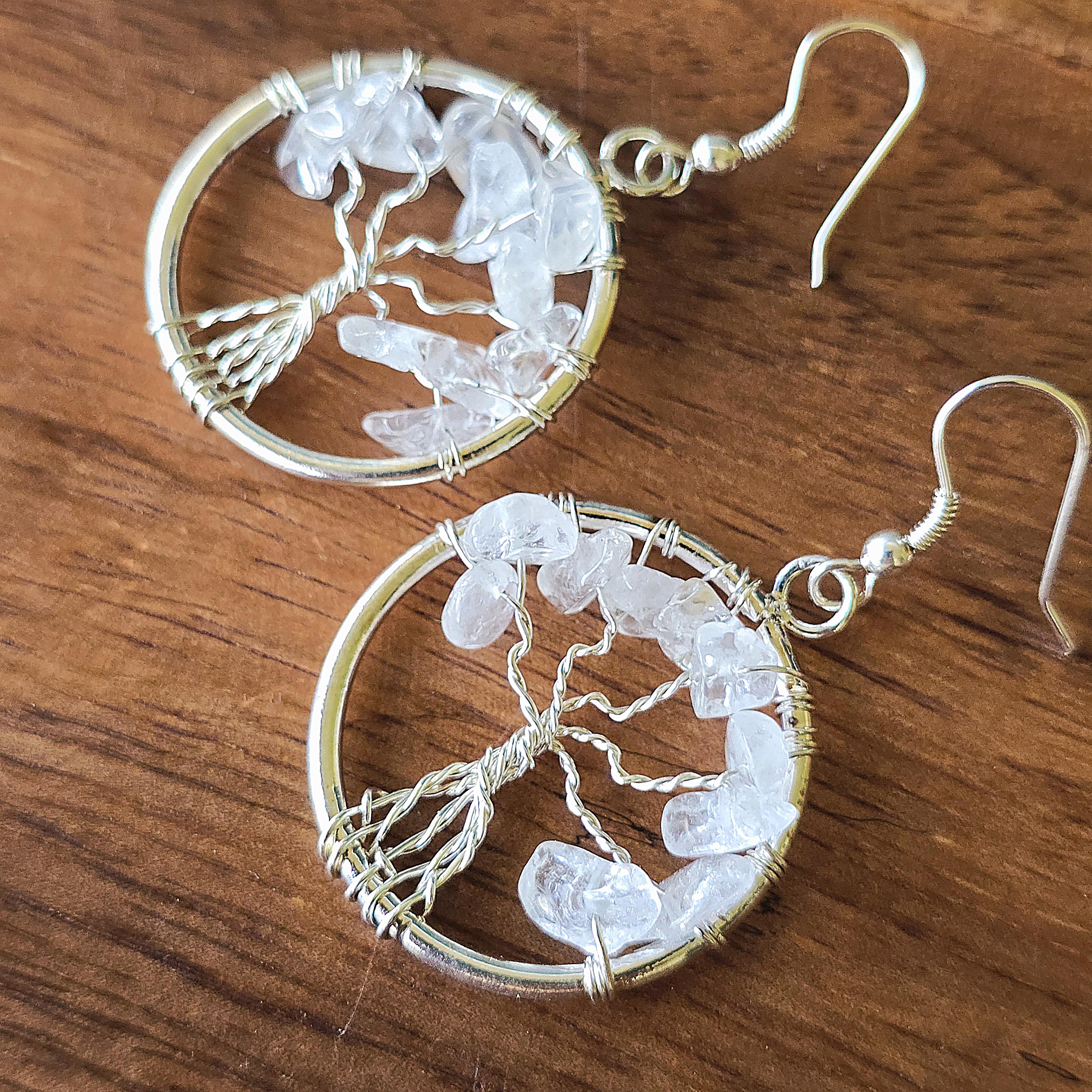 Clear Quartz Crystal Earrings: Tree of Life Dangle Earrings