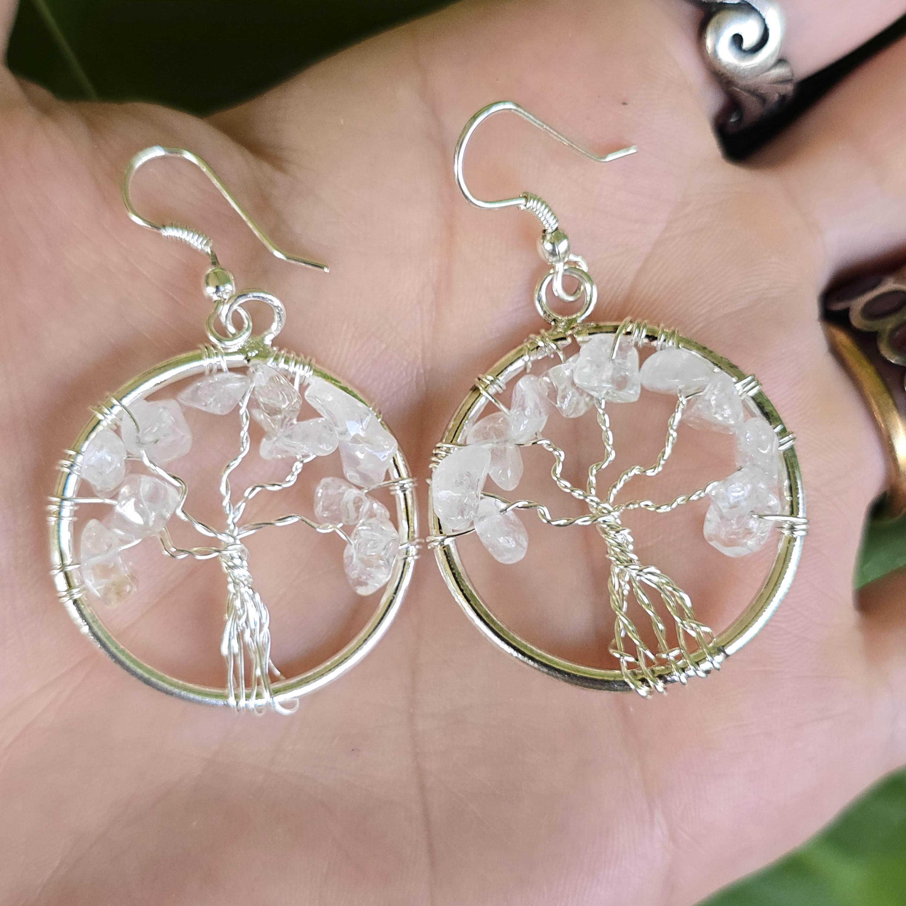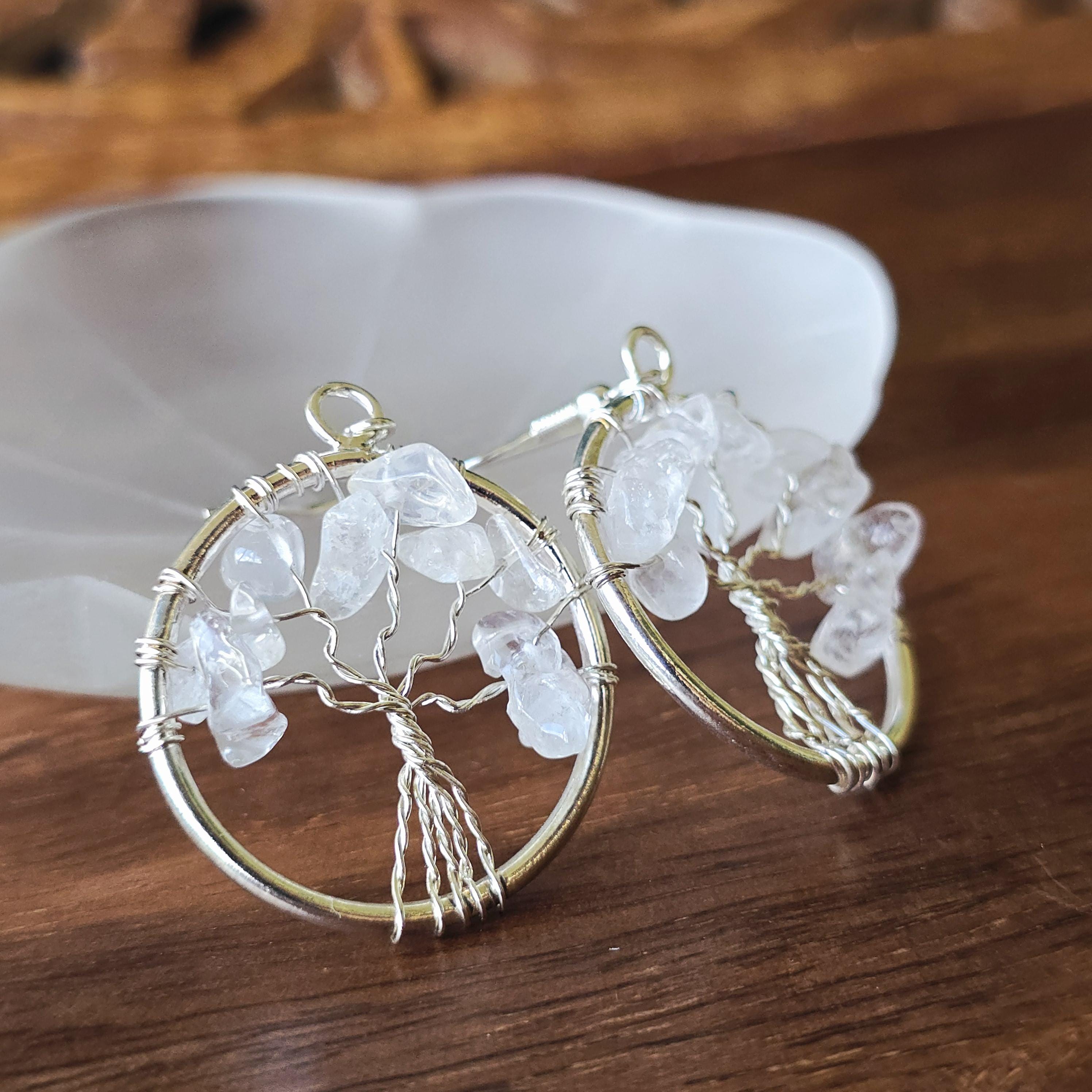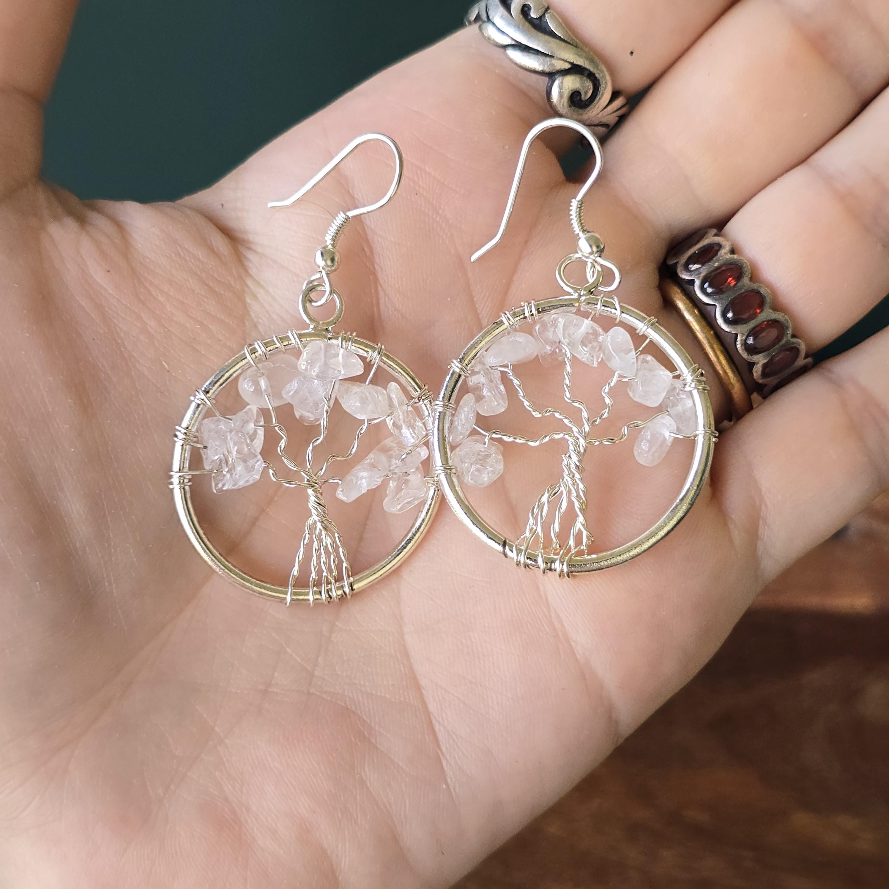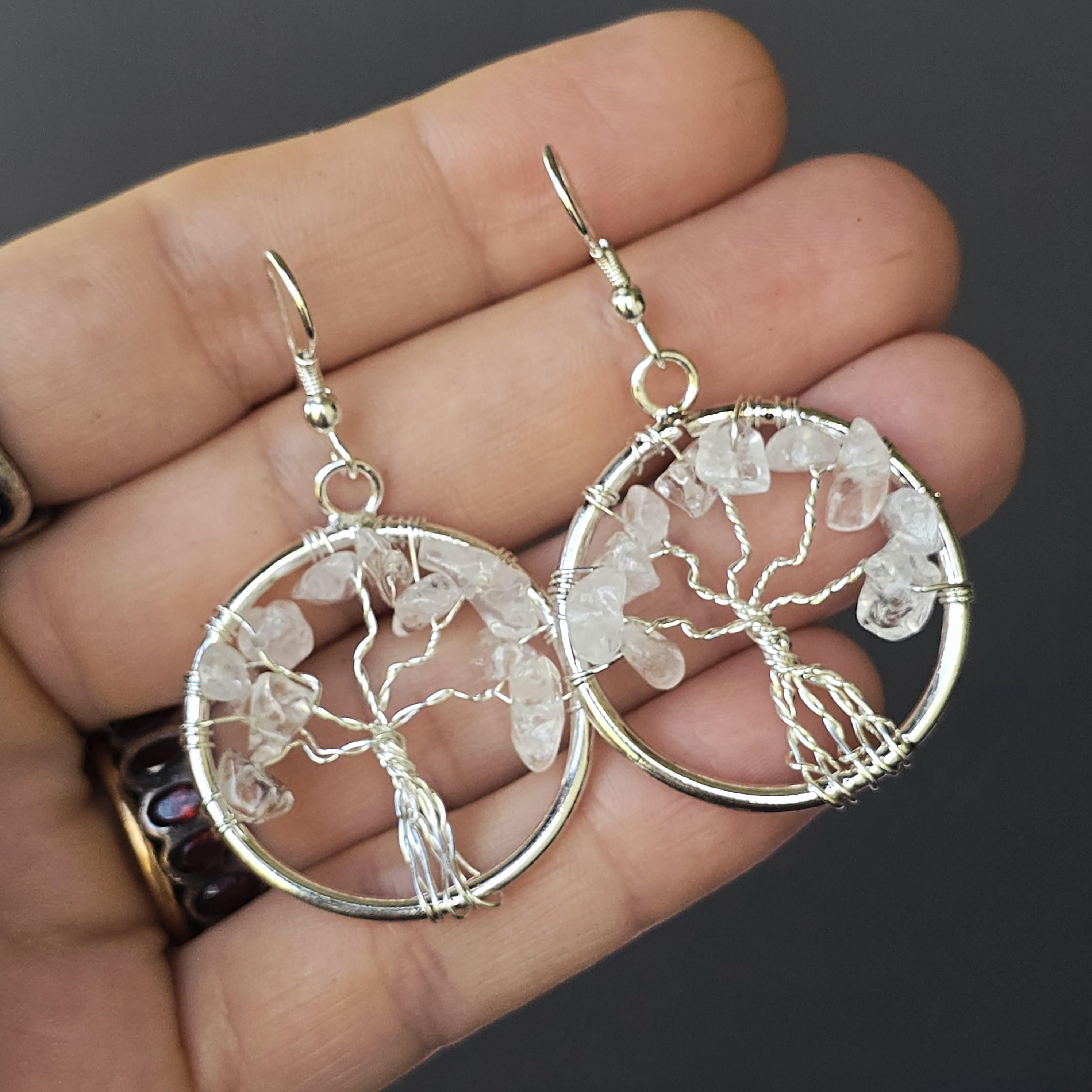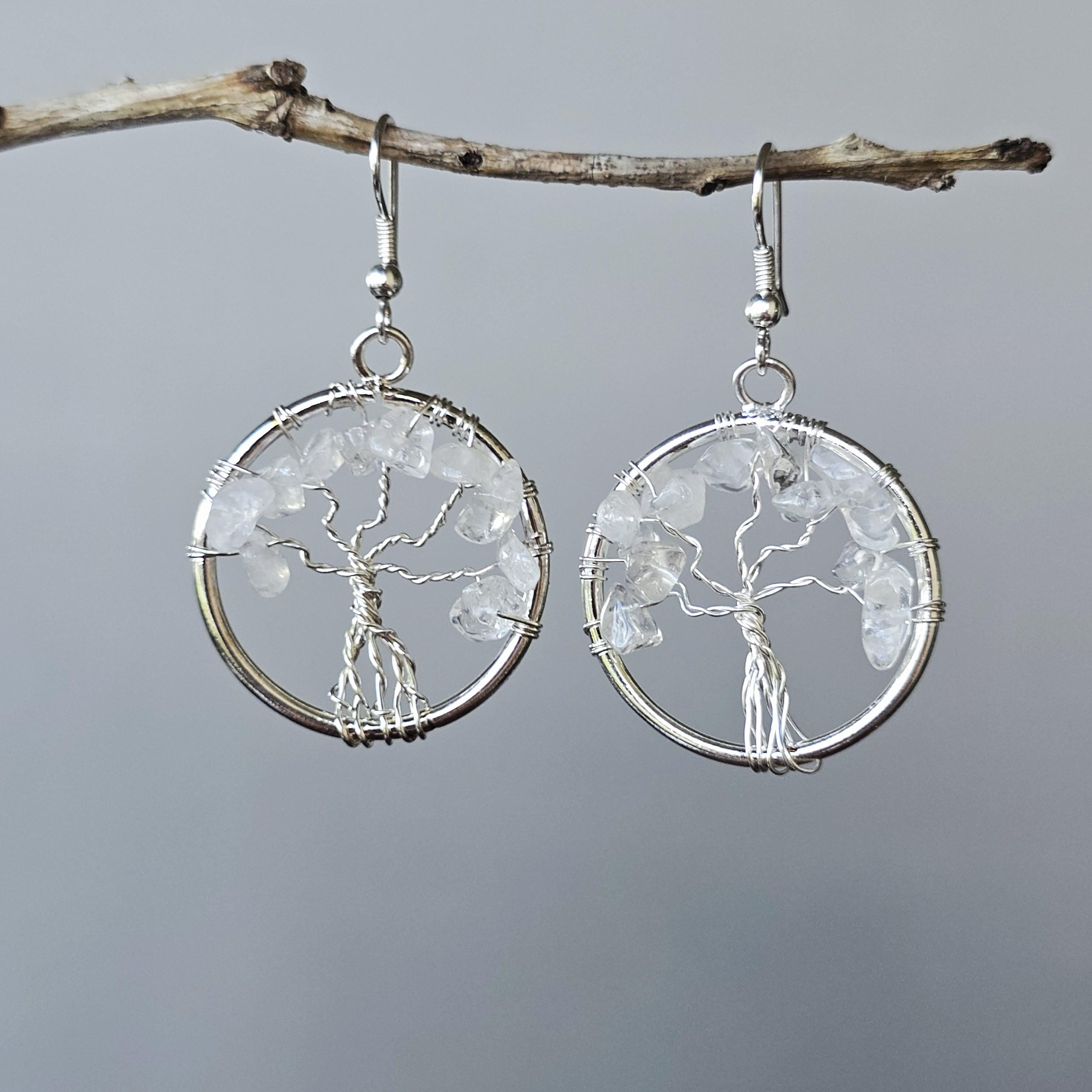 Clear Quartz Crystal Earrings: Tree of Life Dangle Earrings