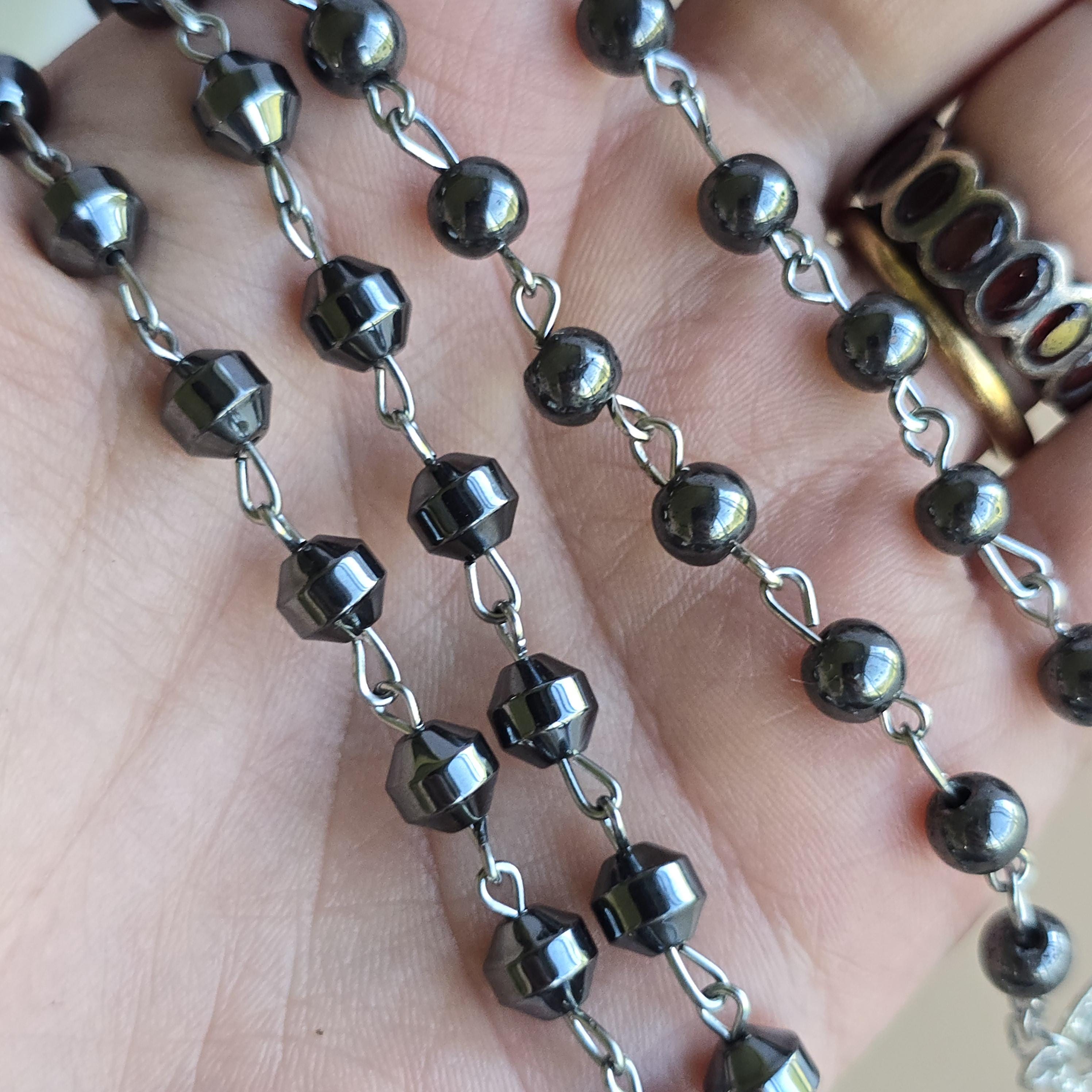 Hematite is a natural stone known for its grounding properties and metallic gray-black color. It is commonly used in jewelry for its weight, appearance, and protective qualities. Many associate it with promoting stability, focus, and emotional balance. This rosary-style necklace features hematite beads and a hematite crucifix pendant. It is a simple piece suitable for daily wear or as a religious / faith-based accessory. Each piece shows natural variations in color and pattern due to the stone.