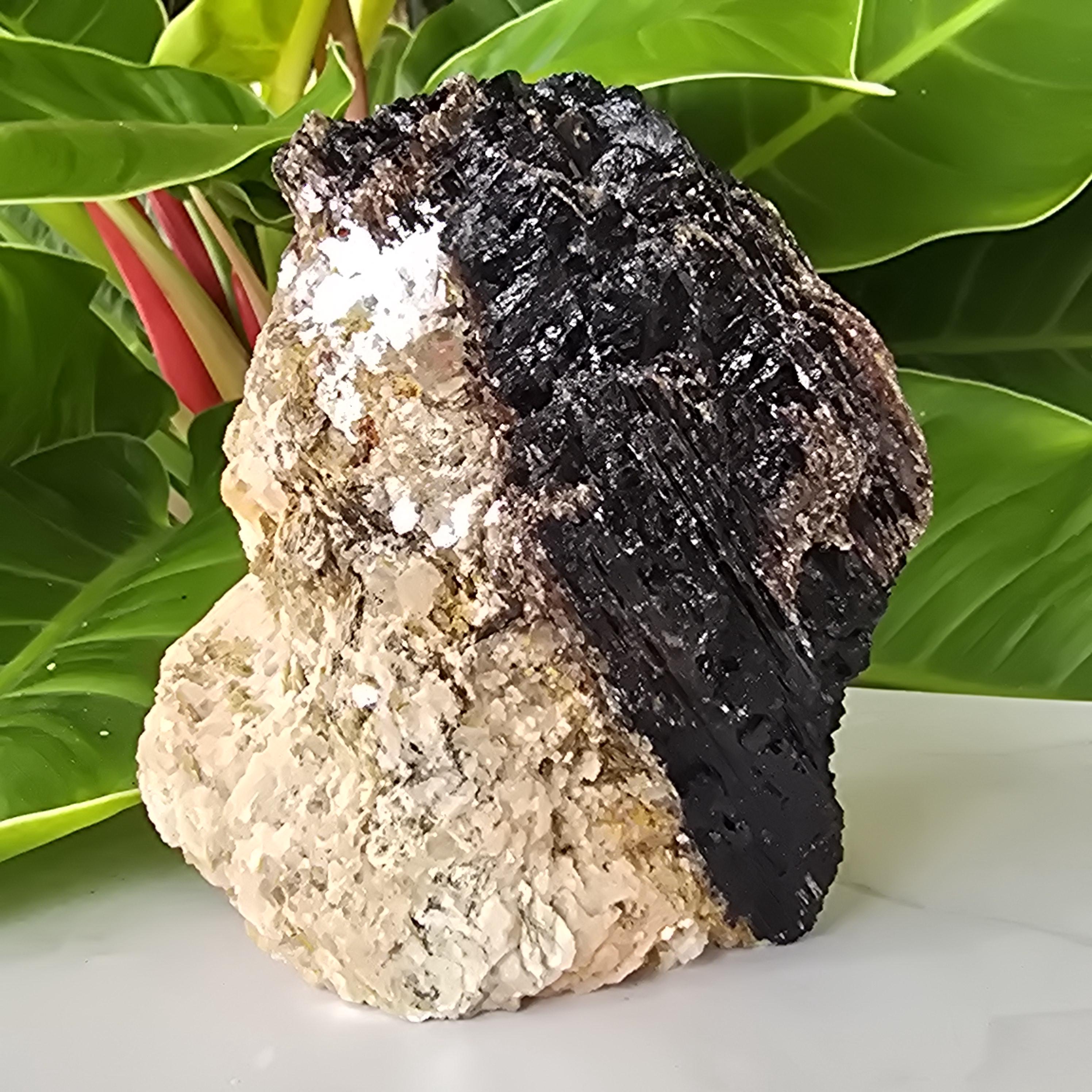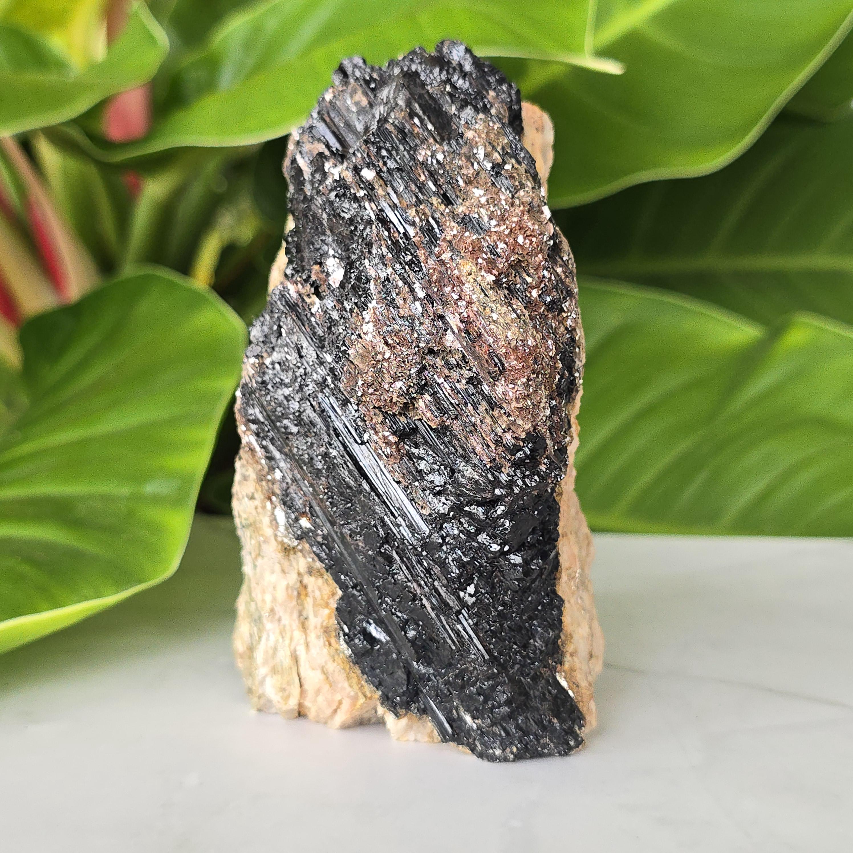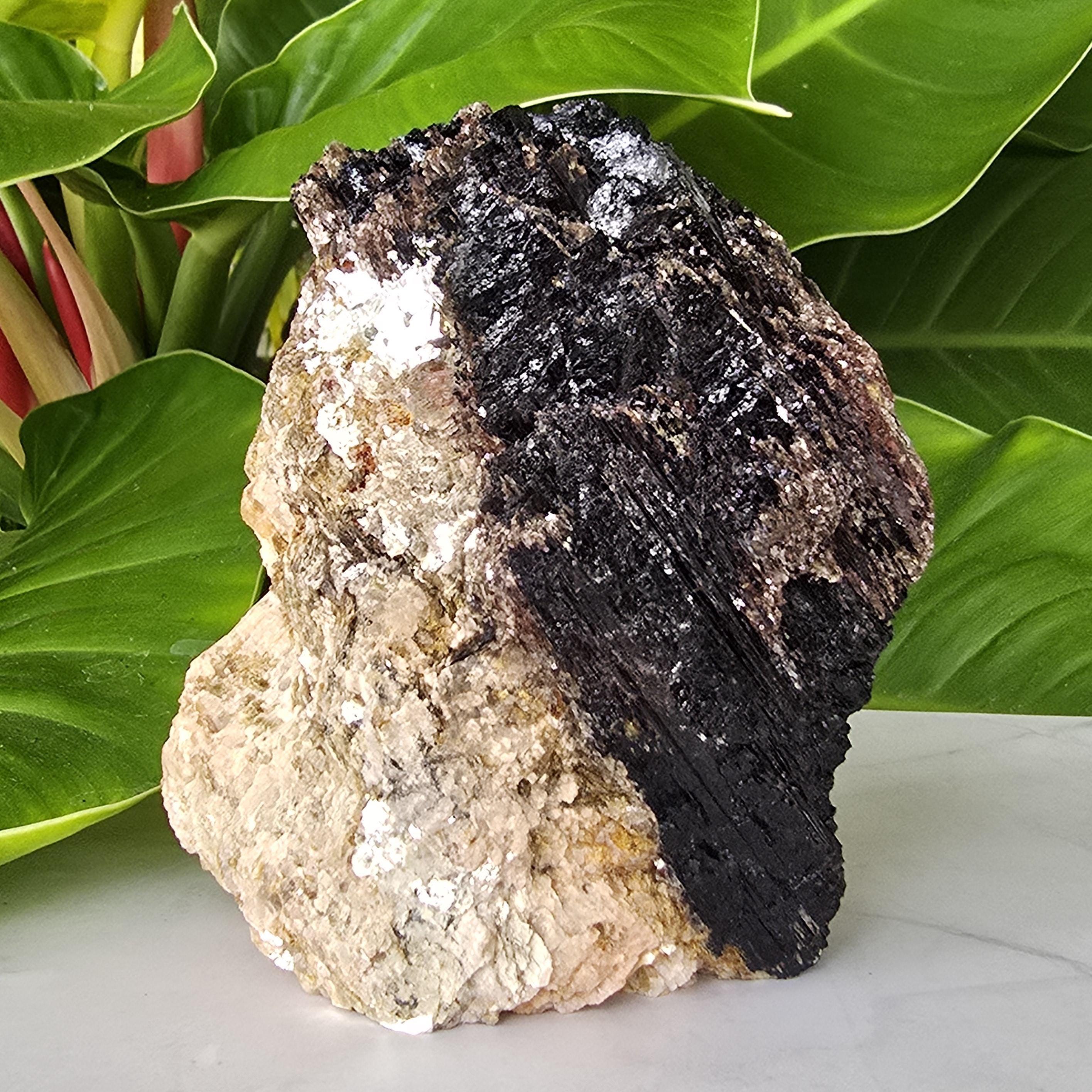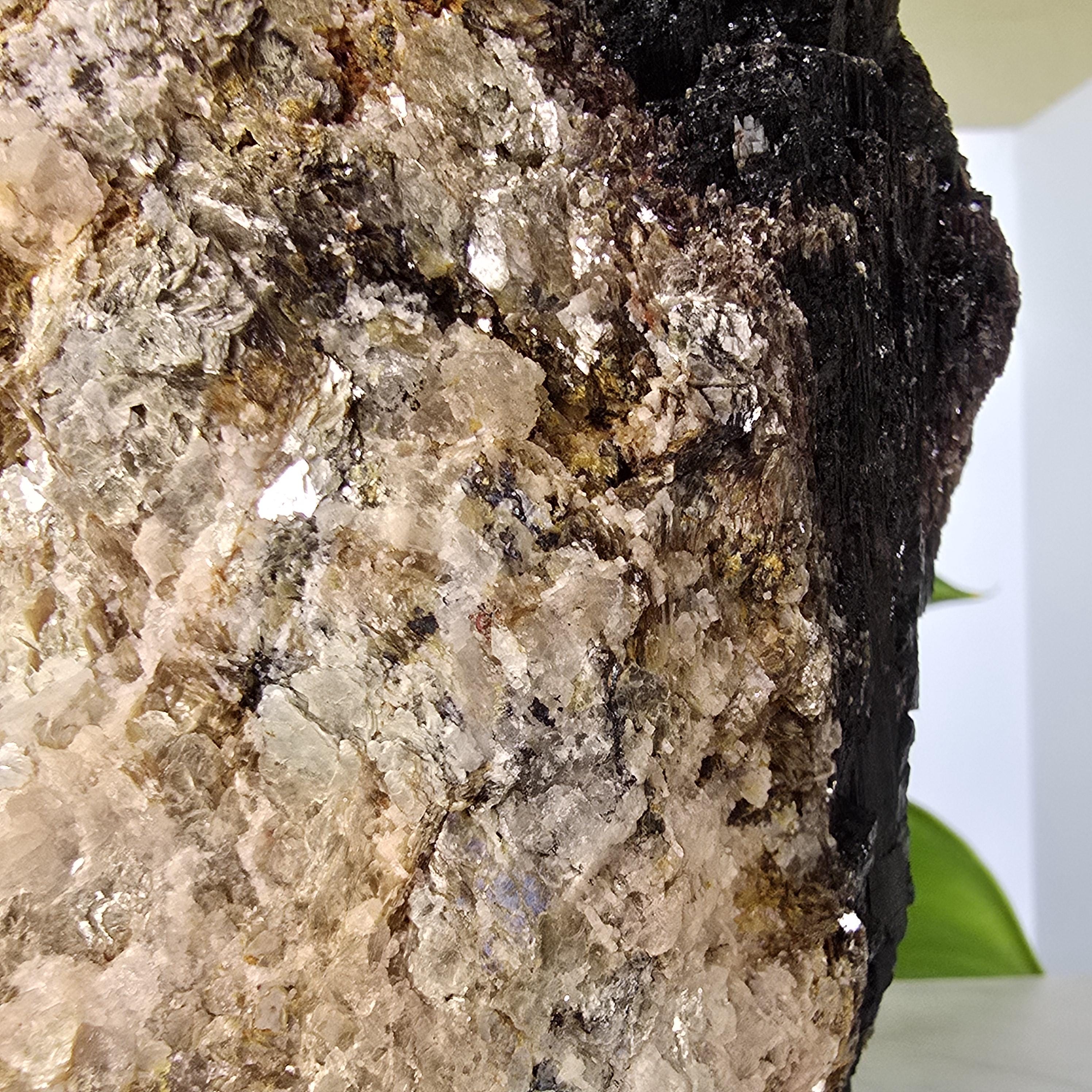 Black tourmaline is a natural mineral widely used for its strong protective and grounding properties. Many associate it with shielding against negative energy, EMF, and promoting stability and emotional balance. The combination of black tourmaline with quartz and mica creates a powerful energetic piece. This sizable raw specimen is perfect for display on a shelf, altar, meditation space, or as a statement home decor piece, It's on a cut base for easy display. Each specimen is natural and unique, with variations in black tourmaline crystal formation, quartz clarity, golden mica sparkle, and white barite inclusions.