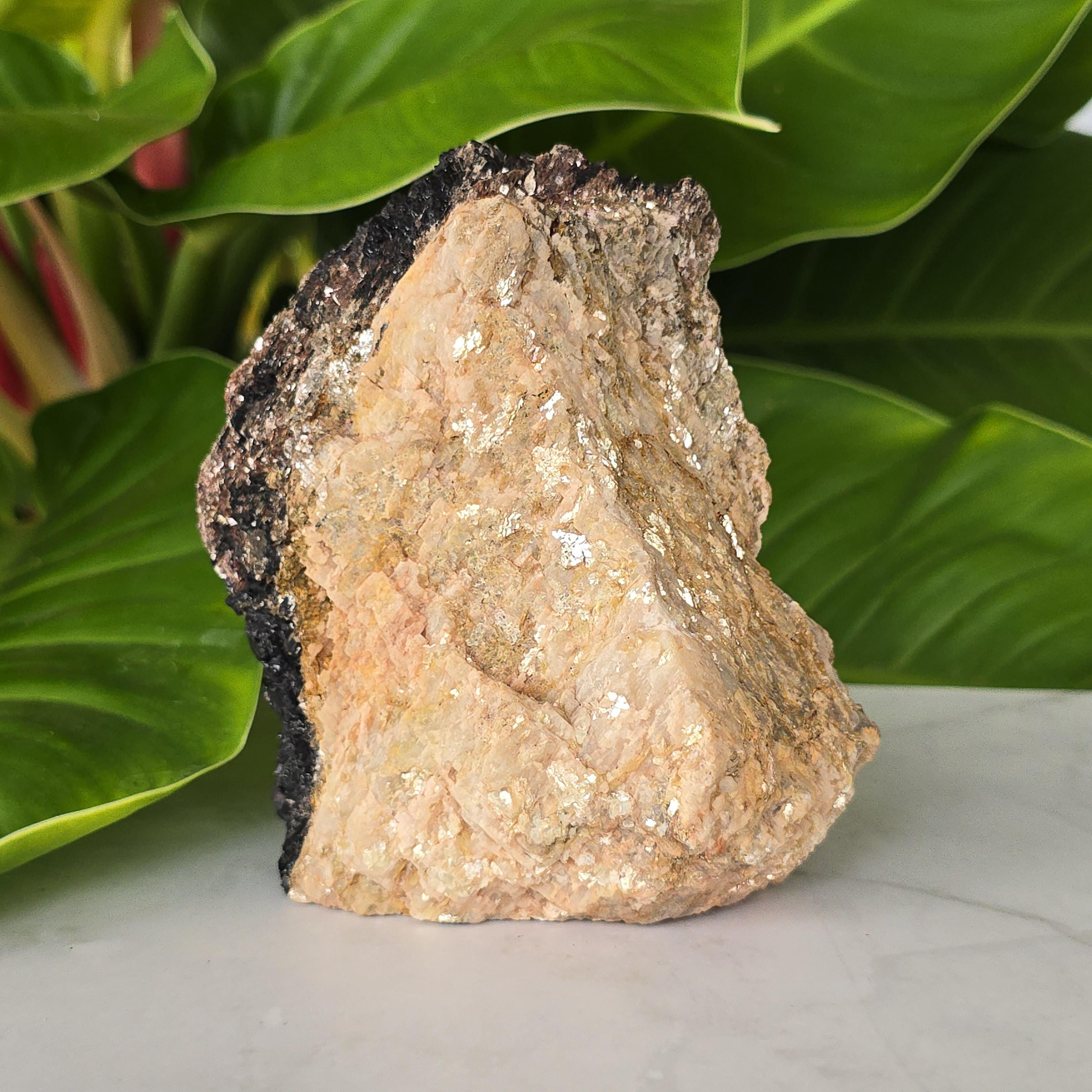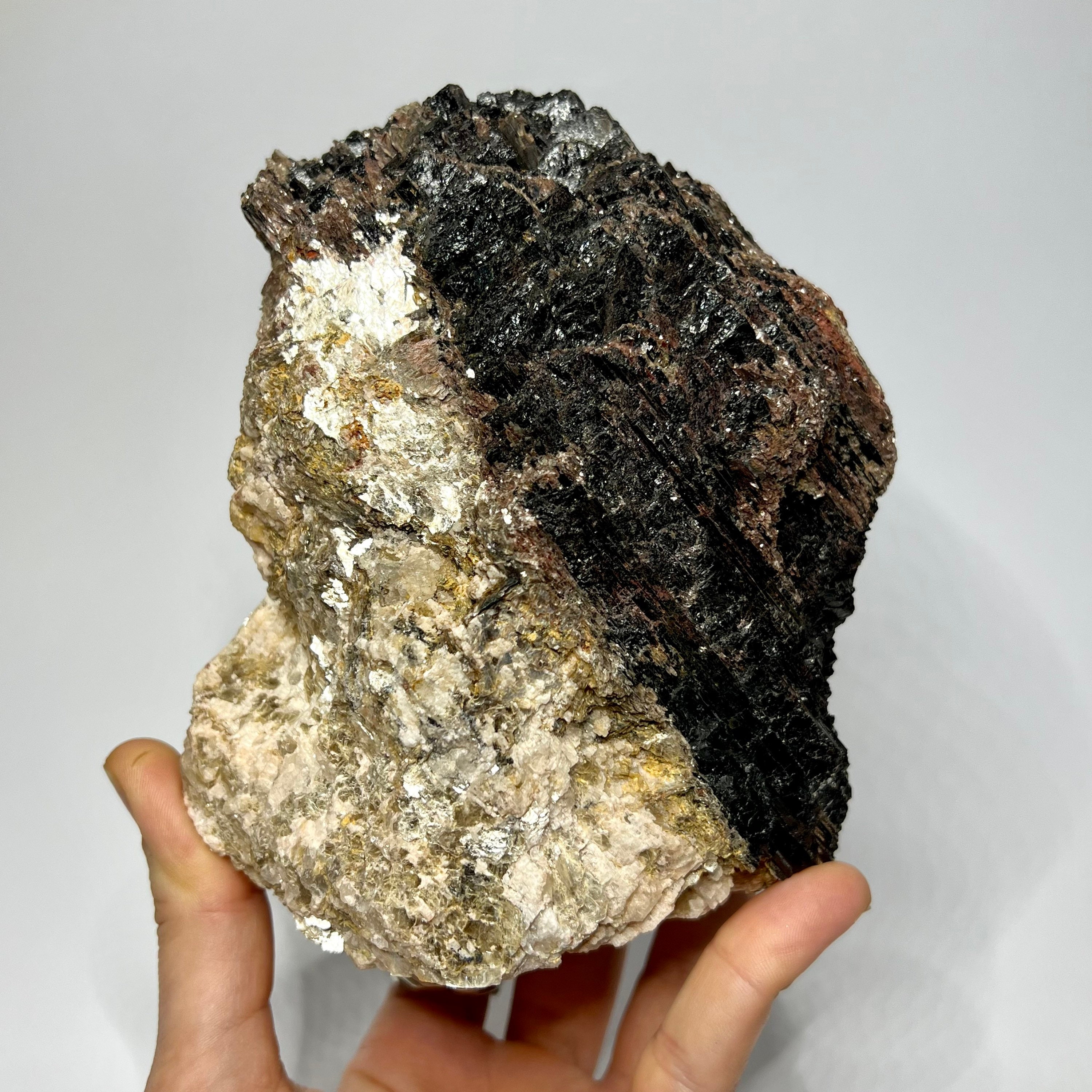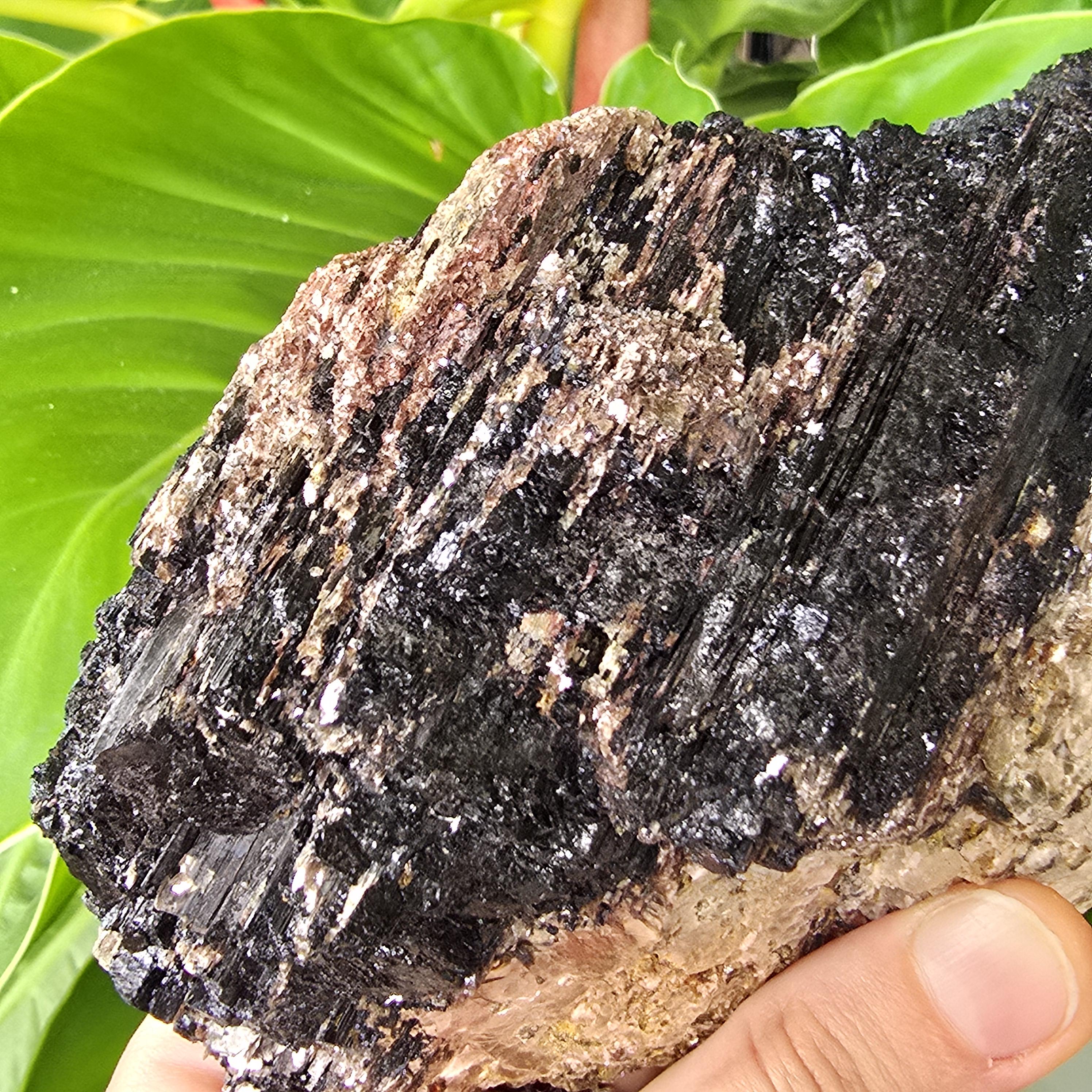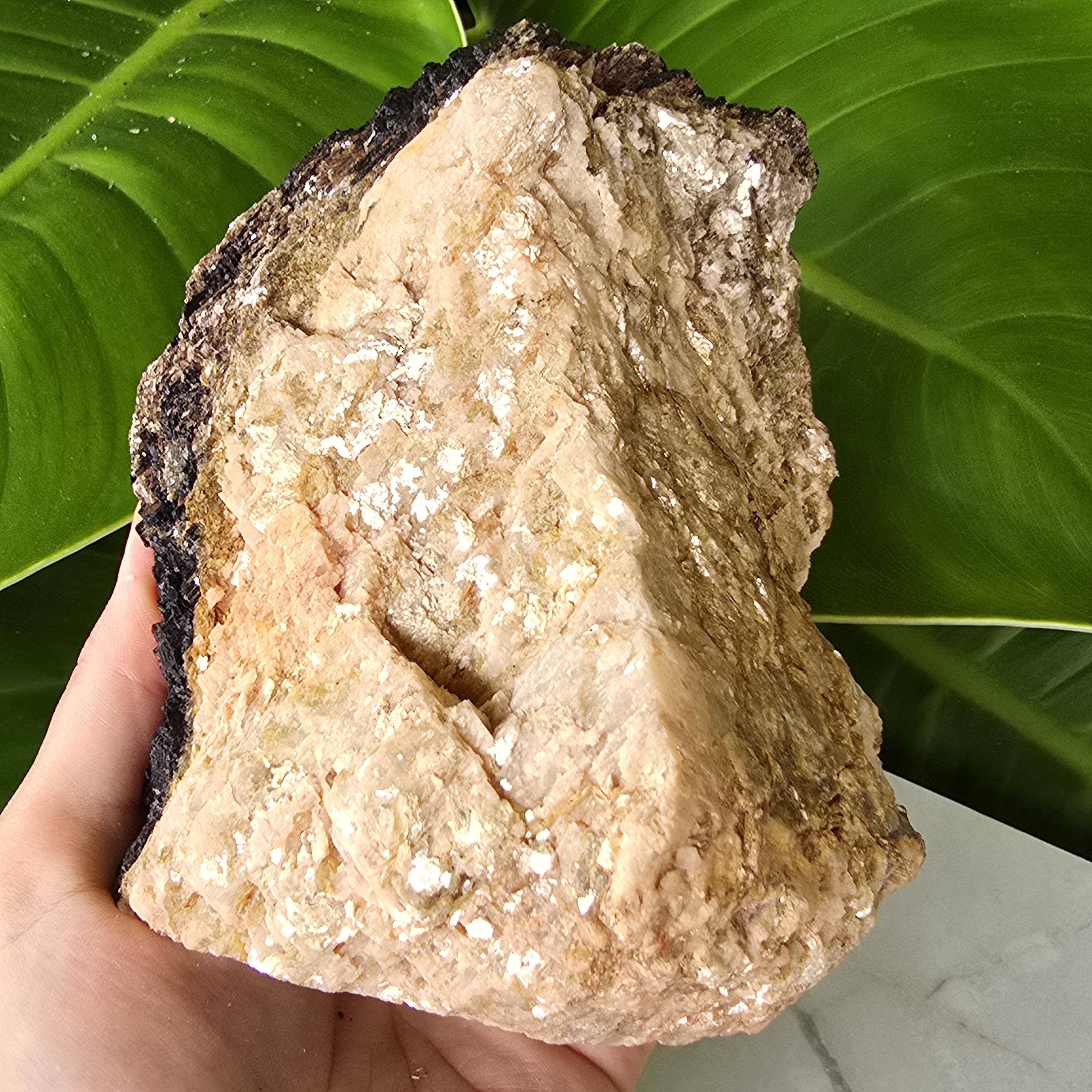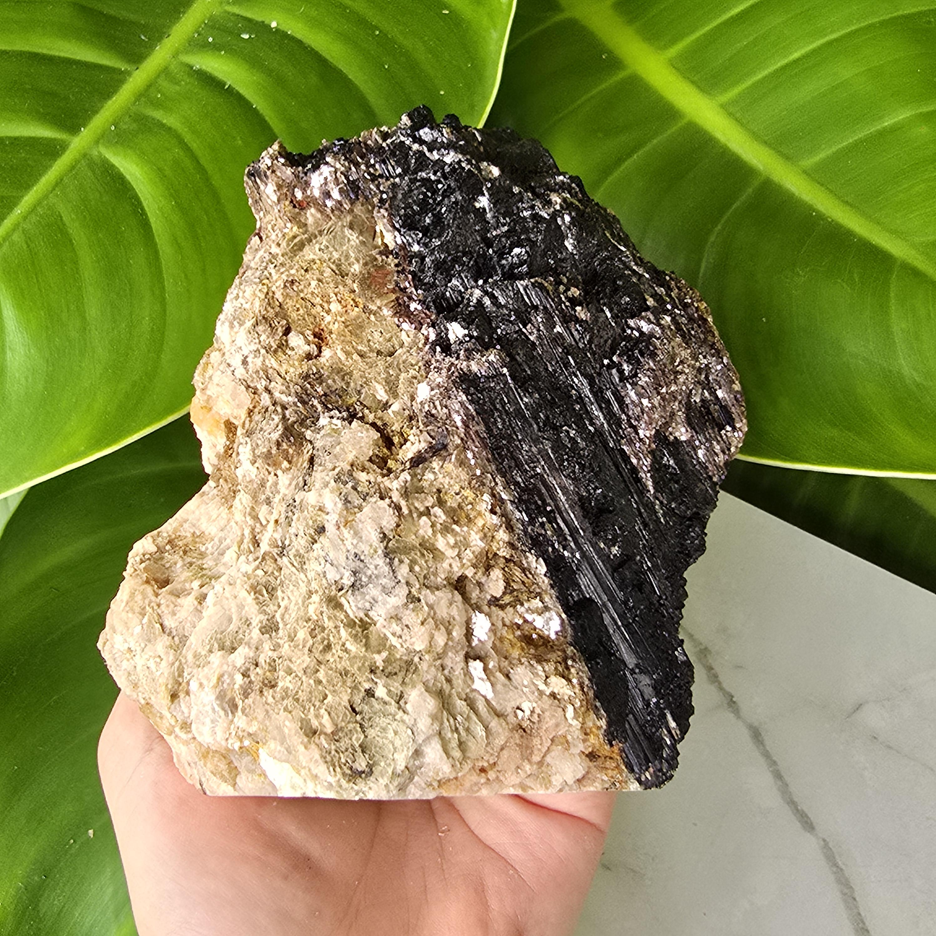 Black tourmaline is a natural mineral widely used for its strong protective and grounding properties. Many associate it with shielding against negative energy, EMF, and promoting stability and emotional balance. The combination of black tourmaline with quartz and mica creates a powerful energetic piece. This sizable raw specimen is perfect for display on a shelf, altar, meditation space, or as a statement home decor piece, It's on a cut base for easy display. Each specimen is natural and unique, with variations in black tourmaline crystal formation, quartz clarity, golden mica sparkle, and white barite inclusions.