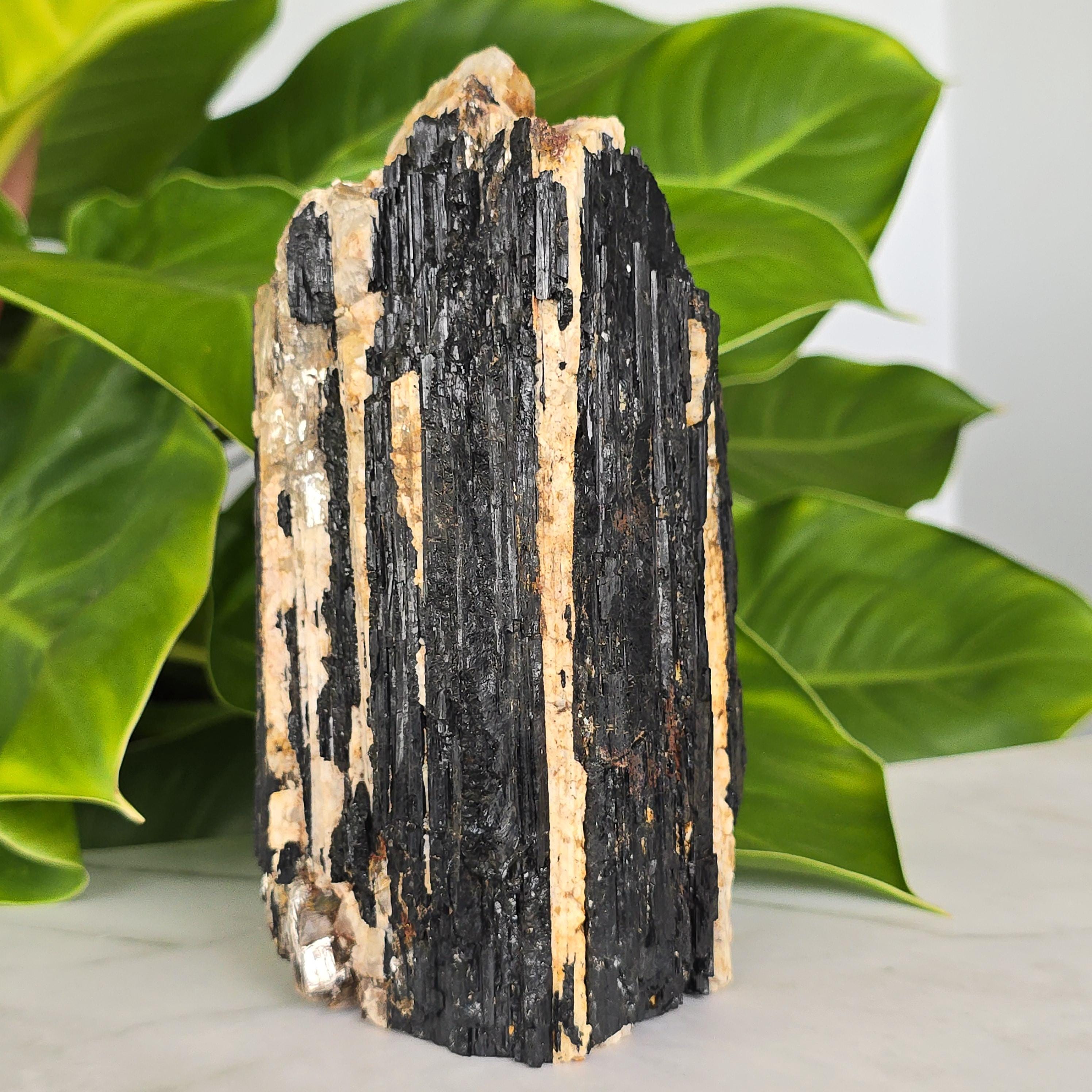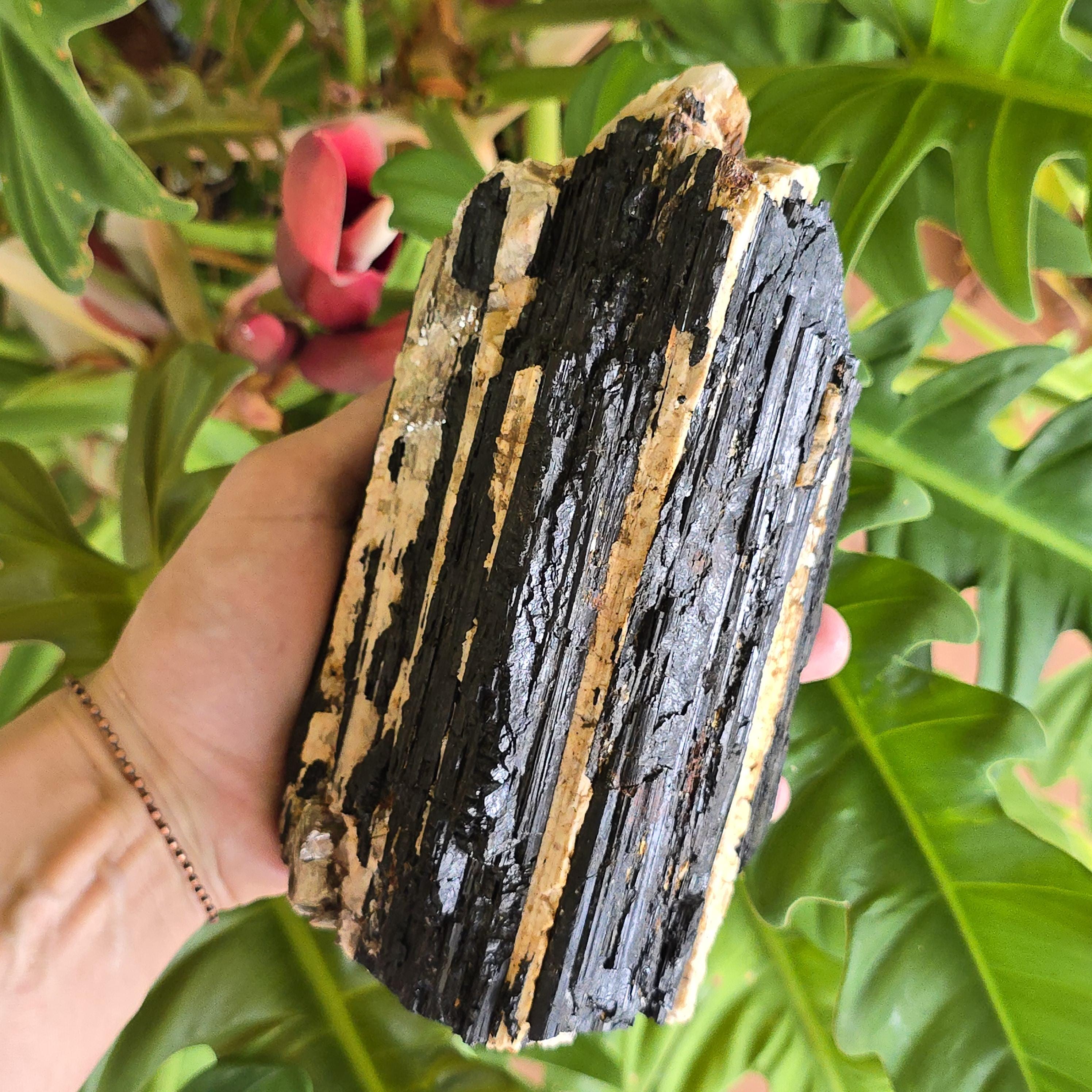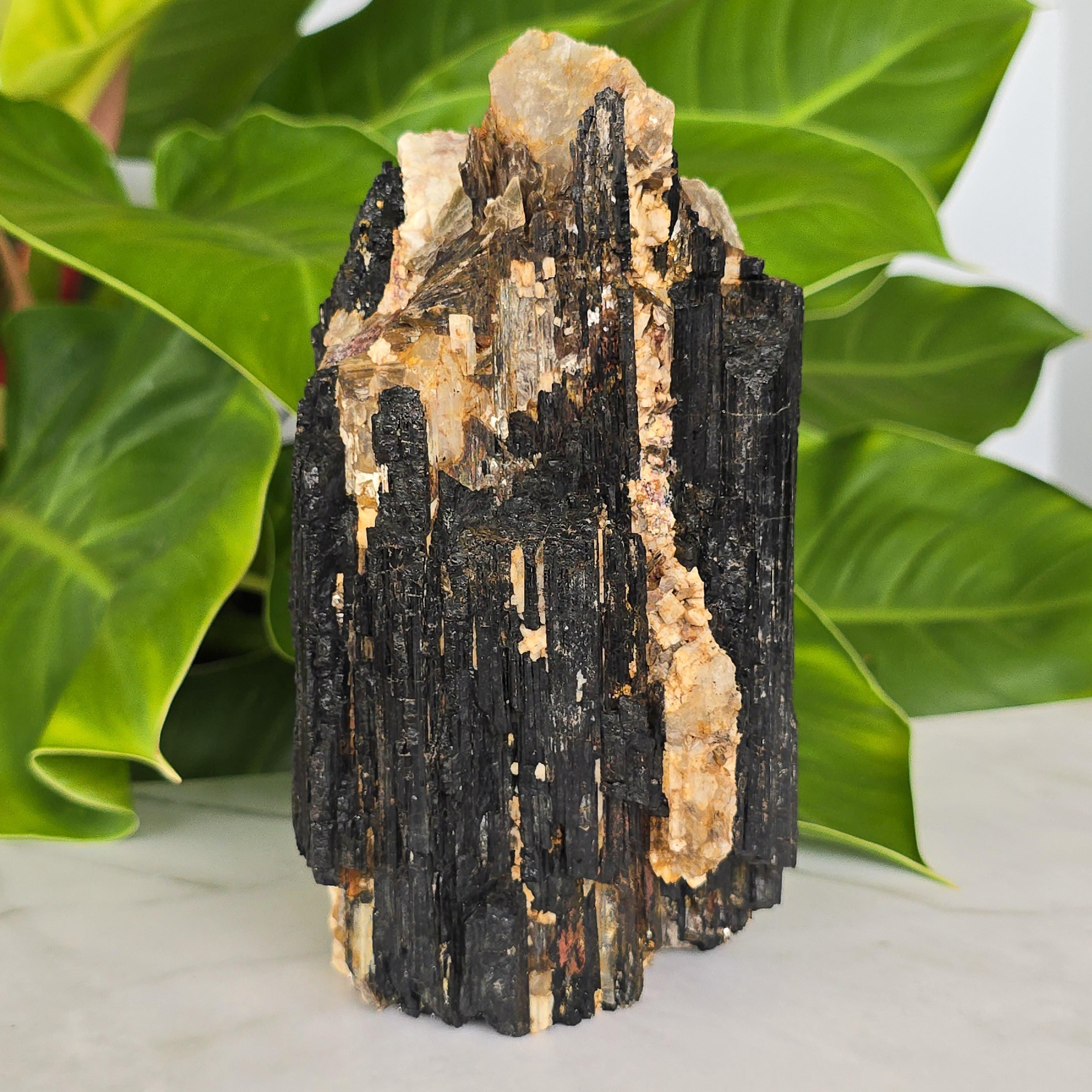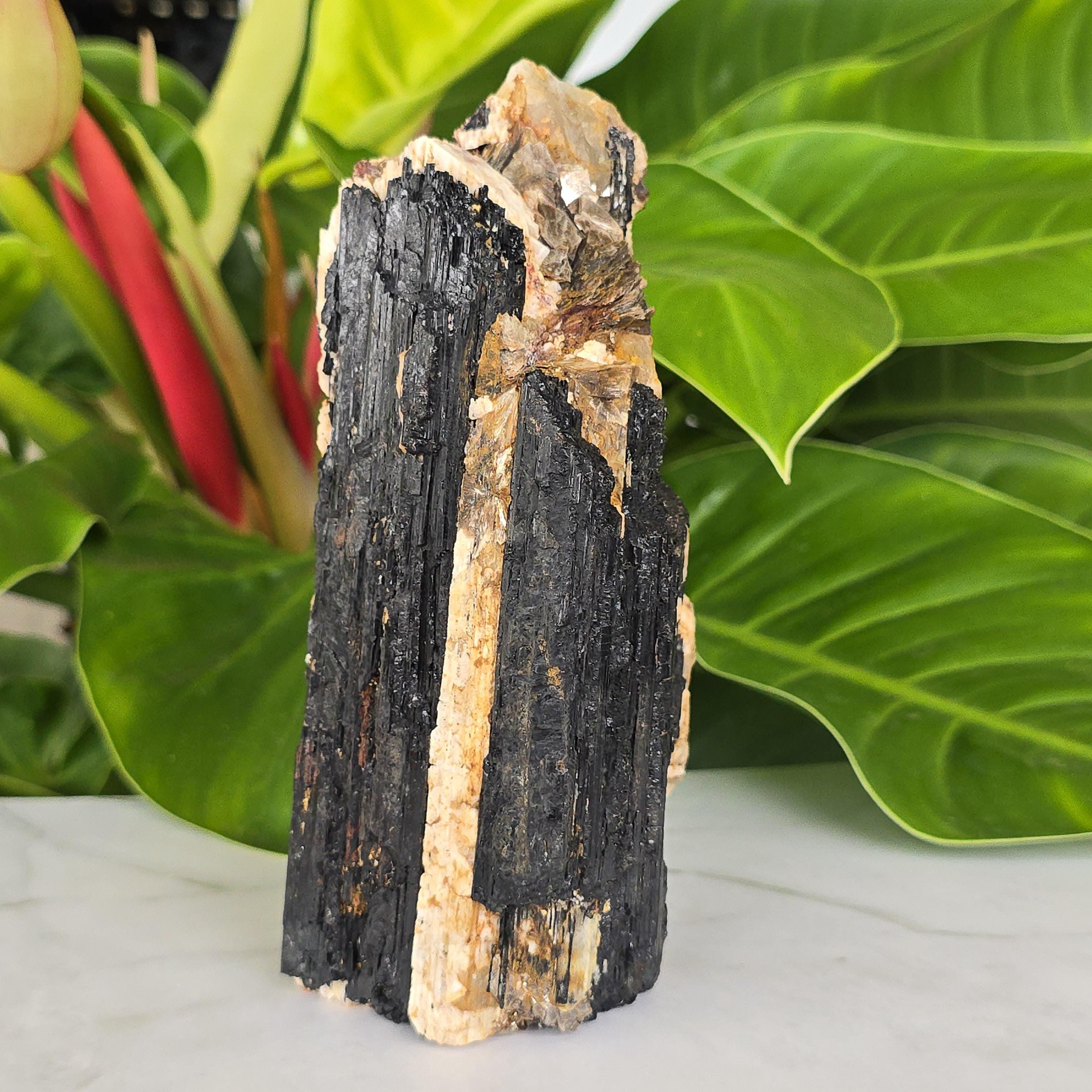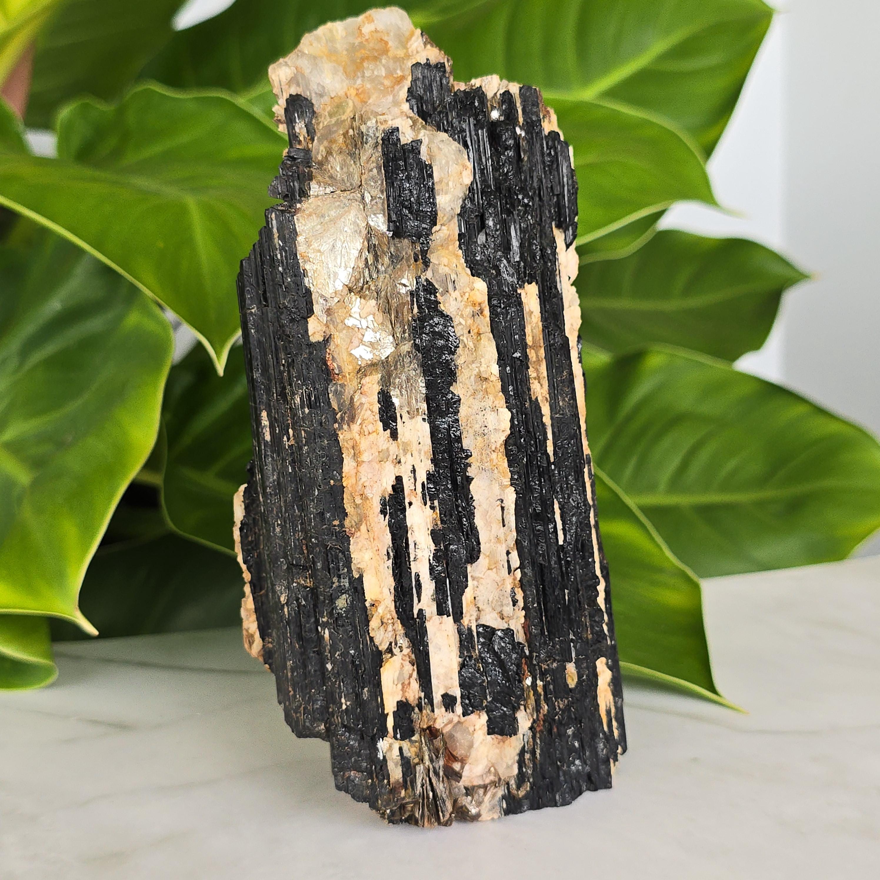 Black tourmaline is a natural mineral widely used for its strong protective and grounding properties. Many associate it with shielding against negative energy, EMF, and promoting stability and emotional balance. The combination of black tourmaline with quartz and mica creates a powerful energetic piece. This sizable raw specimen is perfect for display on a shelf, altar, meditation space, or as a statement home decor piece, It's on a cut base for easy display. Each specimen is natural and unique, with variations in black tourmaline crystal formation, quartz clarity, golden mica sparkle, and white barite inclusions.