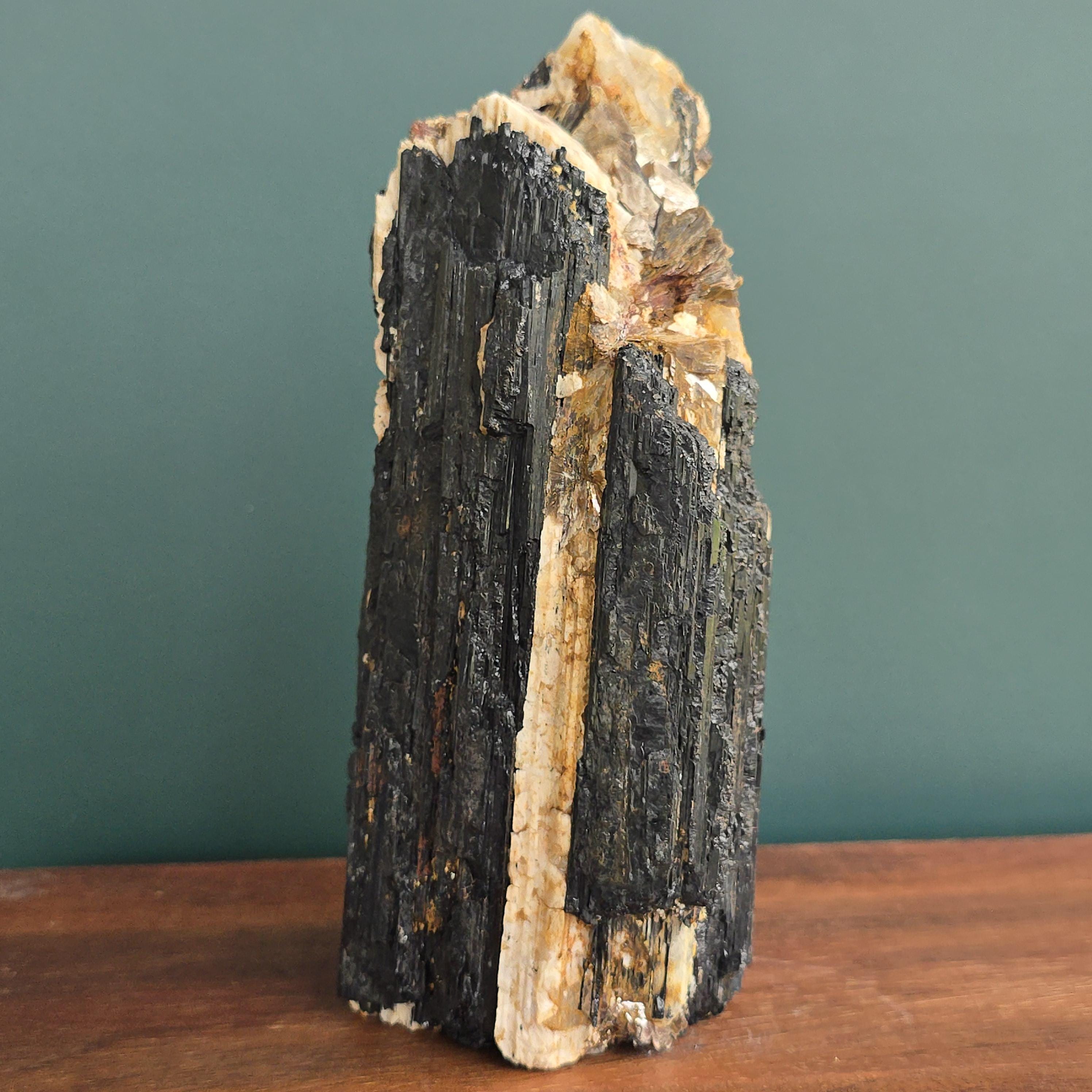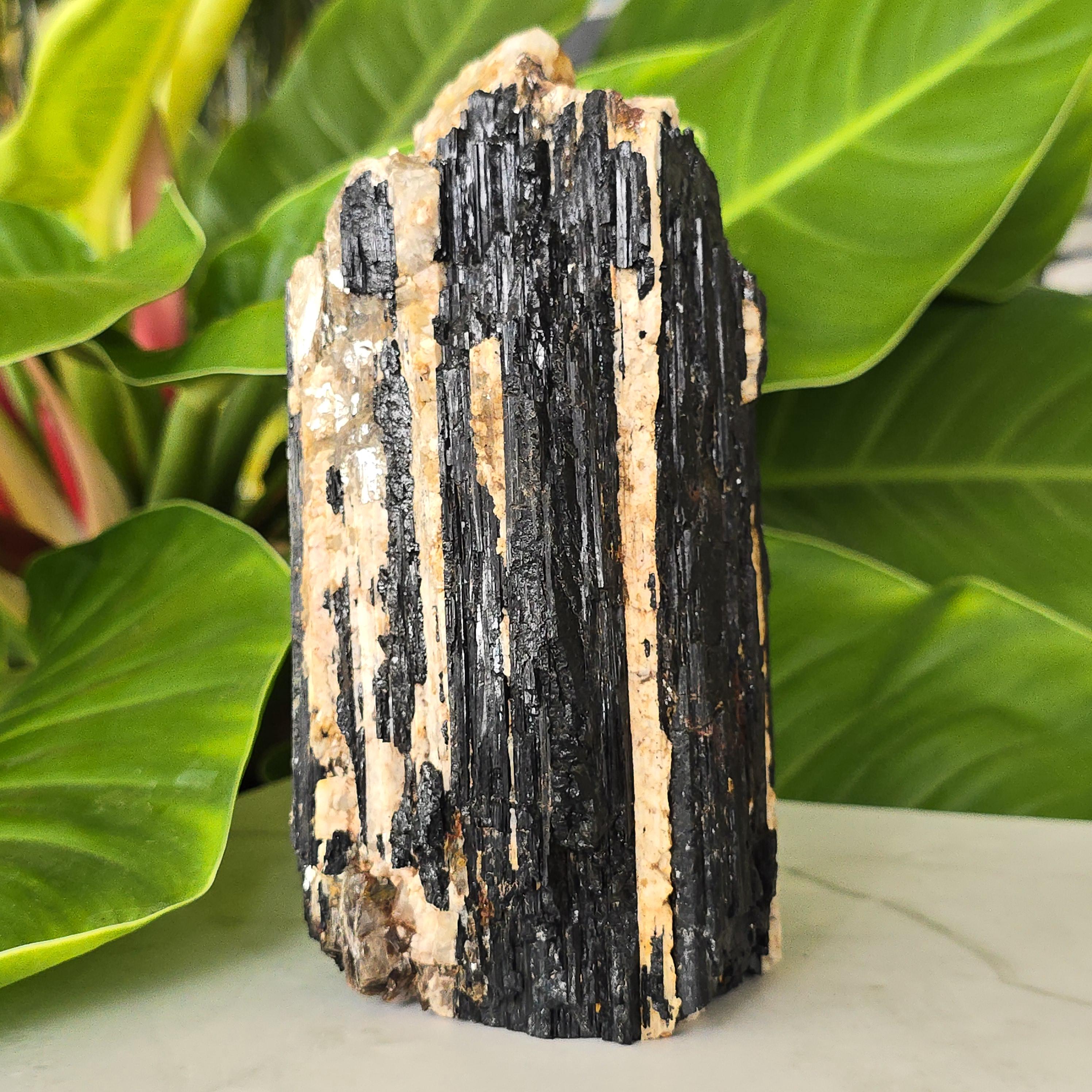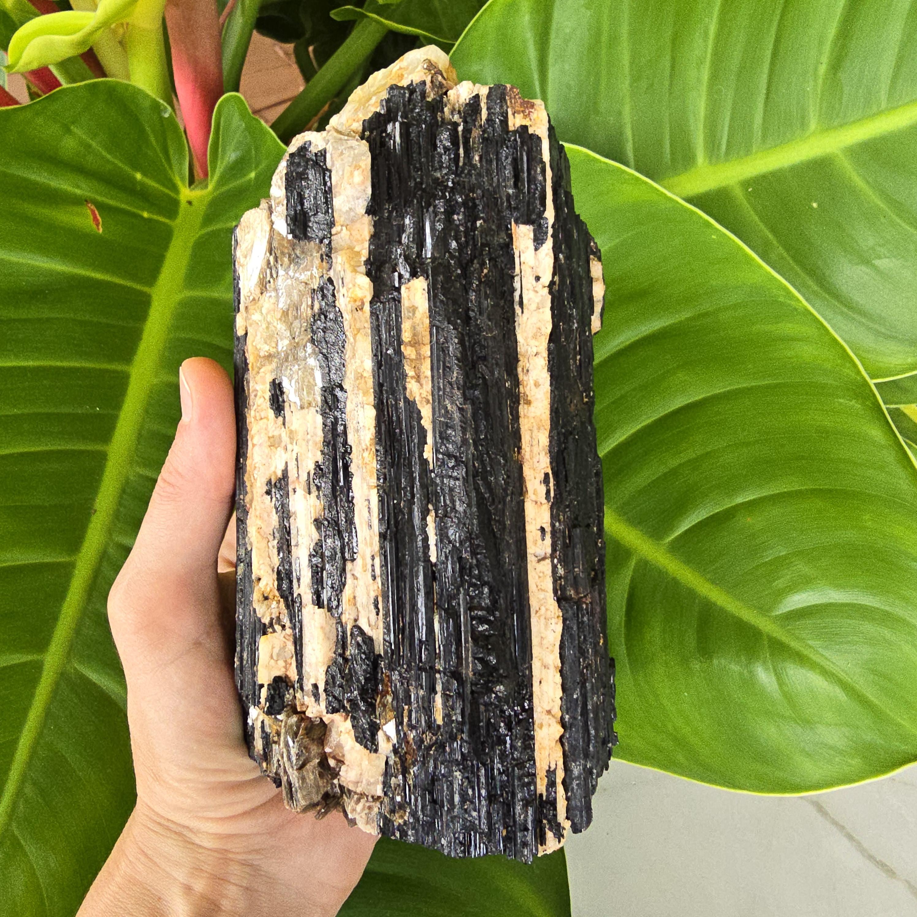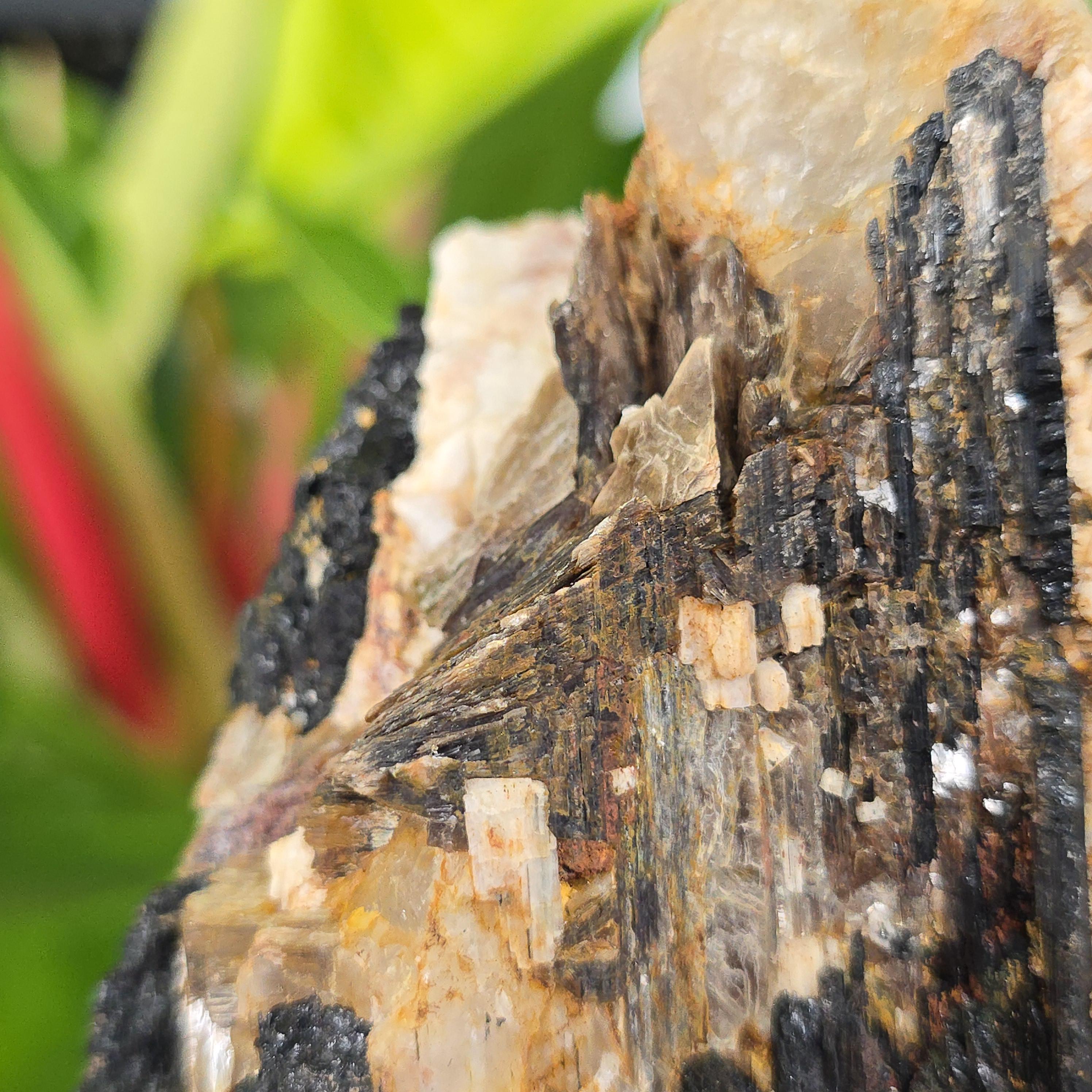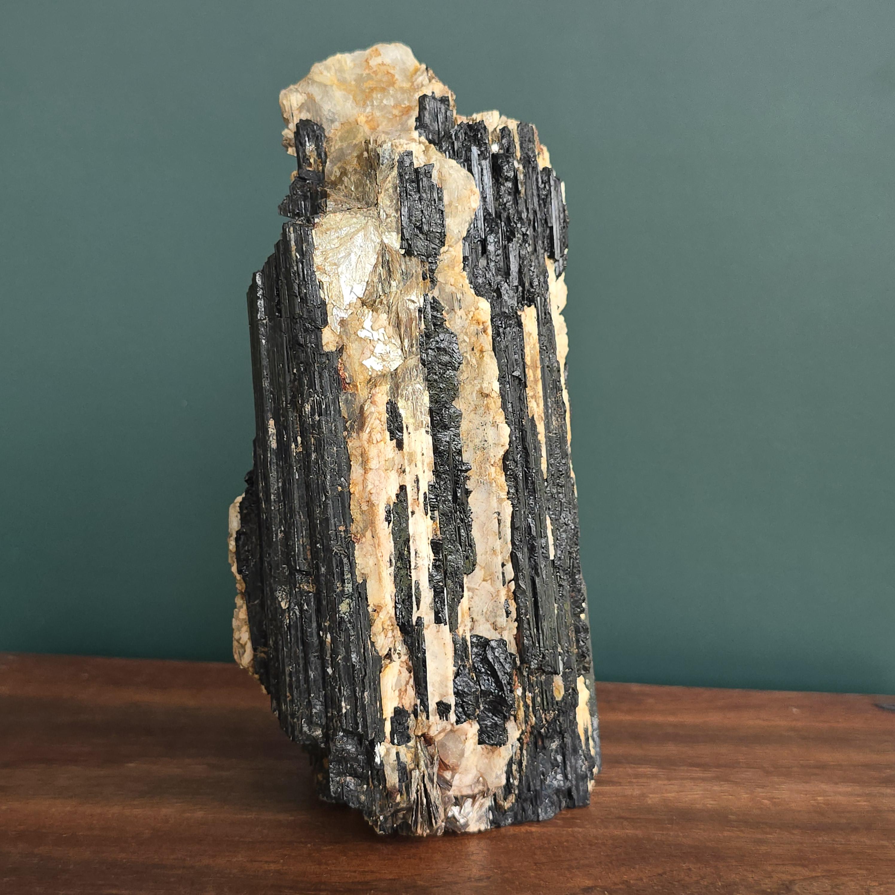 Black tourmaline is a natural mineral widely used for its strong protective and grounding properties. Many associate it with shielding against negative energy, EMF, and promoting stability and emotional balance. The combination of black tourmaline with quartz and mica creates a powerful energetic piece. This sizable raw specimen is perfect for display on a shelf, altar, meditation space, or as a statement home decor piece, It's on a cut base for easy display. Each specimen is natural and unique, with variations in black tourmaline crystal formation, quartz clarity, golden mica sparkle, and white barite inclusions.