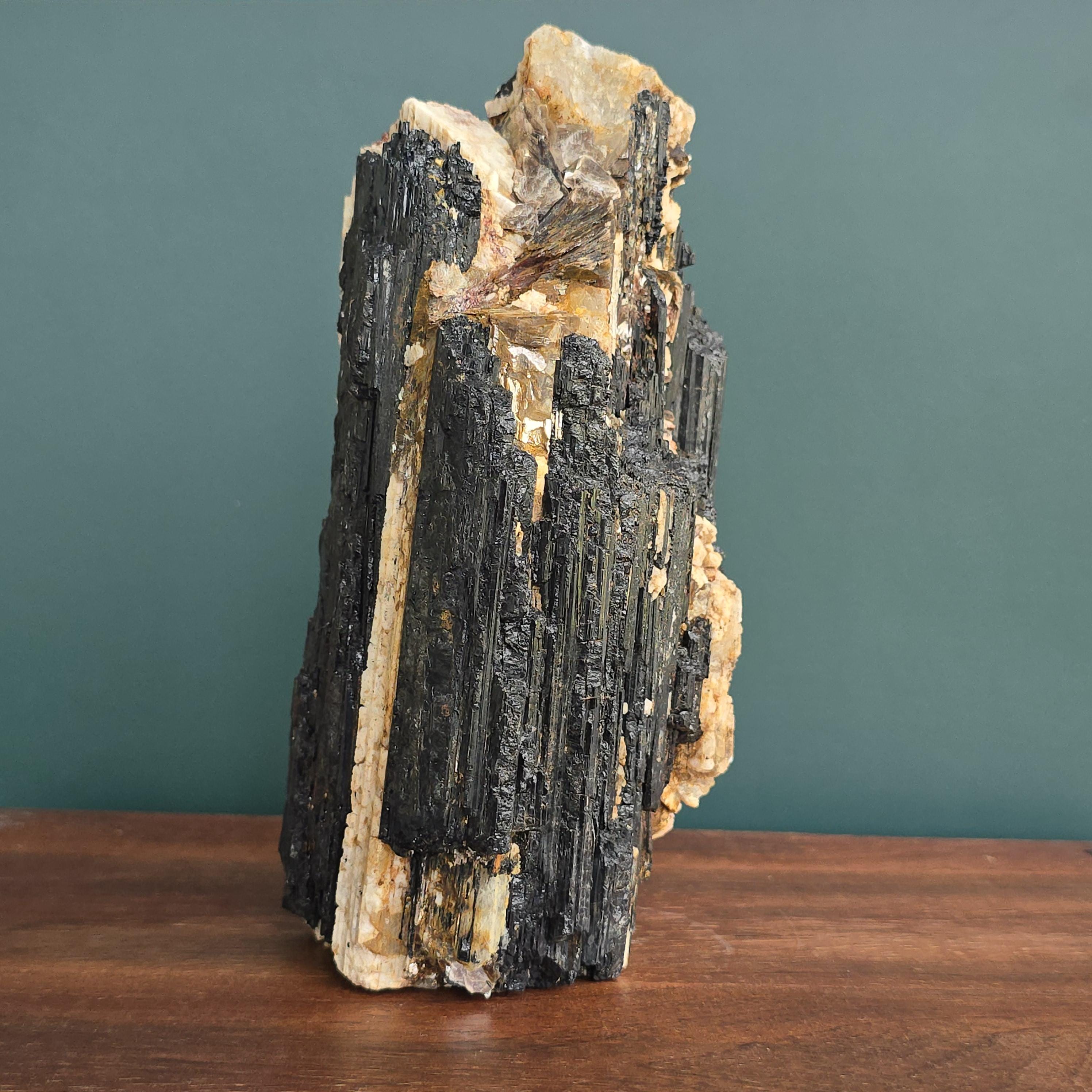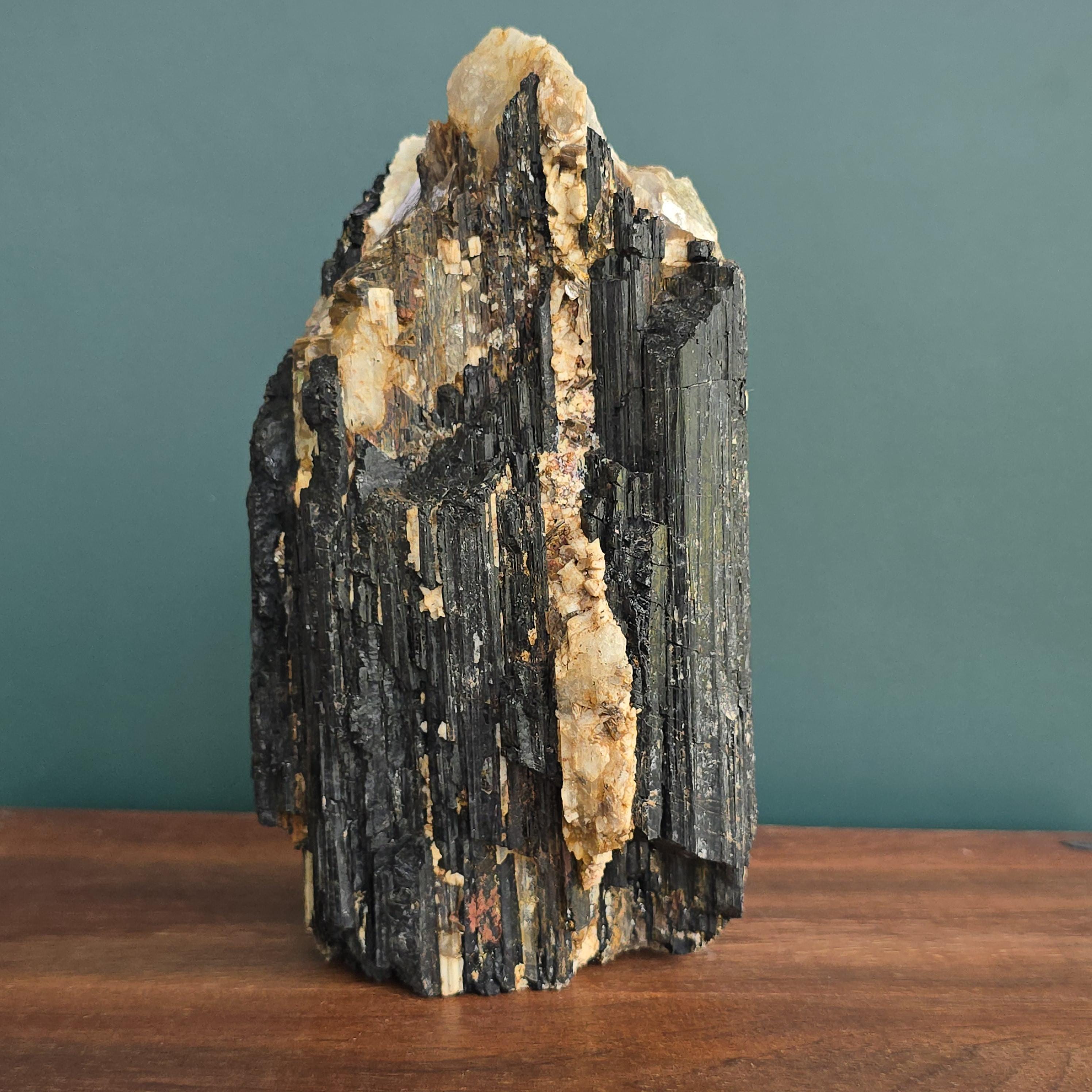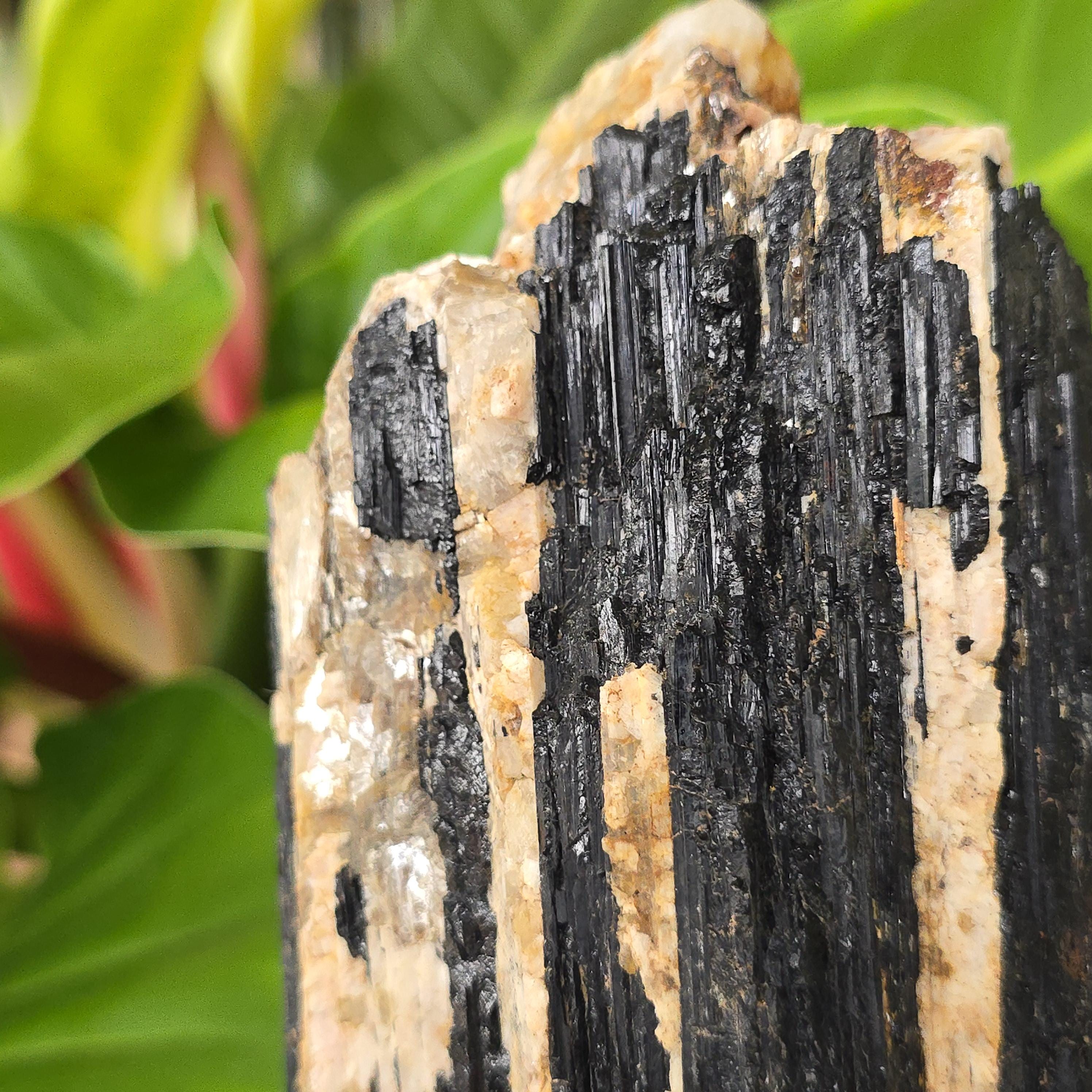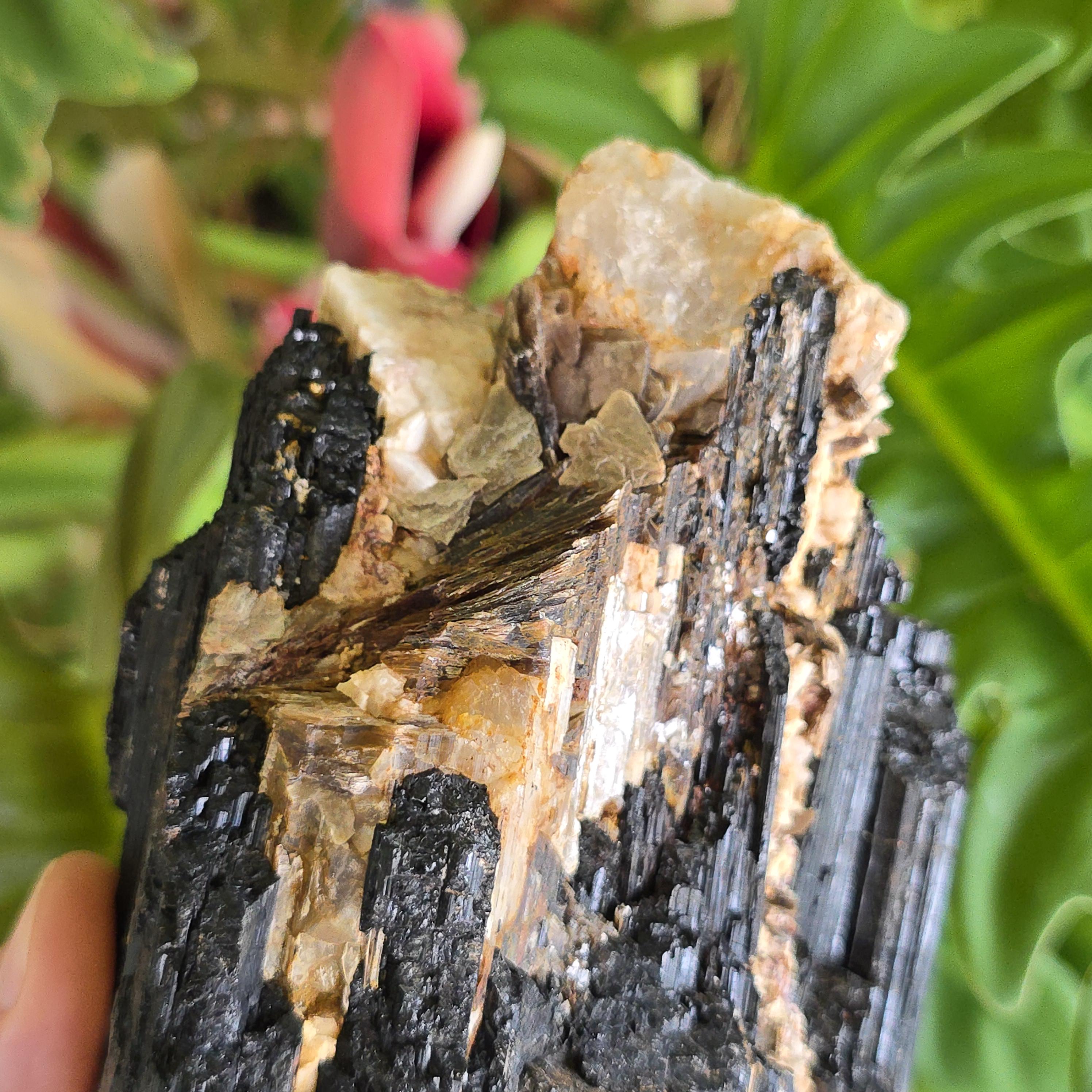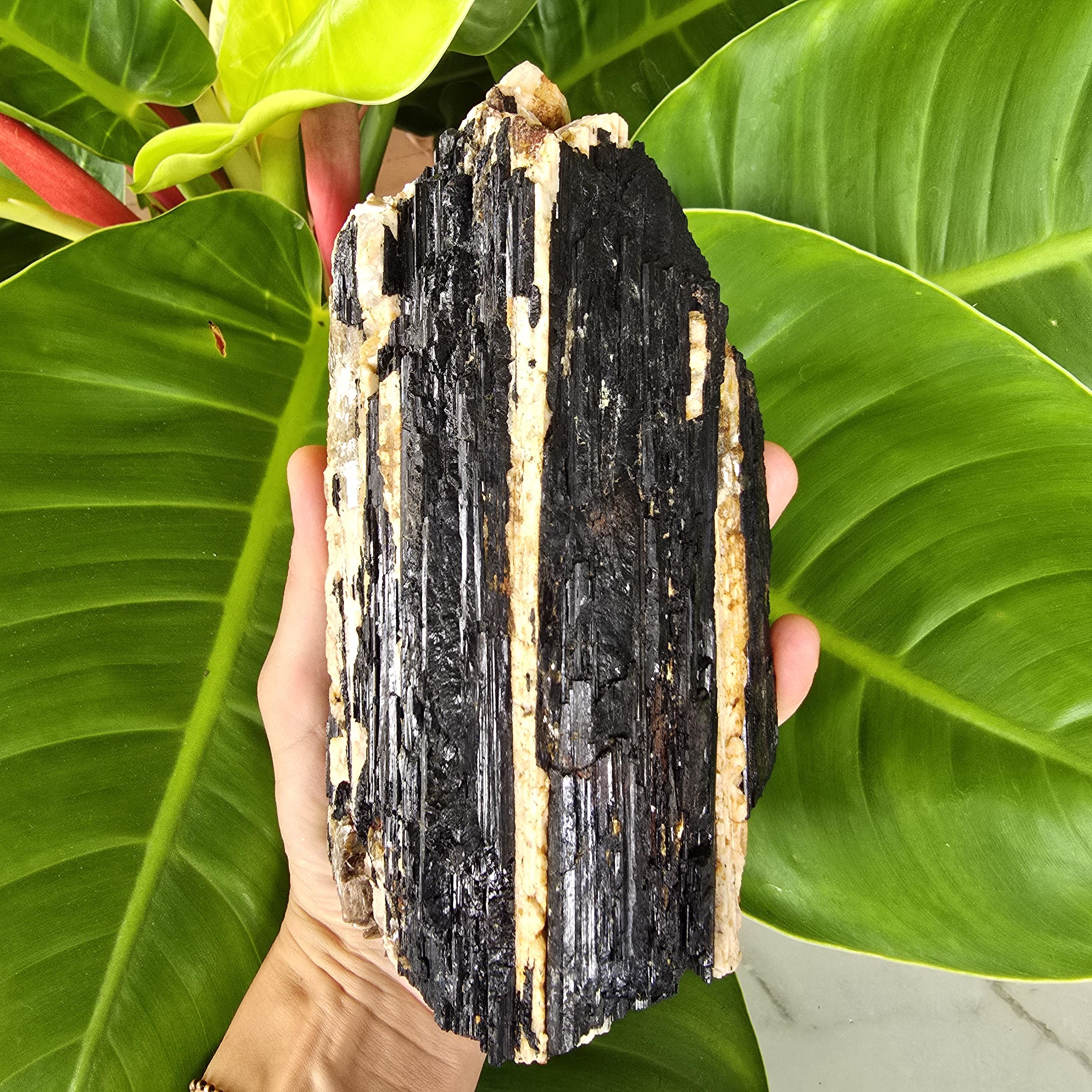 Black tourmaline is a natural mineral widely used for its strong protective and grounding properties. Many associate it with shielding against negative energy, EMF, and promoting stability and emotional balance. The combination of black tourmaline with quartz and mica creates a powerful energetic piece. This sizable raw specimen is perfect for display on a shelf, altar, meditation space, or as a statement home decor piece, It's on a cut base for easy display. Each specimen is natural and unique, with variations in black tourmaline crystal formation, quartz clarity, golden mica sparkle, and white barite inclusions.