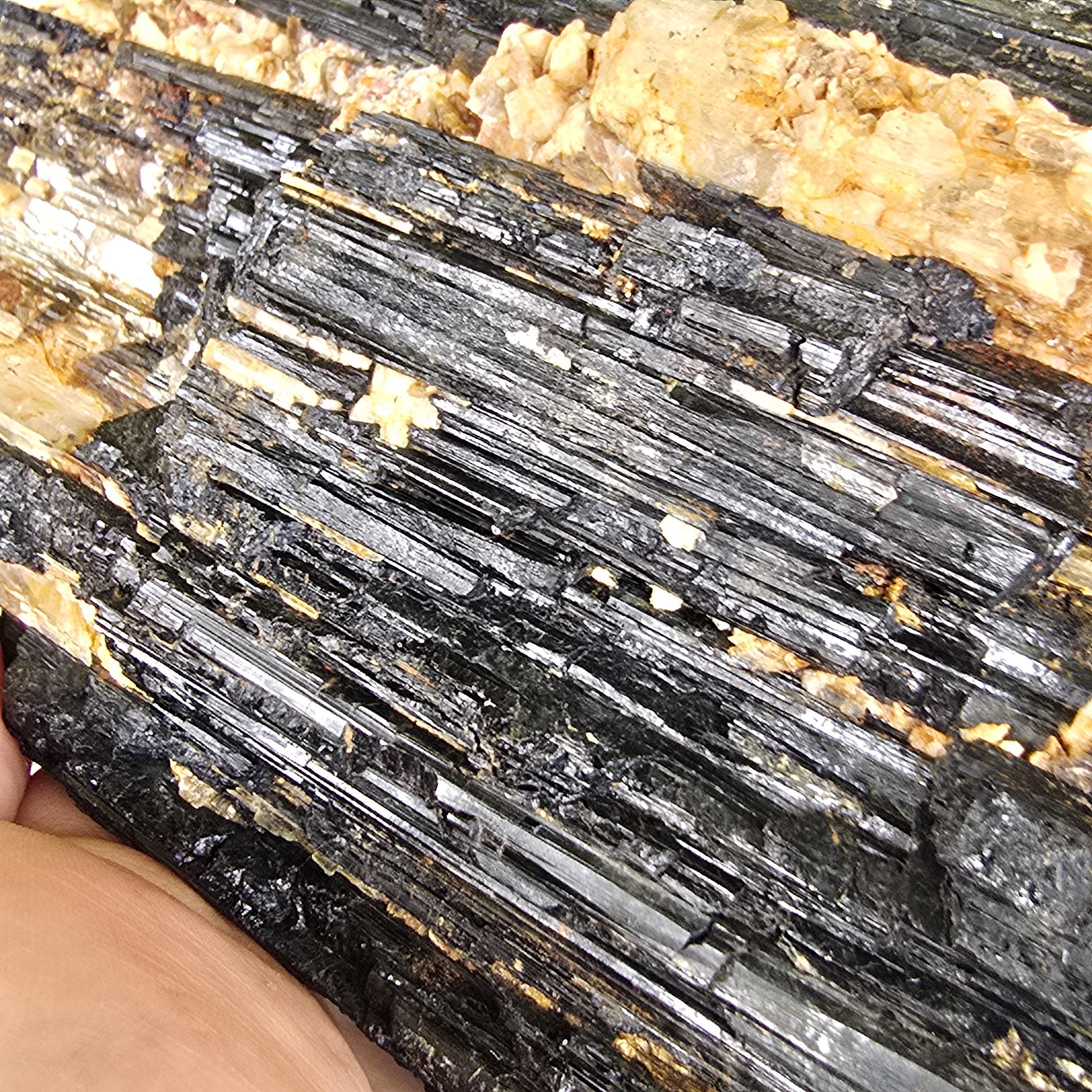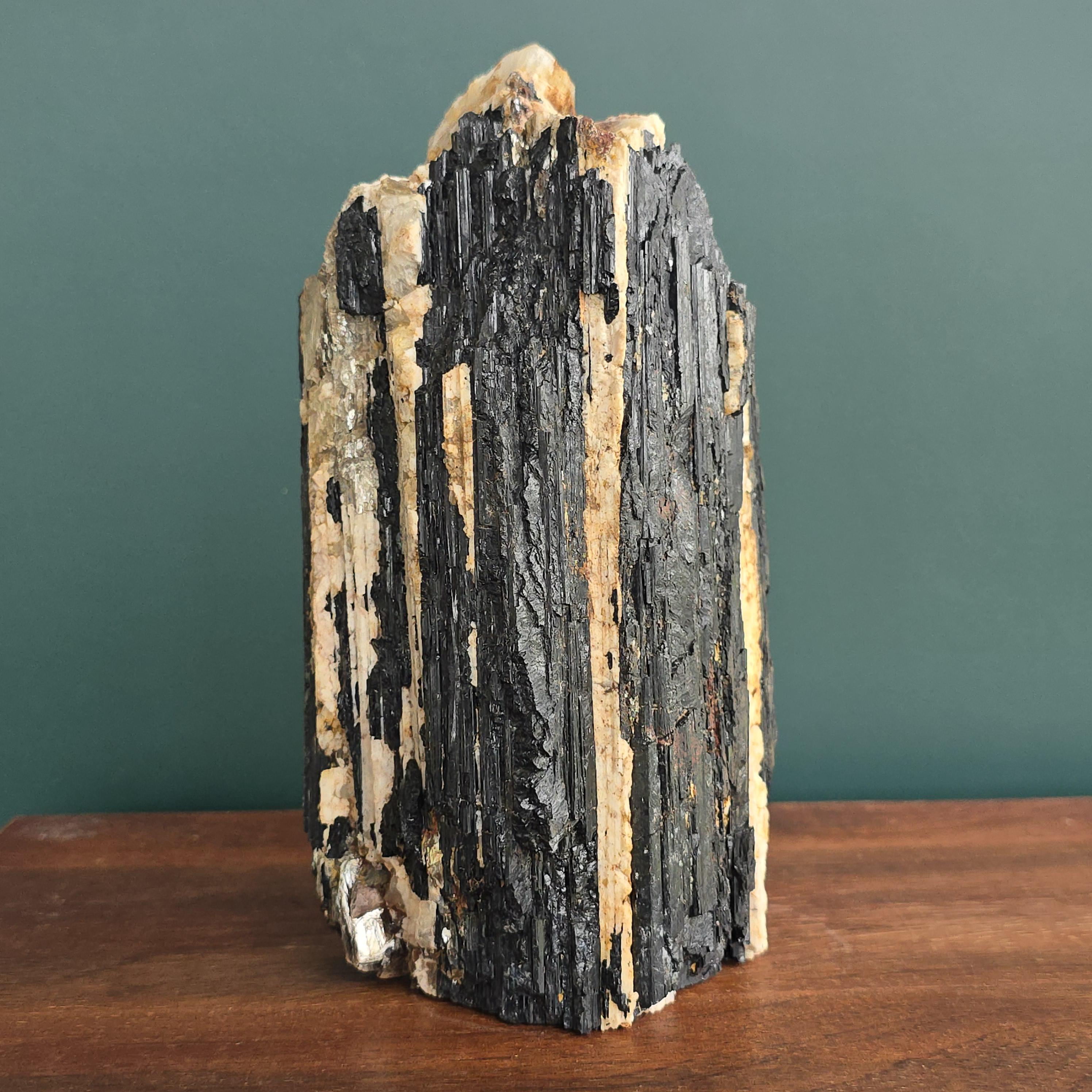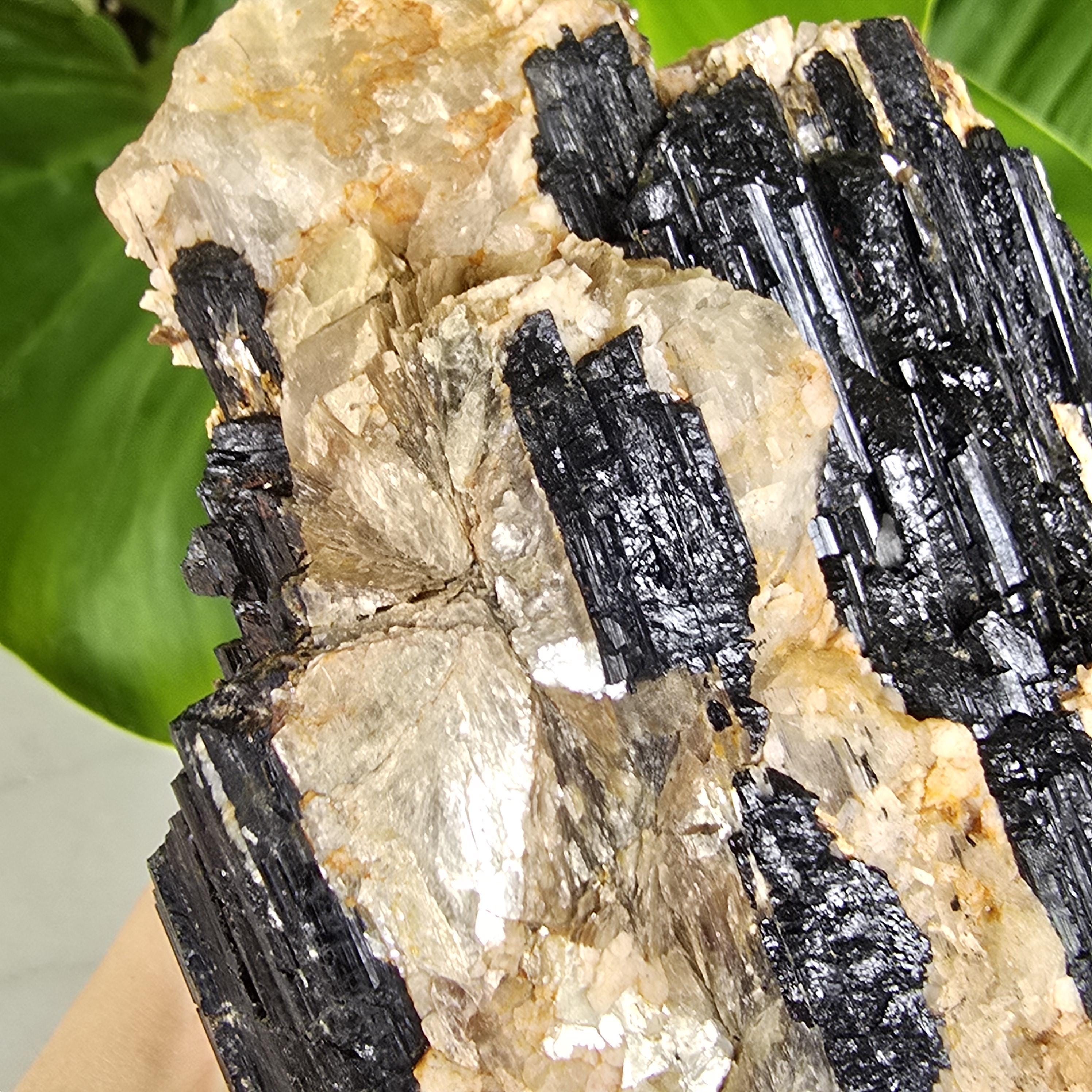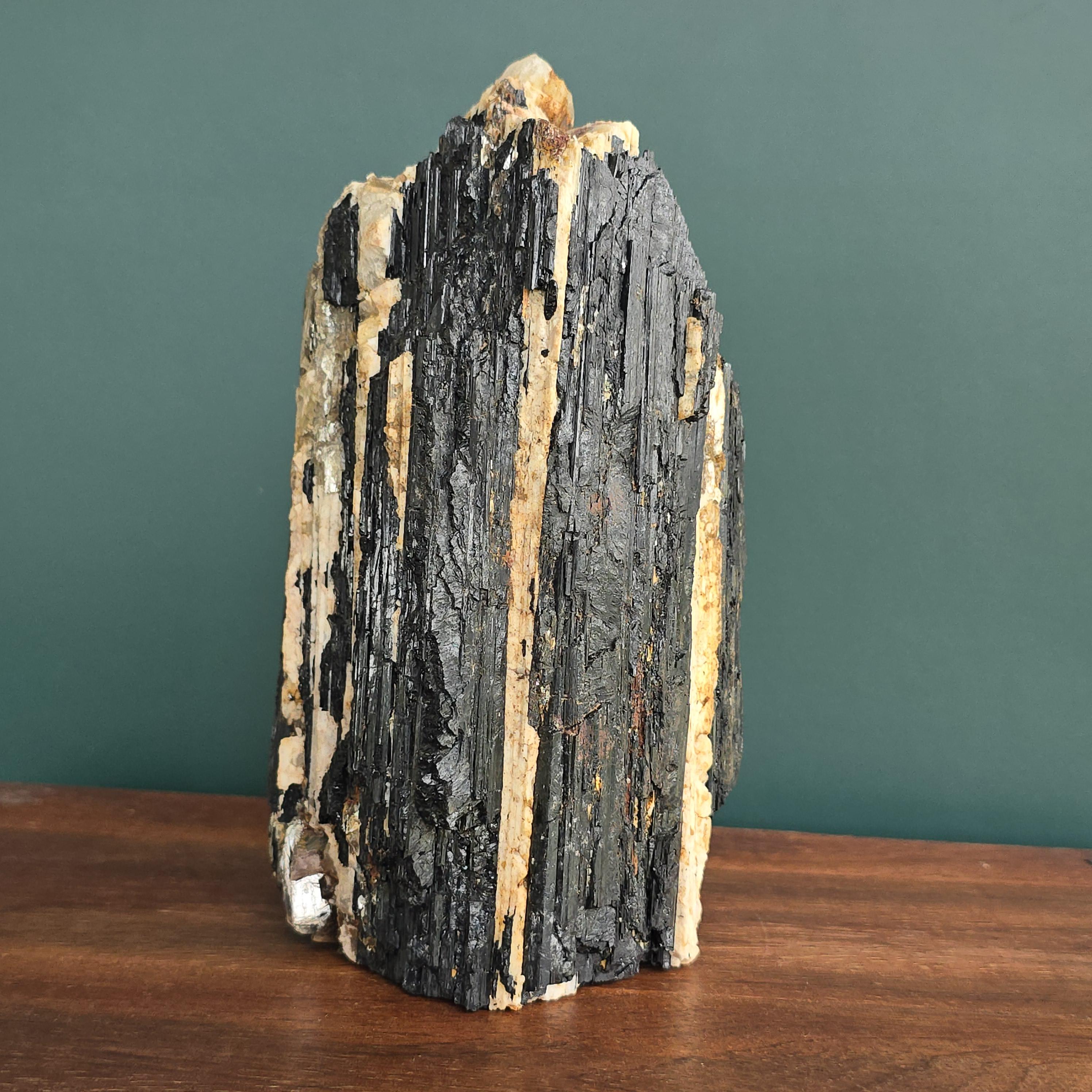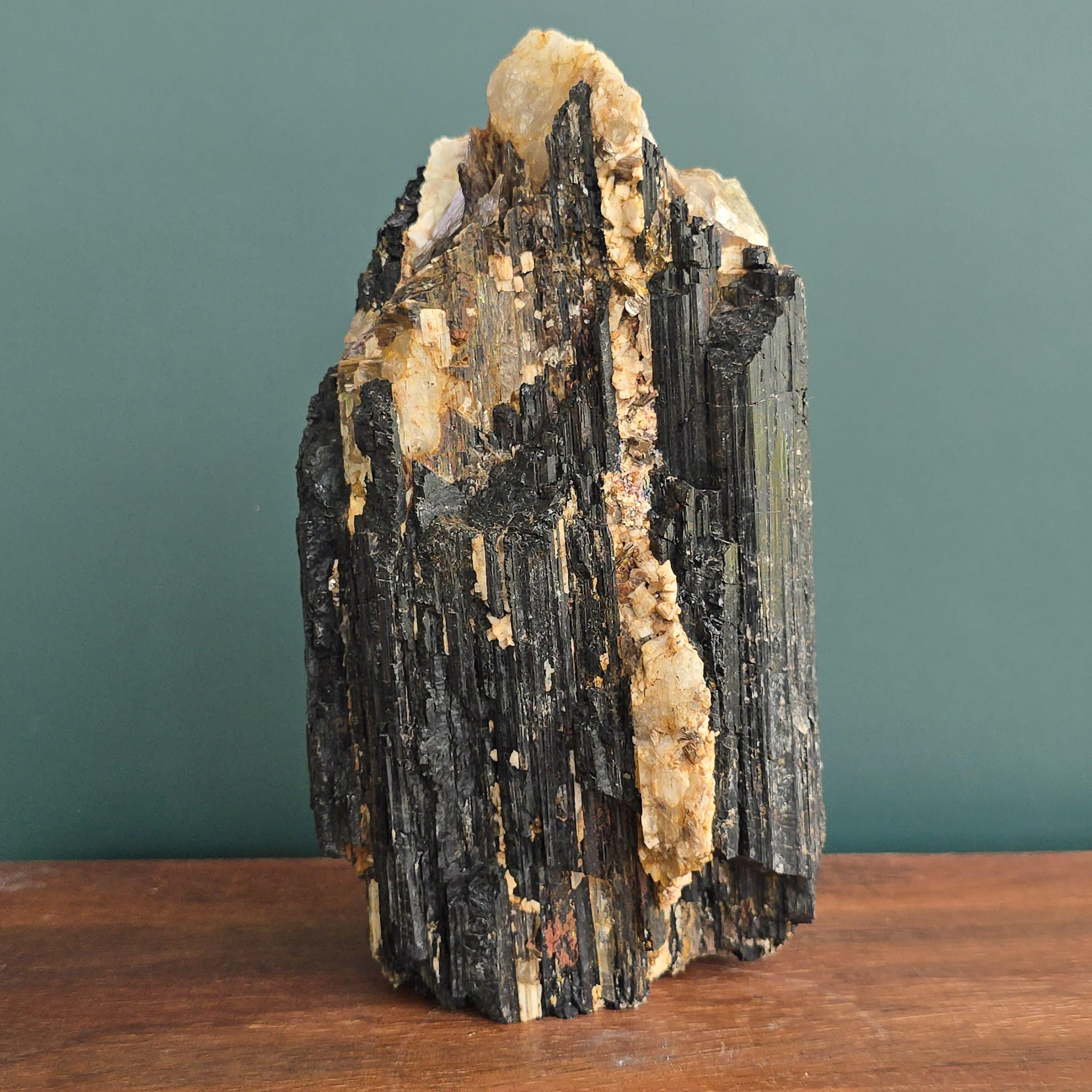 Black tourmaline is a natural mineral widely used for its strong protective and grounding properties. Many associate it with shielding against negative energy, EMF, and promoting stability and emotional balance. The combination of black tourmaline with quartz and mica creates a powerful energetic piece. This sizable raw specimen is perfect for display on a shelf, altar, meditation space, or as a statement home decor piece, It's on a cut base for easy display. Each specimen is natural and unique, with variations in black tourmaline crystal formation, quartz clarity, golden mica sparkle, and white barite inclusions.