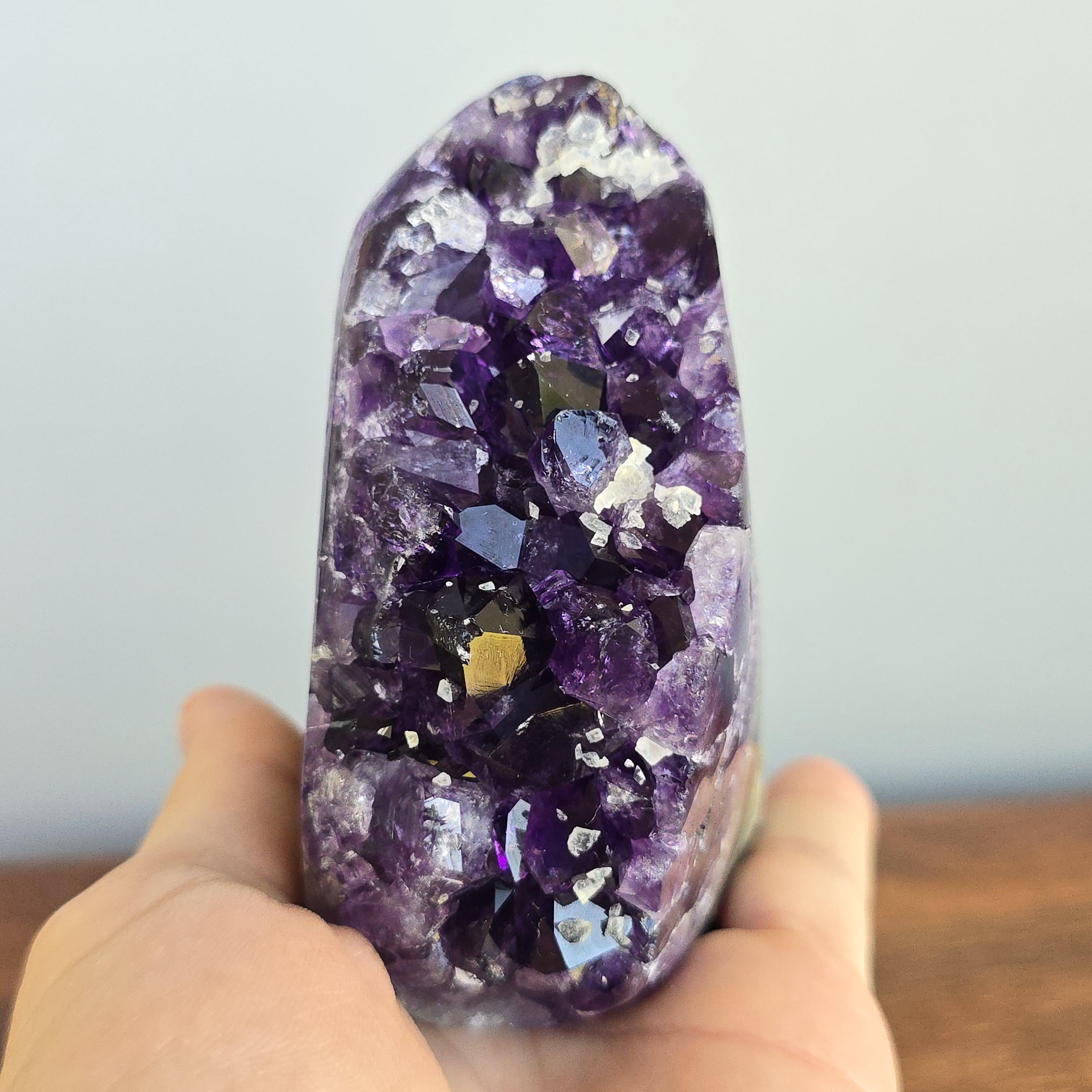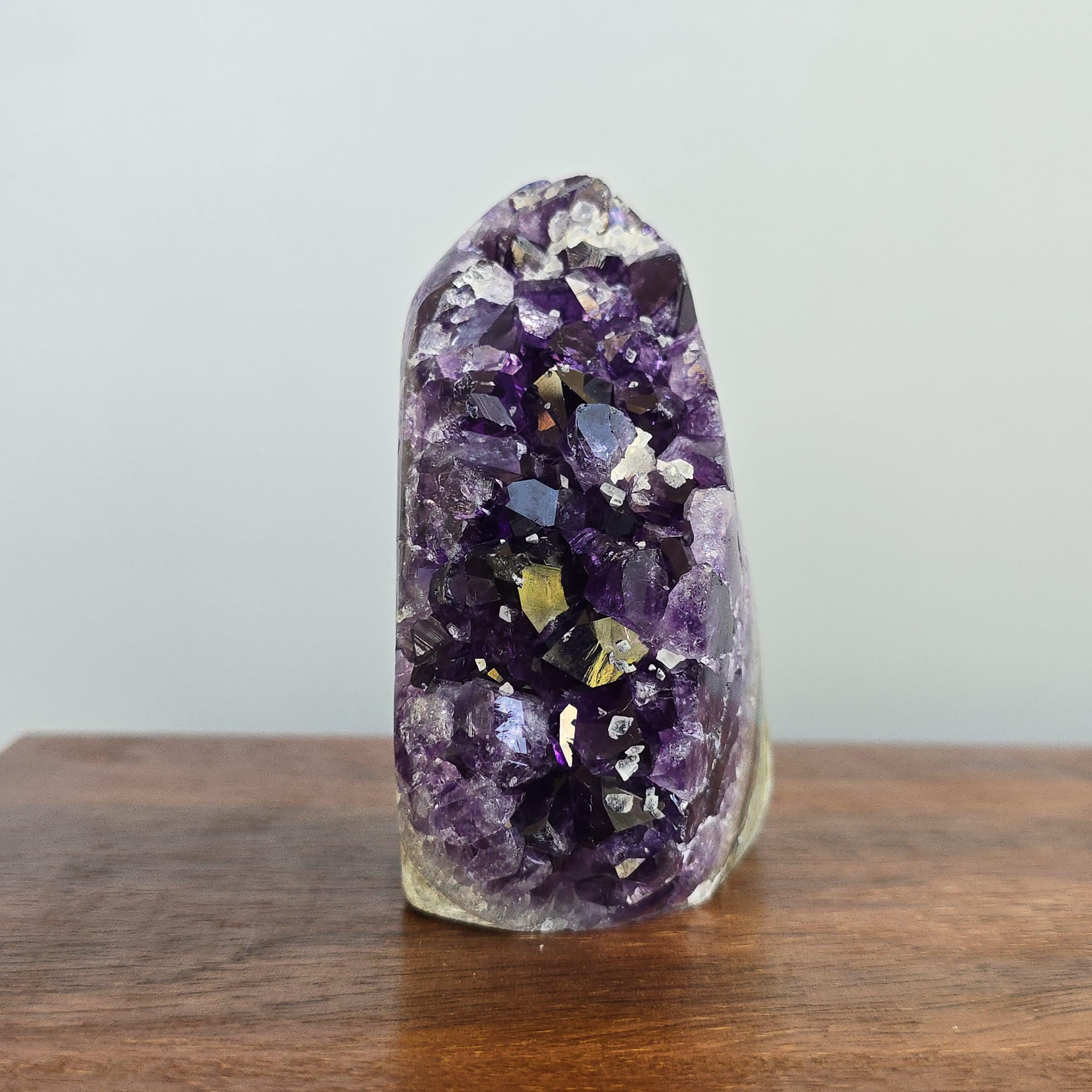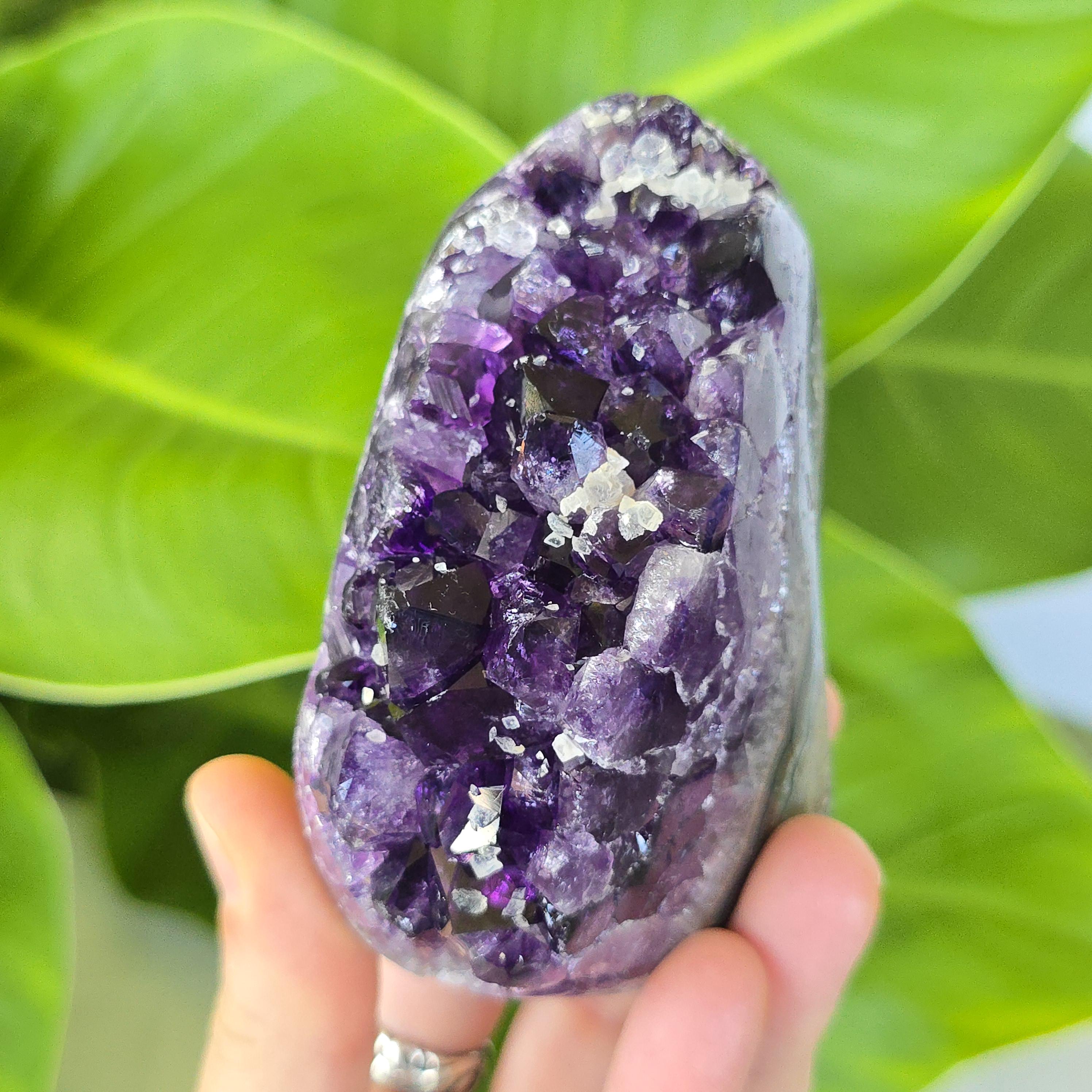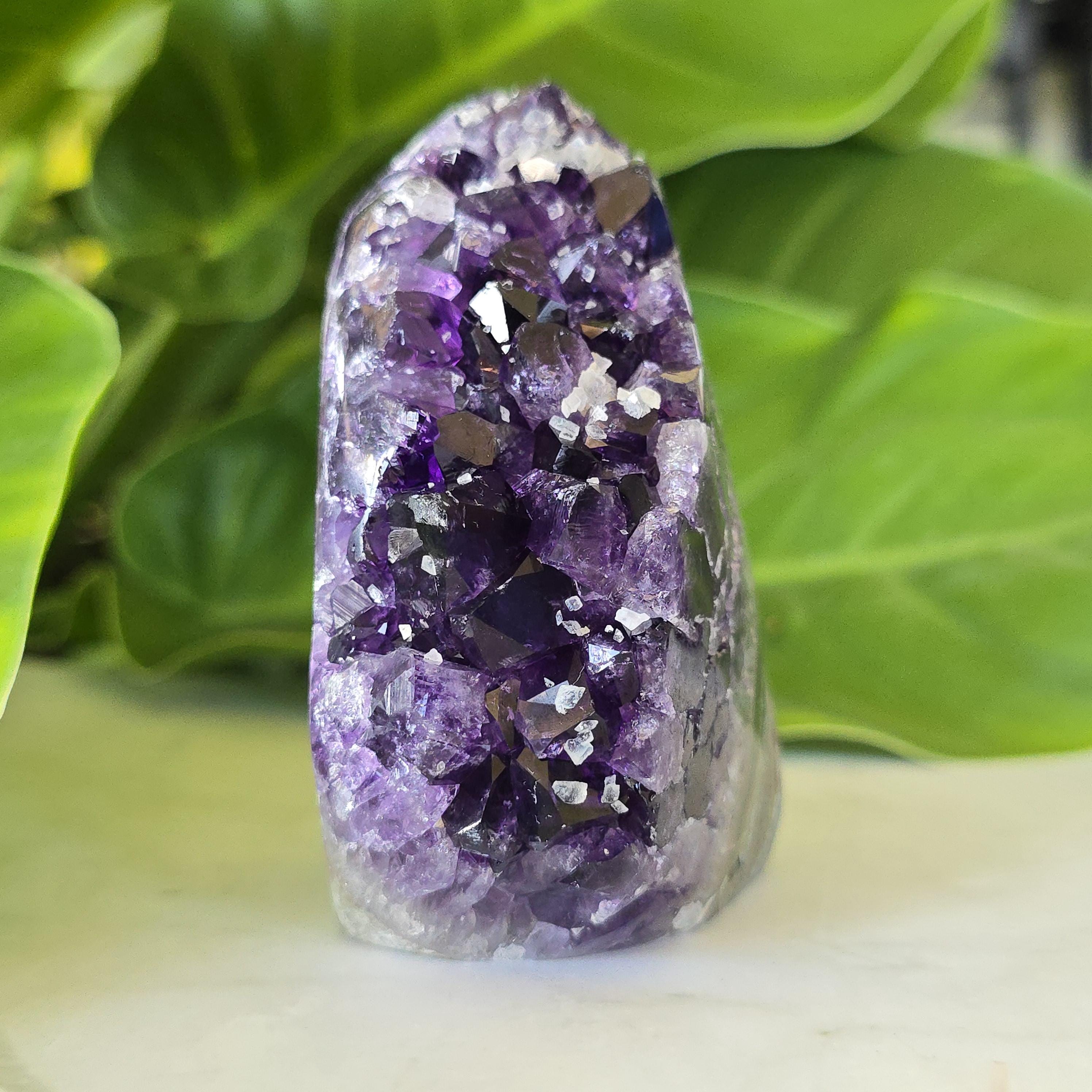 Amethyst is a natural purple quartz crystal known for its calming and protective properties. Many associate it with promoting relaxation, reducing stress and anxiety, supporting clarity of thought, and aiding meditation or spiritual work. This raw amethyst cluster features a cut base so it stands on its own. It is suitable for display, energy work, altars, or as home decor. Each cluster is natural and unique, with variations in shape, crystal formation, color depth, and size.