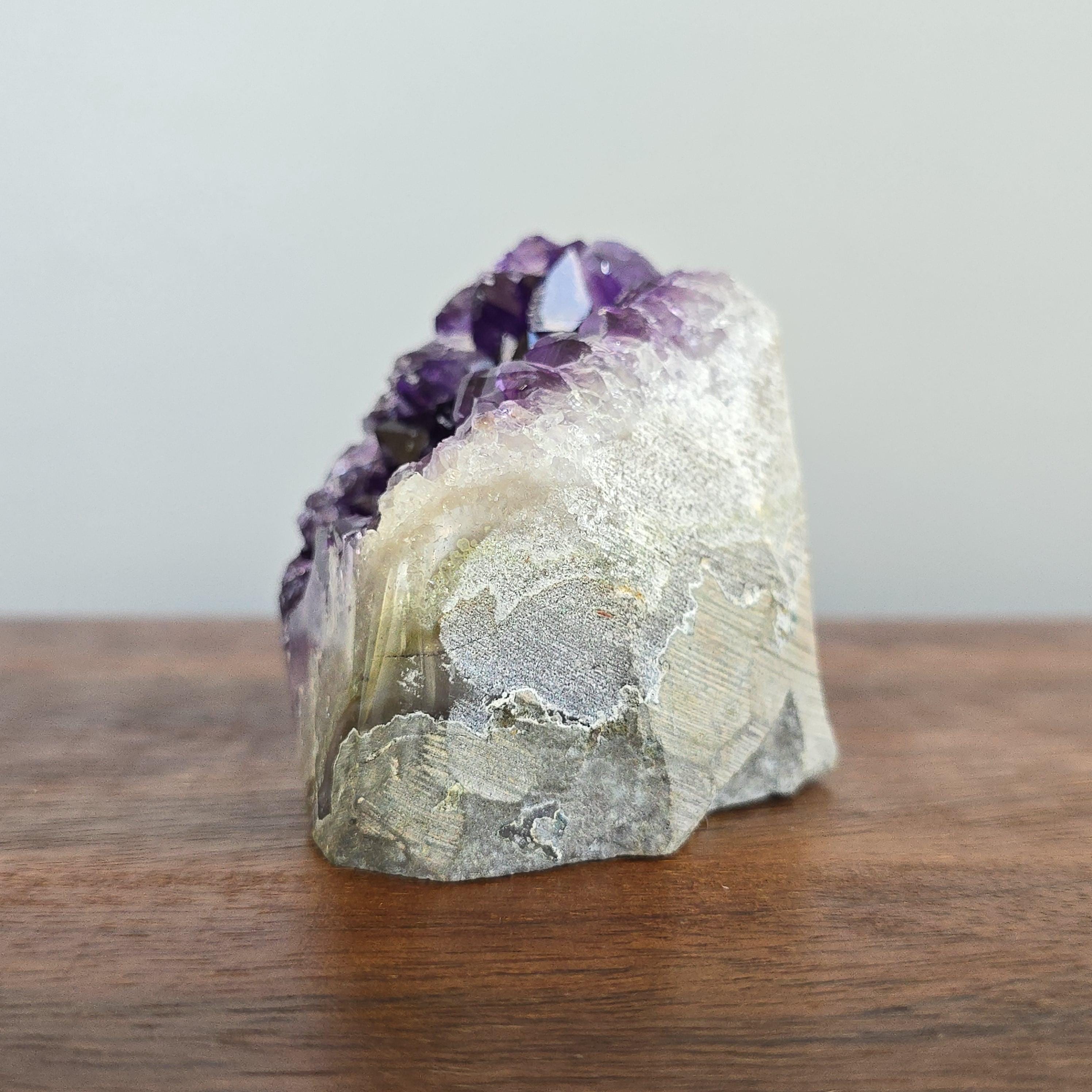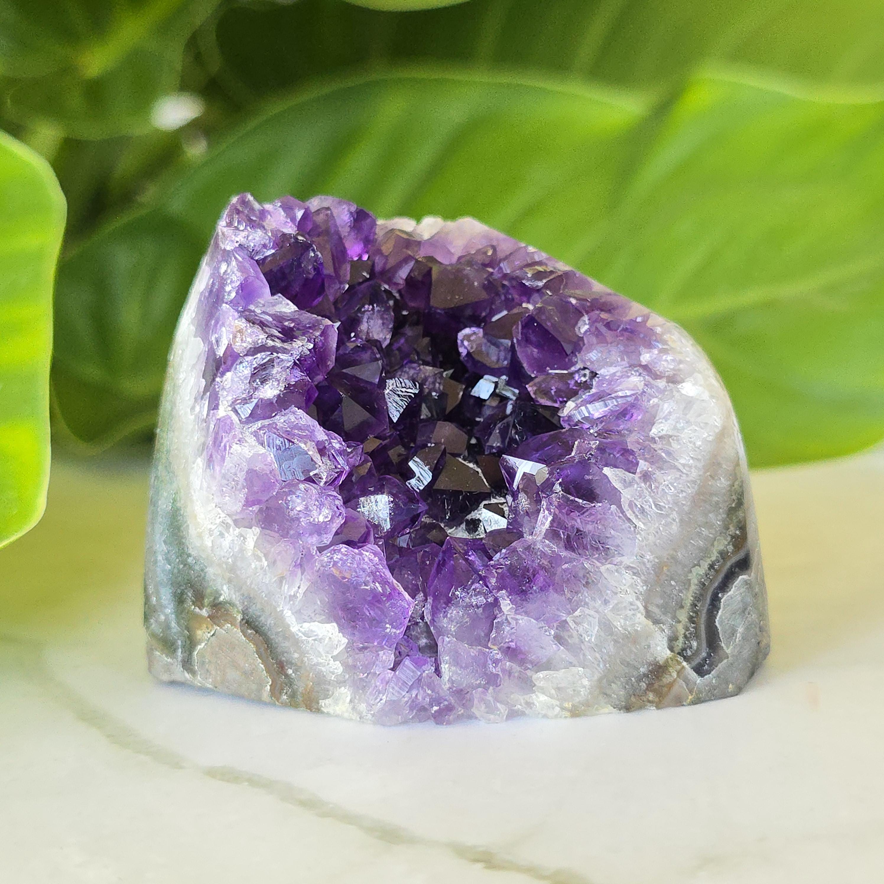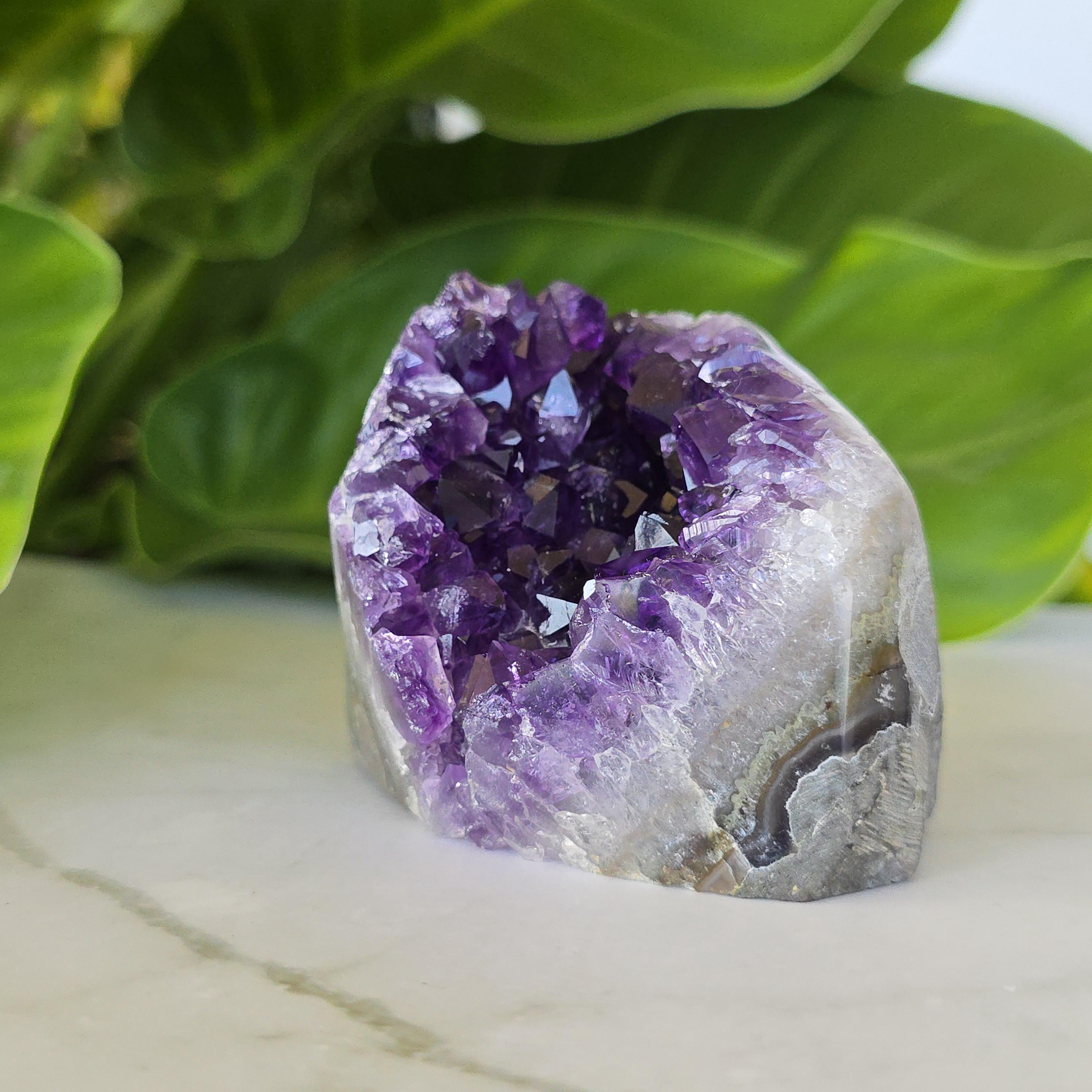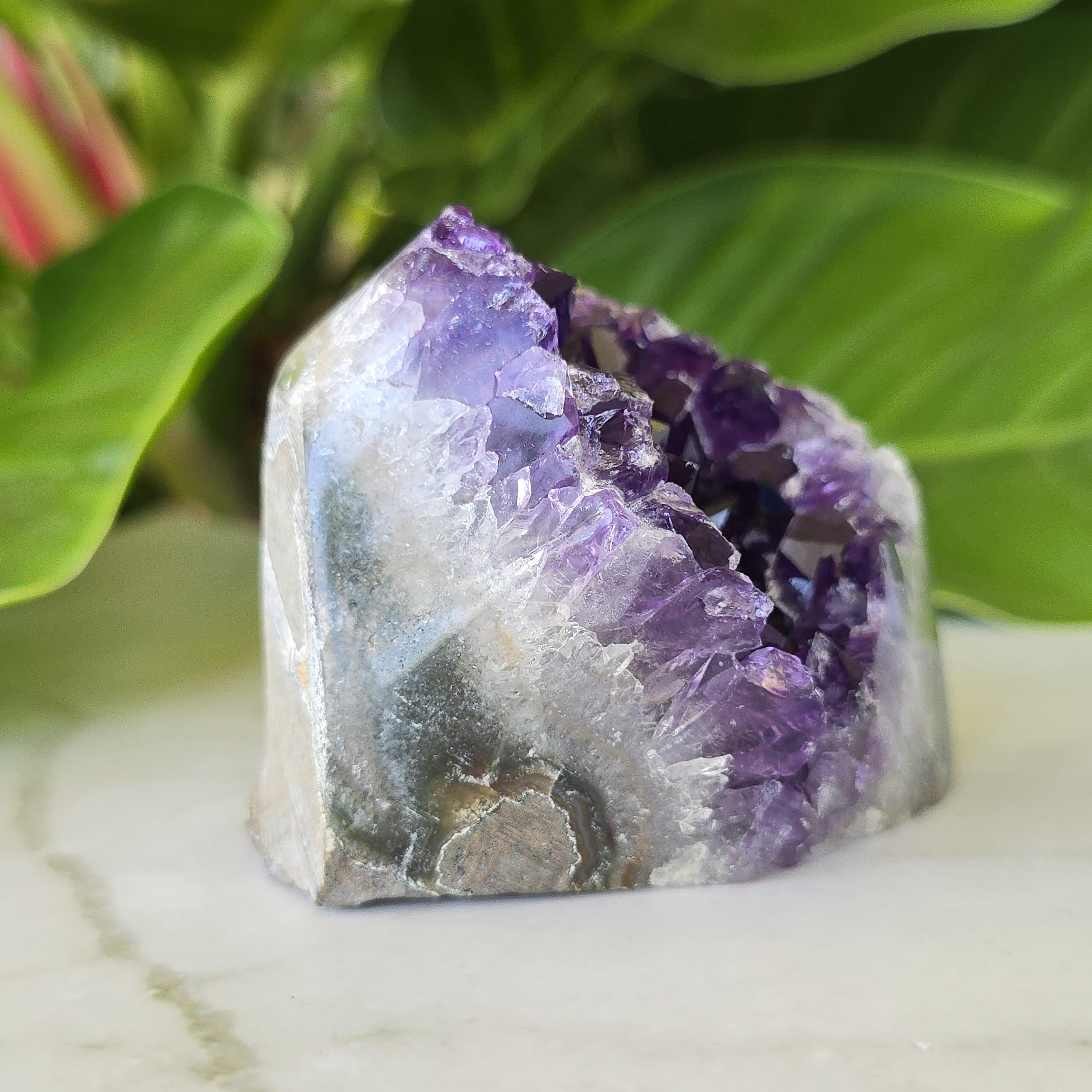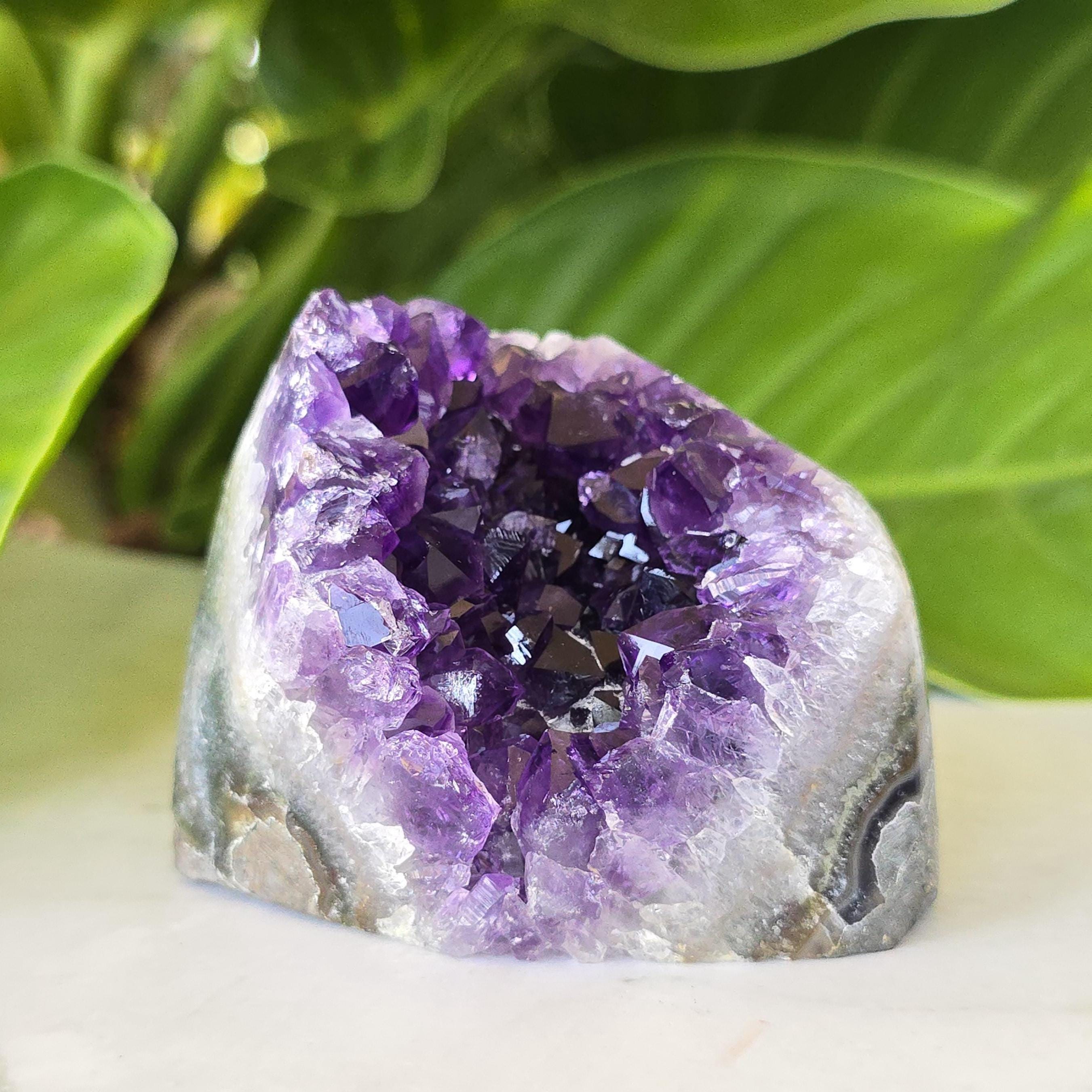 Amethyst is a natural purple quartz crystal known for its calming and protective properties. Many associate it with promoting relaxation, reducing stress and anxiety, supporting clarity of thought, and aiding meditation or spiritual work. This raw amethyst cluster features a cut base so it stands on its own. It is suitable for display, energy work, altars, or as home decor. Each cluster is natural and unique, with variations in shape, crystal formation, color depth, and size.