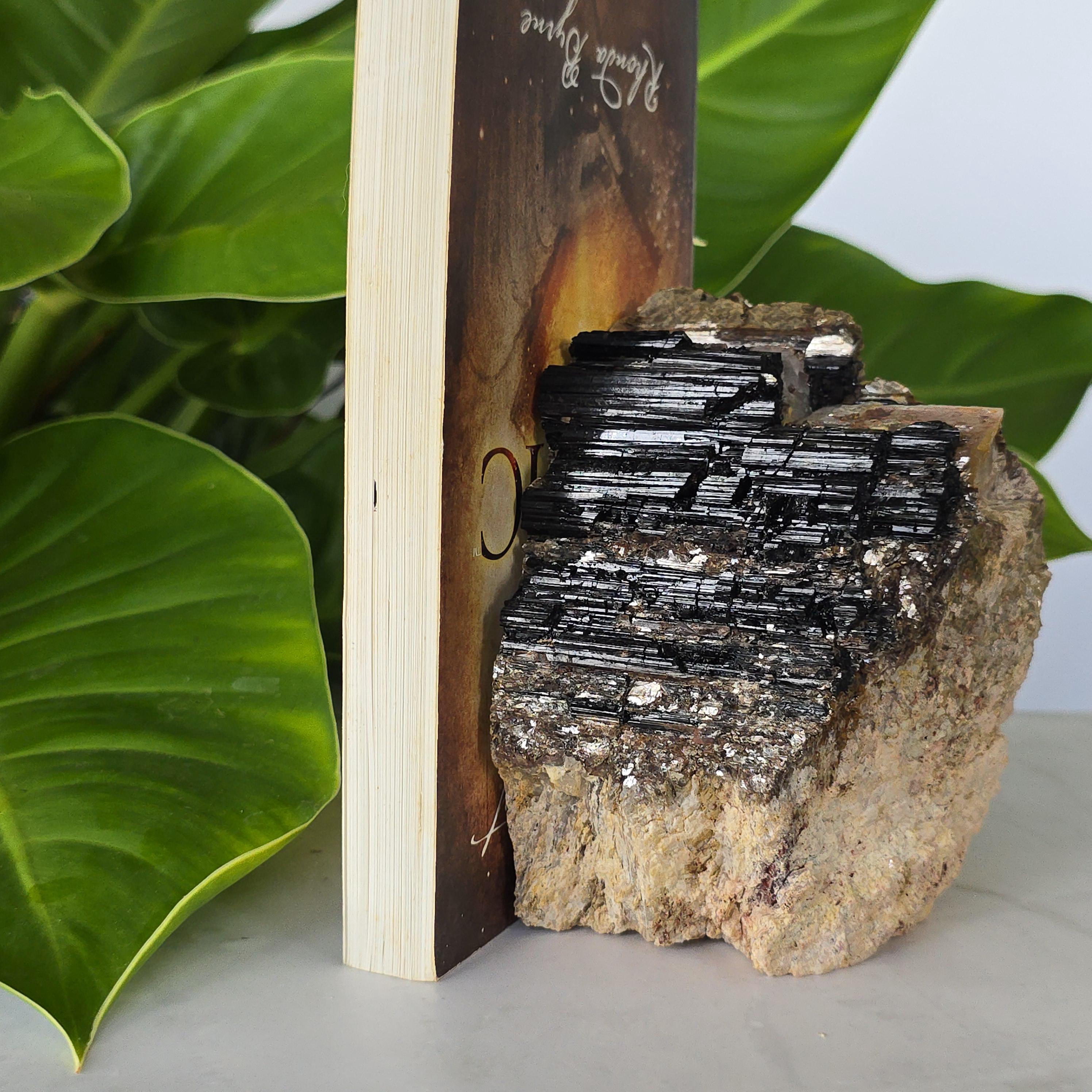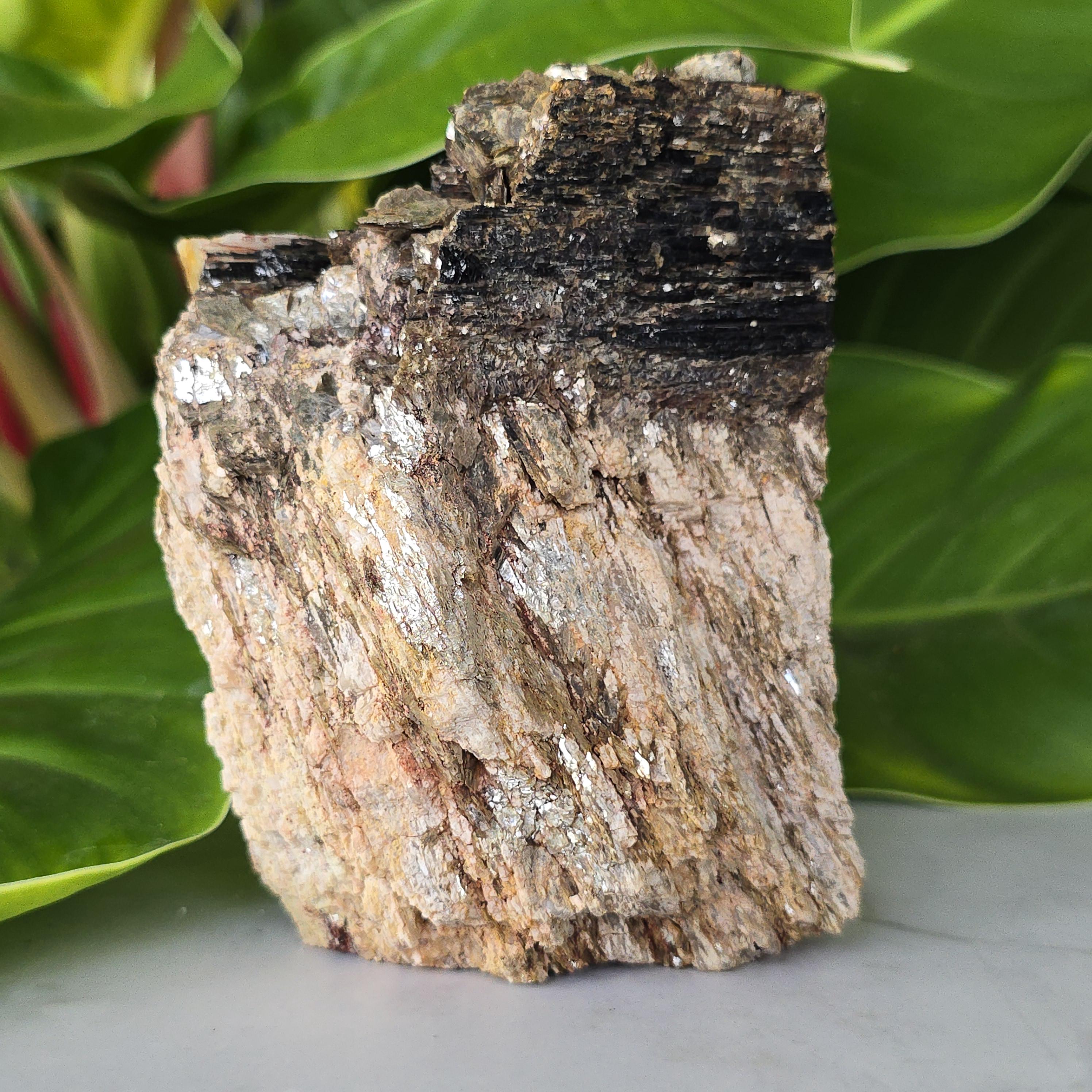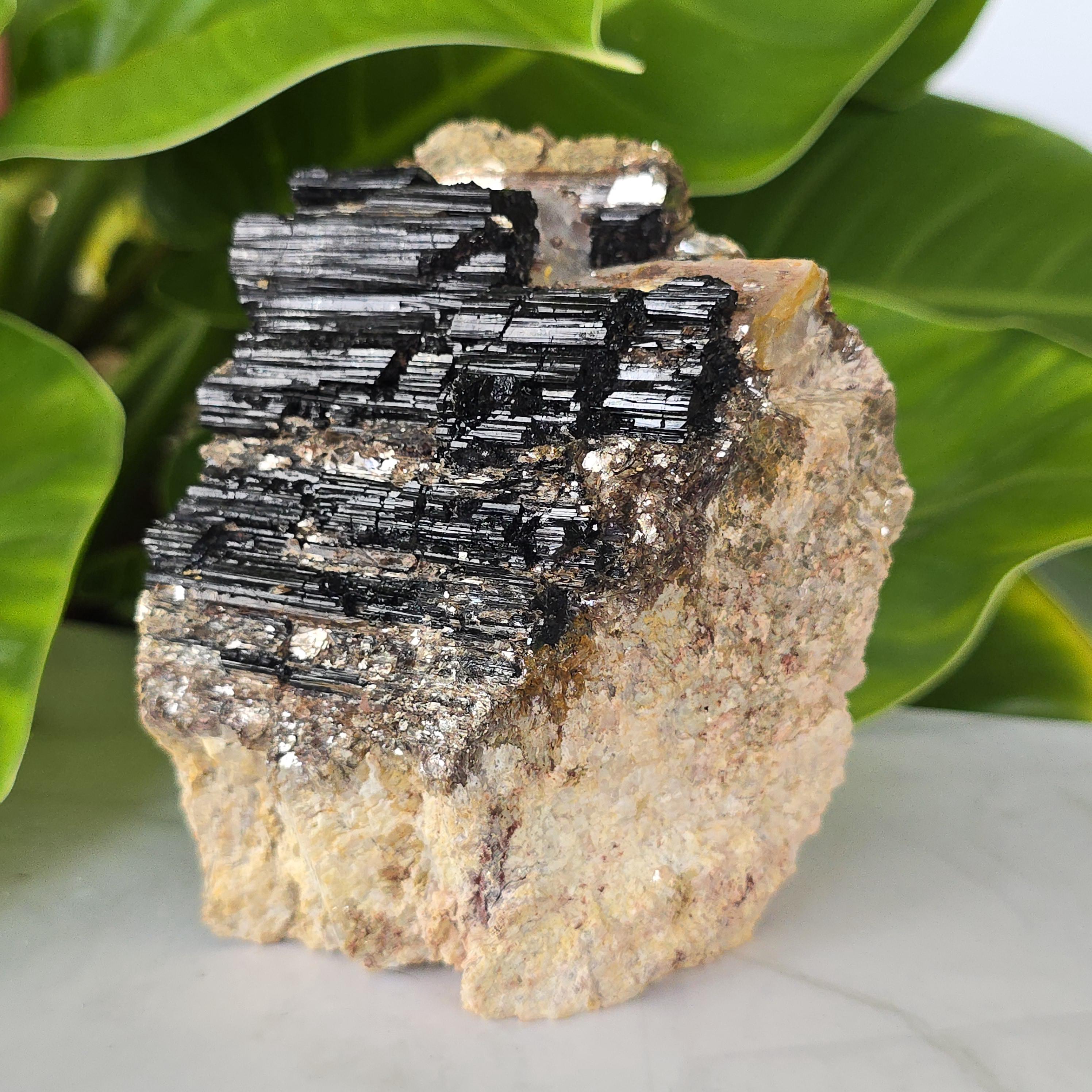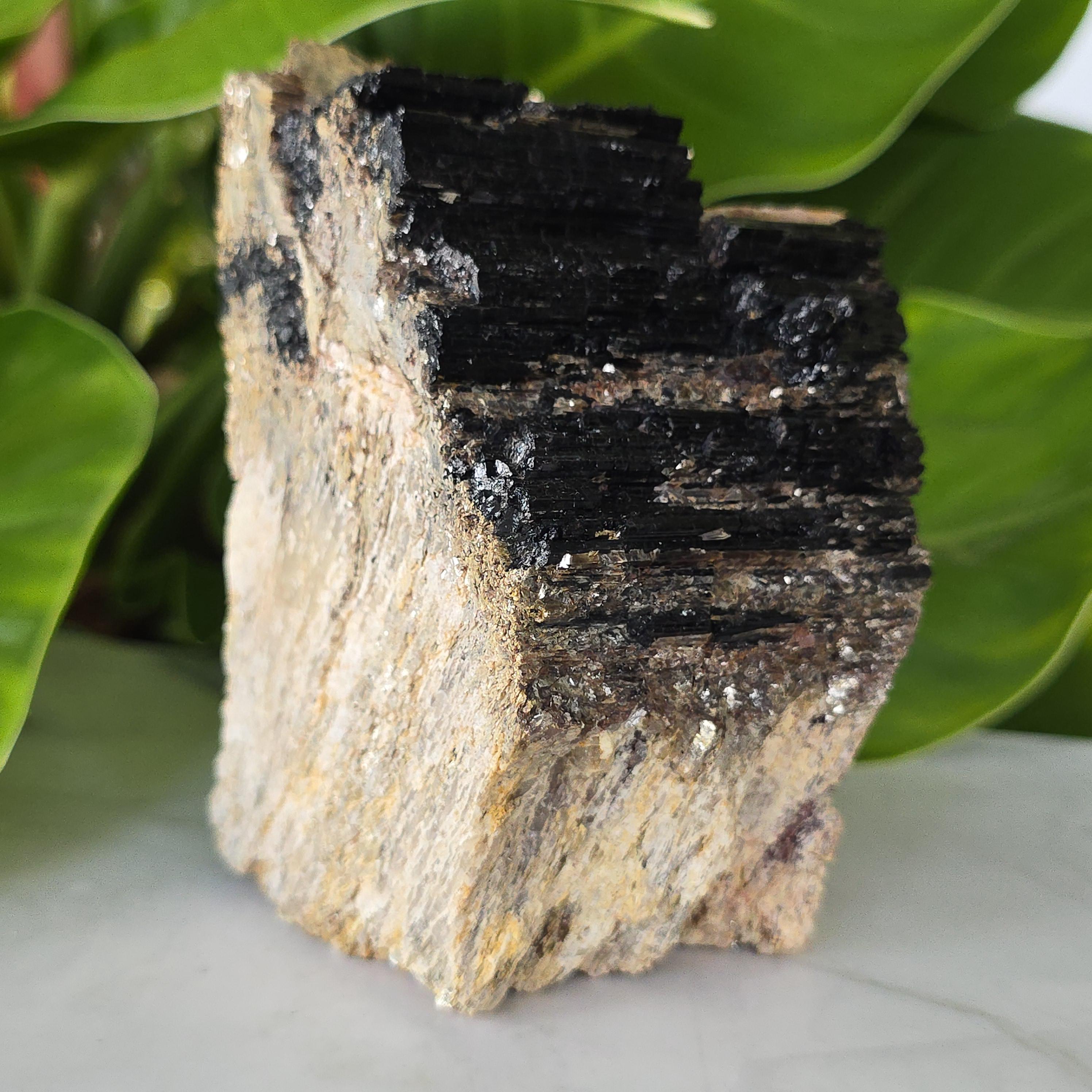 Black tourmaline is a natural mineral widely used for its strong protective and grounding properties. Many associate it with shielding against negative energy, EMF, and promoting stability and emotional balance. The combination of black tourmaline with quartz and mica creates a powerful energetic piece. This sizable raw specimen is perfect for display on a shelf, altar, meditation space, or as a statement home decor piece, It's on a cut base for easy display. Each specimen is natural and unique, with variations in black tourmaline crystal formation, quartz clarity, golden mica sparkle, and white barite inclusions.