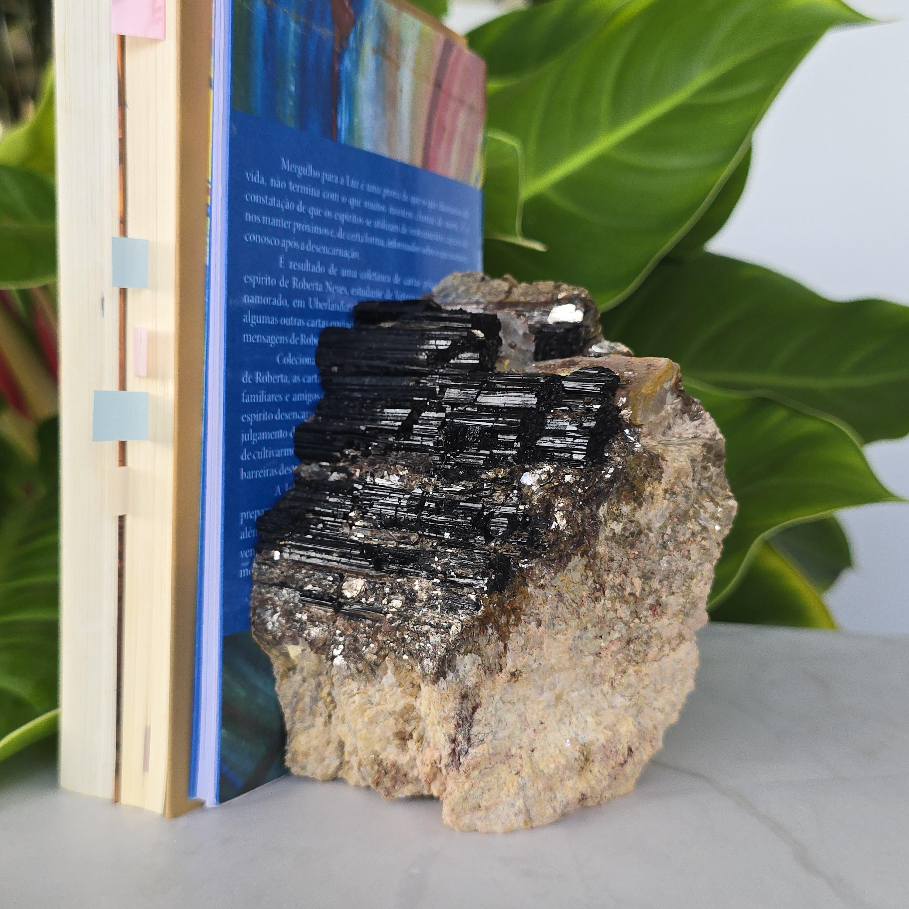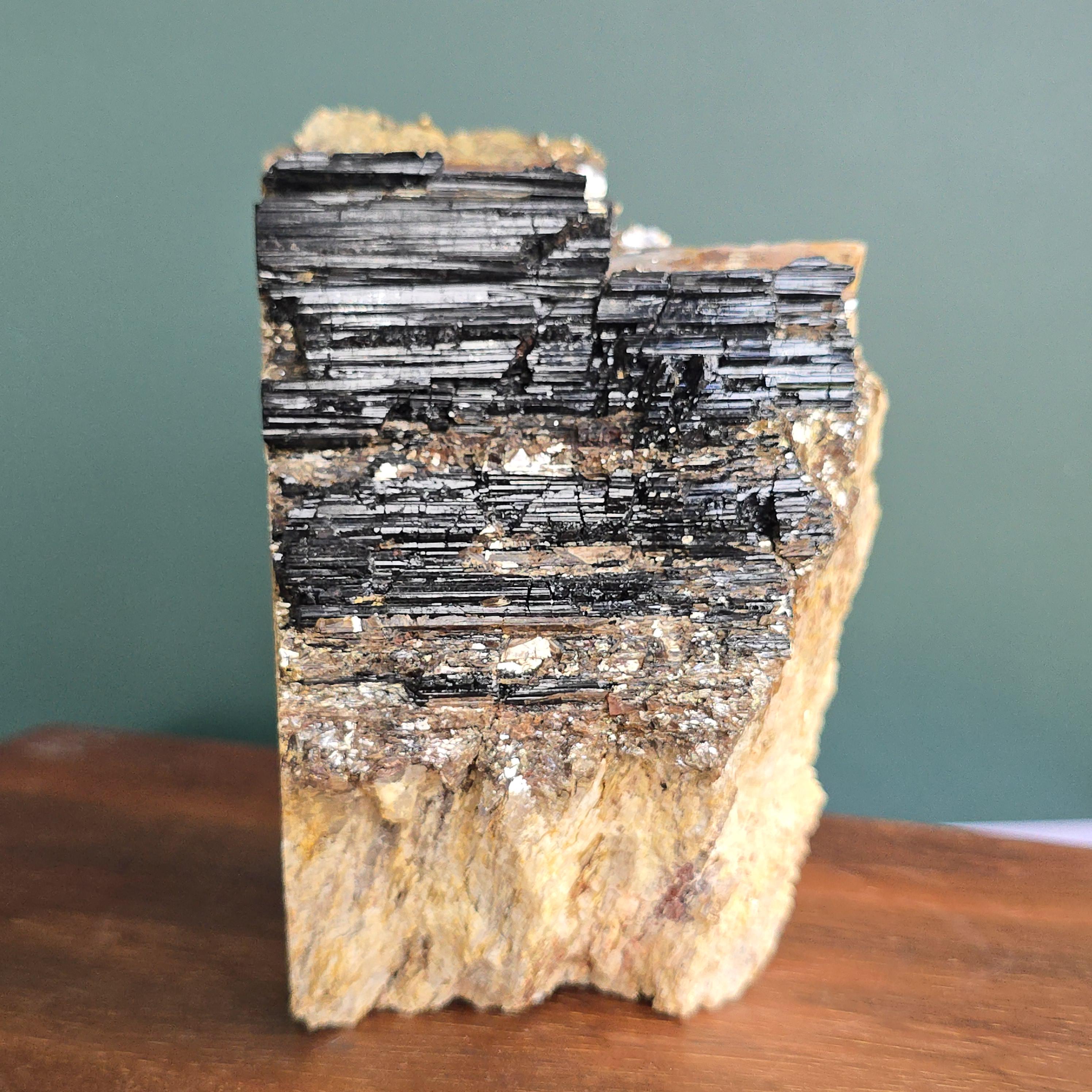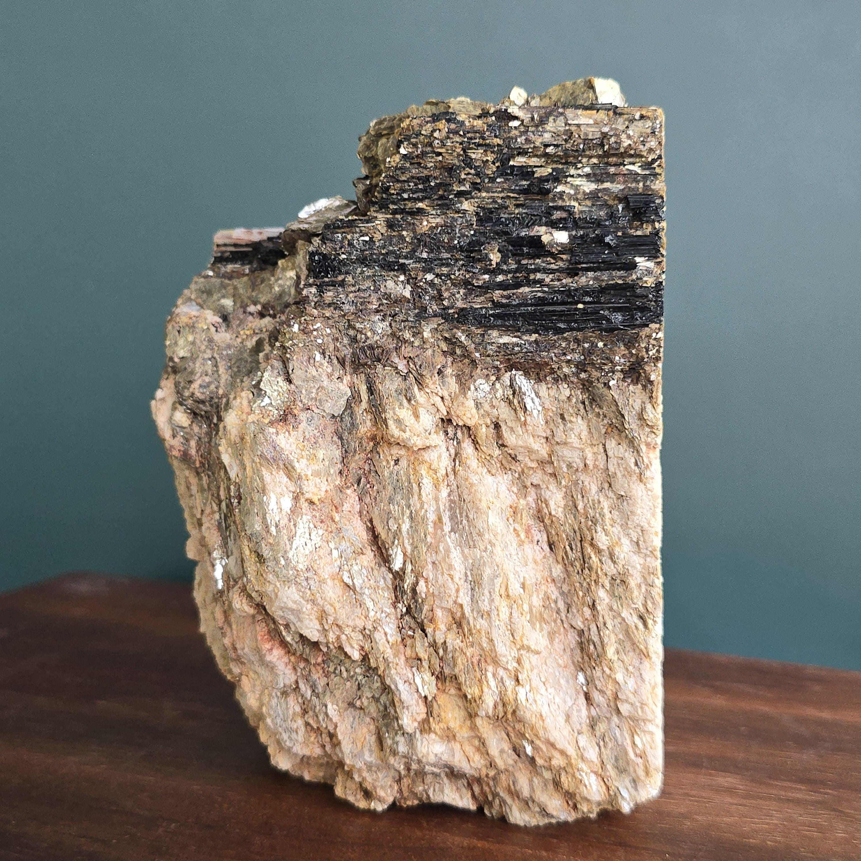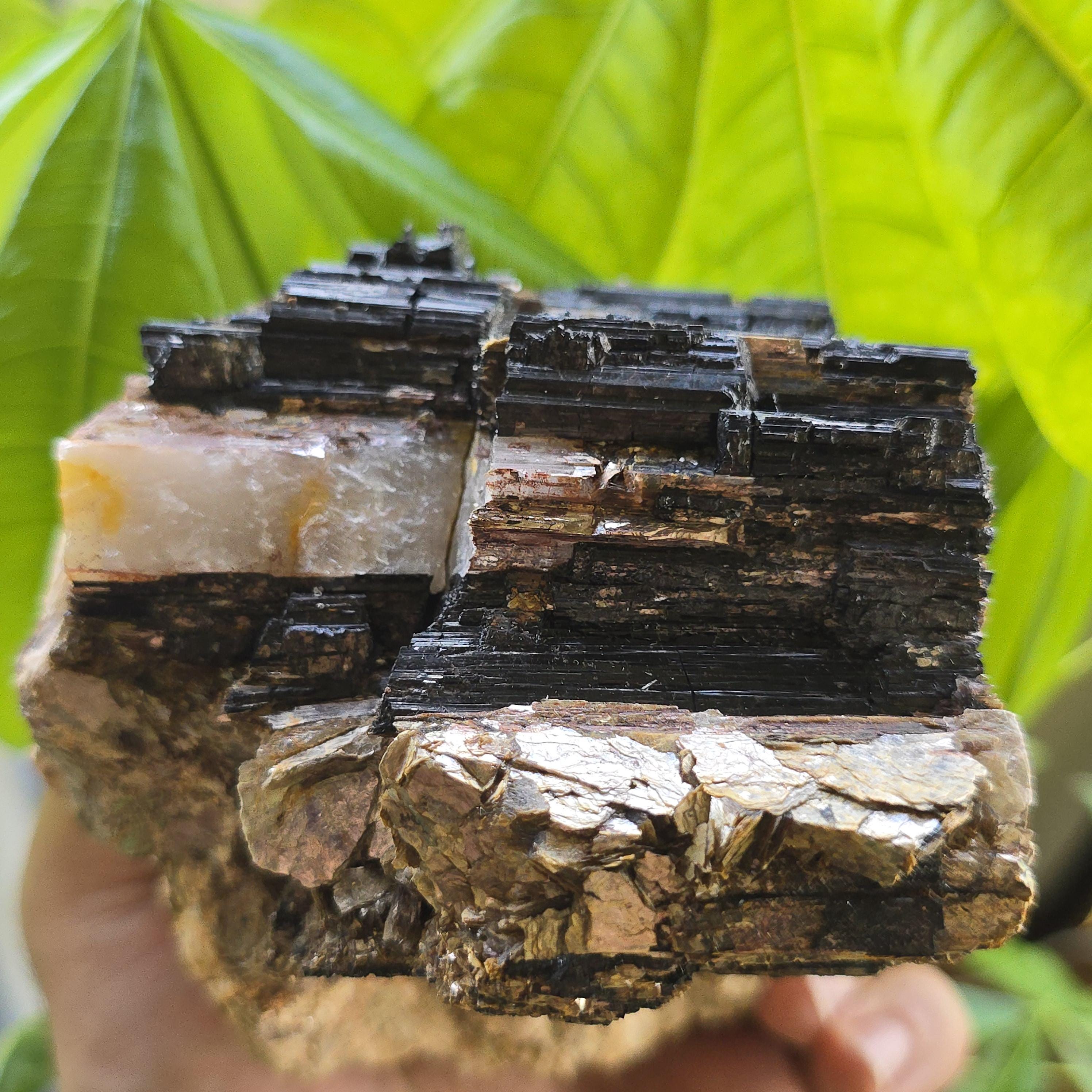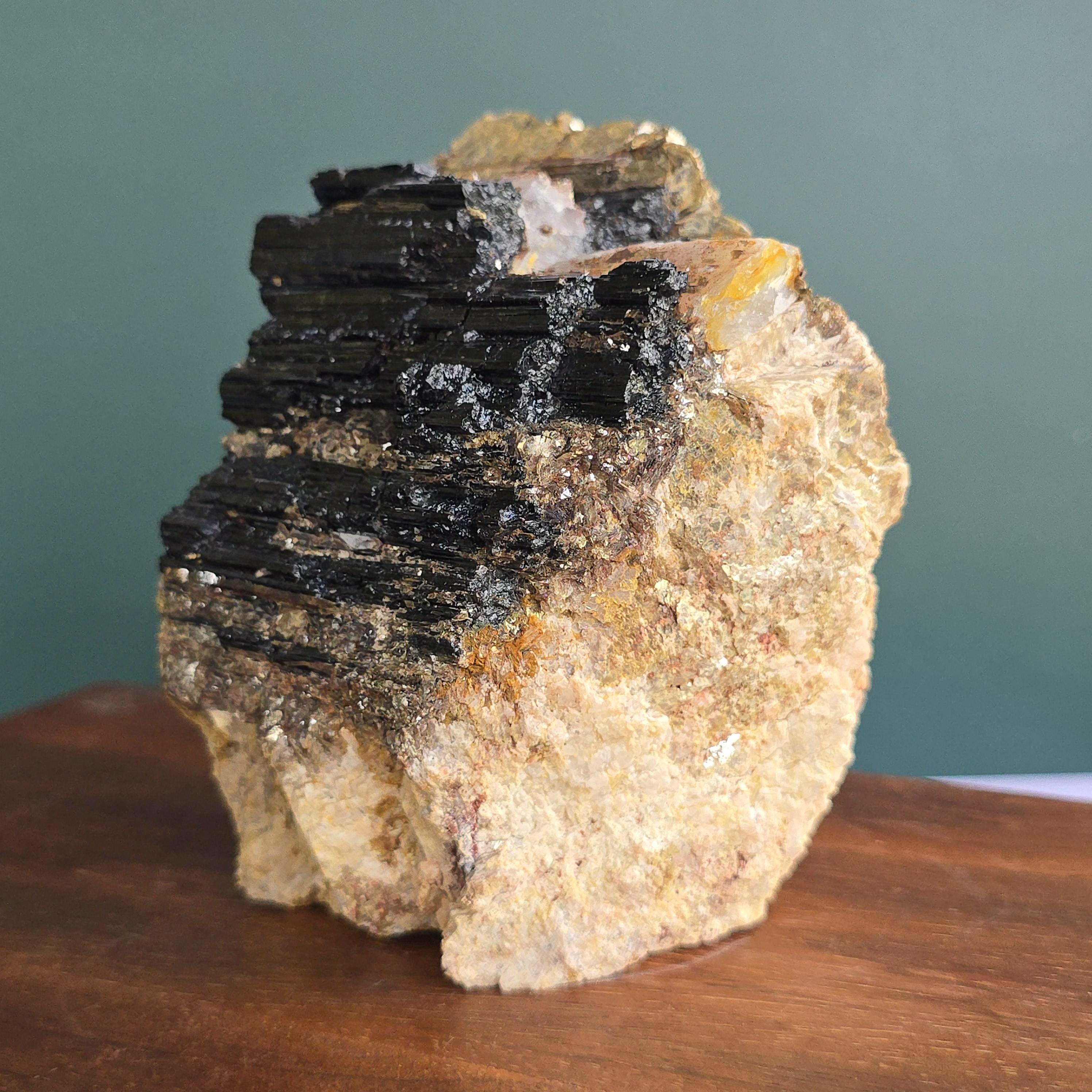 Black tourmaline is a natural mineral widely used for its strong protective and grounding properties. Many associate it with shielding against negative energy, EMF, and promoting stability and emotional balance. The combination of black tourmaline with quartz and mica creates a powerful energetic piece. This sizable raw specimen is perfect for display on a shelf, altar, meditation space, or as a statement home decor piece, It's on a cut base for easy display. Each specimen is natural and unique, with variations in black tourmaline crystal formation, quartz clarity, golden mica sparkle, and white barite inclusions.