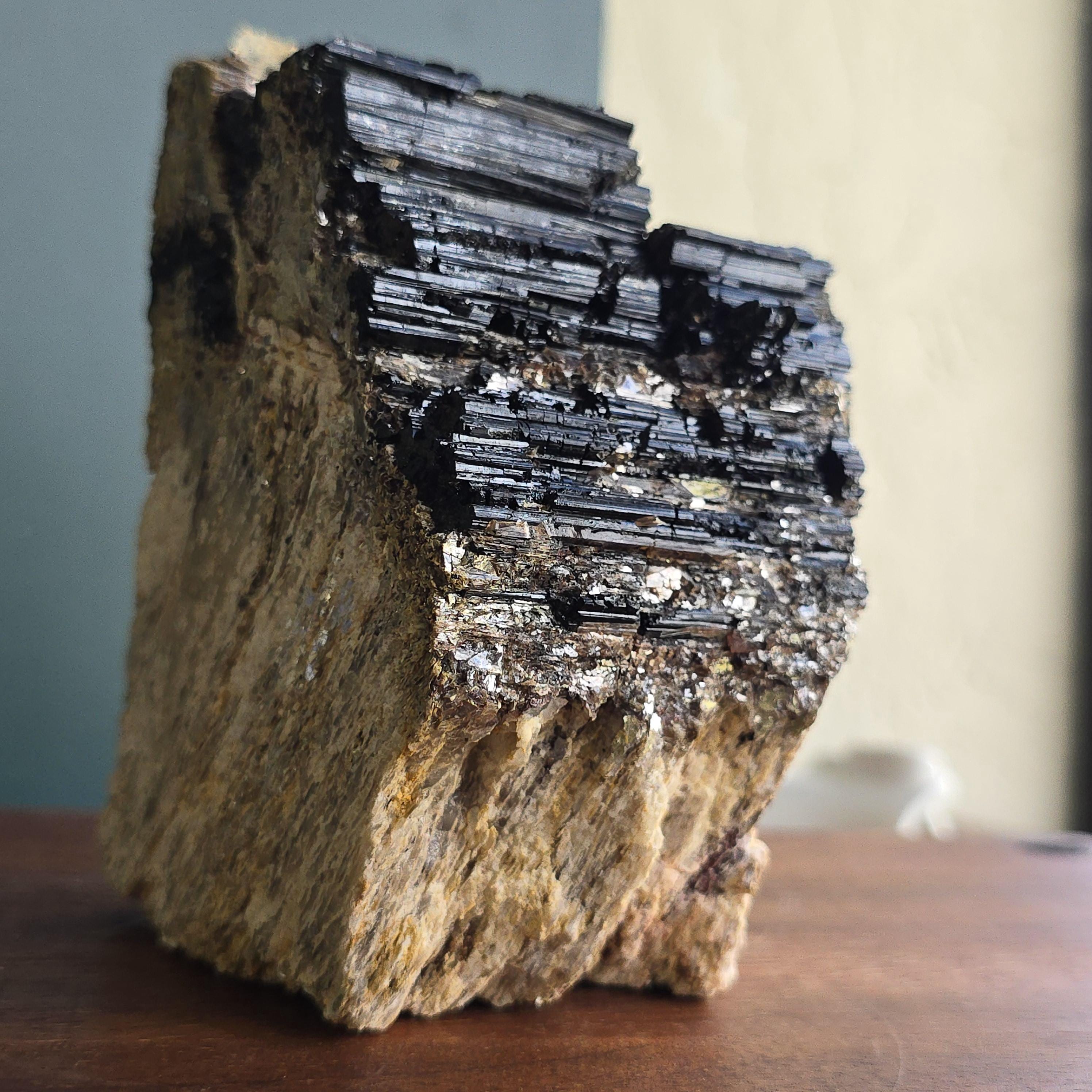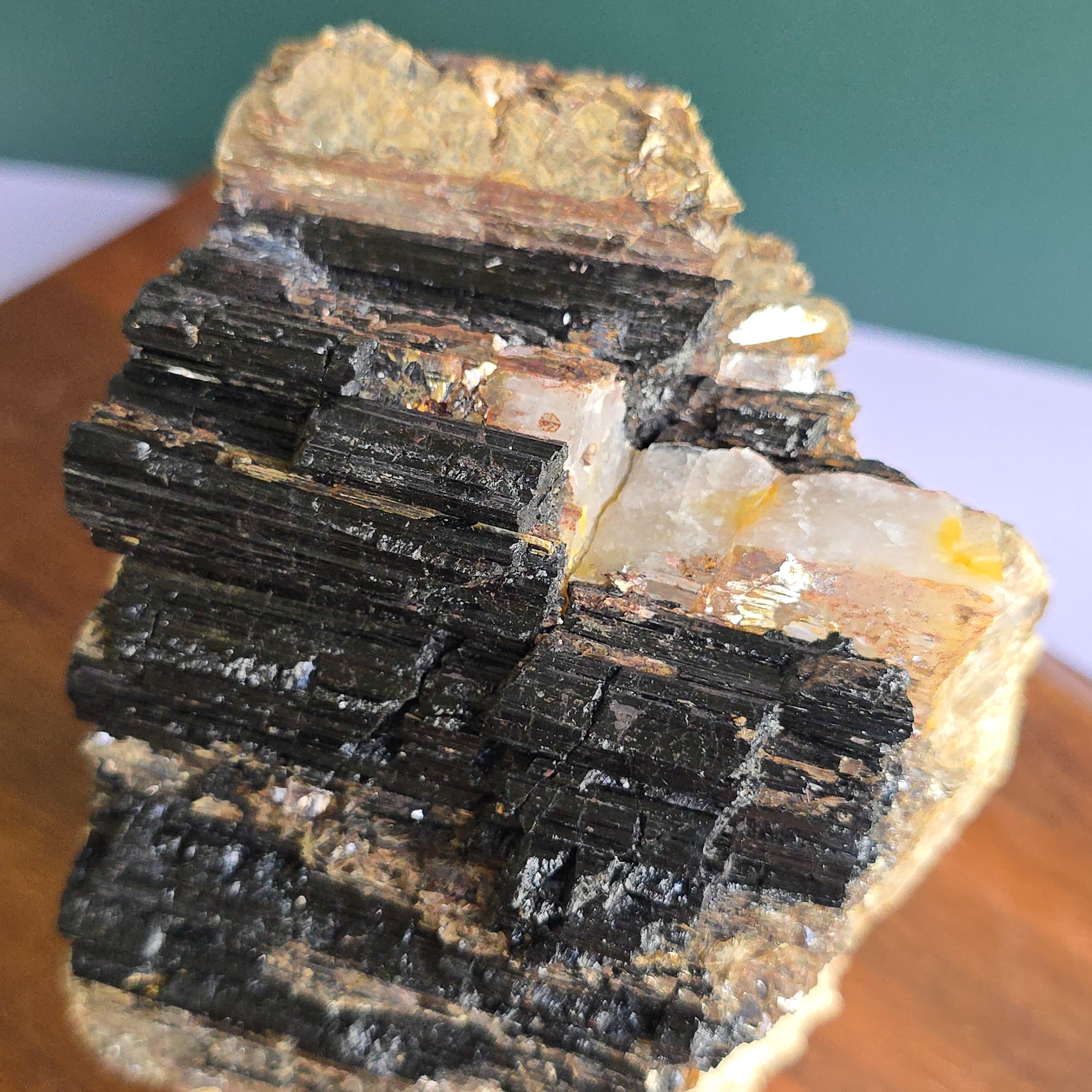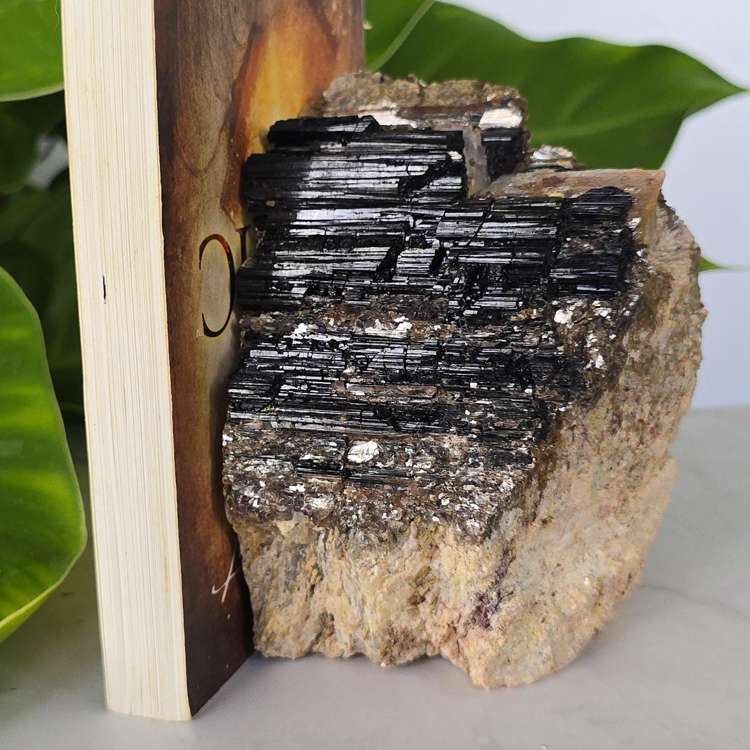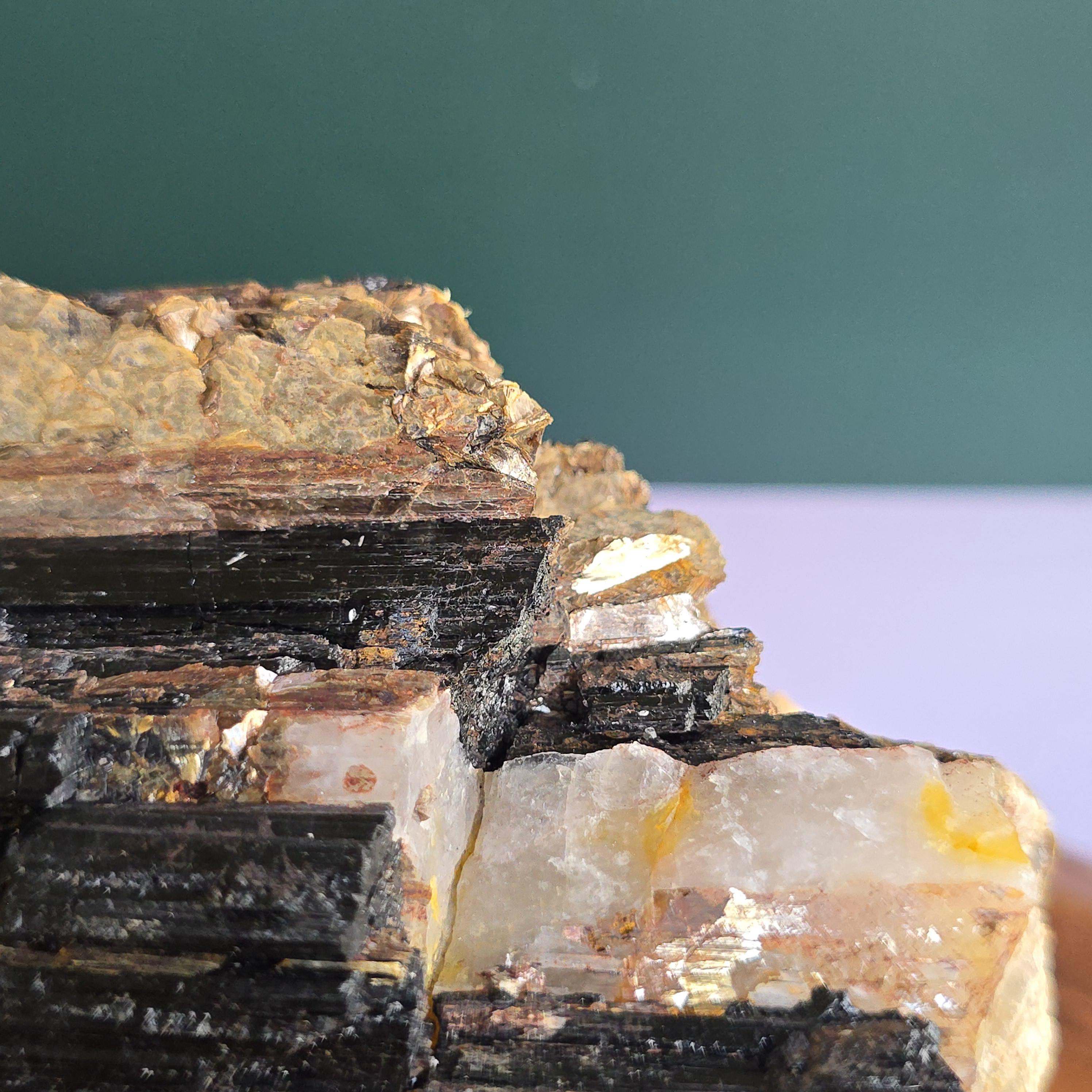 Black tourmaline is a natural mineral widely used for its strong protective and grounding properties. Many associate it with shielding against negative energy, EMF, and promoting stability and emotional balance. The combination of black tourmaline with quartz and mica creates a powerful energetic piece. This sizable raw specimen is perfect for display on a shelf, altar, meditation space, or as a statement home decor piece, It's on a cut base for easy display. Each specimen is natural and unique, with variations in black tourmaline crystal formation, quartz clarity, golden mica sparkle, and white barite inclusions.