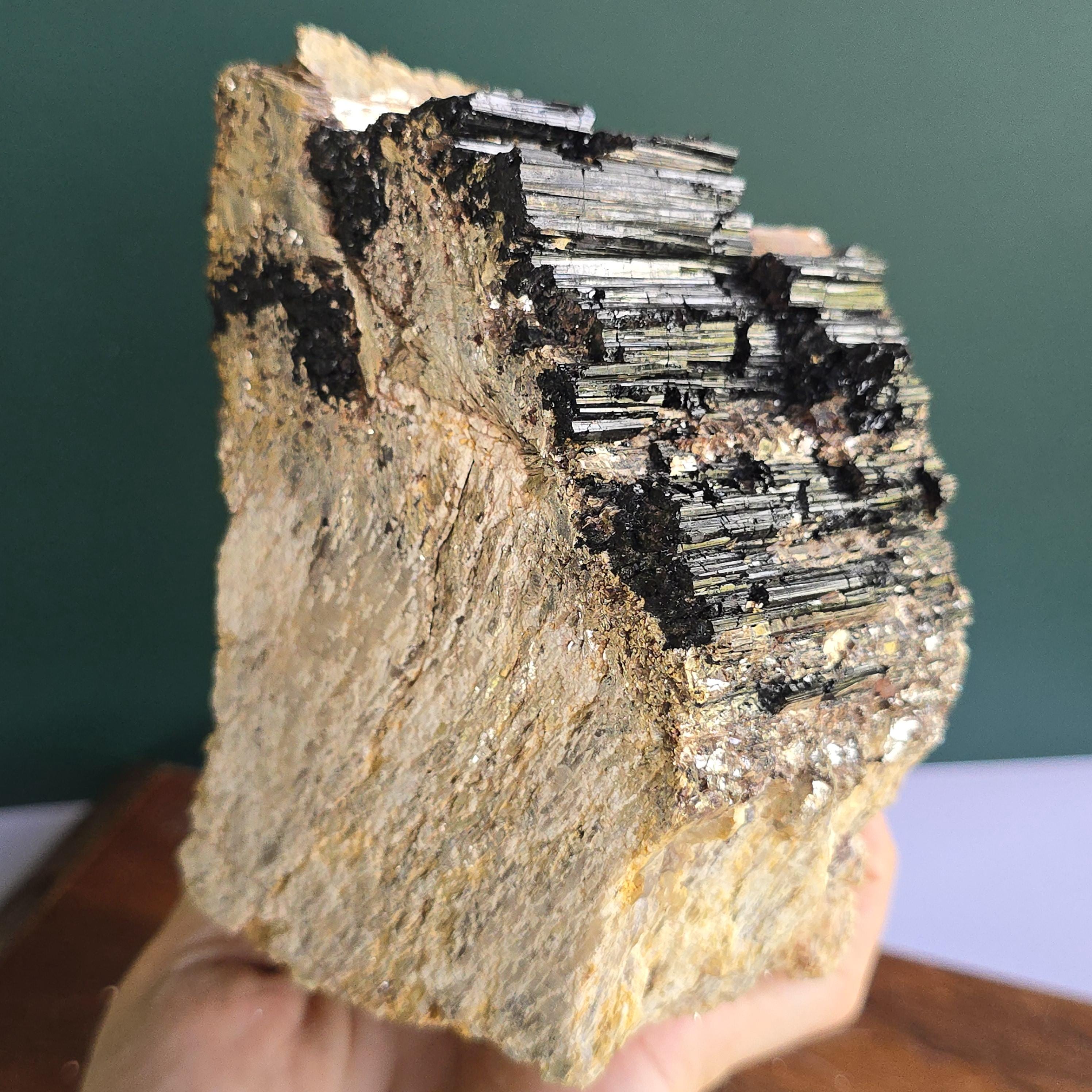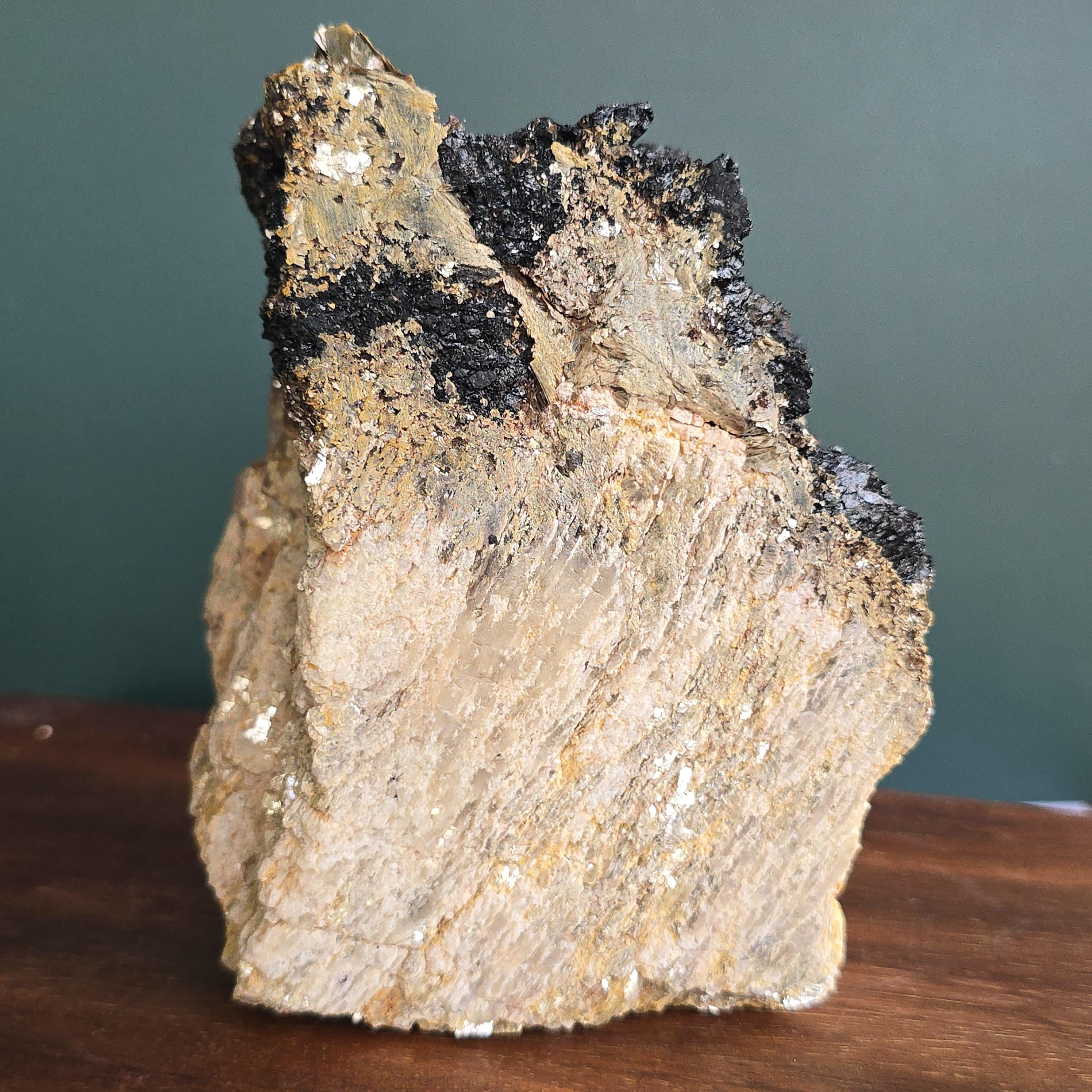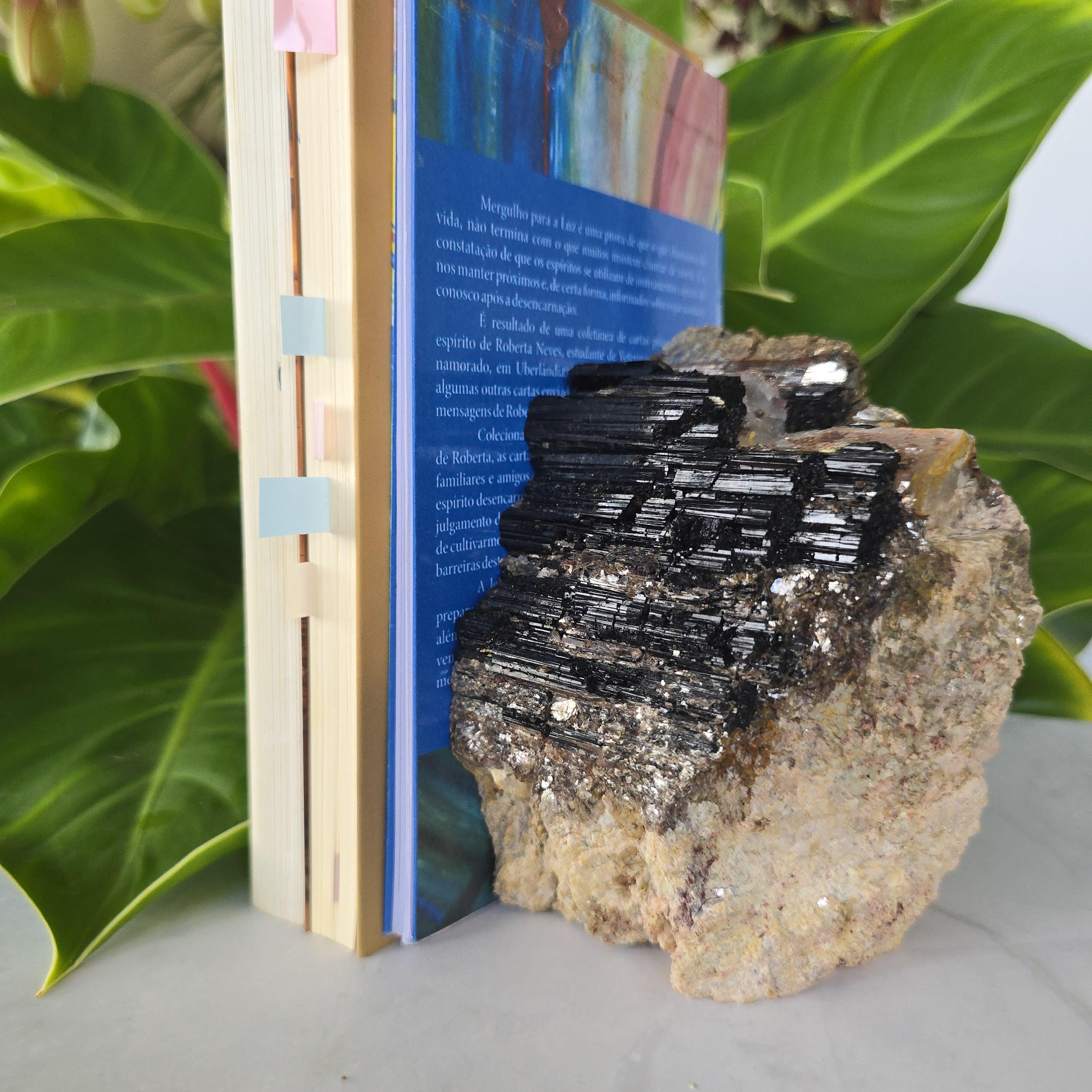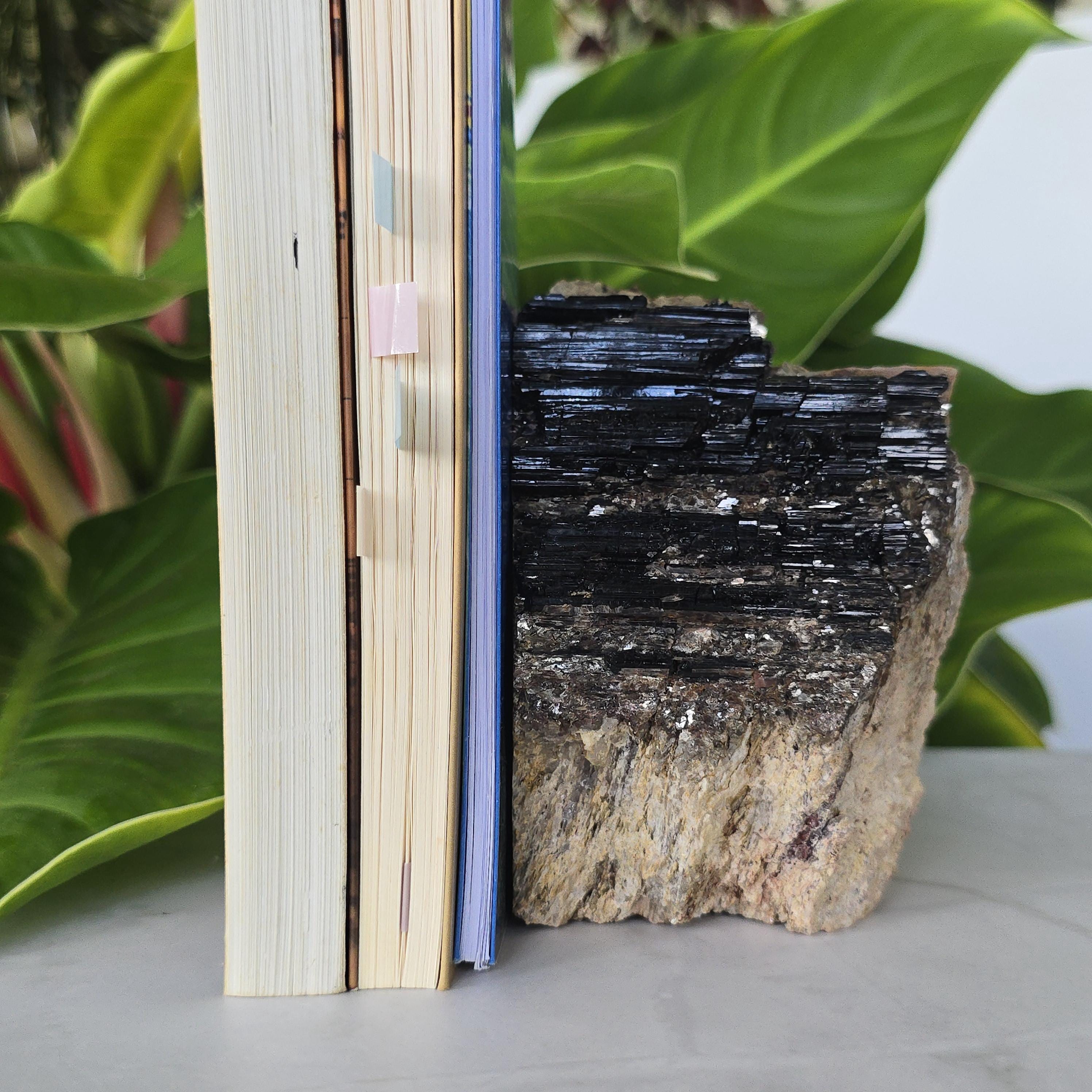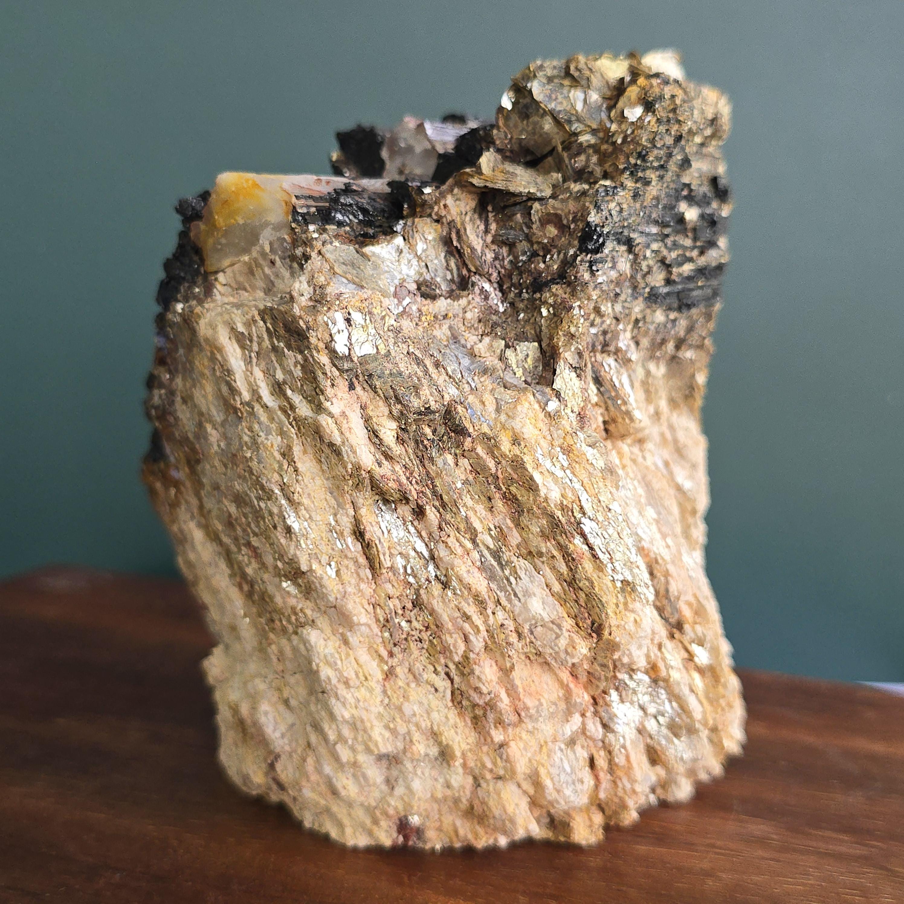 Black tourmaline is a natural mineral widely used for its strong protective and grounding properties. Many associate it with shielding against negative energy, EMF, and promoting stability and emotional balance. The combination of black tourmaline with quartz and mica creates a powerful energetic piece. This sizable raw specimen is perfect for display on a shelf, altar, meditation space, or as a statement home decor piece, It's on a cut base for easy display. Each specimen is natural and unique, with variations in black tourmaline crystal formation, quartz clarity, golden mica sparkle, and white barite inclusions.