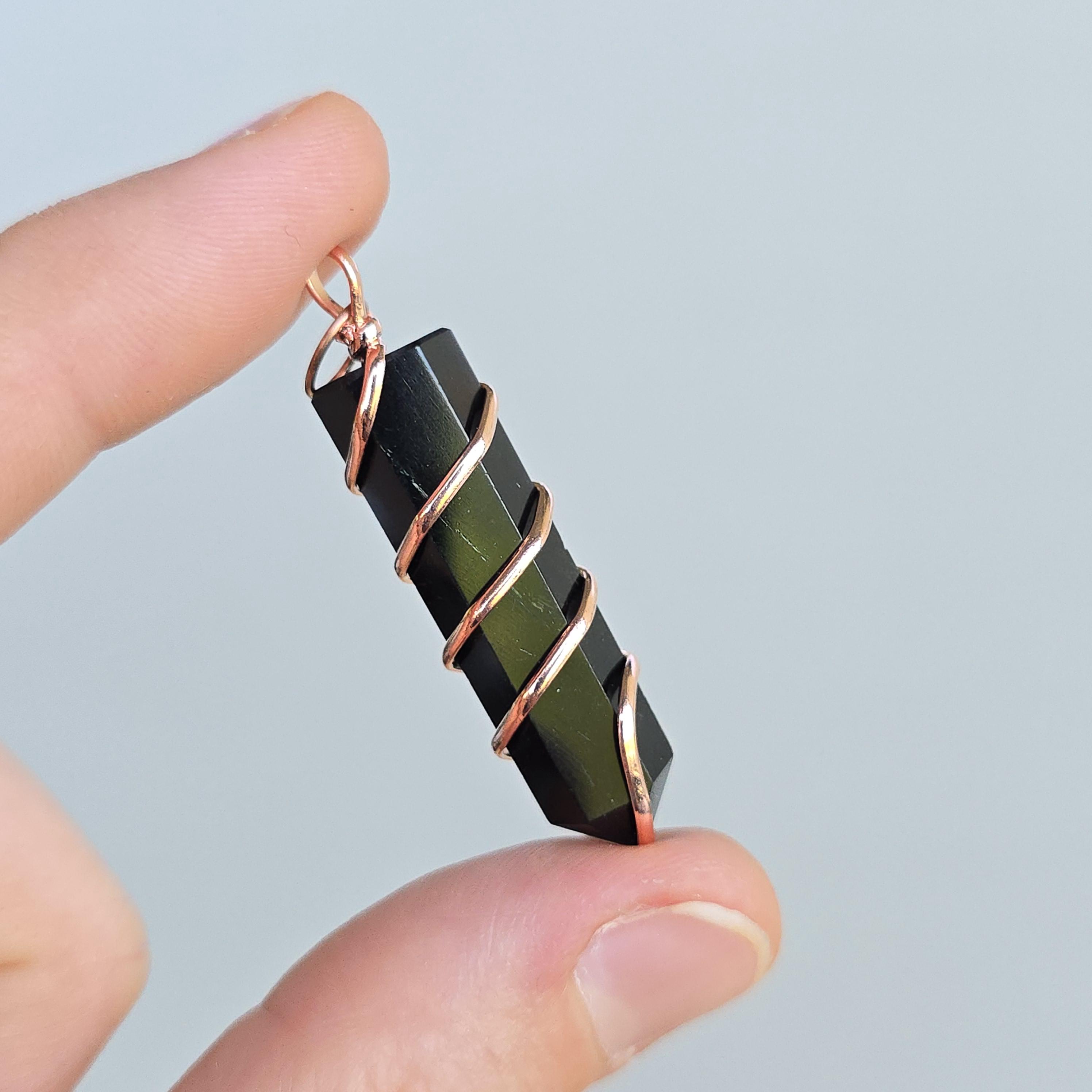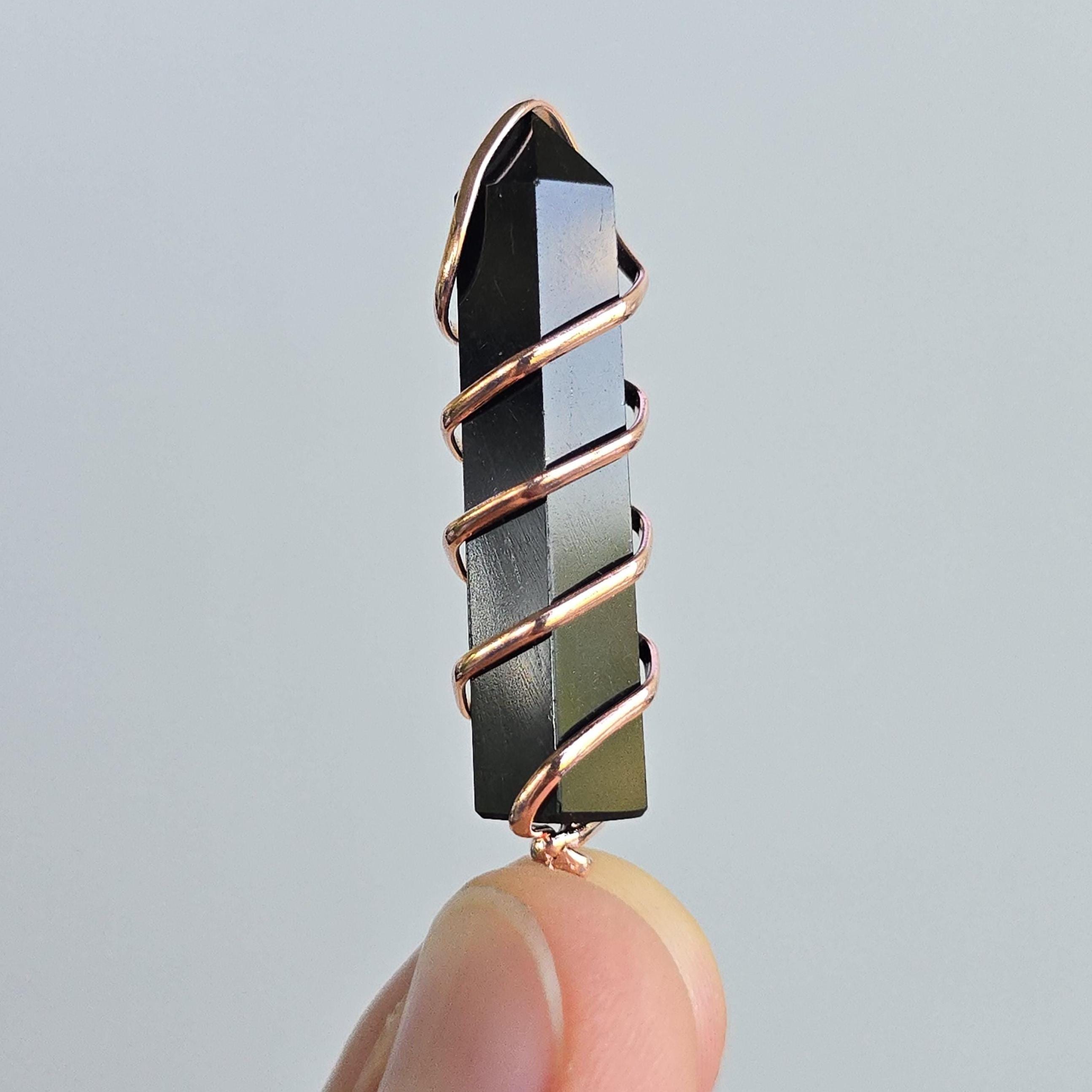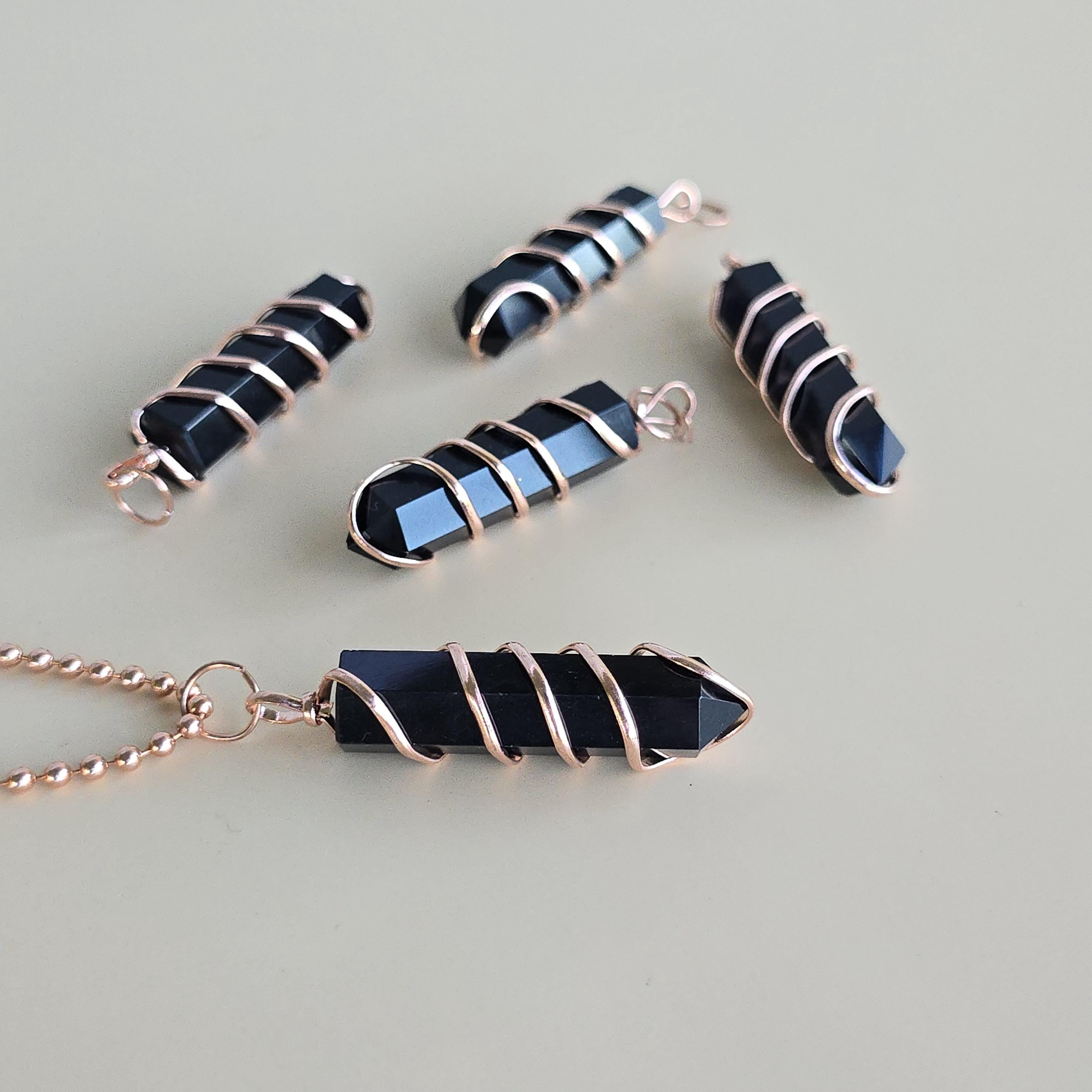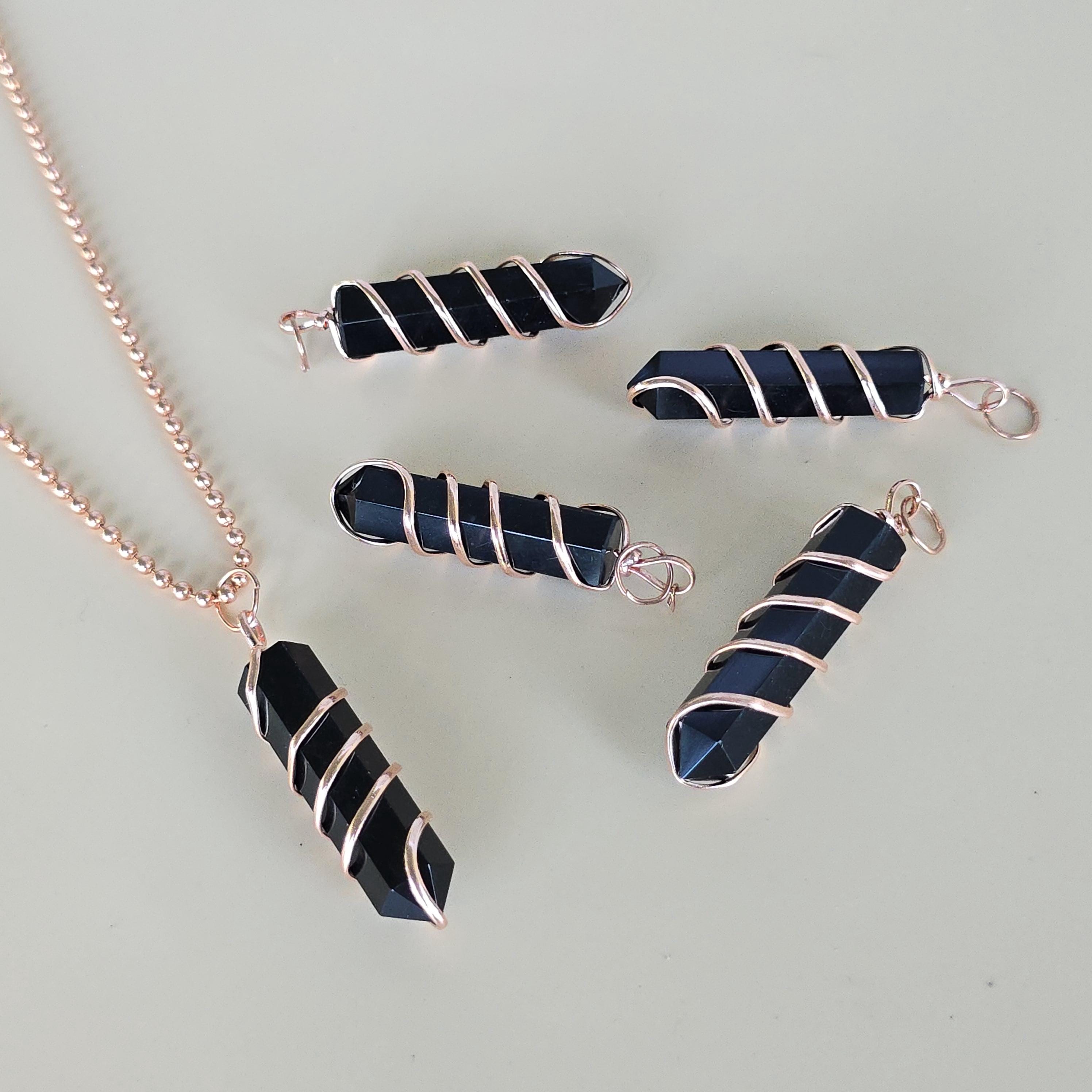 Black obsidian is a natural volcanic glass known for its strong protective and grounding properties. Many associate it with shielding against negative energy, emotional cleansing, releasing past traumas, and providing clarity during difficult times. This polished black obsidian point is hand-wrapped with copper wire. It is a simple, powerful piece suitable for daily wear or as a protective accessory. Each pendant uses natural black obsidian, so color, texture, inclusions, and variations occur due to the authentic stone.
