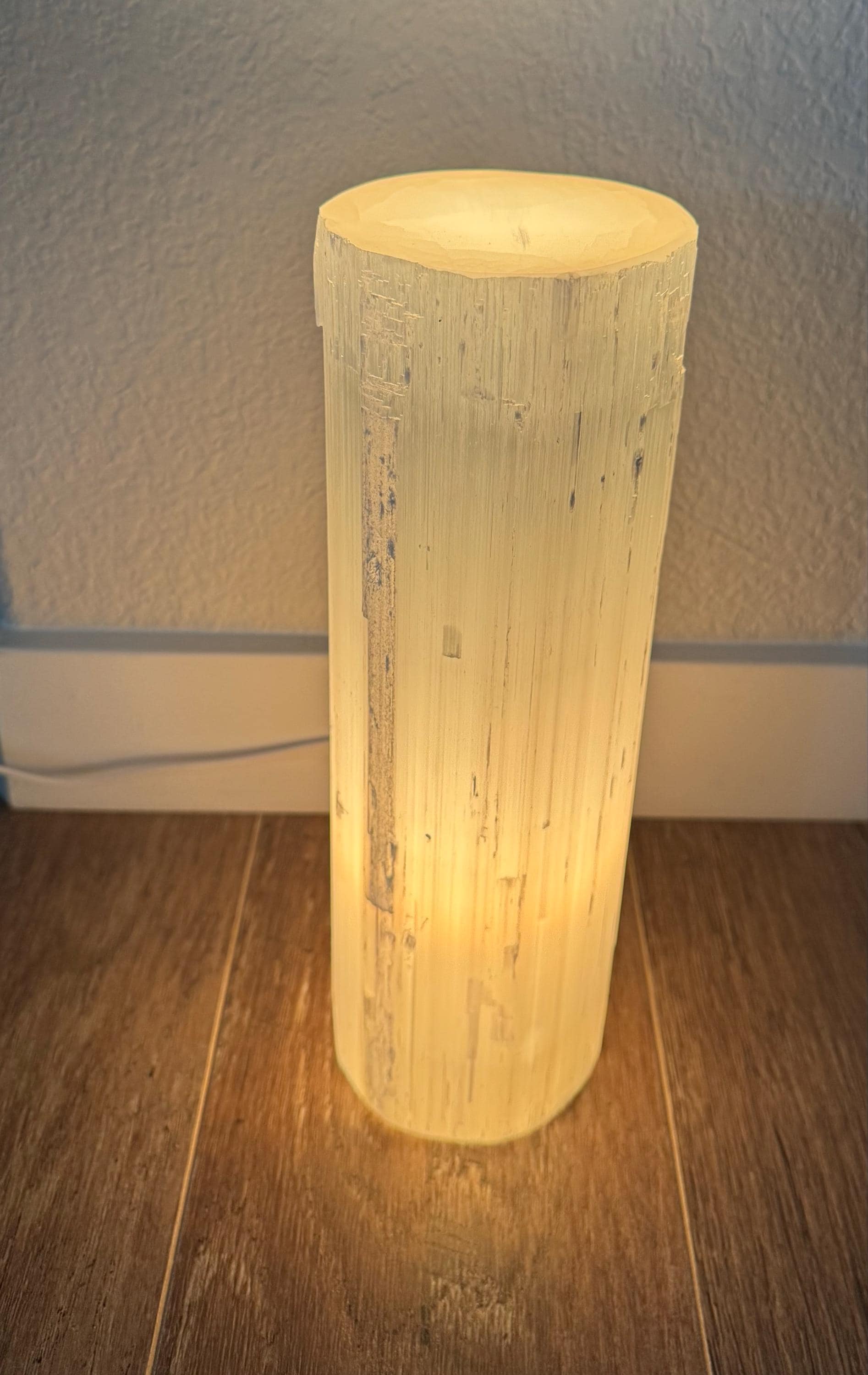Selenite Lamp with a Flat Top shines bright! Great for office decor, bedside lamp, Nite light, home decor and for a housewarming gift.