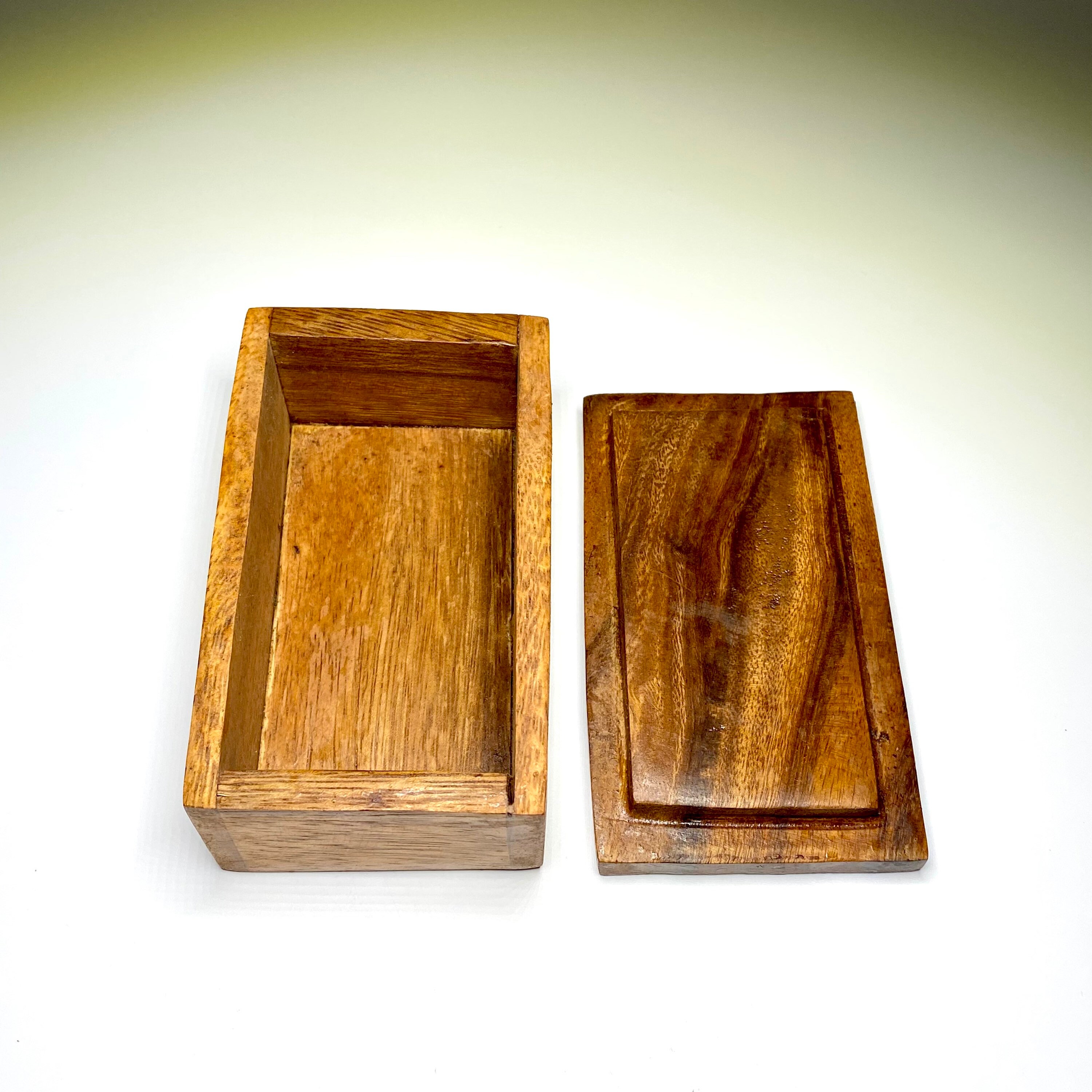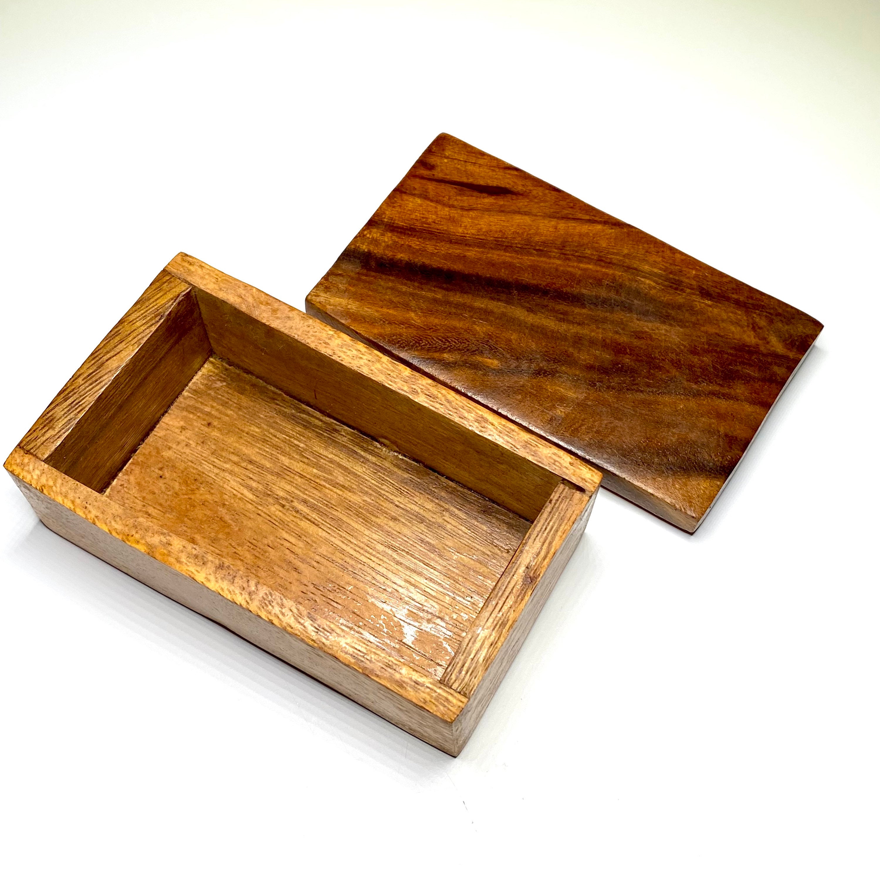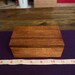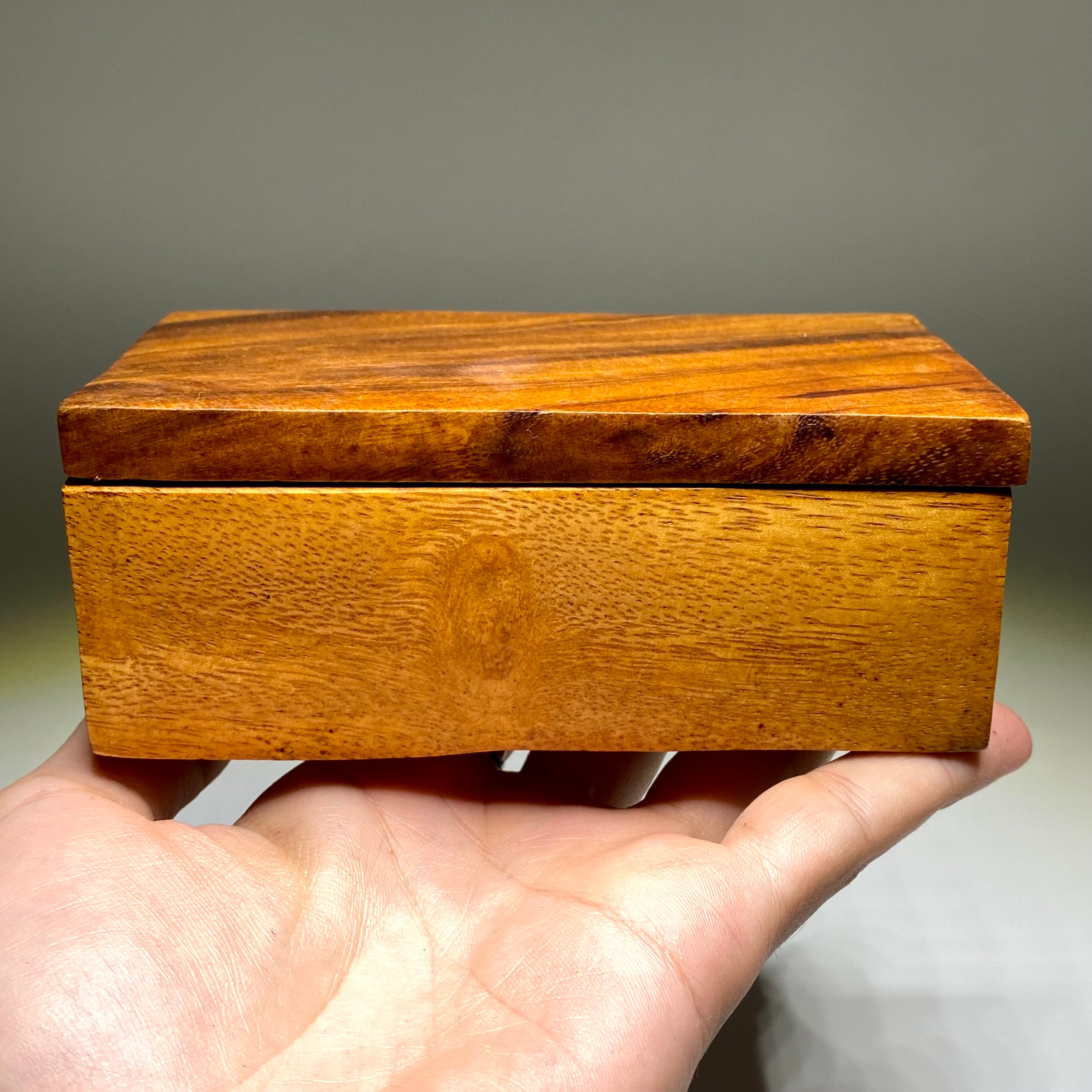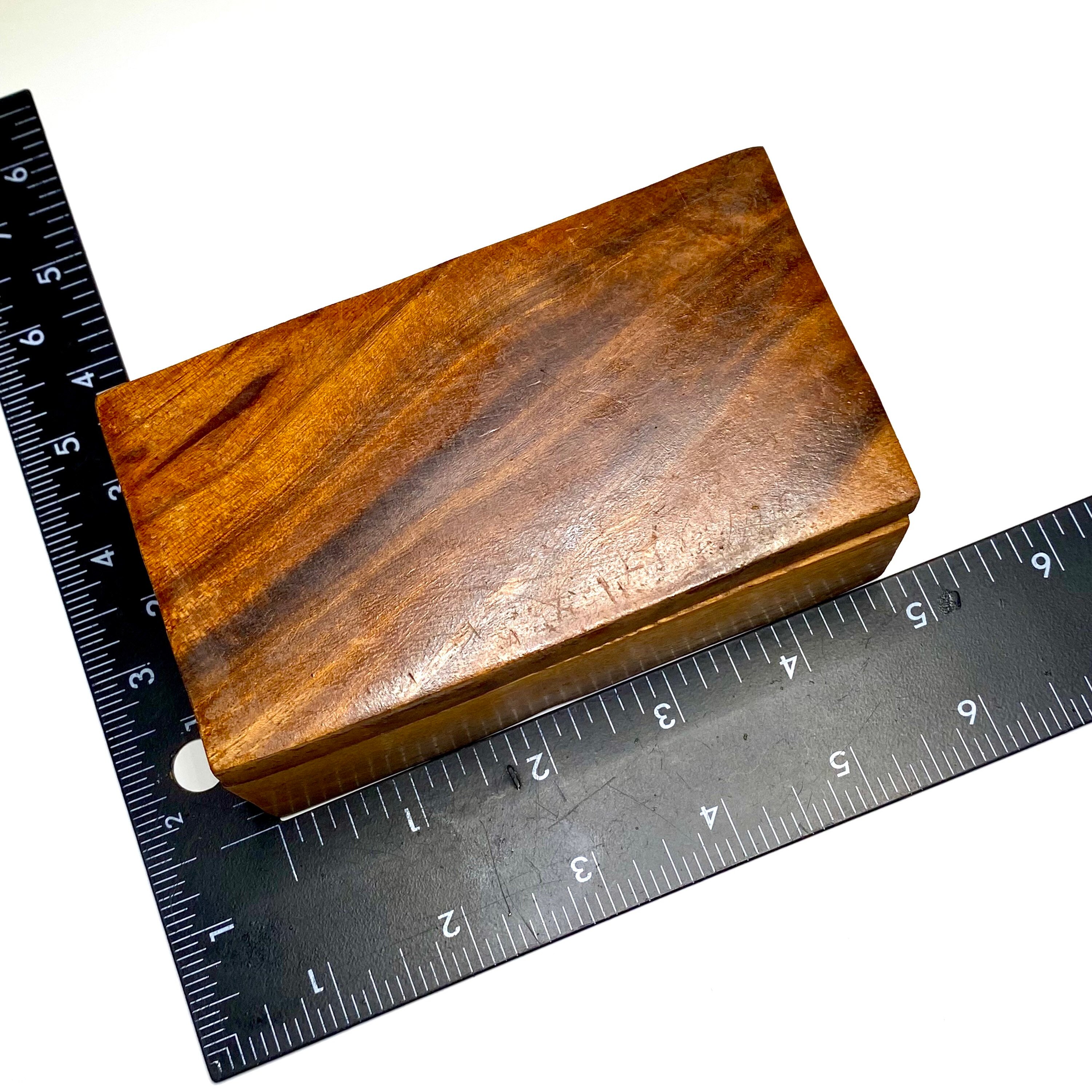 Love it! Handmade & very nice. 5 inches long & 3 inches wide, 1 & 1/2 inches deep. No hinges , I would buy again.